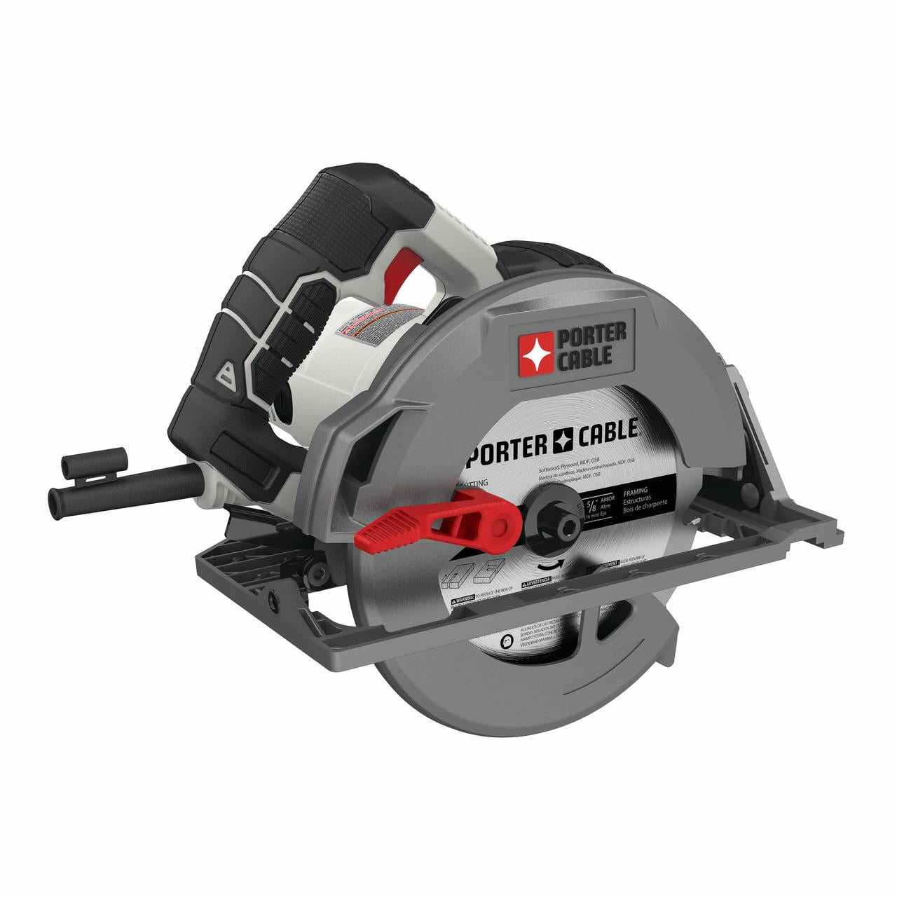The PORTER-CABLE PCE300 15 amp heavy duty steel shoe Circular saw features a 15 amp motor, able to run up to 5,500 RPM to provide power and speed through all types of applications. This Circle saw has a steel shoe, along with metal upper & lower guards that provide added durability. It offers spindle Lock and depth adjustment, and a 45 degree max bevel adjust to provide ease of use. An aux handle provides comfort and clear line of sight. At only 9.5 lbs this unit is convenient to use. Specs: blade diameter = 7-1/4″, top handle, depth of cut at 45 degrees = 1-7/8″, depth of cut at 90 degrees = 2-1/2″. backed by PORTER-CABLE 3 year limited warranty. Includes: 1) Circular saw, 1) 7-1/4″ 18 tooth carbide Tipped blade, 1) Allen wrench. Backed by a Porter Cable 3 Year Limited Warranty and a 90 Money Back Guarantee.