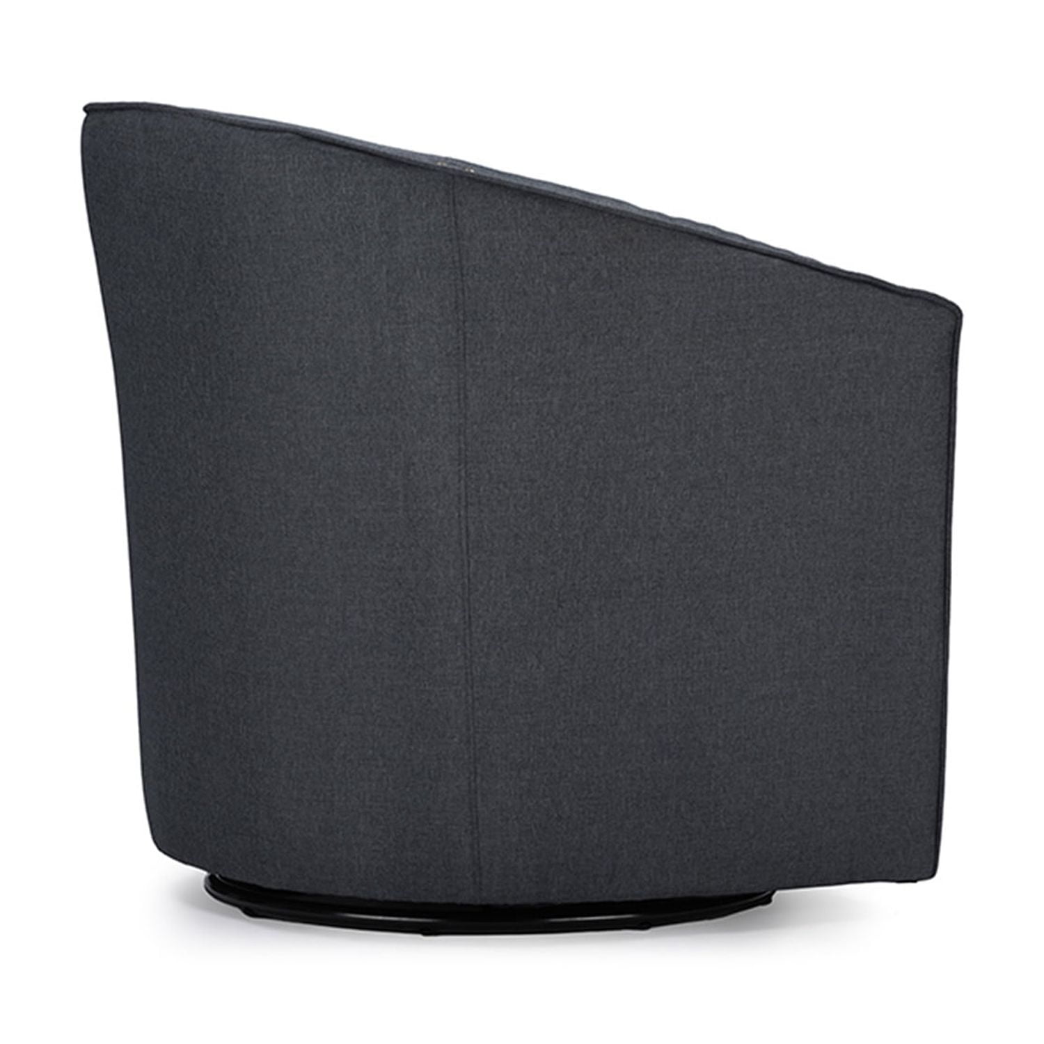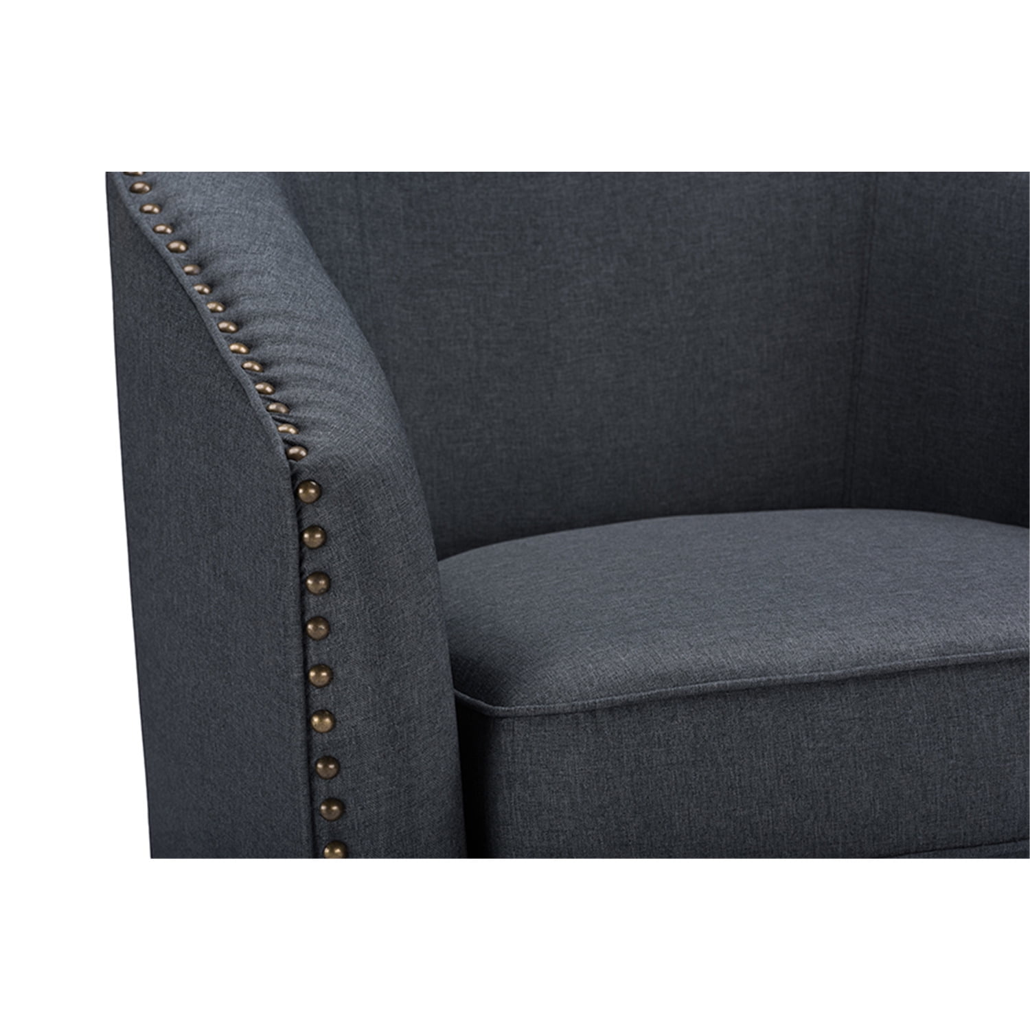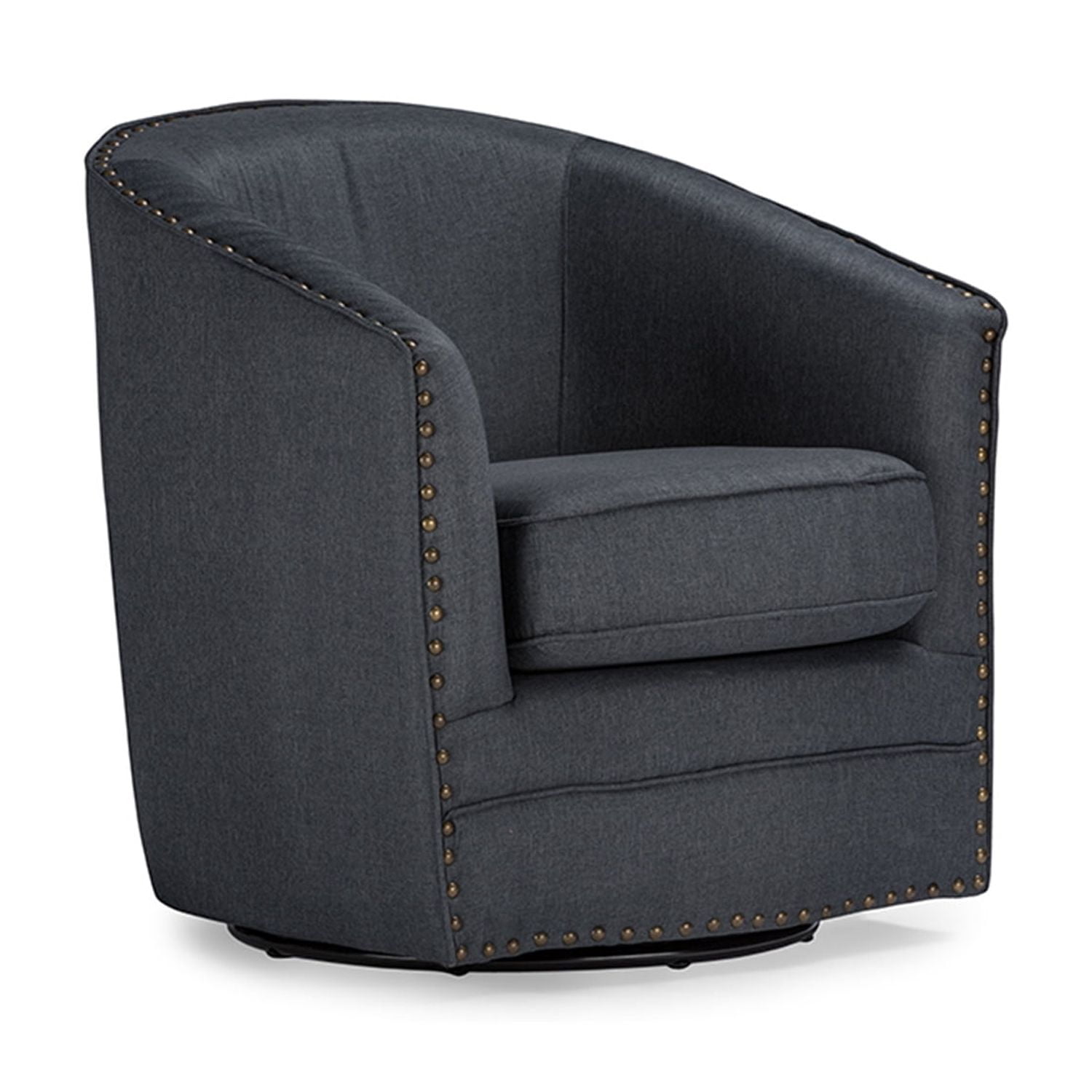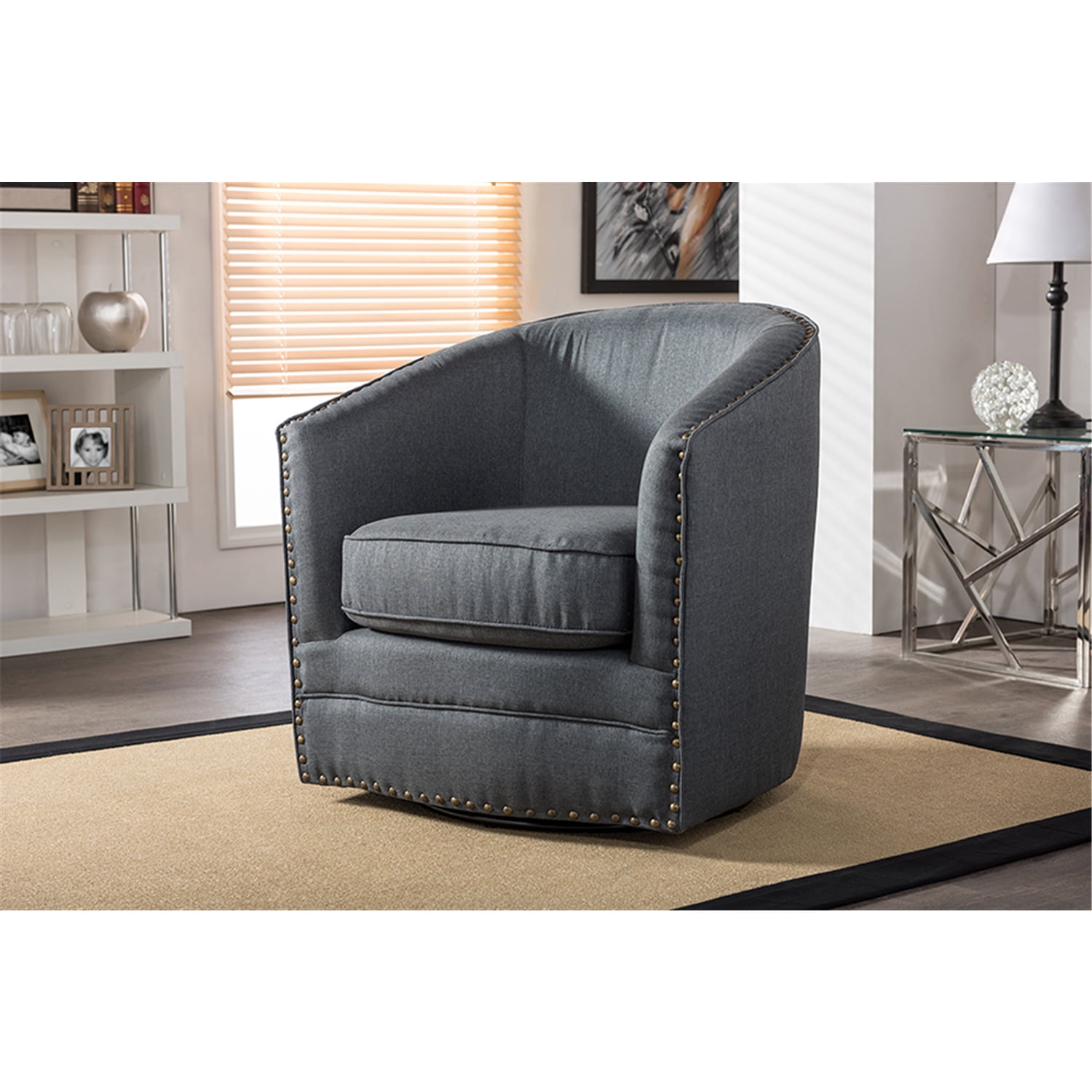 Porter Modern and Classic Retro Grey Fabric Upholstered Swivel Tub Chair Fun and chic, this Porter Contemporary Fabric Upholstered Swivel Tub Chair is a sure way to jazz up your room decor. Whether placed in your bedroom, living room, or den, this upholstered chair adds a pop of color and spunky style. The porter features a medium height, shelter-style back and classic bronze finished nail heads trim detailing. It is furnished with a plush, multi-layer seat cushion that you can sink right into and will still hold its shape and support. To maintain the cleanliness, the top layer of seat cushion is removable, allowing the dust off. Made in China, the chair arrives fully assembled. Specifications: Upholstered with cotton-linen blend fabric Fabric with high density foam Design: bronze nail heads trim, shelter style back, swivel base with puffy cushions