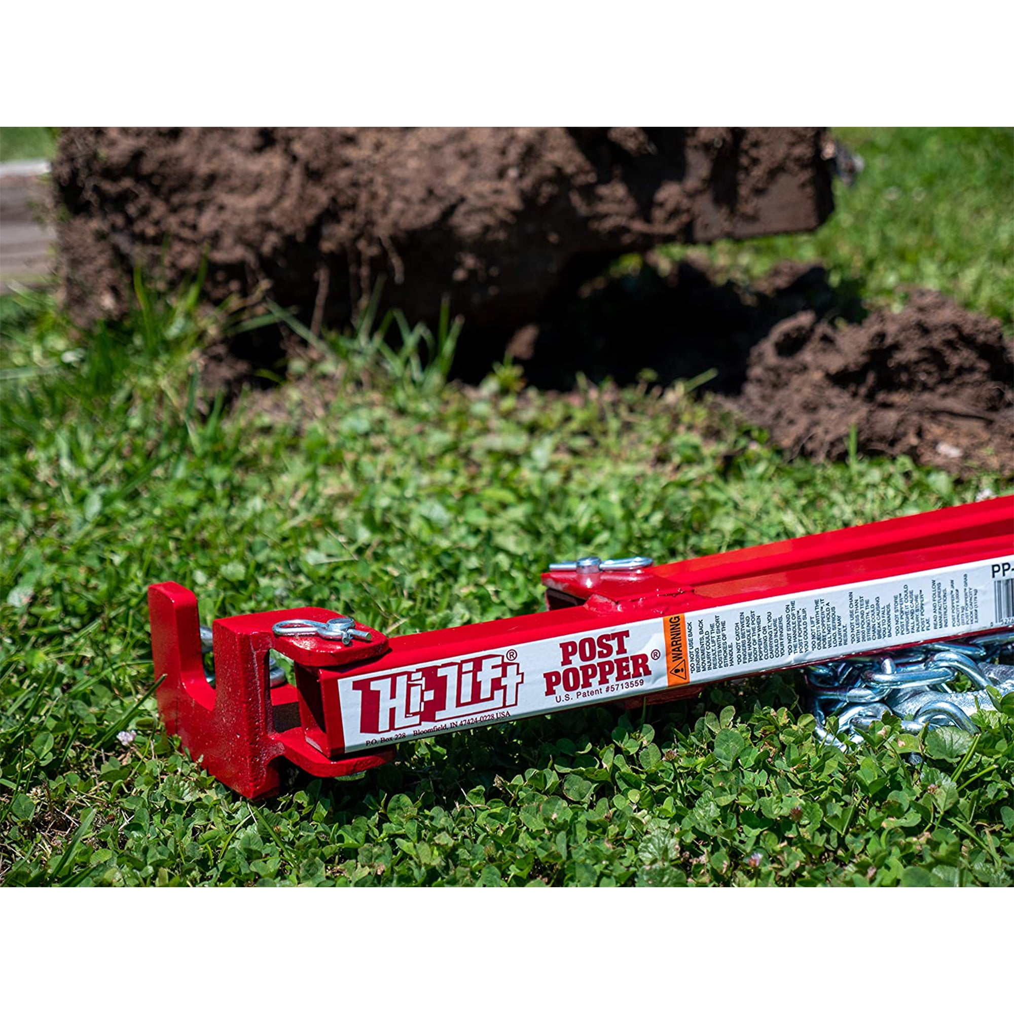 Post Popper Red, low gloss enamel;Heavy duty 1-1/2″ square tubing;Weight: 21 lbs (9.5 kg);Height: 39″ (99 cm) Hi-Lift Jack Post Popper PP-300 Trail Jack Accessories • Manually remove fence posts, construction stakes, and more with this durable mechanical post remover • Jaw fits around T-posts for easy lifting out of the ground; Chain & Slip Hook Accessory (not included) pulls out other stakes and posts • Unique components allow a single person to apply a tremendous amount of lifting force directly to the posts • Solid, square tubing construction makes the tool durable and long-lasting • Great for use in all areas of fencing and signing, excellent for landscaping, farming, home remodeling, and construction • Color: Red • Dimensions (L x W x H): 62.20 x 10.50 x 5 inches • Weight: 54 pounds • Manufacturer warranty: 1-year warranty