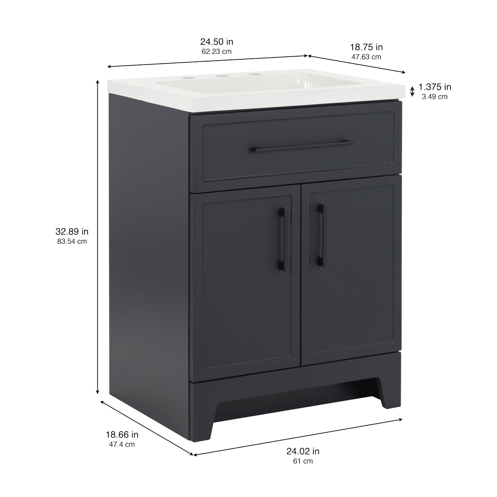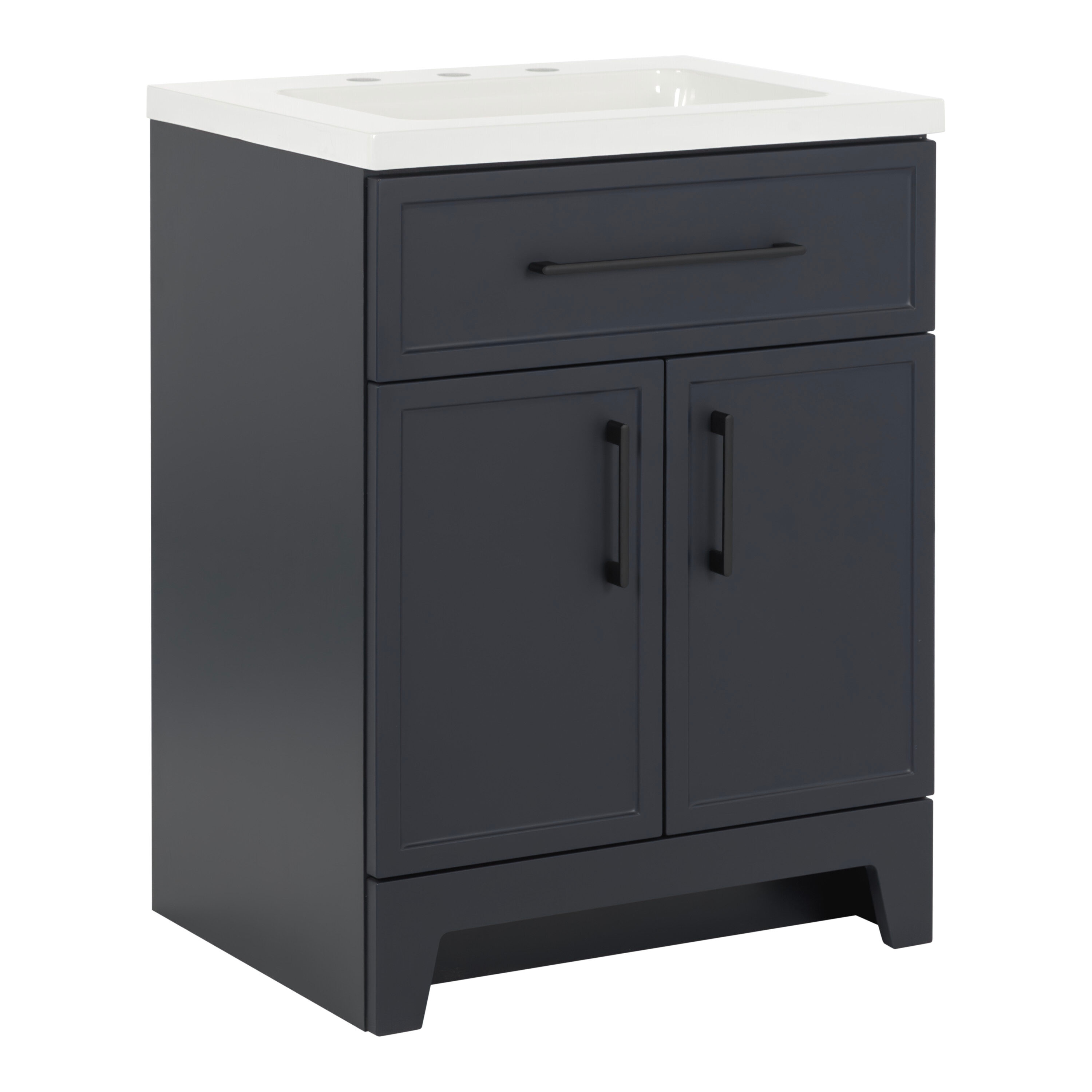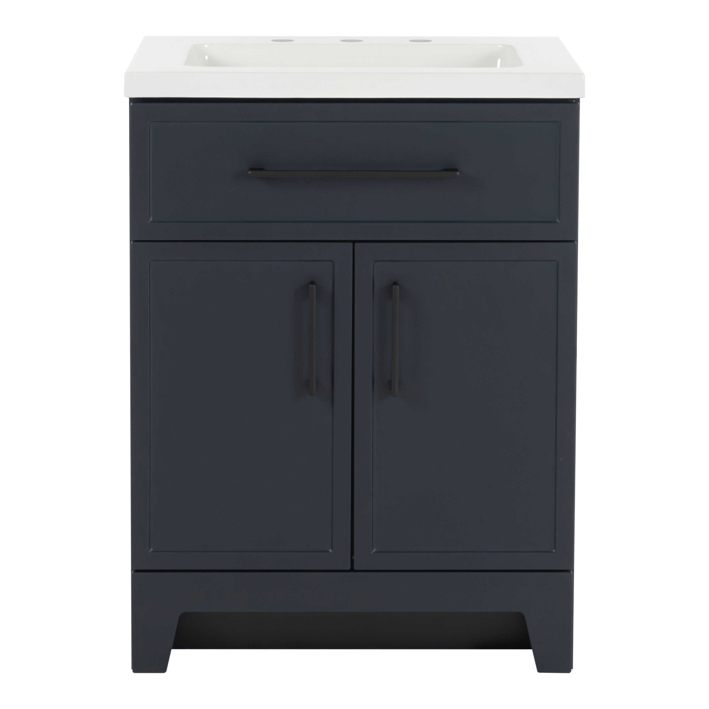 Transform your bathroom with the Potter 24.5-in W deep blue vanity. This single-sink bathroom vanity features a Shaker-style design that’s complemented by a 1-piece white cultured marble sink top and matte black hardware. Pre-assembled and ready to install, this vanity also includes a wraparound drawer with 3 compartments and a 2-door under-sink cabinet for easy-access storage space. This transitional vanity maximizes style and storage in bathrooms of all sizes.