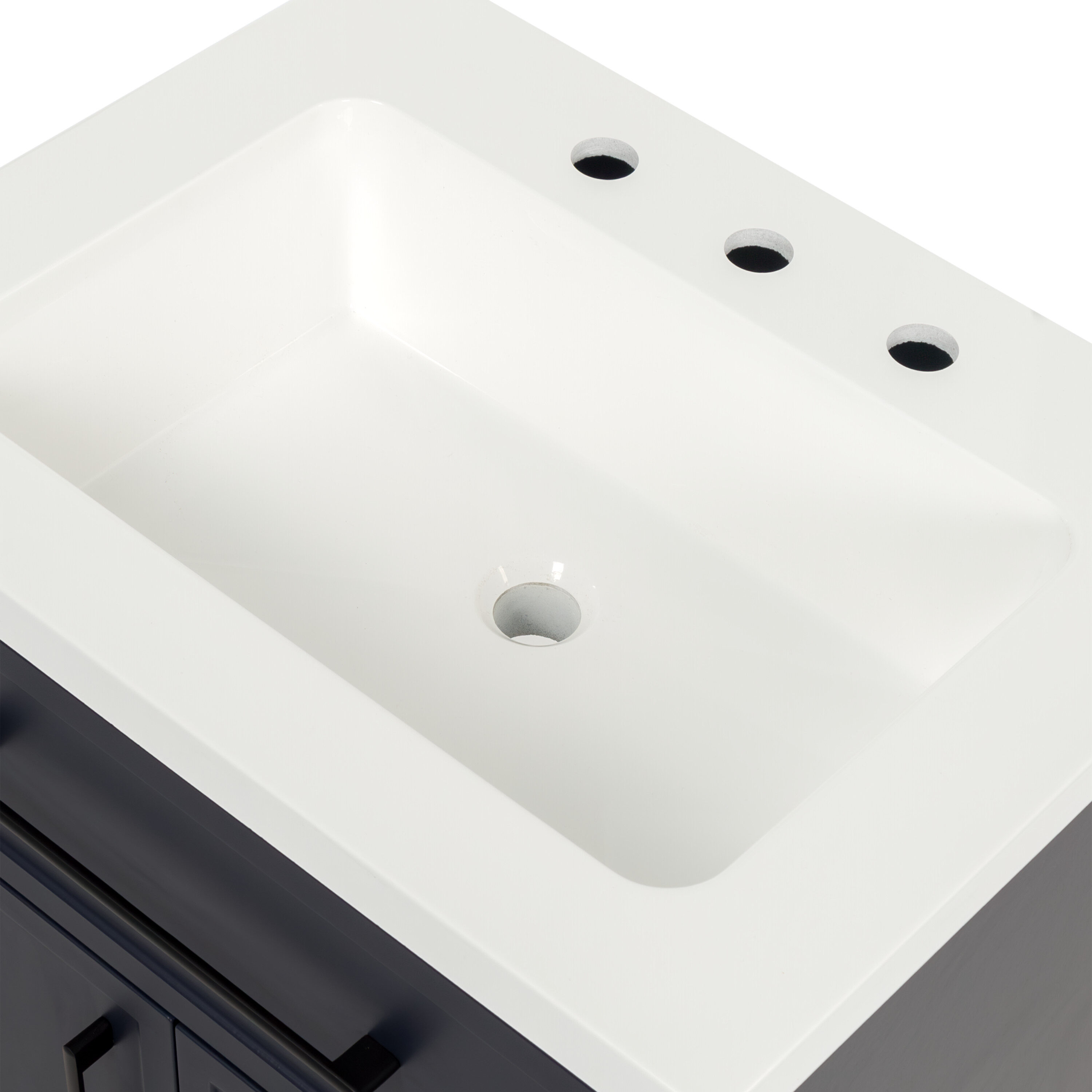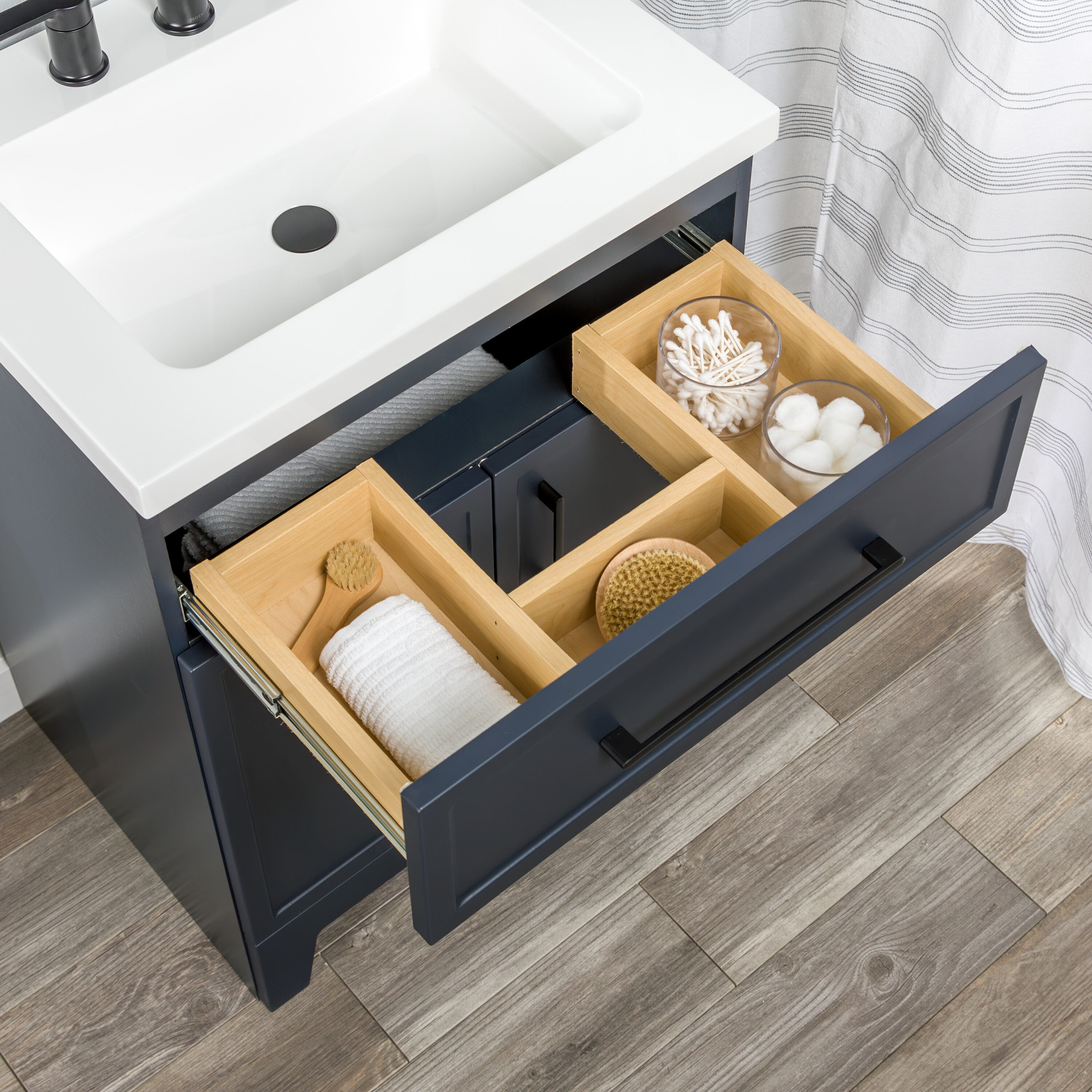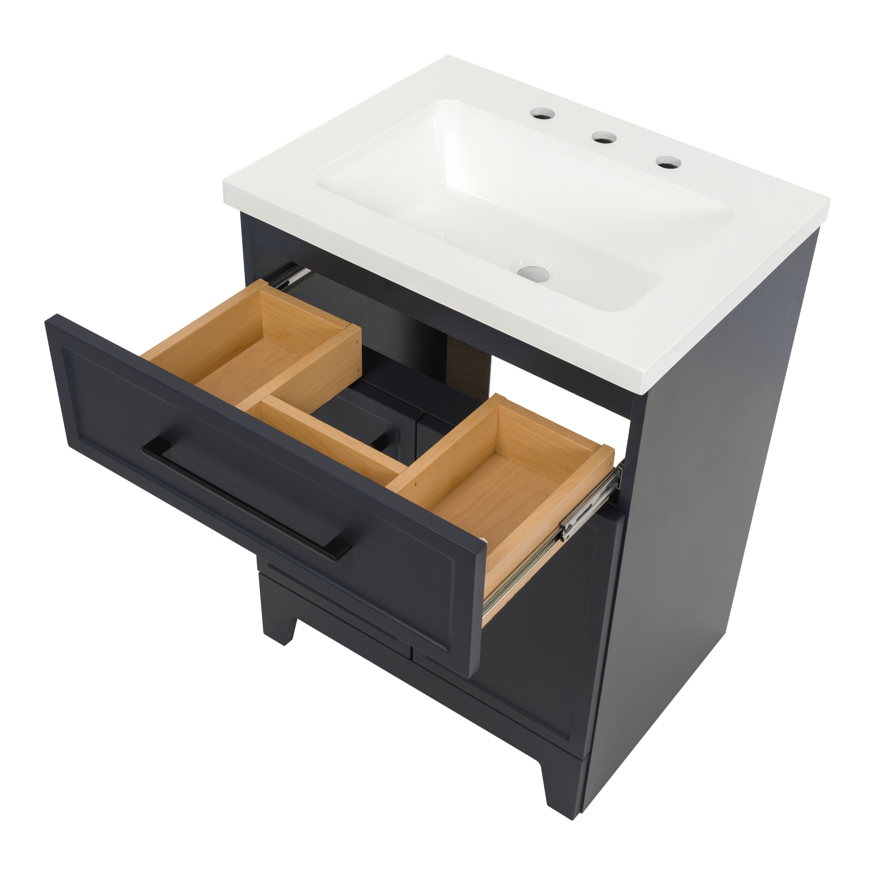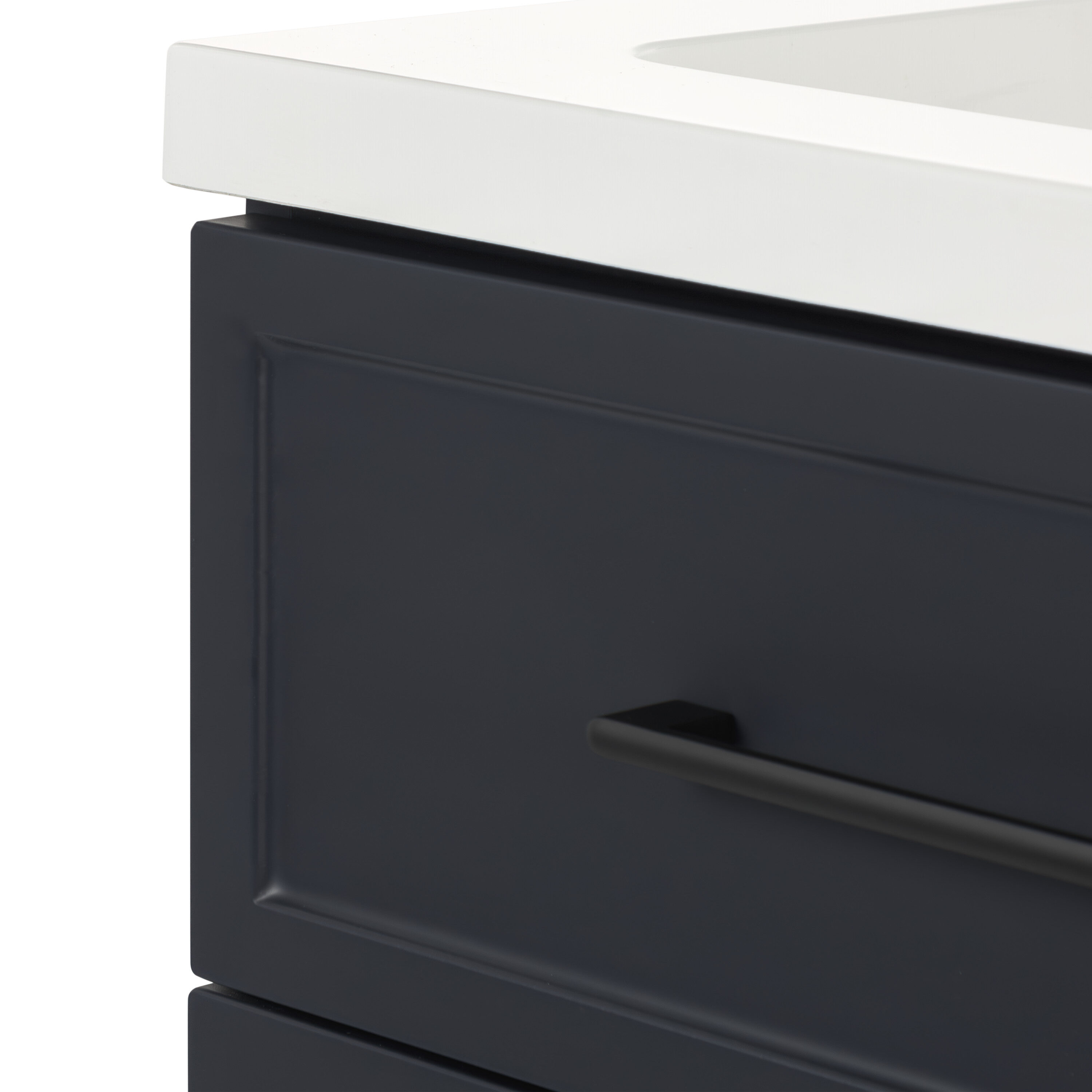 Transform your bathroom with the Potter 24.5-in W deep blue vanity. This single-sink bathroom vanity features a Shaker-style design that’s complemented by a 1-piece white cultured marble sink top and matte black hardware. Pre-assembled and ready to install, this vanity also includes a wraparound drawer with 3 compartments and a 2-door under-sink cabinet for easy-access storage space. This transitional vanity maximizes style and storage in bathrooms of all sizes.