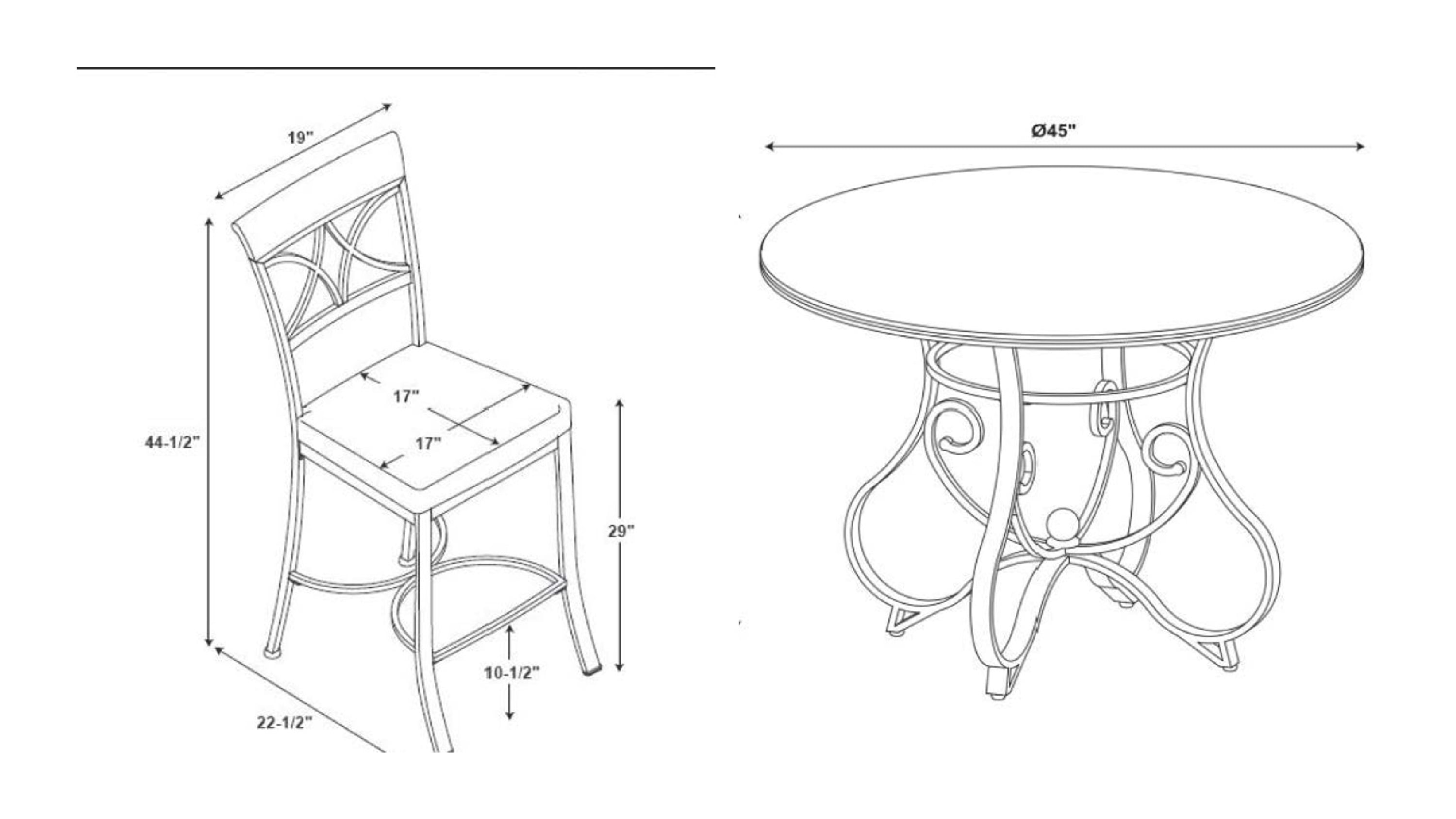 Transitional 5-Piece Hamilton Dining Set is perfect for gatherings. The round dining table features an interesting curve and scroll designed bottom. The side chairs feature a diamond shaped back, slight curved legs, and upholstered seat covered in a diamond patterned taupe/beige microfiber. Finished in “Brushed Faux Medium Cherry” wood with “Matte Pewter and Bronze” metal. Some assembly required. Features: Crafted from Metal, MDF with Birch Veneer, Particleboard, Oak, Foam and Fabric Matte Pewter and Bronze Metal Base Brushed Faux Medium Cherry Wood Finish Beige Diamond Patterned Upholstery (100% Polyester) Curve and Scroll Designed Base Ample Round Tabletop Five Piece Dining Set (One Table, Four Chairs) This item will ship in multiple cartons. Cartons may arrive separately Specifications: Assembly Required: Some Assembly Required Product Dimensions: Dining Table: 45″ dia. x 30″ tall; Chair: 19″w x 25.25″d x 39″ tall, Product Weight: Table: 49.4 lbs, Chair: 15.32 lbs Seat Height: 19.25″ Weight Capacity: Table: 300 lbs