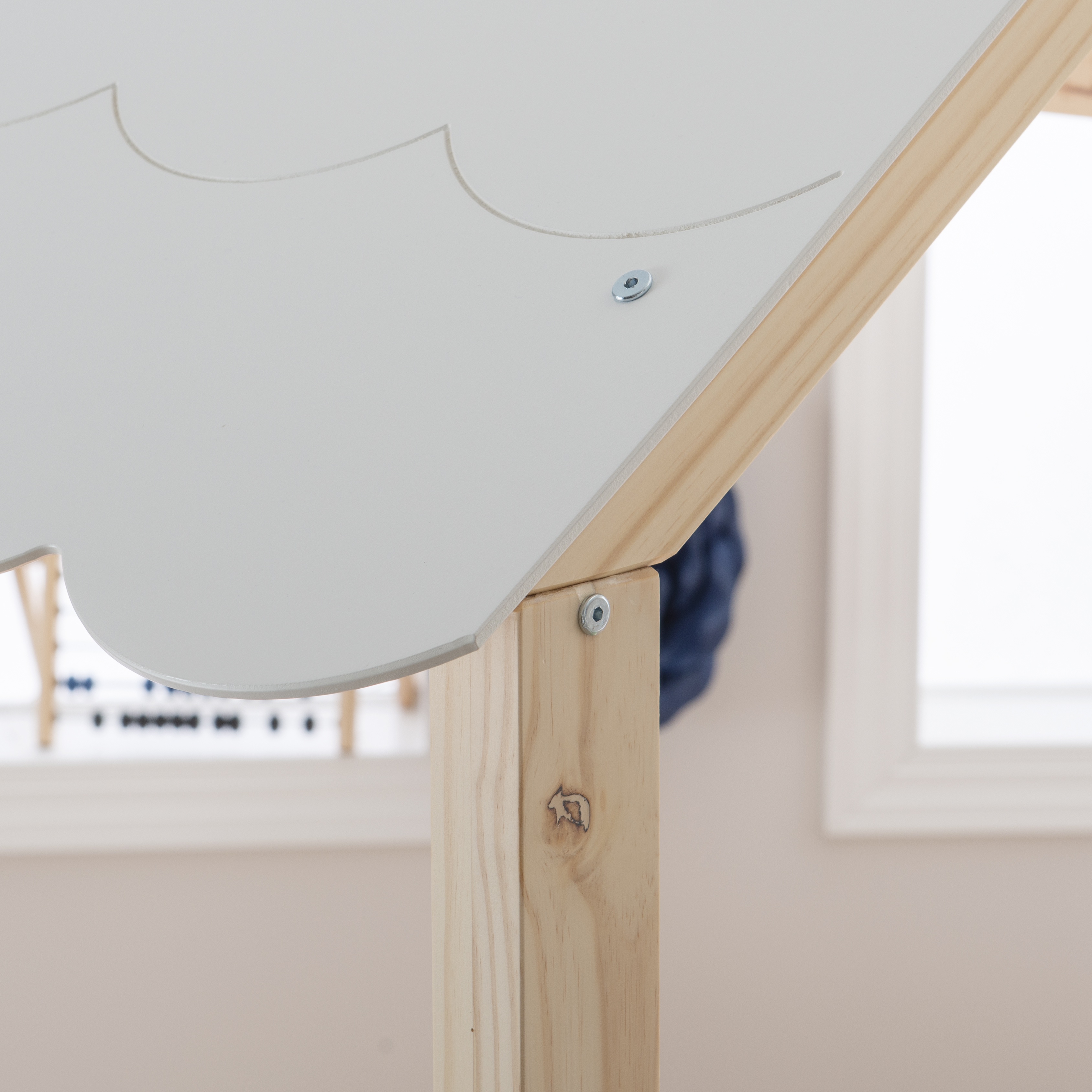 Let your child’s imagination run wild with this charming twin bed frame. With its adorable storybook look, this bed frame is a superb choice for both sleep and play. Unlimited options, you can assemble with a full roof, half roof or no roof at all. The white finish combined with natural pine accents blend well with any home design. Crafted from solid wood and mdf, this bed frame includes pine slats that alleviate the need for a box spring. Four sturdy pine legs create a safe space for your child to get a good night’s sleep.