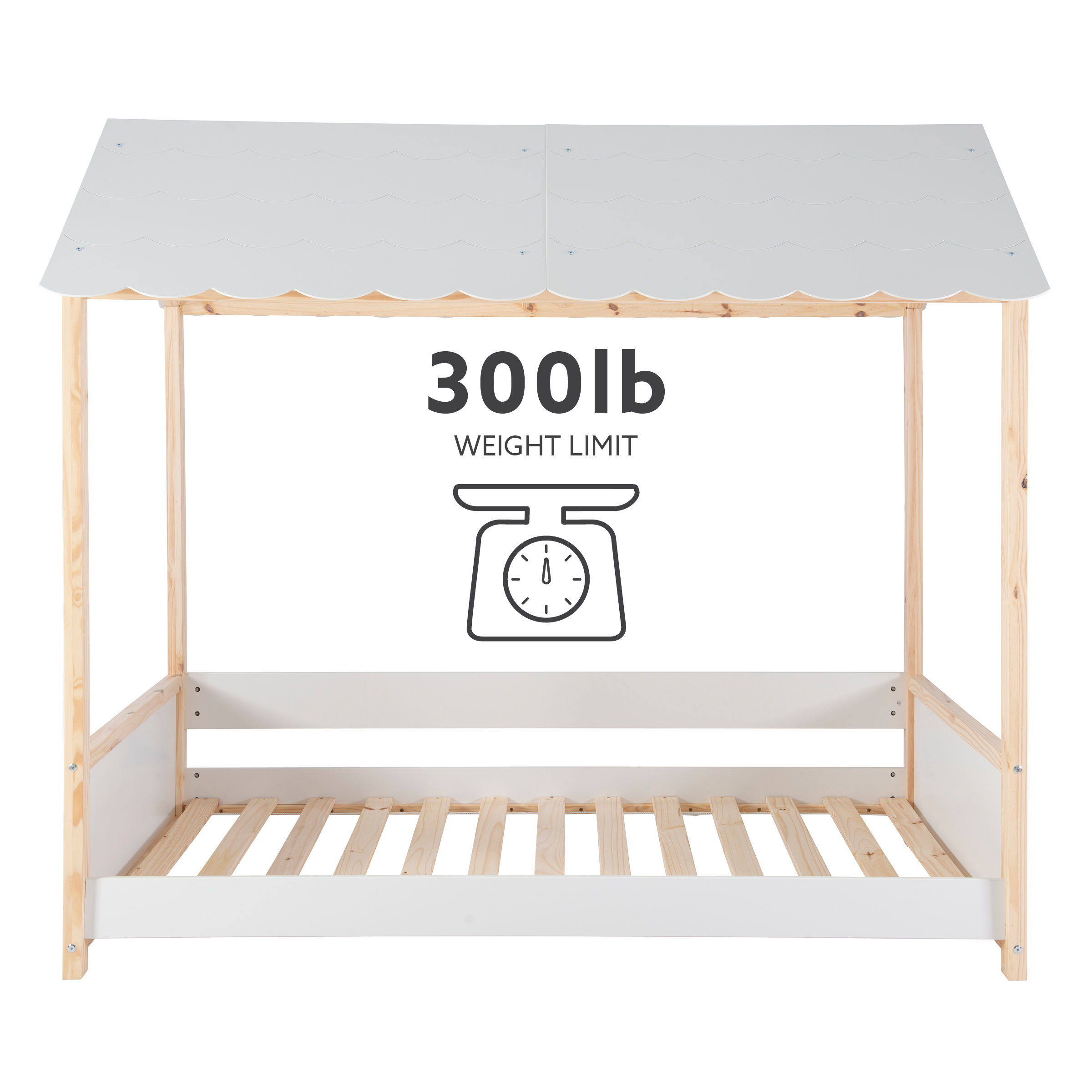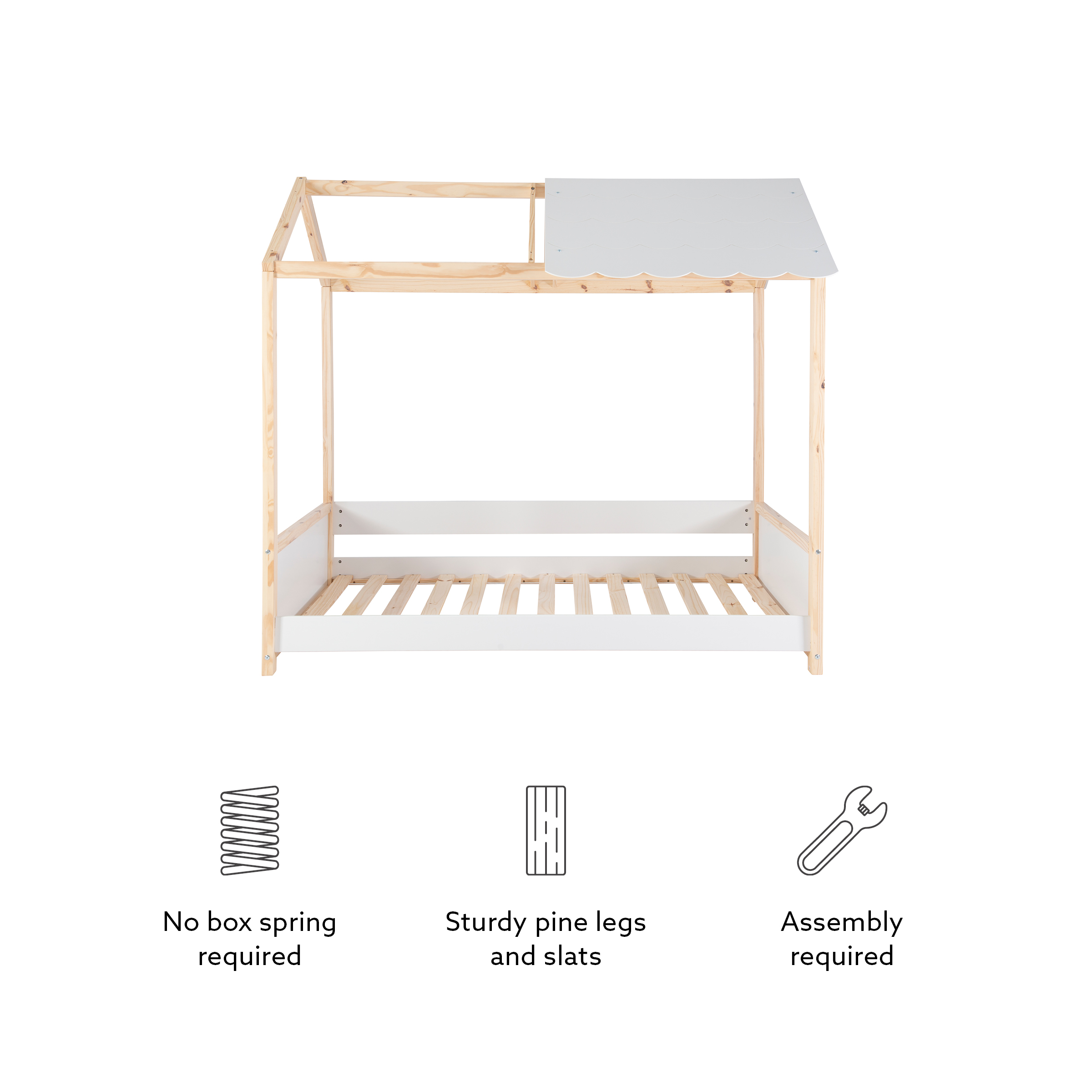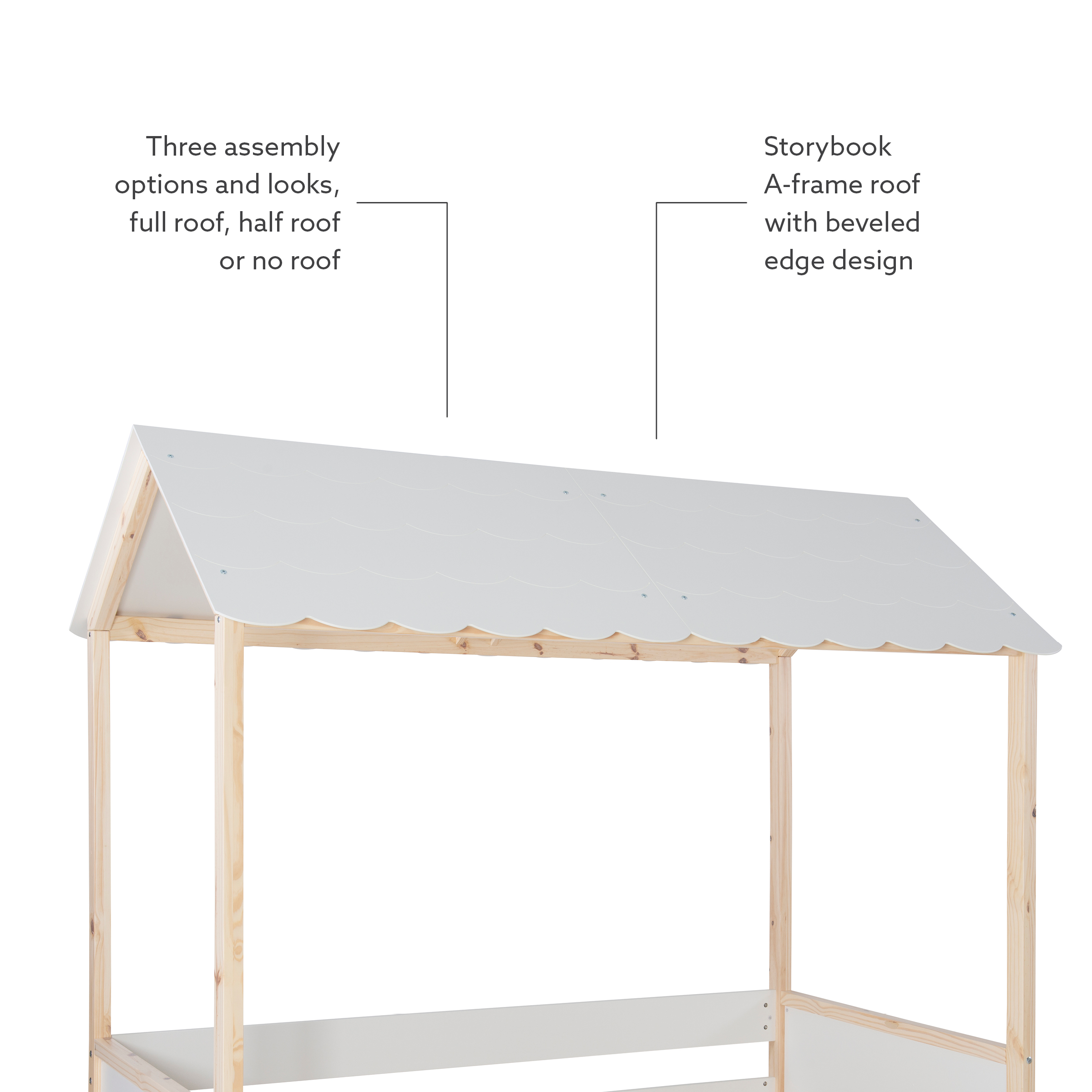 Dimensions: 80.88 W x 48.63 D x 72 H inches Playful bed frame supports a twin mattress Storybook A frame roof with beveled edge design Box spring not required Made from solid pine wood and MDF Finished in white accented with natural pine Supported by four solid square peg legs Easy to assemble Assemble with full roof, half roof or no roof Ships in 2 boxes