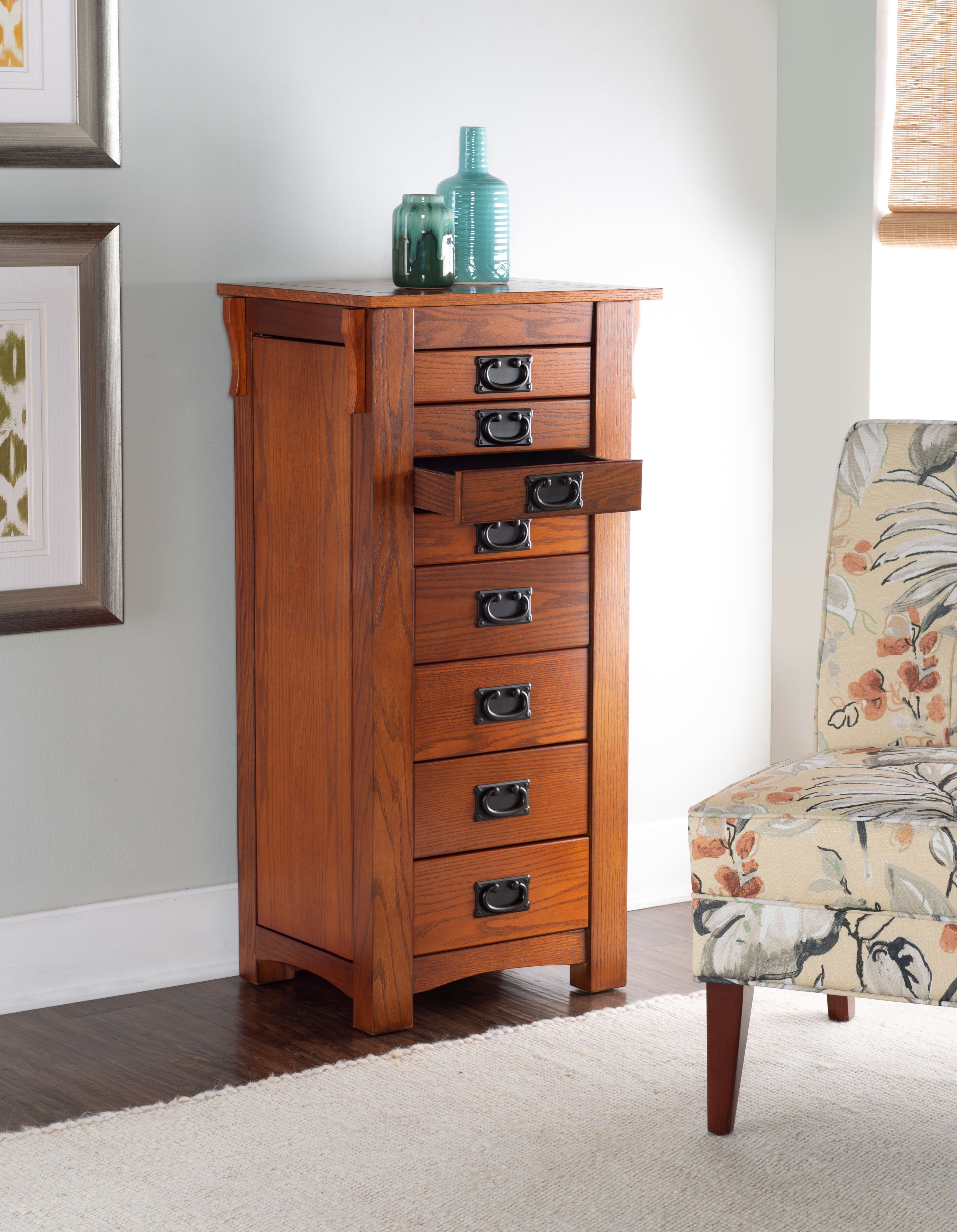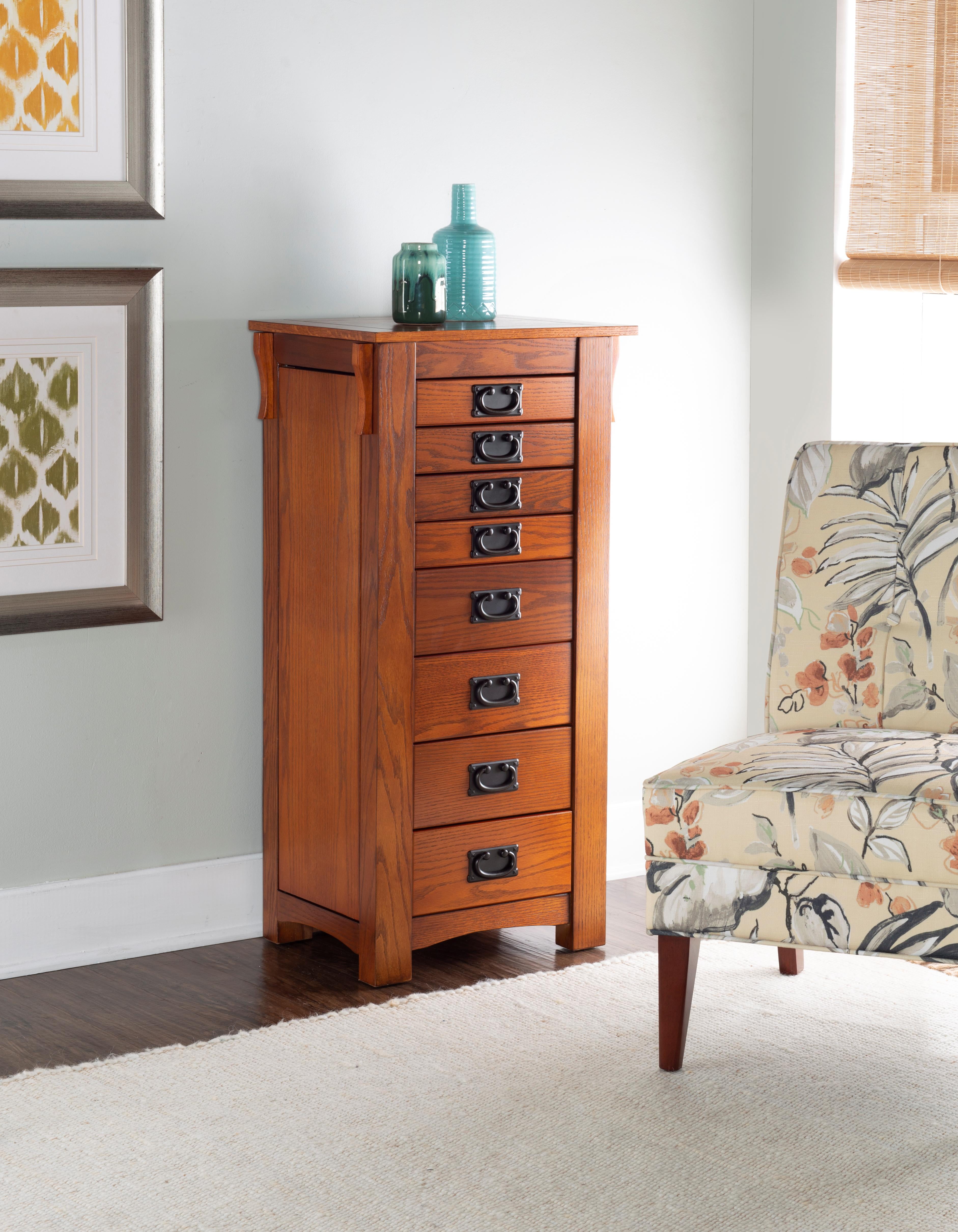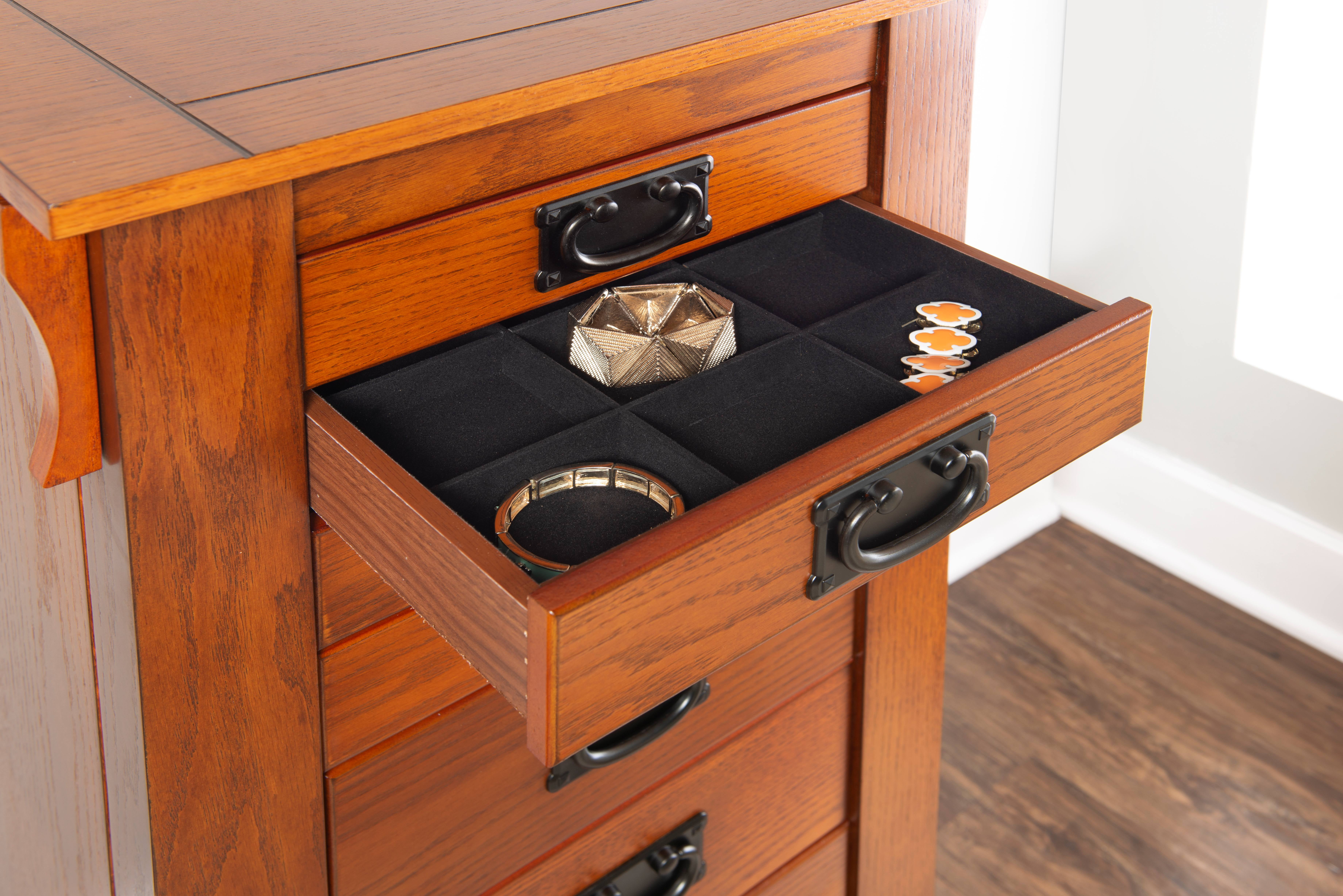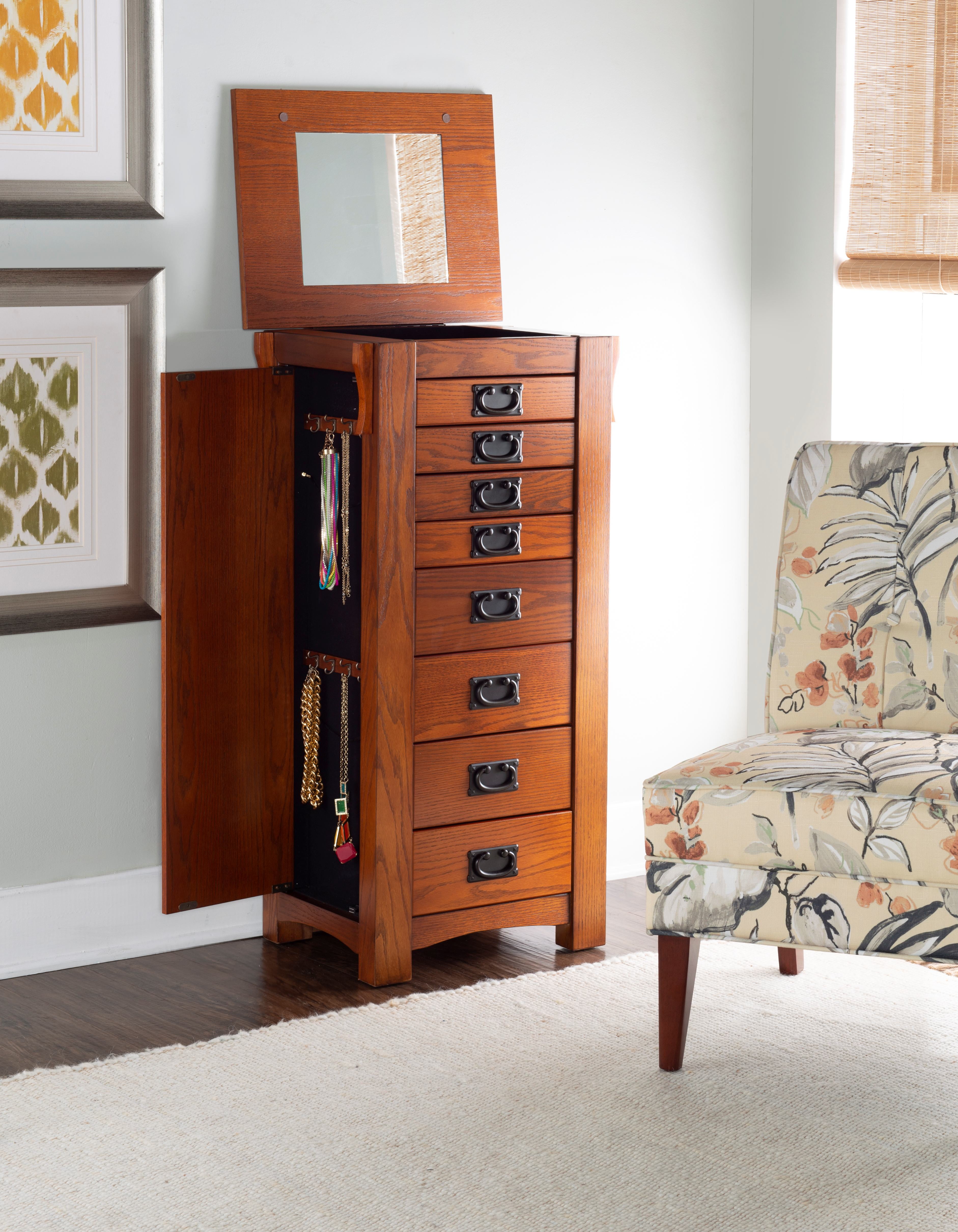 Free-standing “Mission Oak” finish armoire with “Mission Gray” hardware provides the ultimate storage for all of your jewelry and accessories. Store your rings, earrings and more in the eight black fully lined drawers. Flip-top mirror opens to a black lined compartment. Touch latch side doors swing open to store chains. Minimal assembly, attach top only. Features: Crafted from MDF, Particleboard, Plywood, Paper Veneer, Oak Veneer, Mirror and Rayon Mission Oak Brown Finish Black Finished Drawer Pulls Fully Lined Interior Provides ample storage space for all of your treasured pieces Comes with an anchor kit for safety Specifications: Assembly Required: Some Assembly Required Product Dimensions: Closed: 19.63″w x 15.25″d x 40.63″h, Open: 36″w x 15.25″d x 55.75″h Product Weight: 72.77 lbs Weight Capacity: 1 lb per Hook Drawer Dimensions: Drawer 1: 11.12″ x 8.37″ x 1.62″, Drawer 2: 11.12″ x 8.37″ x 4″