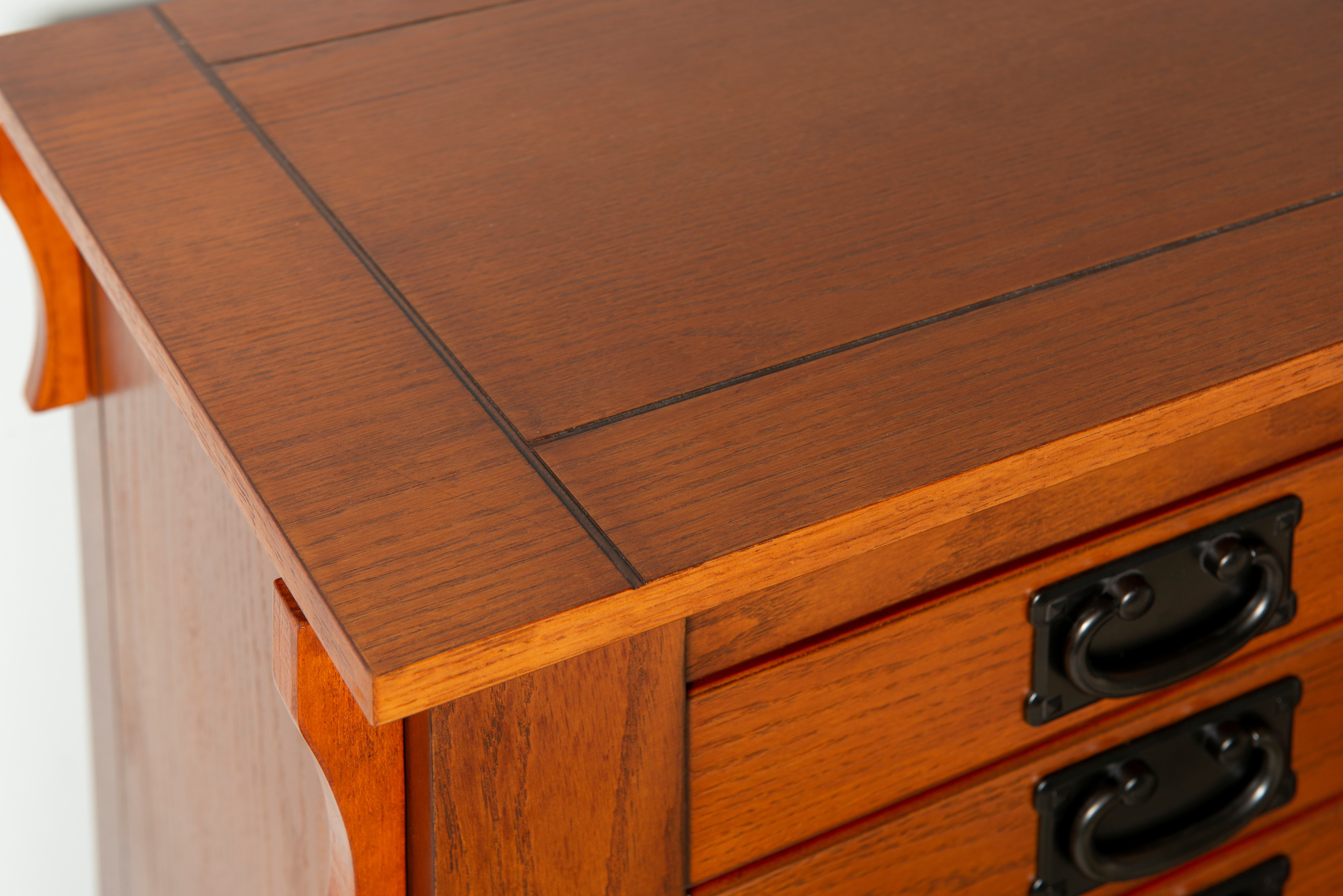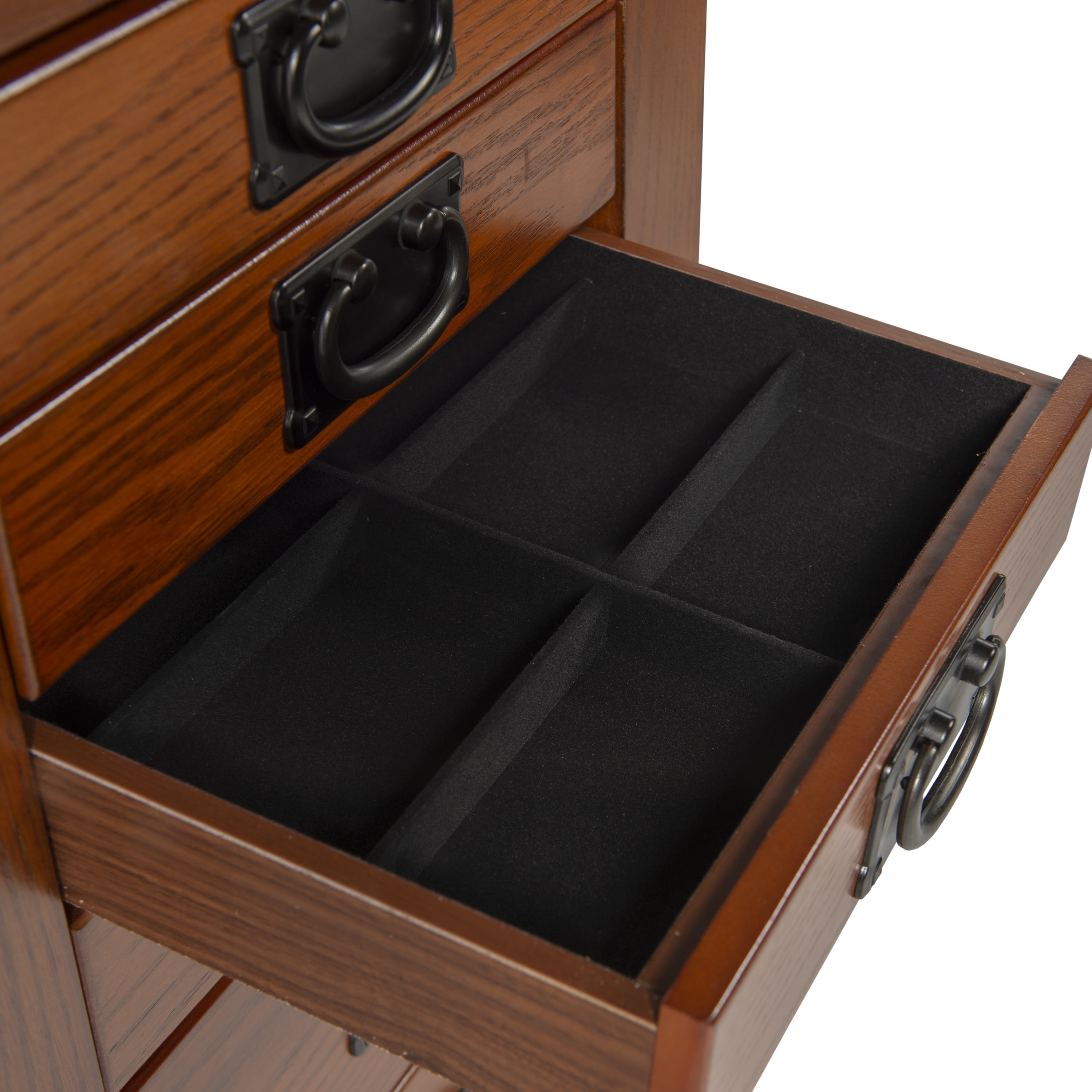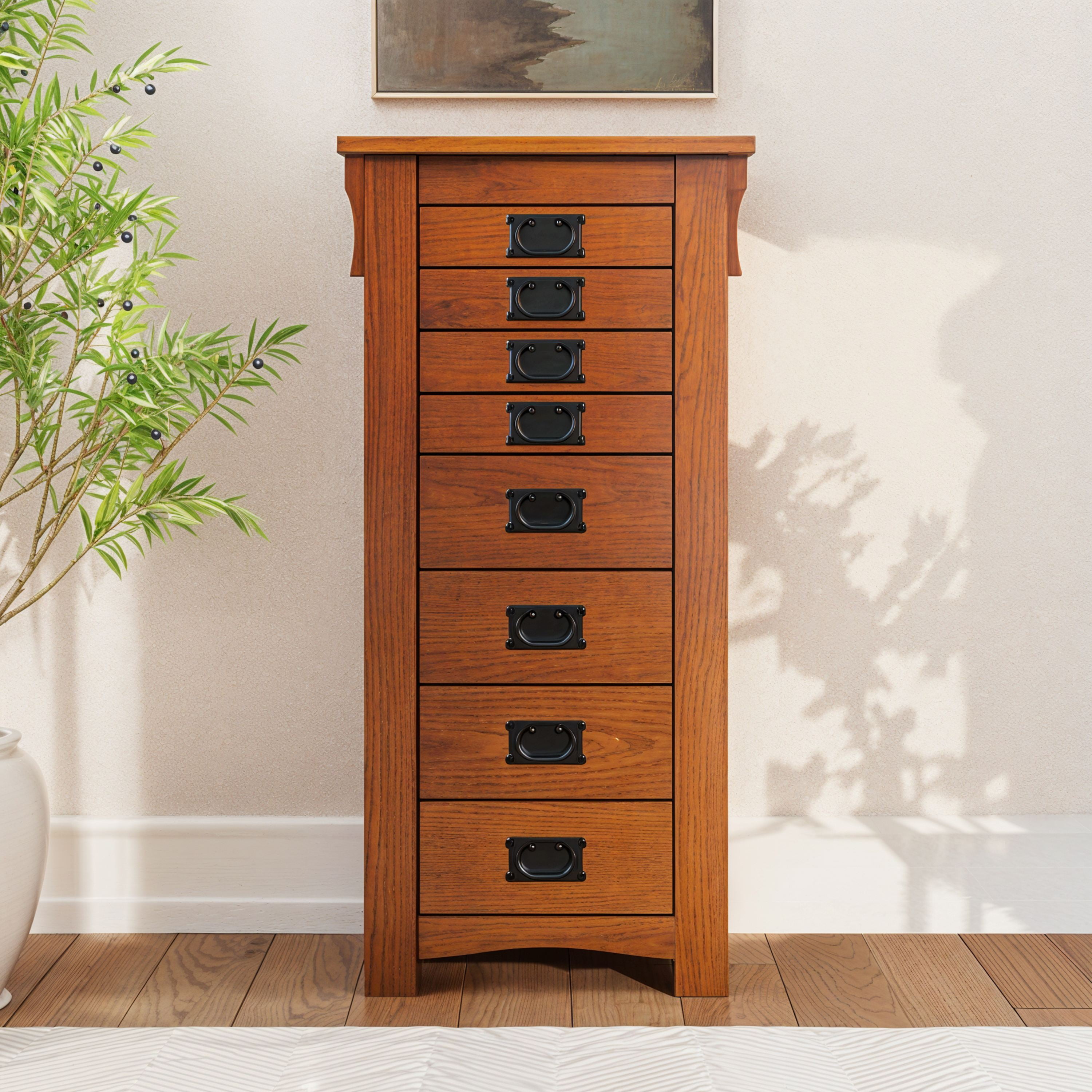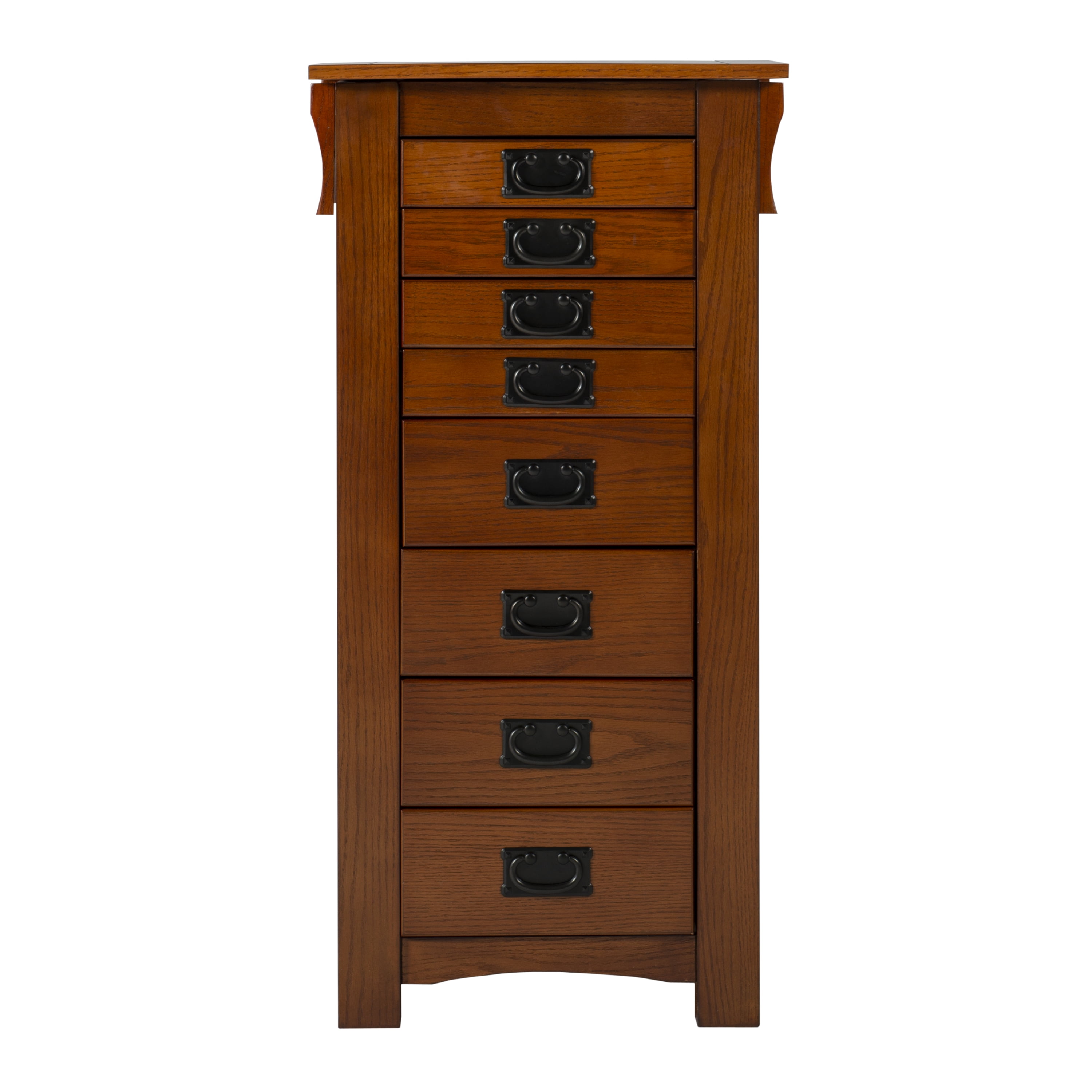 Free-standing “Mission Oak” finish armoire with “Mission Gray” hardware provides the ultimate storage for all of your jewelry and accessories. Store your rings, earrings and more in the eight black fully lined drawers. Flip-top mirror opens to a black lined compartment. Touch latch side doors swing open to store chains. Minimal assembly, attach top only. Features: Crafted from MDF, Particleboard, Plywood, Paper Veneer, Oak Veneer, Mirror and Rayon Mission Oak Brown Finish Black Finished Drawer Pulls Fully Lined Interior Provides ample storage space for all of your treasured pieces Comes with an anchor kit for safety Specifications: Assembly Required: Some Assembly Required Product Dimensions: Closed: 19.63″w x 15.25″d x 40.63″h, Open: 36″w x 15.25″d x 55.75″h Product Weight: 72.77 lbs Weight Capacity: 1 lb per Hook Drawer Dimensions: Drawer 1: 11.12″ x 8.37″ x 1.62″, Drawer 2: 11.12″ x 8.37″ x 4″