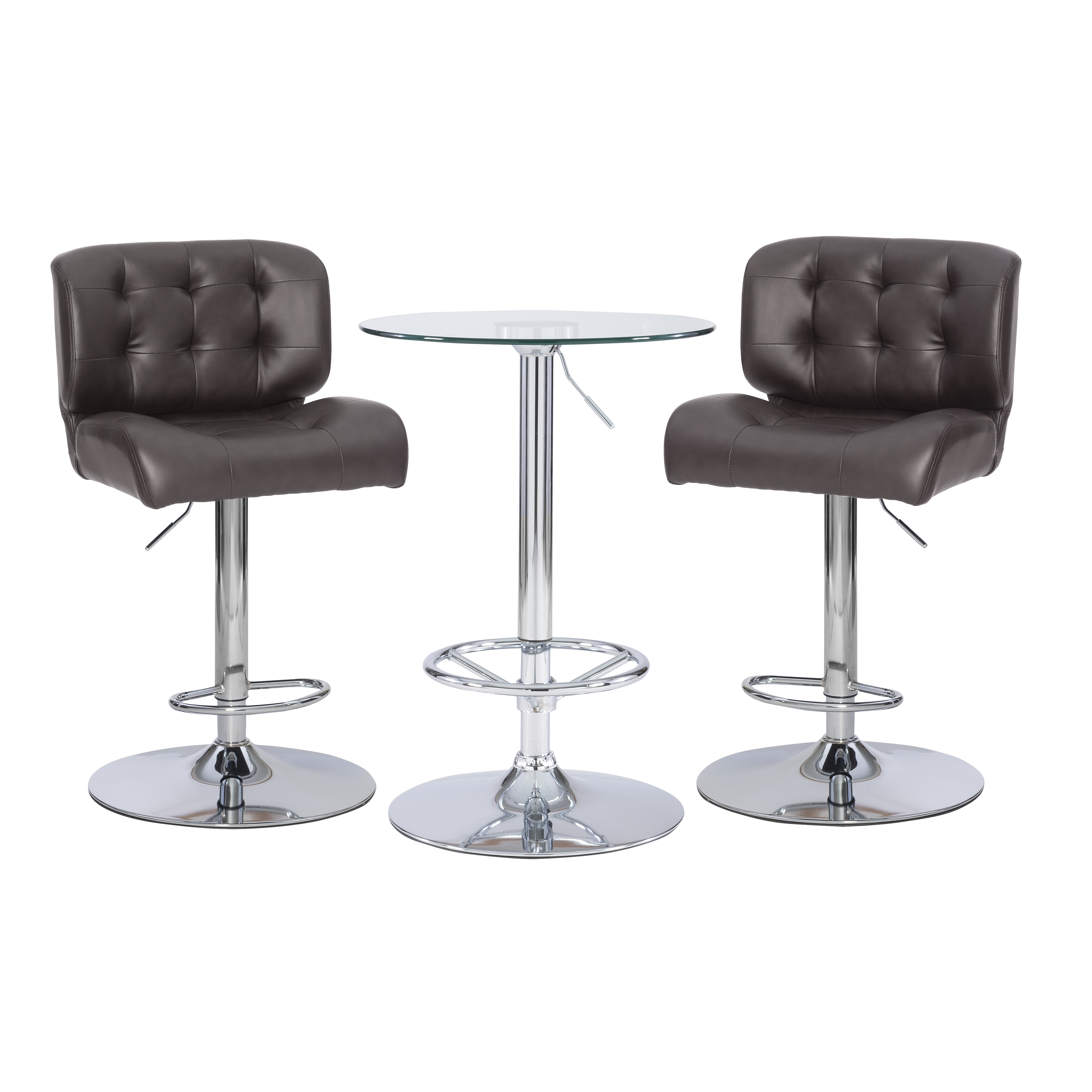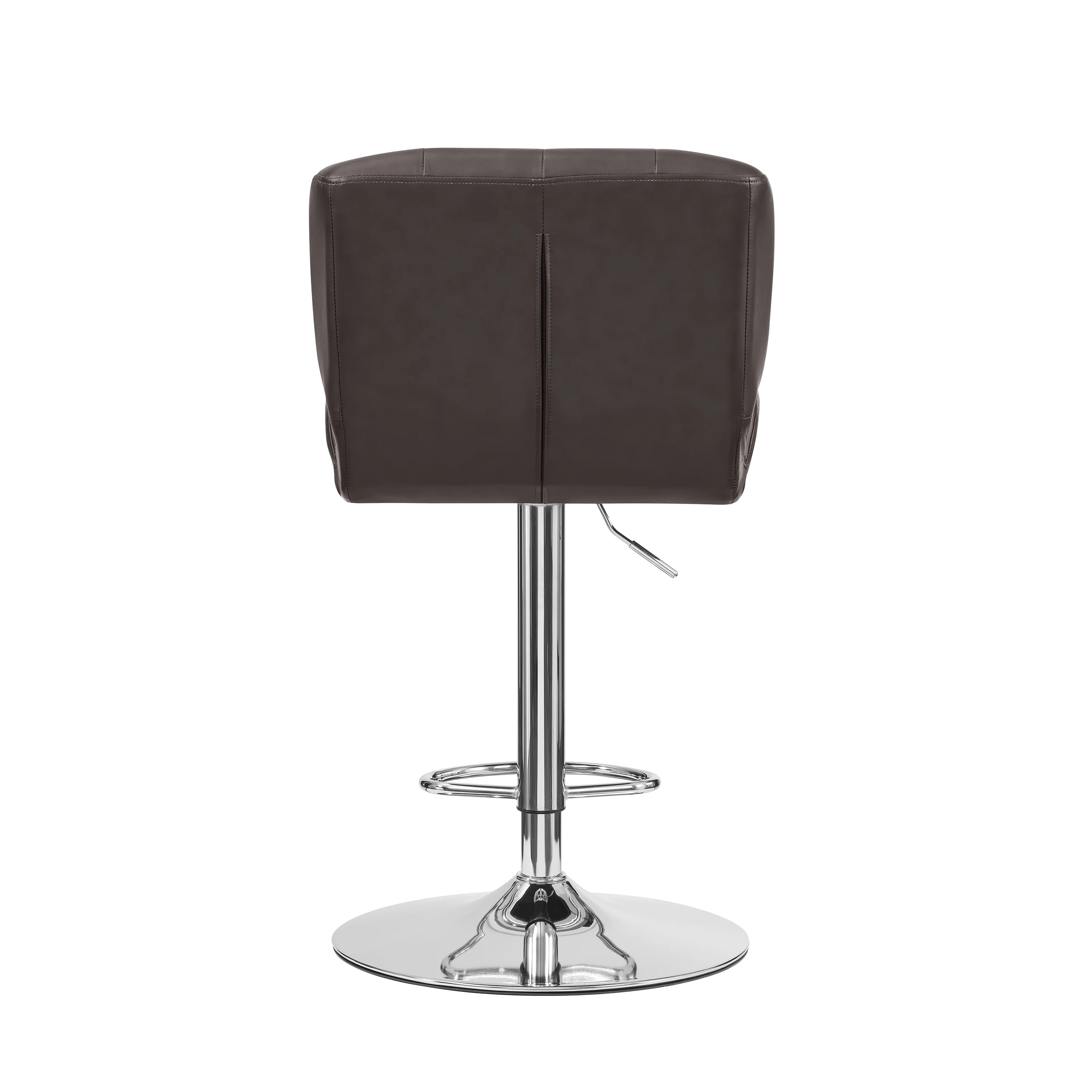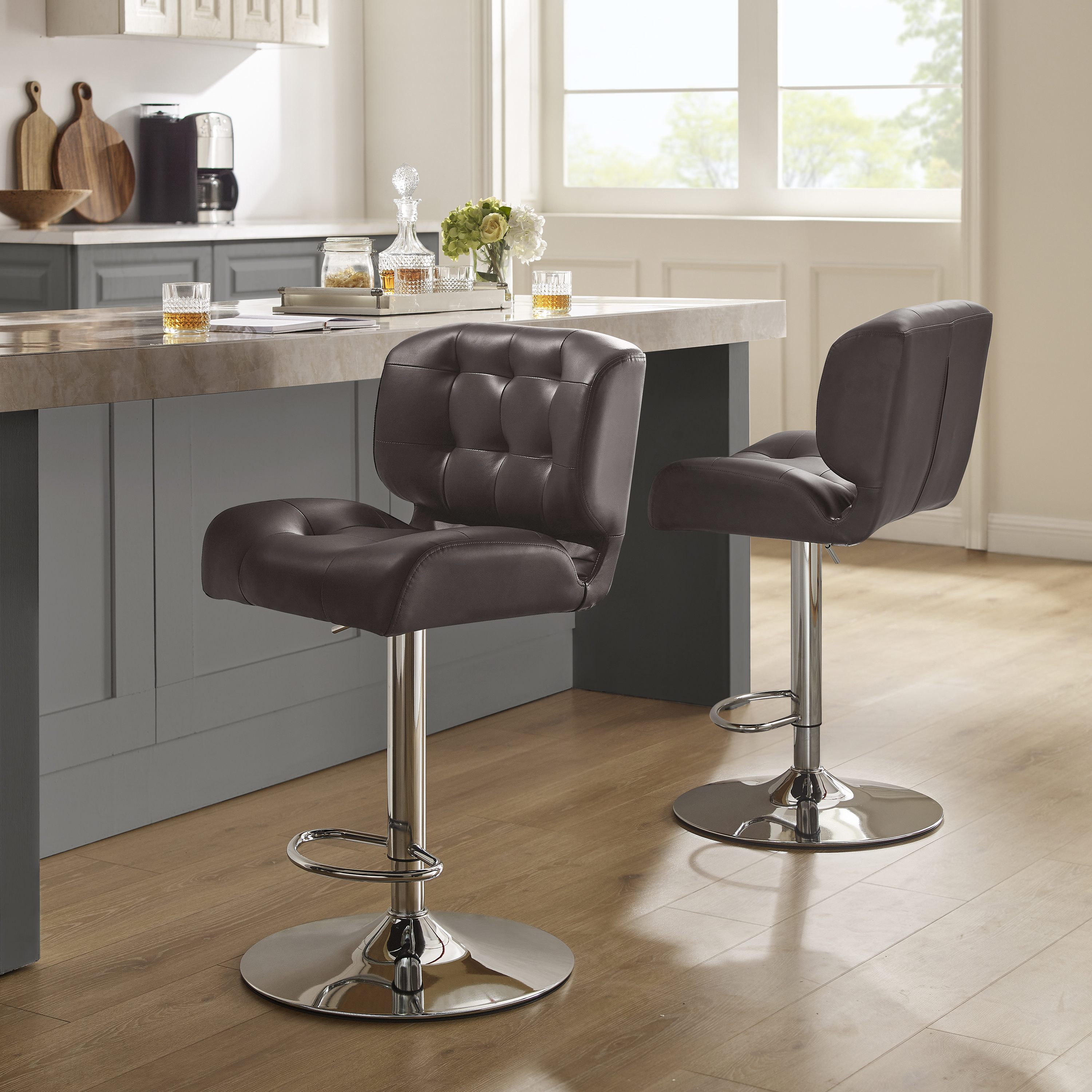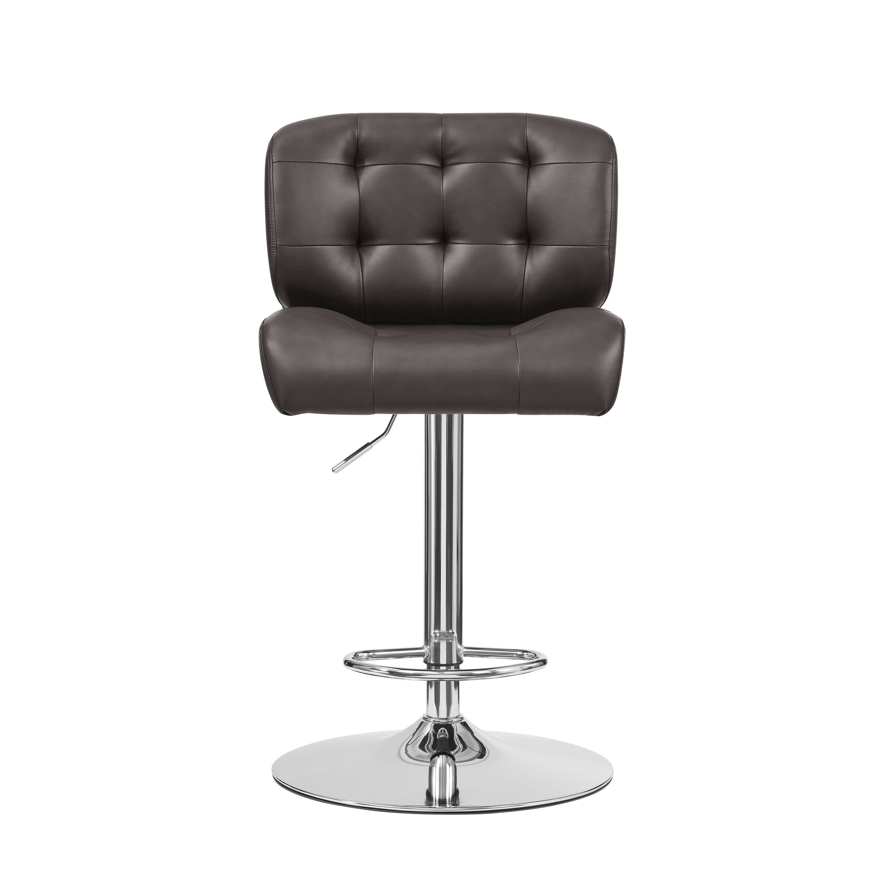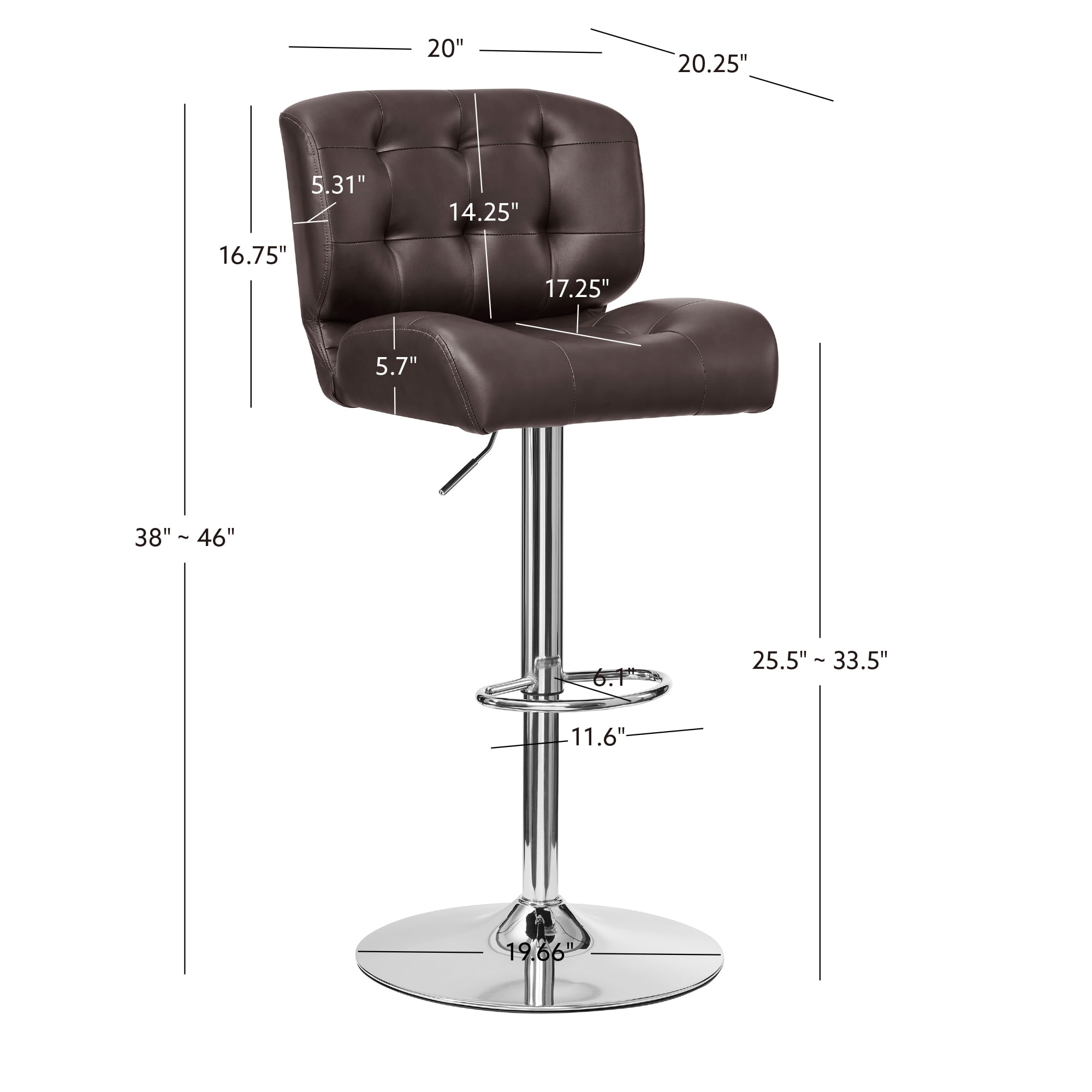 Tufted faux leather upholstery in chocolate offers timeless style and easy cleaning Sturdy metal base finished in polished chrome for endless shine Gas lift offers seamless height adjustments Circular pedestal base and footrest ensure stability 360 degree swivel allows for easy access to your surroundings Arrives with some assembly required and supports up to 225 lbs Protective ring on bottom of base to prevent scratching Commercial grade Ships in one box Assembled Dimensions: 20.5″ W x 20″ D x 38-46″ H Product Weight: 22.05 lbs For indoor use only