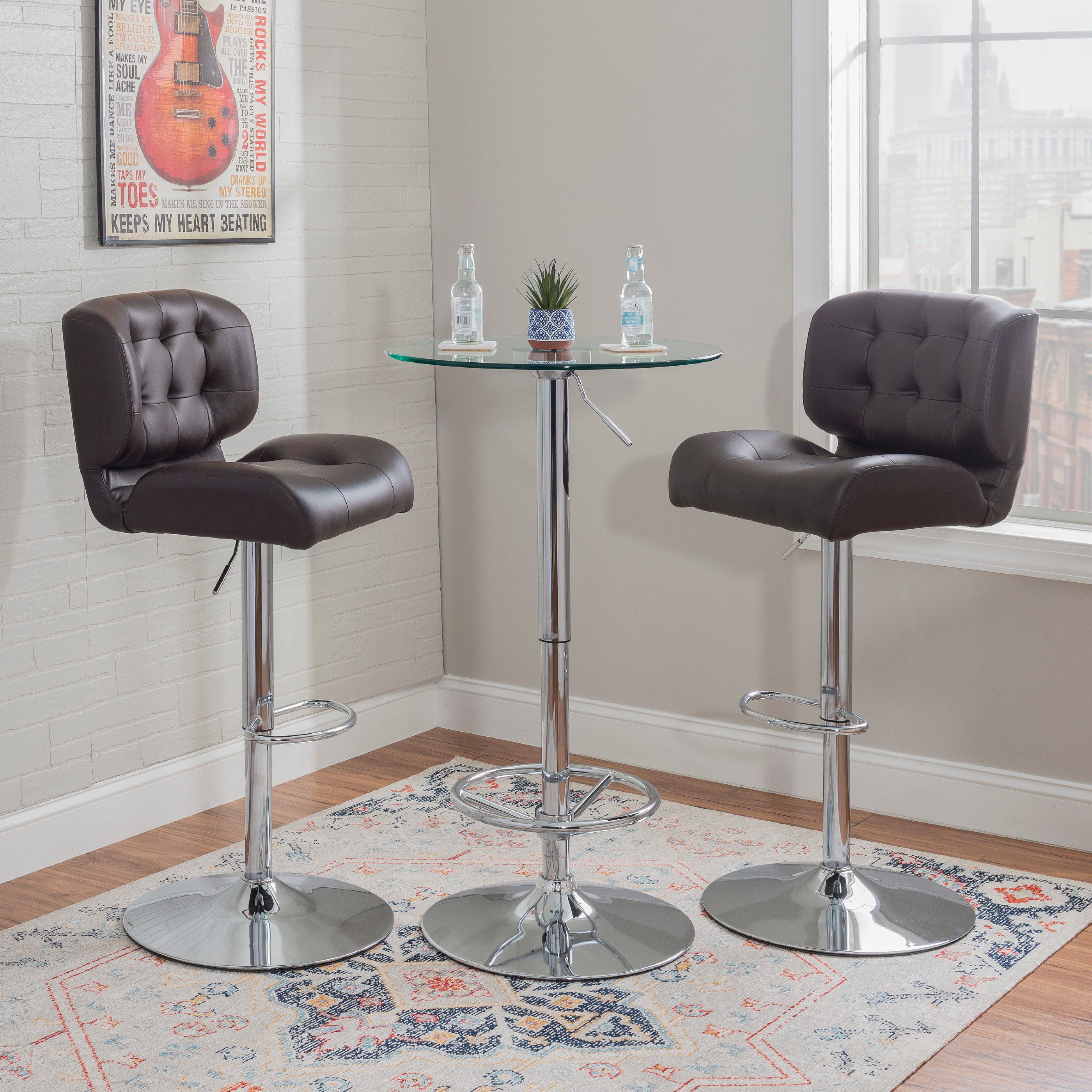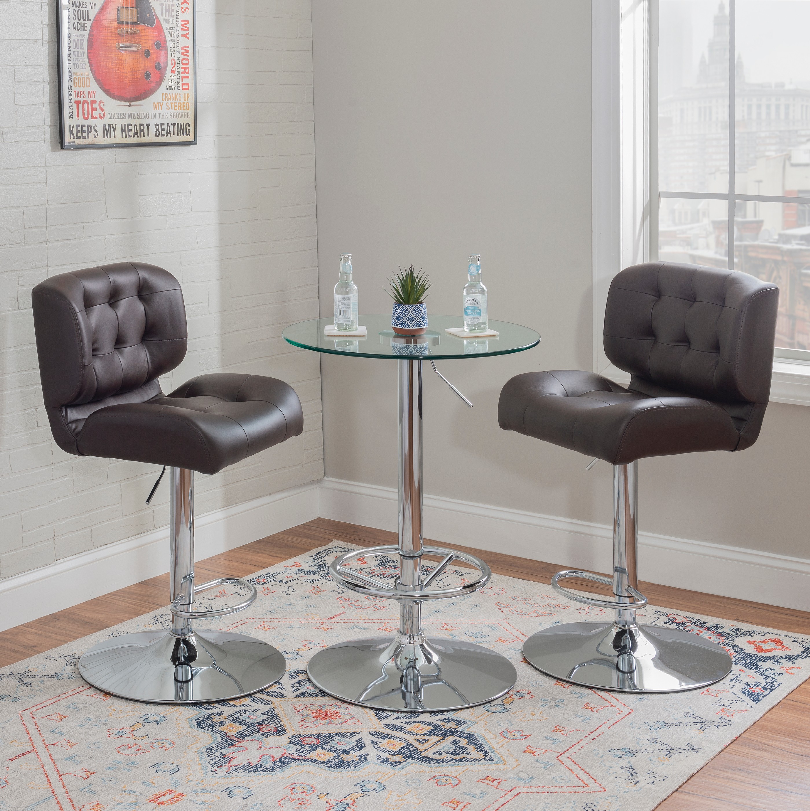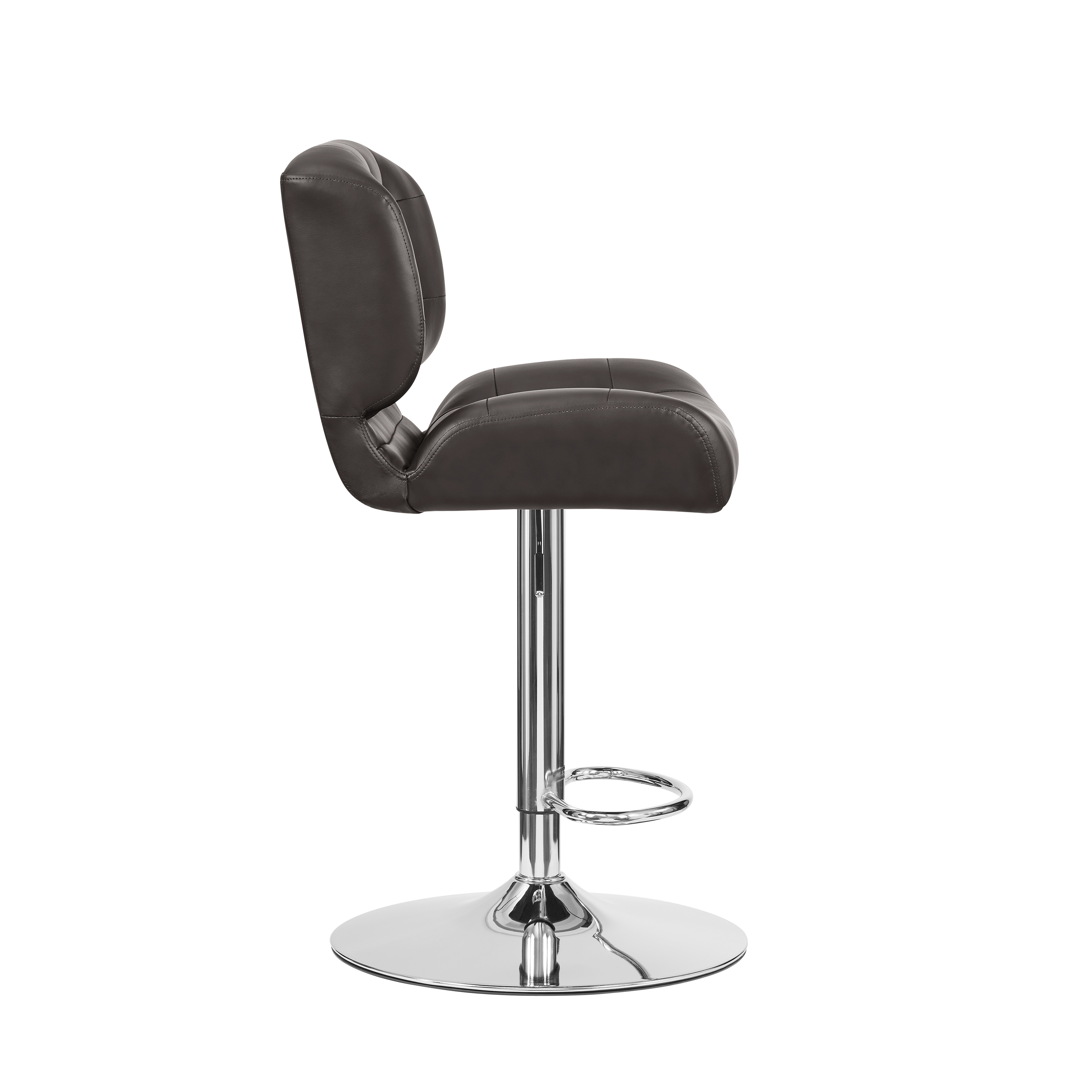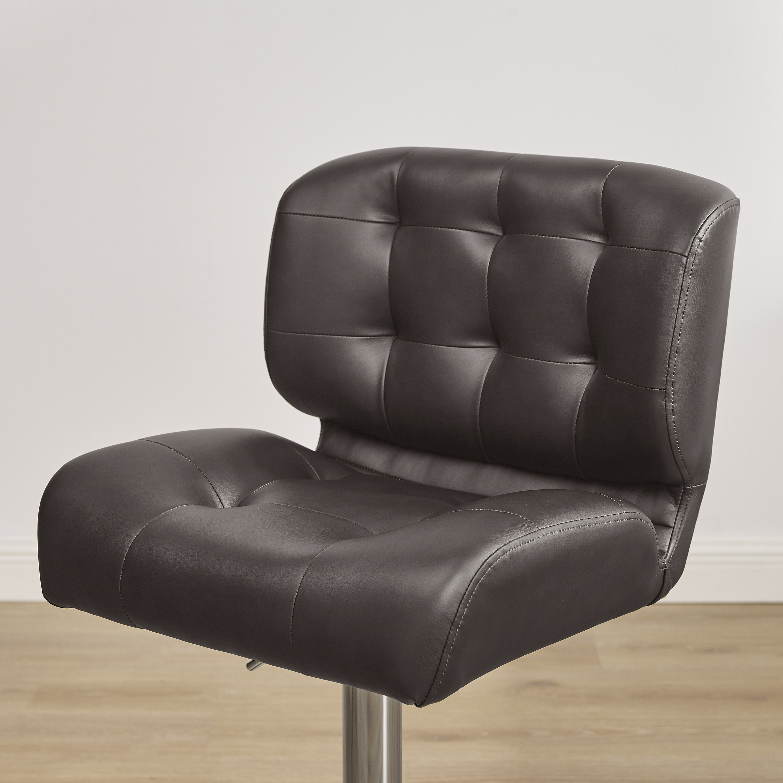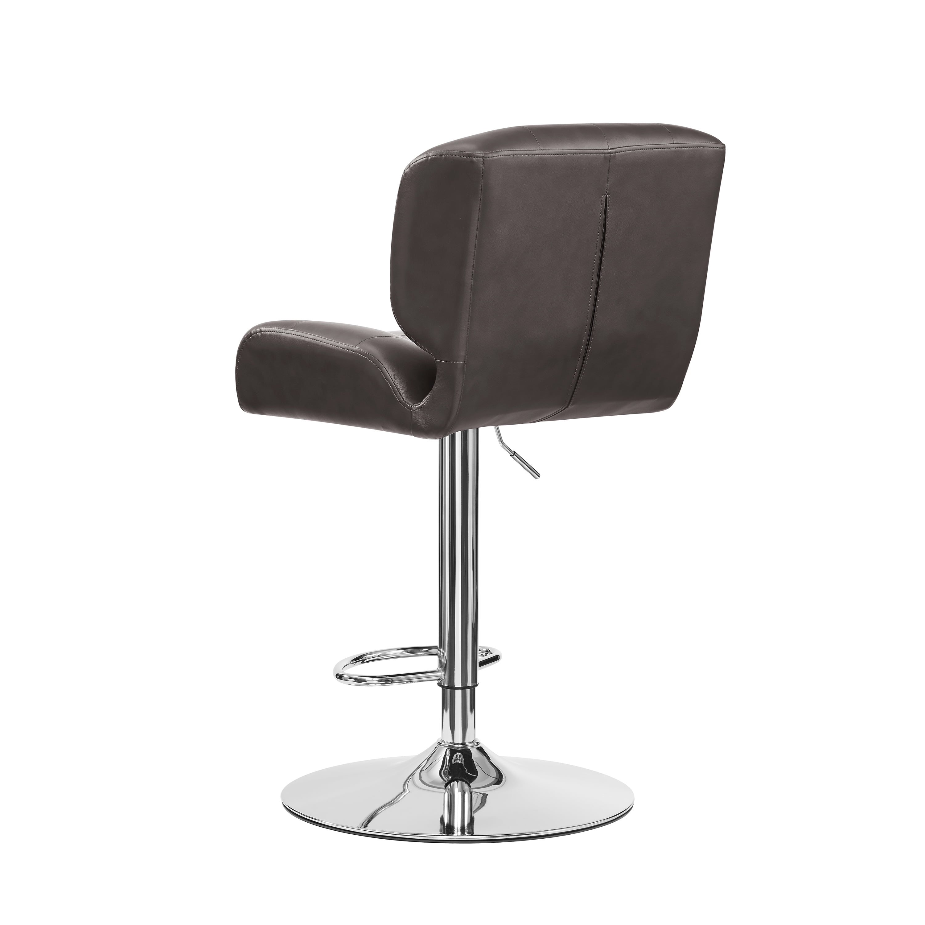 Introduce new levels of comfort to your home bar, kitchen or mancave with this modern bar stool. An over pronounced saddle seat is generously padded and upholstered in tufted chocolate faux leather. The circular pedestal base is made of metal and finished in polished chrome for endless shine and easy cleaning. Pick the height that’s right for you with the adjustable gas lift and enjoy extra support from the footrest as you swivel freely. Convenience, comfort and no fuss style are at your fingertips. Stool Dimensions: 20.5″ W x 20″ D x 38-46″ H. Item Weight: 22.05 lbs. For indoor use only.