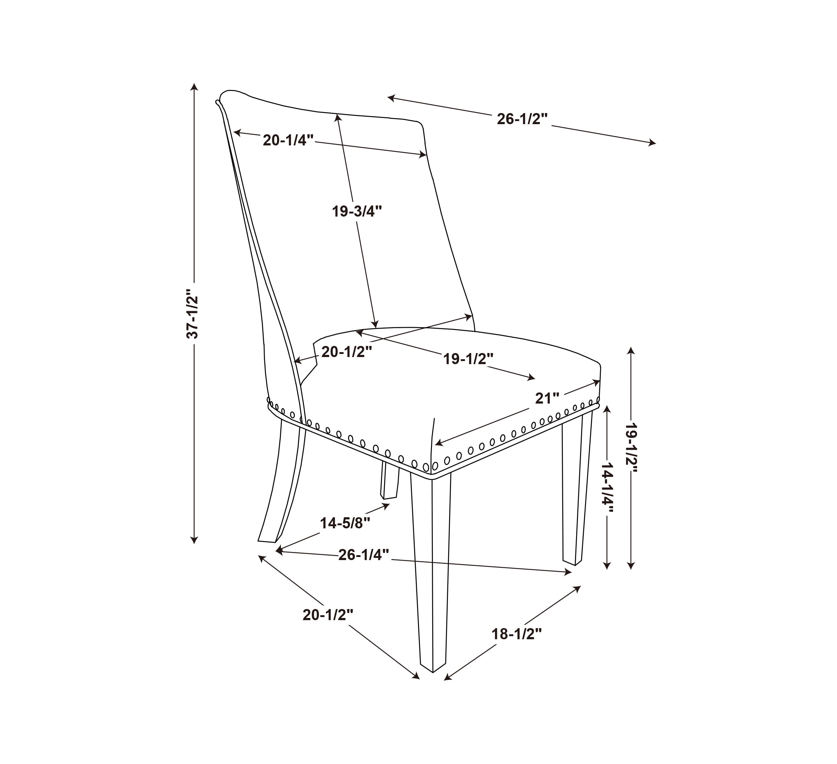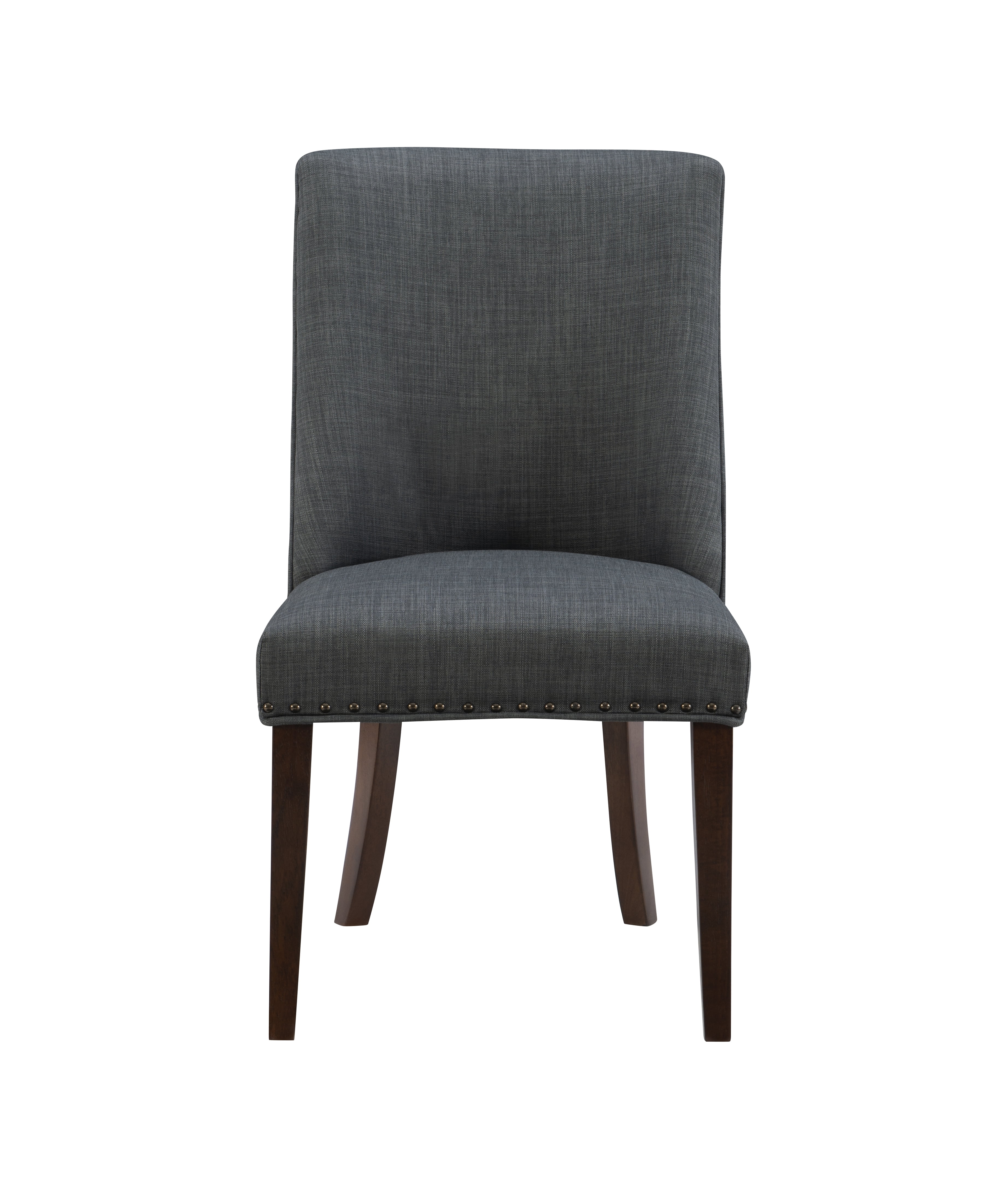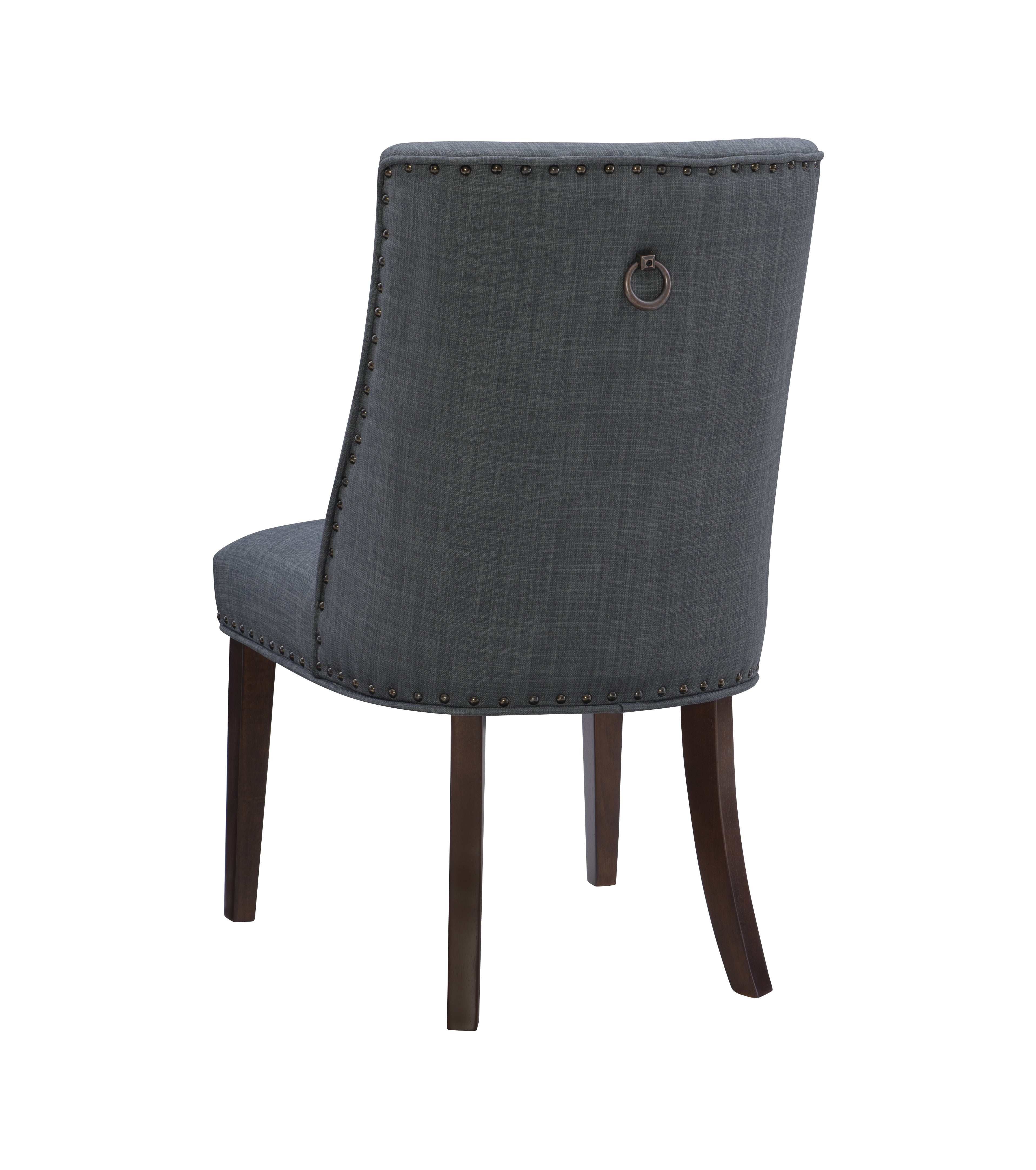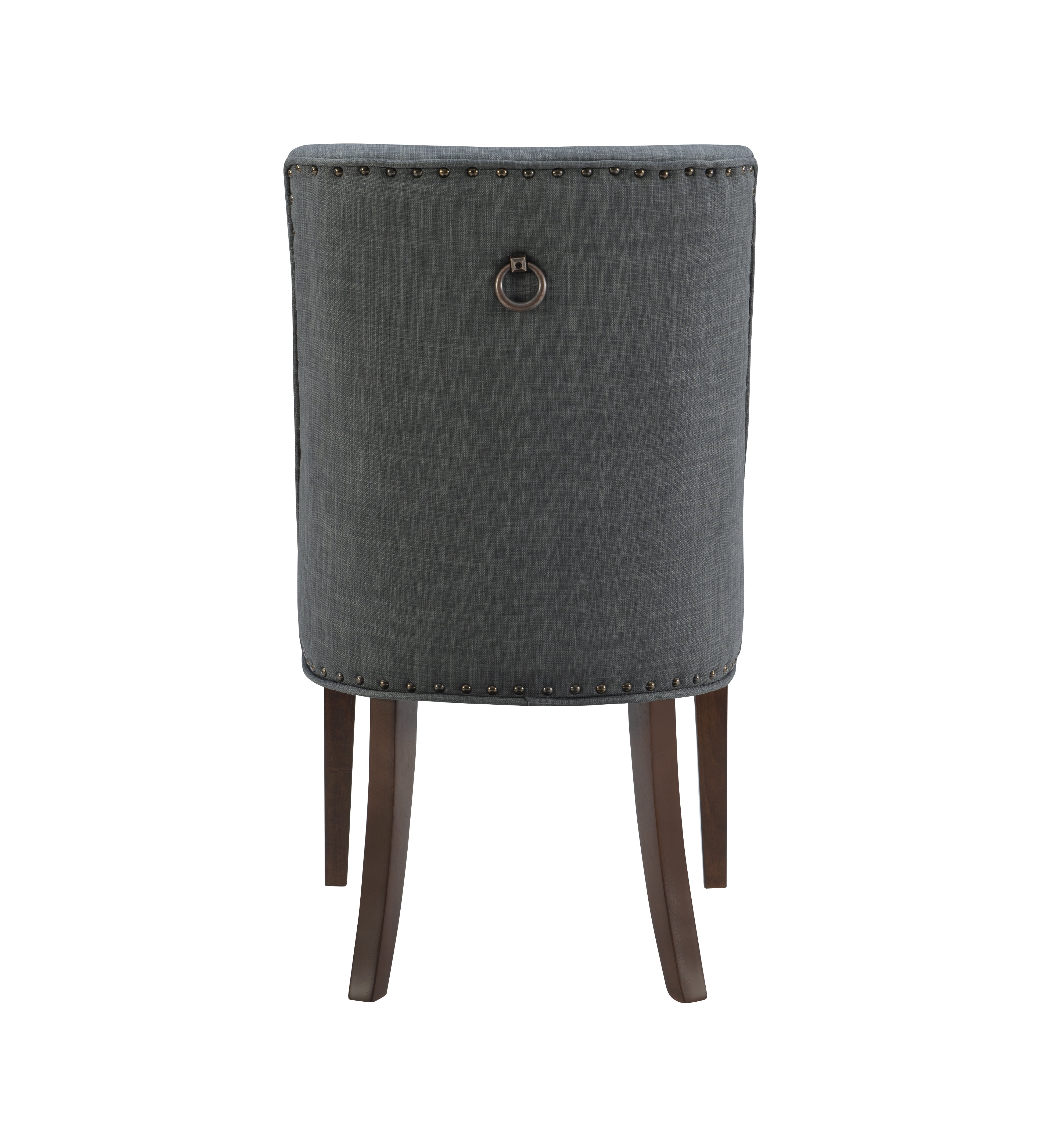 Sophisticated dining chair Features antiqued bronze nailhead trimming and a matching chair back ring pull Upholstered in rich dark gray linen weave fabric Easy to clean polyester seat Arc shaped backrest add comfort Natural finish on leg Solid in a set of two Some assembly required Assembled Dimensions: 21″ W x 26.75″ D x 38.25″ H Weight Capacity: 225 lbs Ships in one box