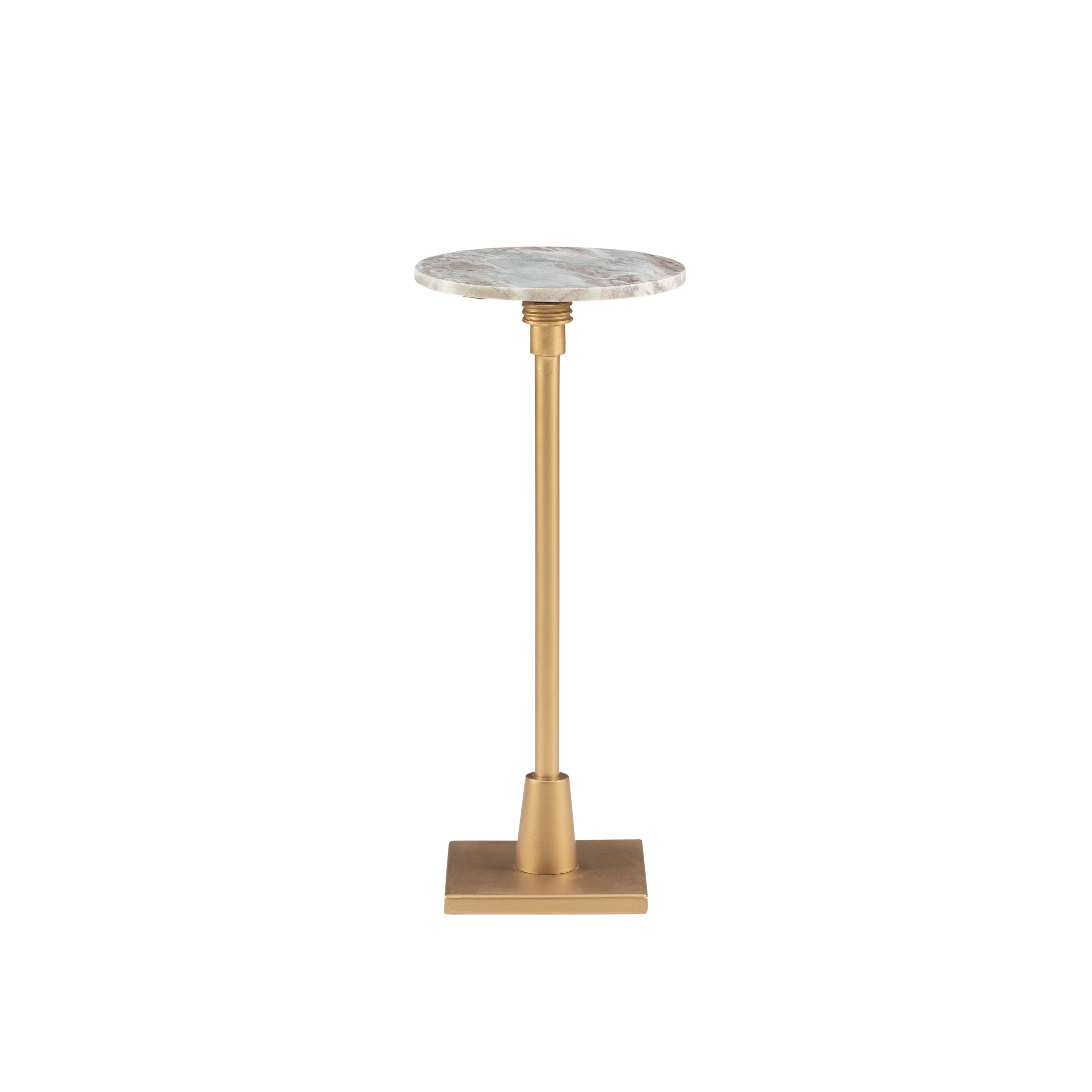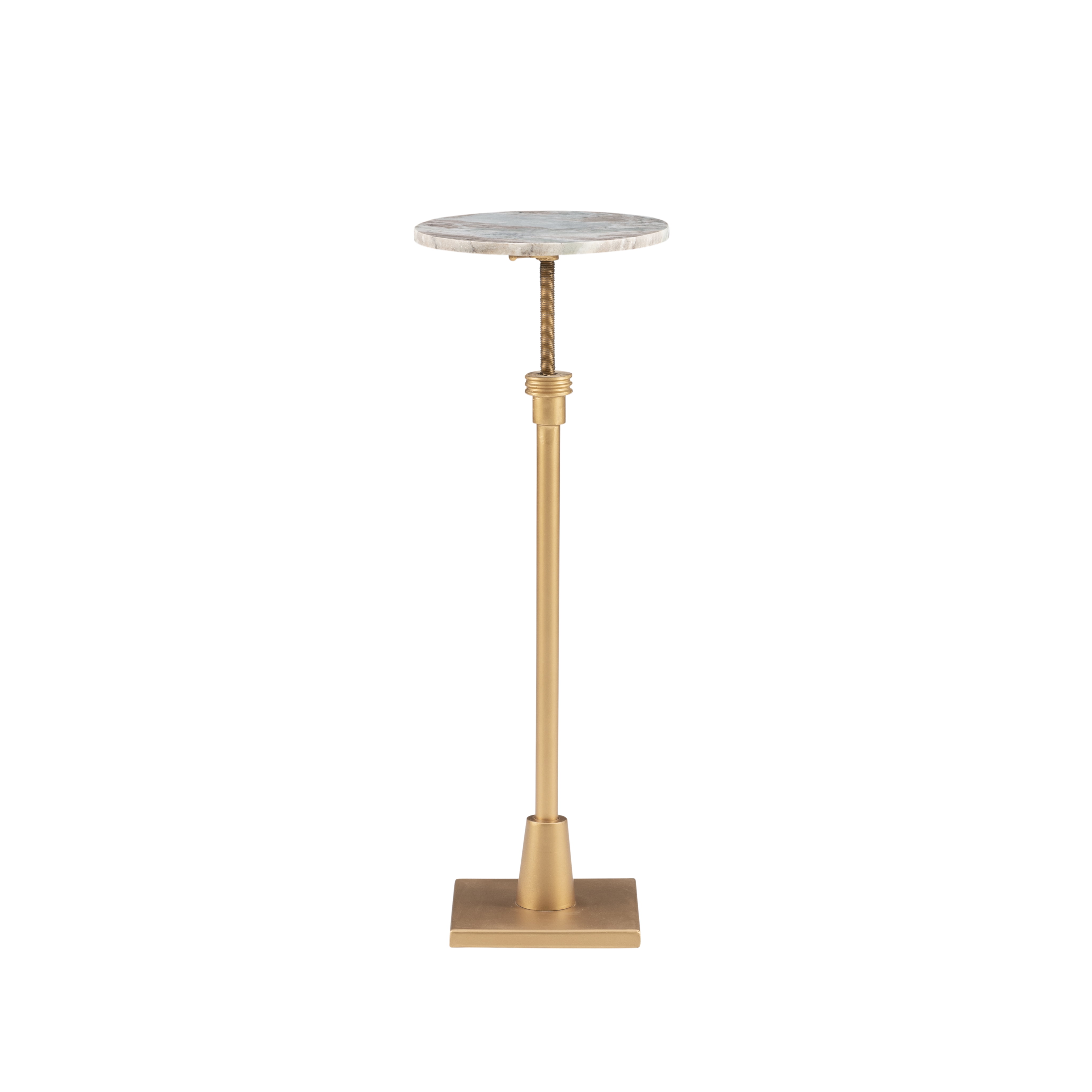 10.5in round sandy marble slab makes for a stunning table top Gold iron base can be adjusted to table heights between 25in and 30in Compact design fits perfectly next to a couch set of chairs or holds its own in an open space Regal and eccentric look is sure to bring new energy to your home delighting guests and family alike Levelers on sturdy flat base ensure stability Supports up to 25 lbs Arrives fully assembled Assembled Dimensions: 10.50″ L x 10.50″ D x 25-30″ H Ships in 1 box