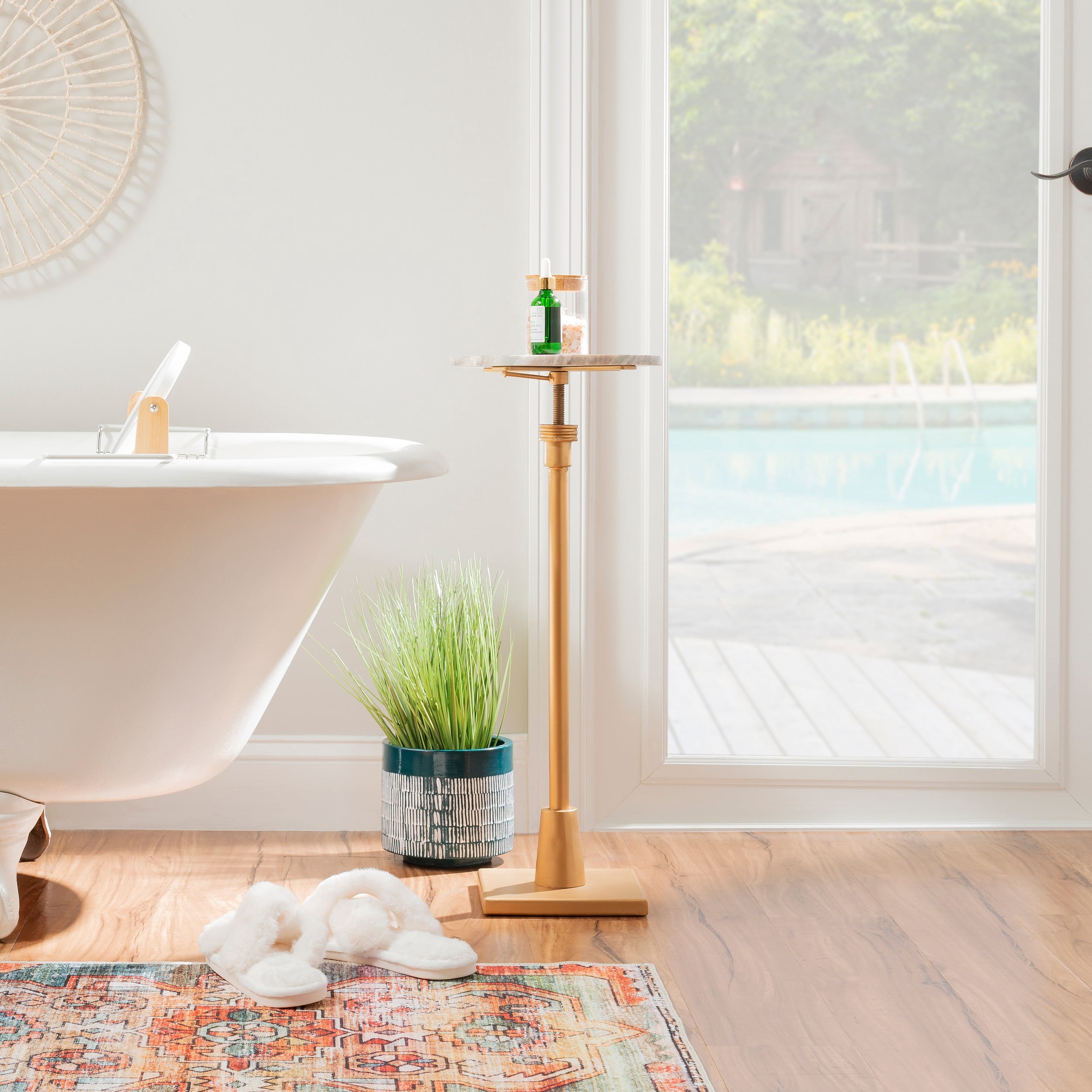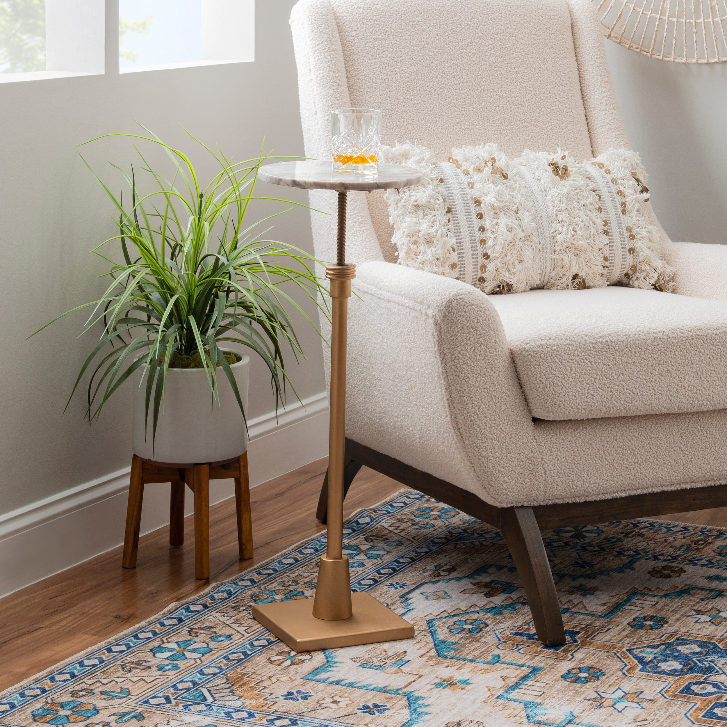 This regal adjustable height drink table will be the talk of the party, whether it’s holding beverages, plants or framed memories. The sandy marble top is supported by an iron base in gold that can be adjusted to fit the moment’s needs. With a table height range of 25″ to 30″, this piece is perfect next to a couch or set of chairs in your living room, as an extra surface in your bathroom or as additional table space wherever you like to entertain.