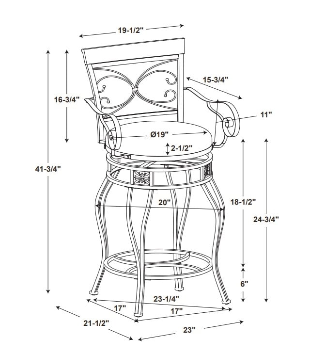 Oversized design supports up to 400 lbs and is made with Big and Tall patrons in mind 360 degree swivel spins for easy access to surrounding bar and side conversations Foam padded seat is upholstered in dark brown faux leather for impeccable style and easy cleaning Reinforced strong metal construction is given bronze finish for antique aesthetic Arm rests and circular footrest provide extra support and comfort Rubberwood panel on backrest in brown finish offers tasteful, traditional accent 24″ seat height perfect for counters and tables 35″ to 39″ high Requires simple assembly upon arrival Assembled Dimensions: 20 L x 21.5 D x 41.75 H Ships in one box For indoor use only