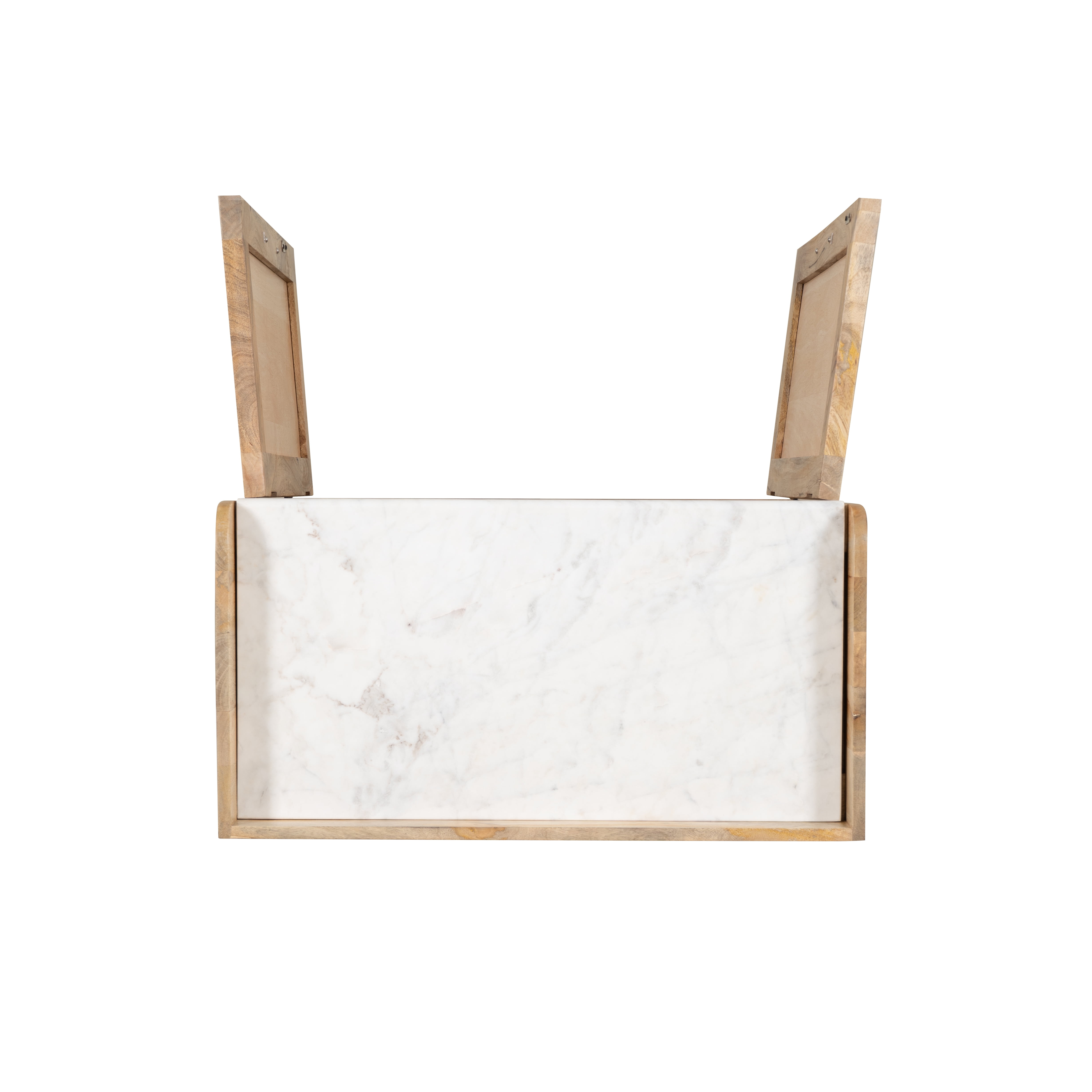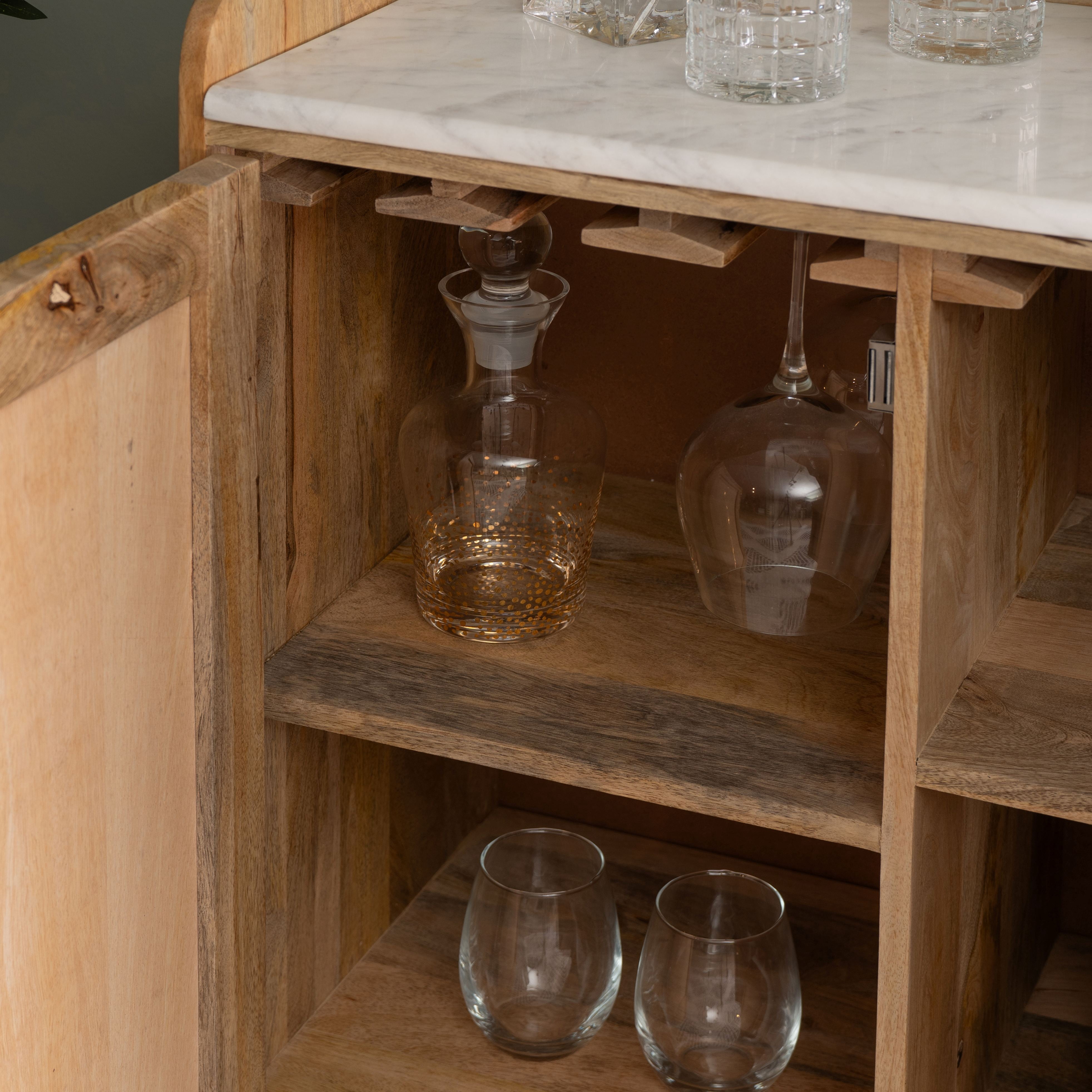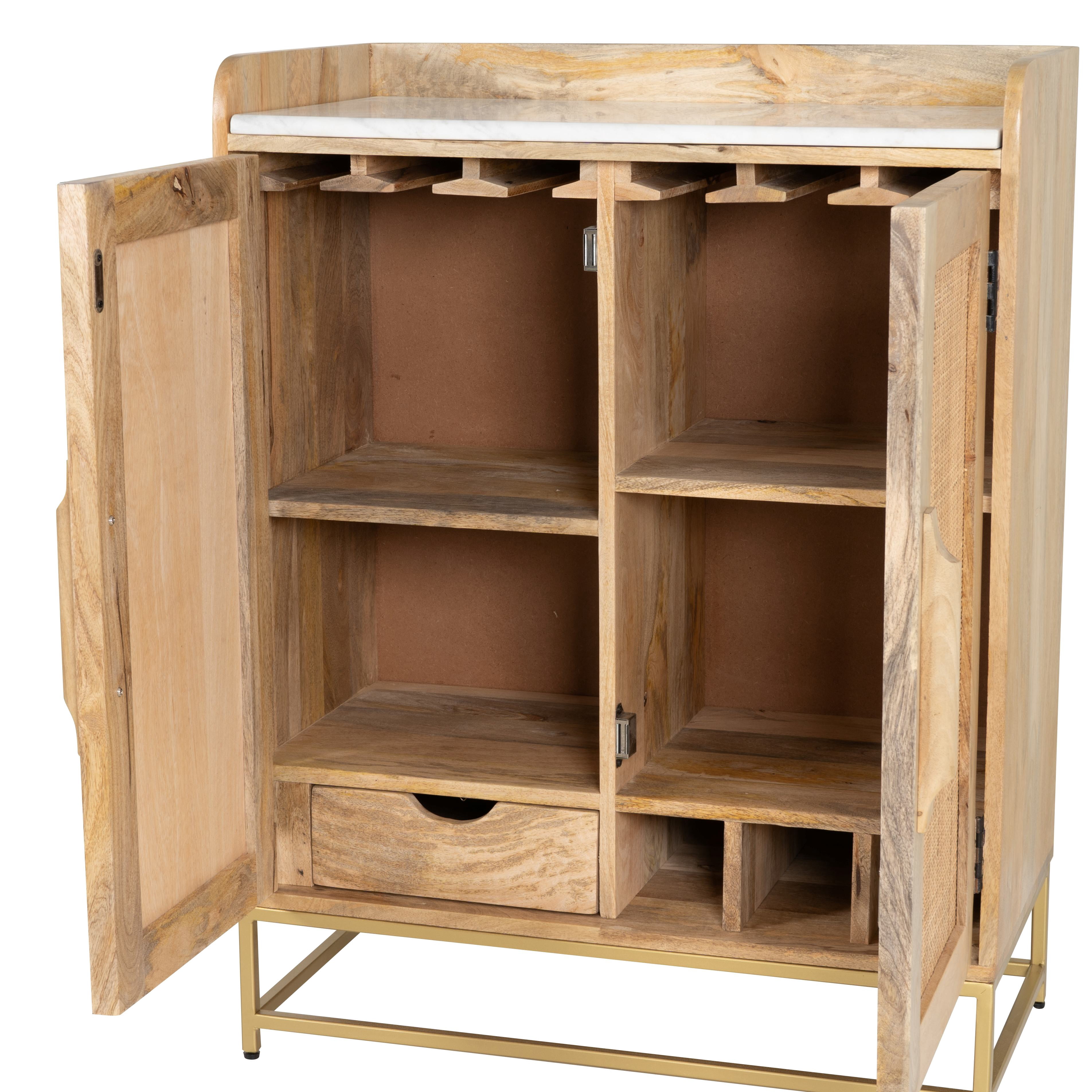 Solid mango wood construction in brown finish accentuates natural wood grain and offers a rustic charm 2 cane panel doors and clean lines cater to midcentury aesthetic 4 shelves 13in wide and a sliding drawer offer generous storage space and organization 6 hanging racks hold numerous wine glasses and 3 cubbies are perfect for storing bottles White marble top lends itself to a timeless aesthetic perfect for preparing classic cocktails of a bygone era Iron base in gold holds the piece 6in off the ground Top surface supports up to 55 lbs Marble Top and Handle Assembly Only Assembled Dimensions: 28 L x 14.50 D x 36.50 H Ships in 2 boxes