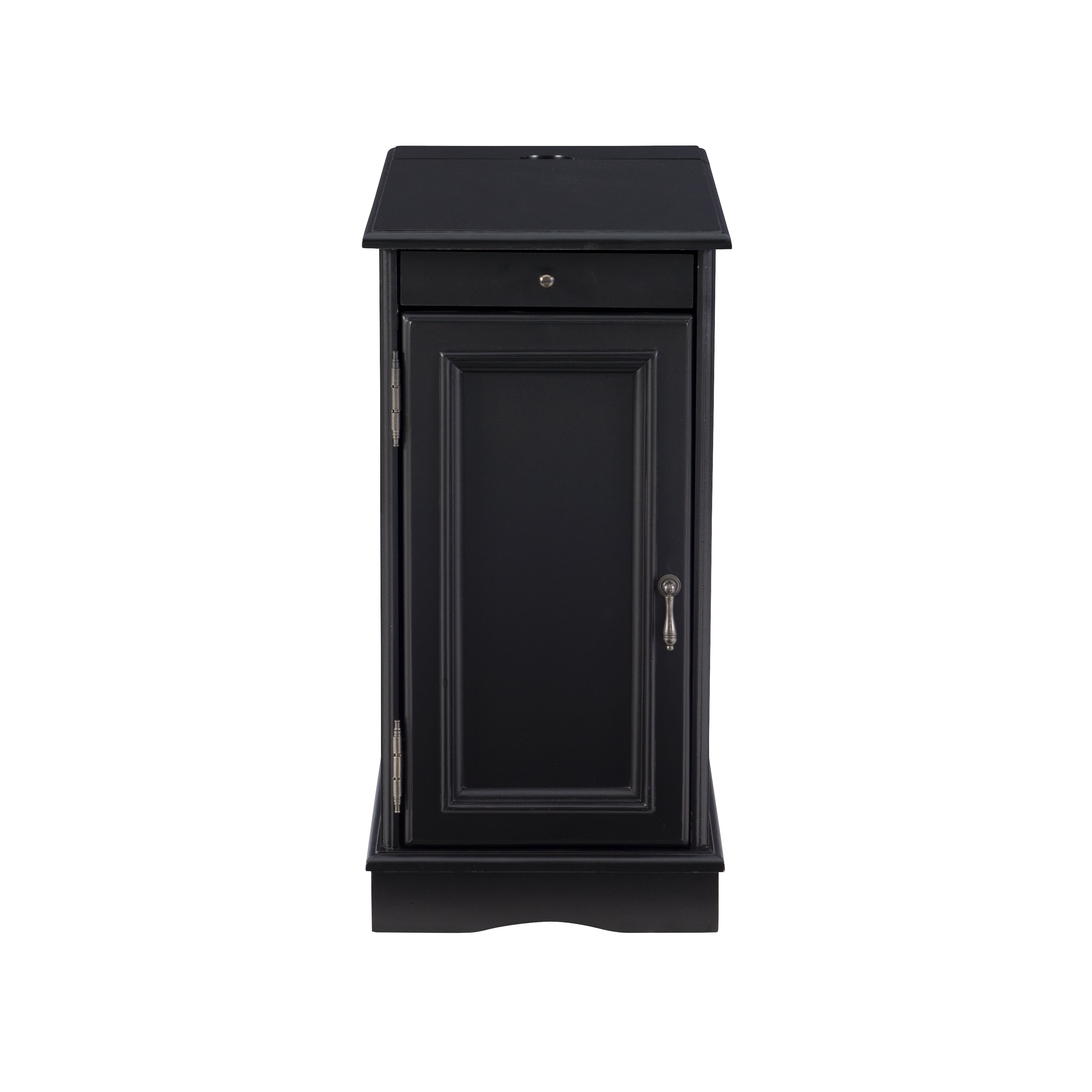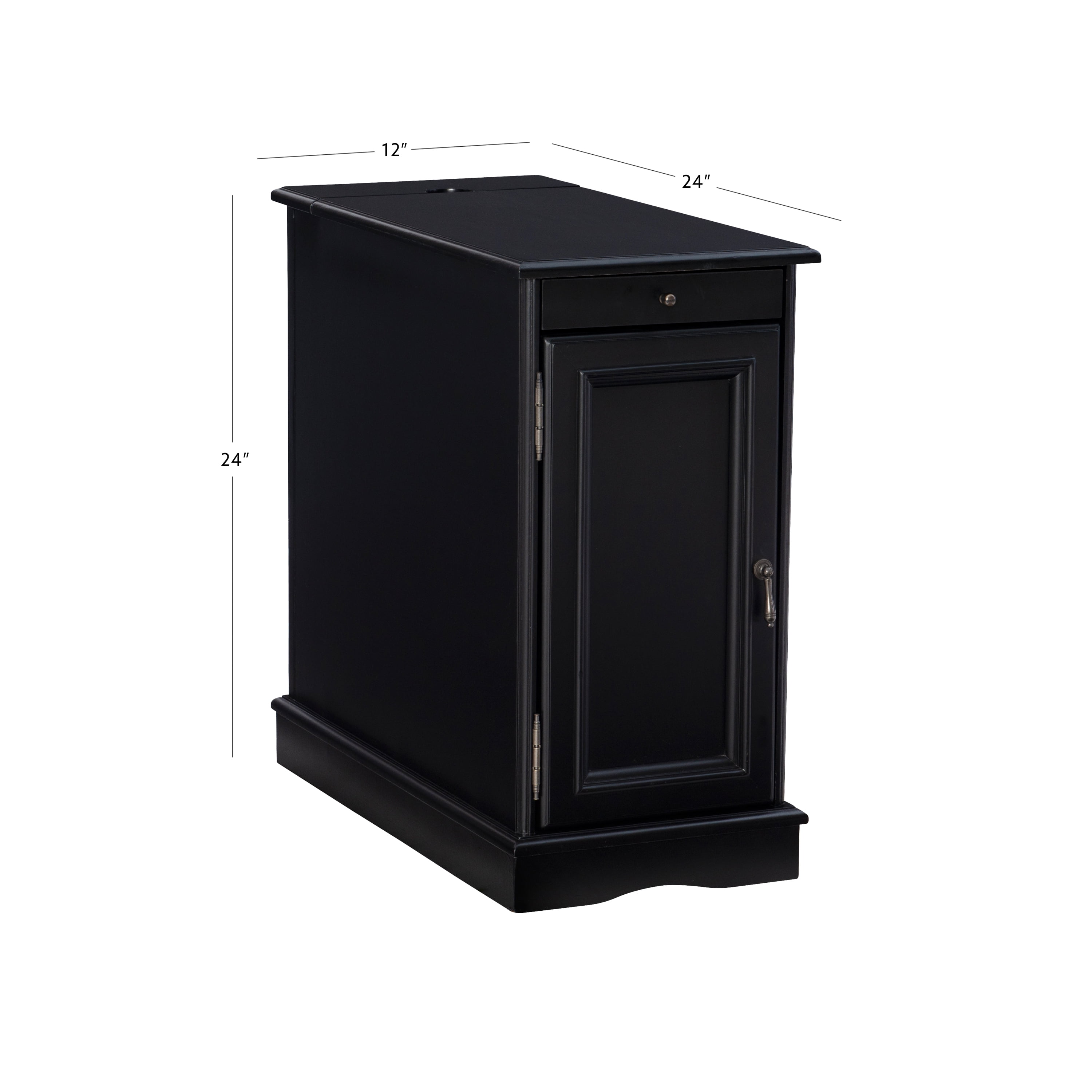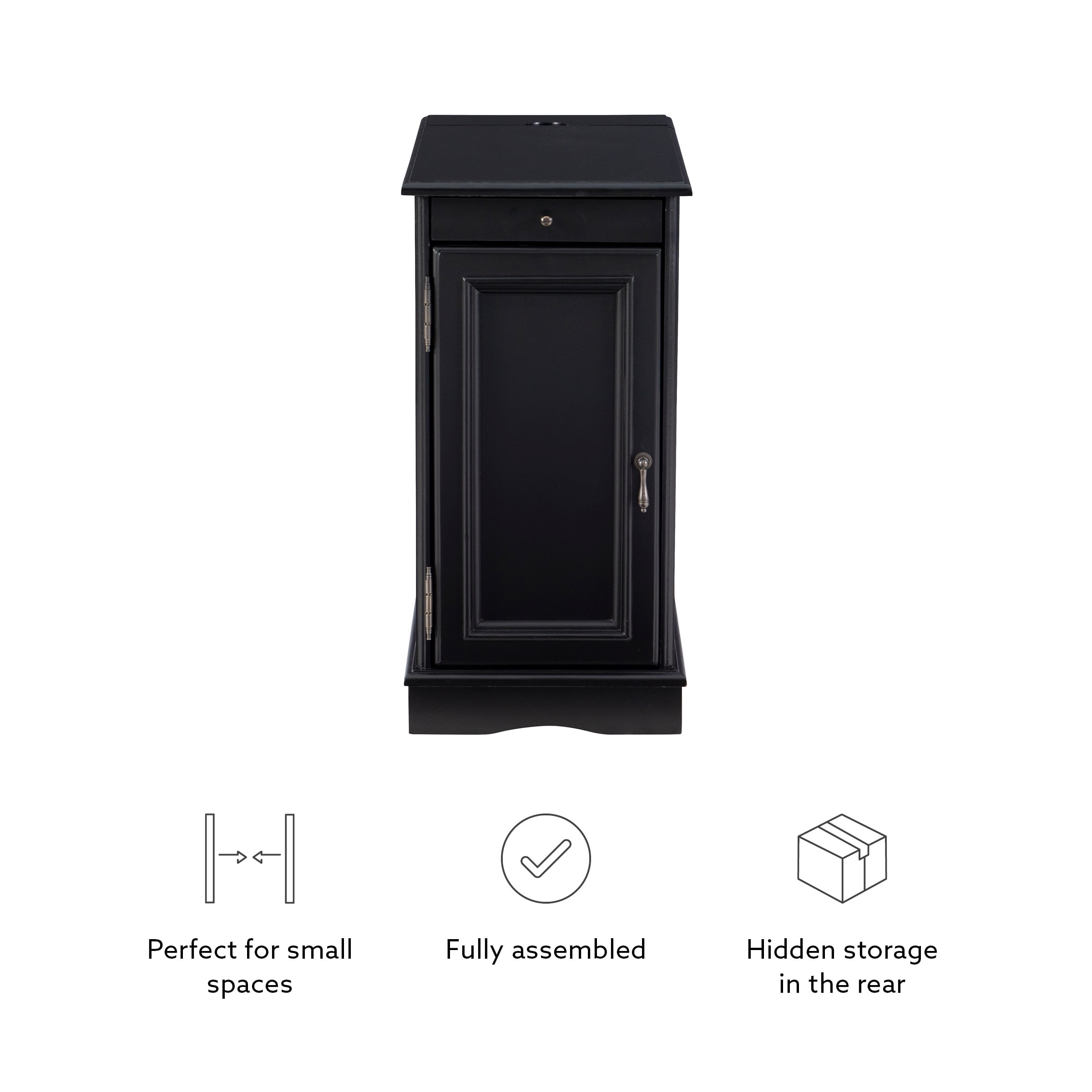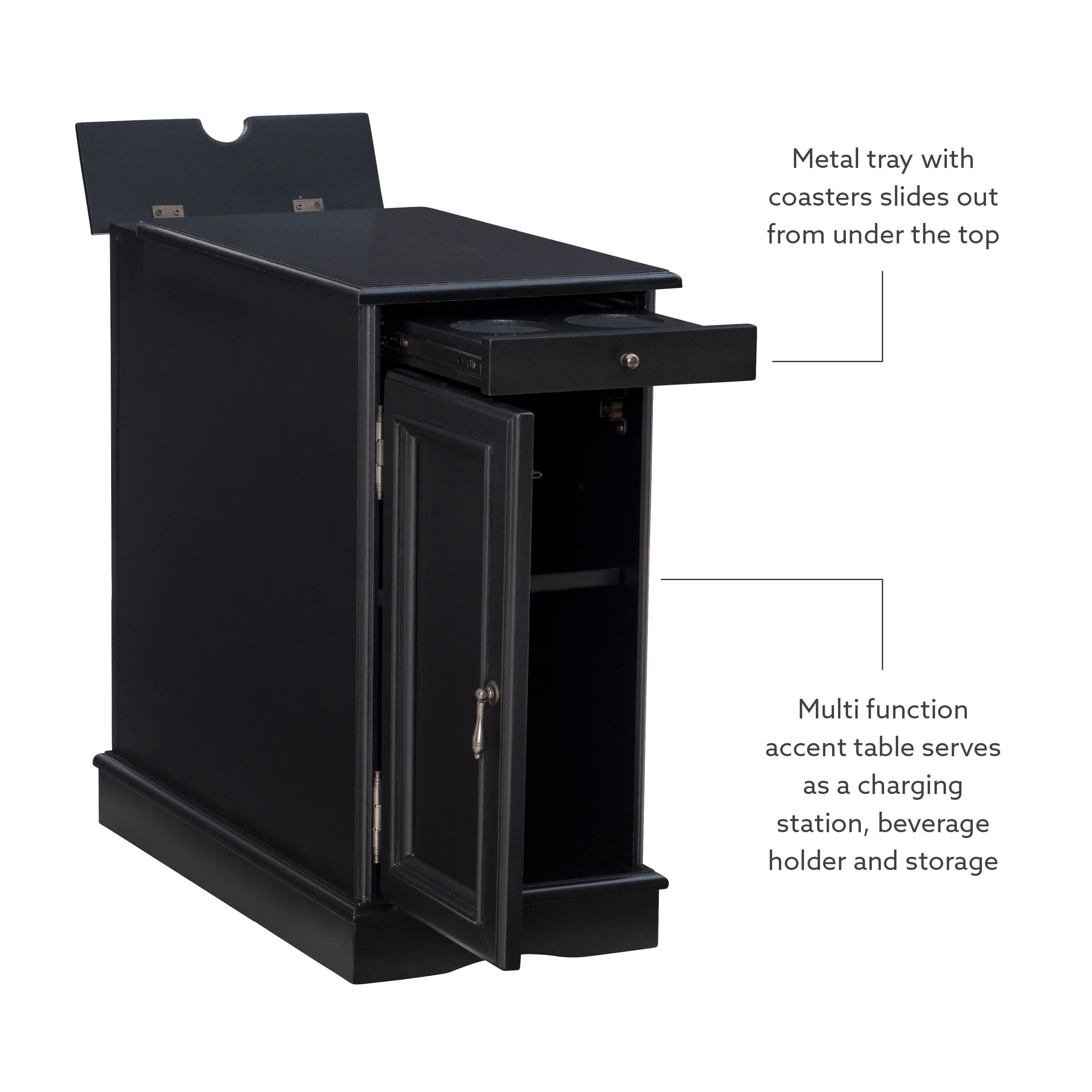 Multi function accent table that serves as a charging station beverage holder and provides storage So convenient flip top at the rear reveals usb and electrical charging Metal tray with built in coasters slides out from under the top Large storage area behind cabinet door and bonus hidden storage in the rear Deep black painted finish with black metal drawer pulls Narrow design adds style and function even in tight quarters Fully assembled easy maintenance Cord measures 9.84ft long 3 meters Ships in one box For Indoor Use Only