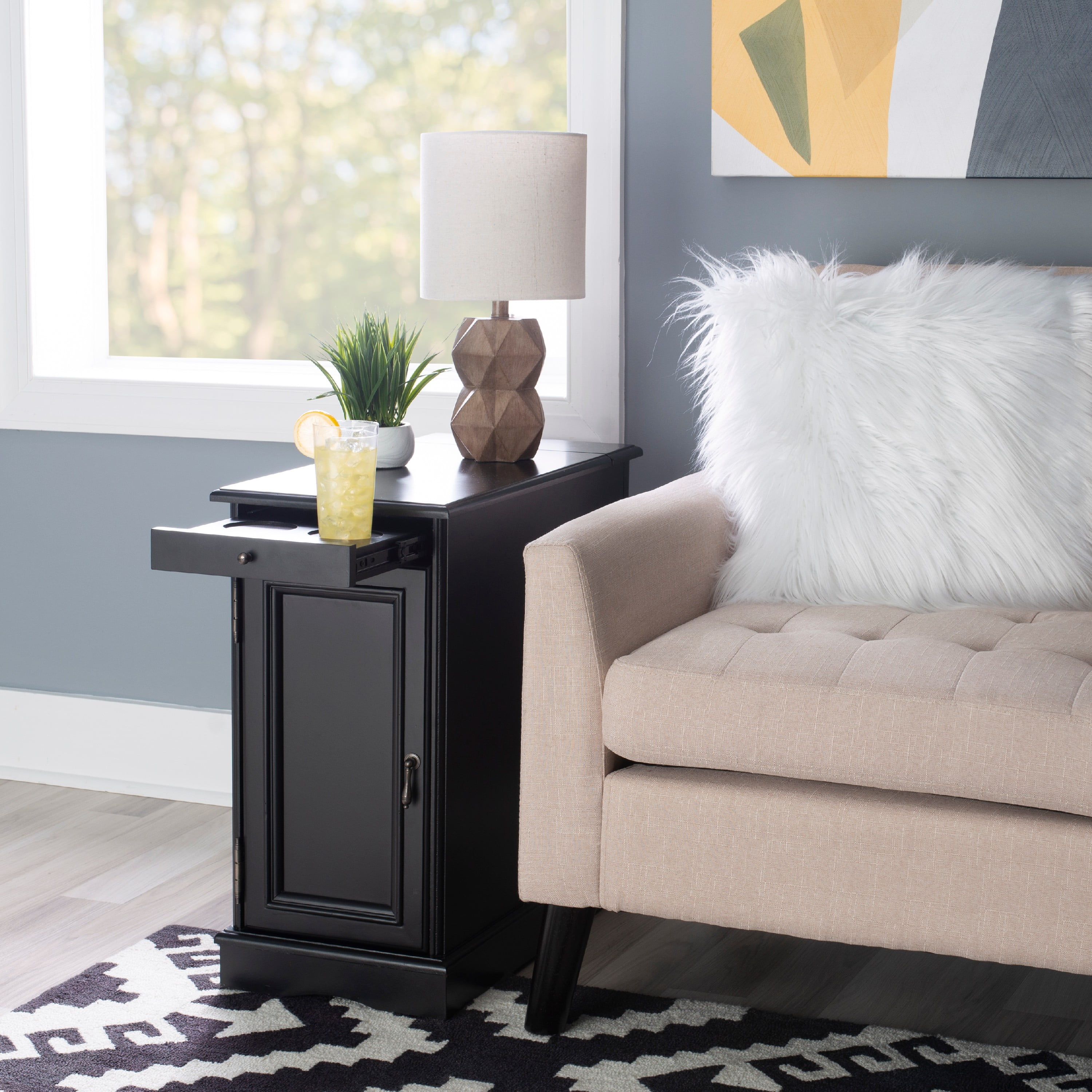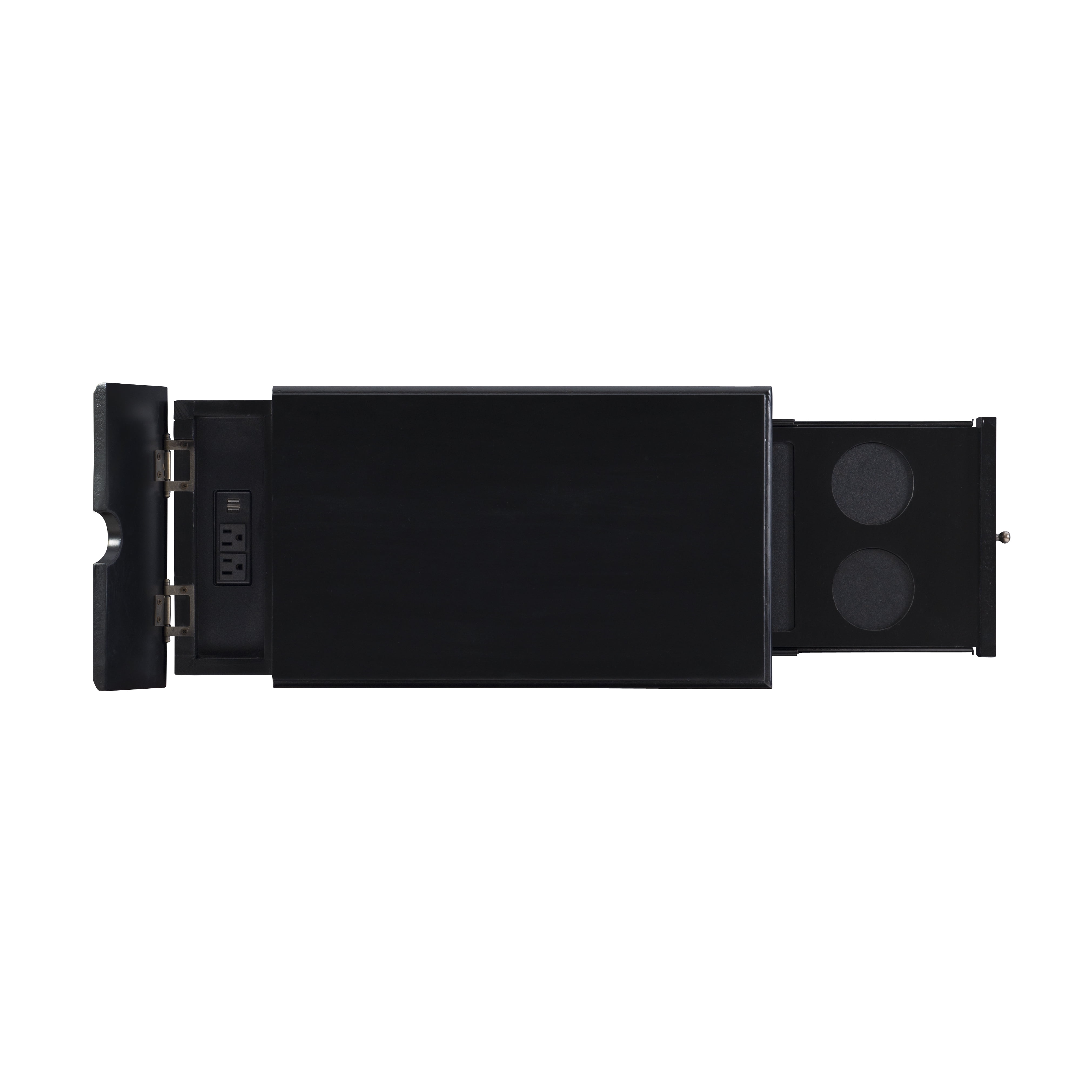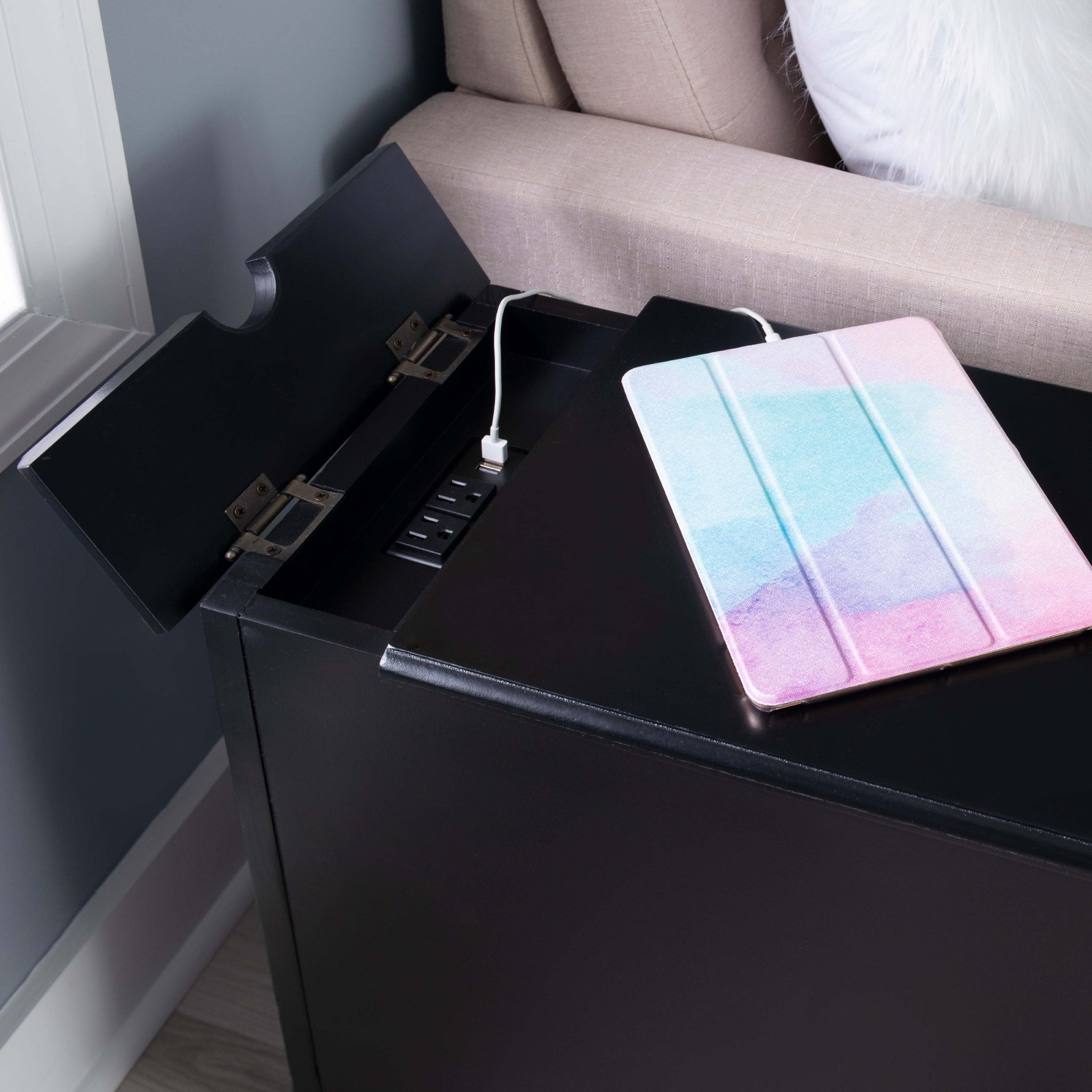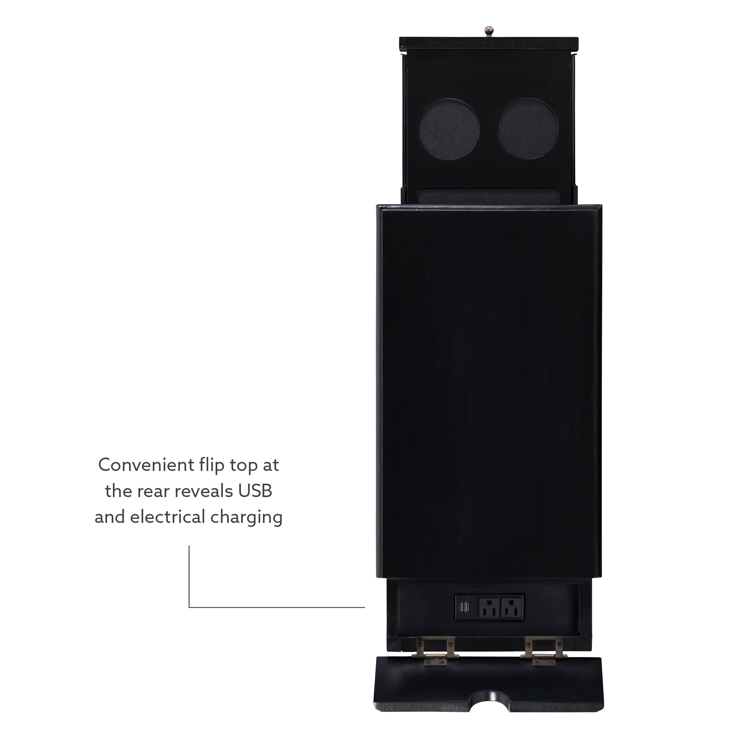 Multi function accent table that serves as a charging station beverage holder and provides storage So convenient flip top at the rear reveals usb and electrical charging Metal tray with built in coasters slides out from under the top Large storage area behind cabinet door and bonus hidden storage in the rear Deep black painted finish with black metal drawer pulls Narrow design adds style and function even in tight quarters Fully assembled easy maintenance Cord measures 9.84ft long 3 meters Ships in one box For Indoor Use Only