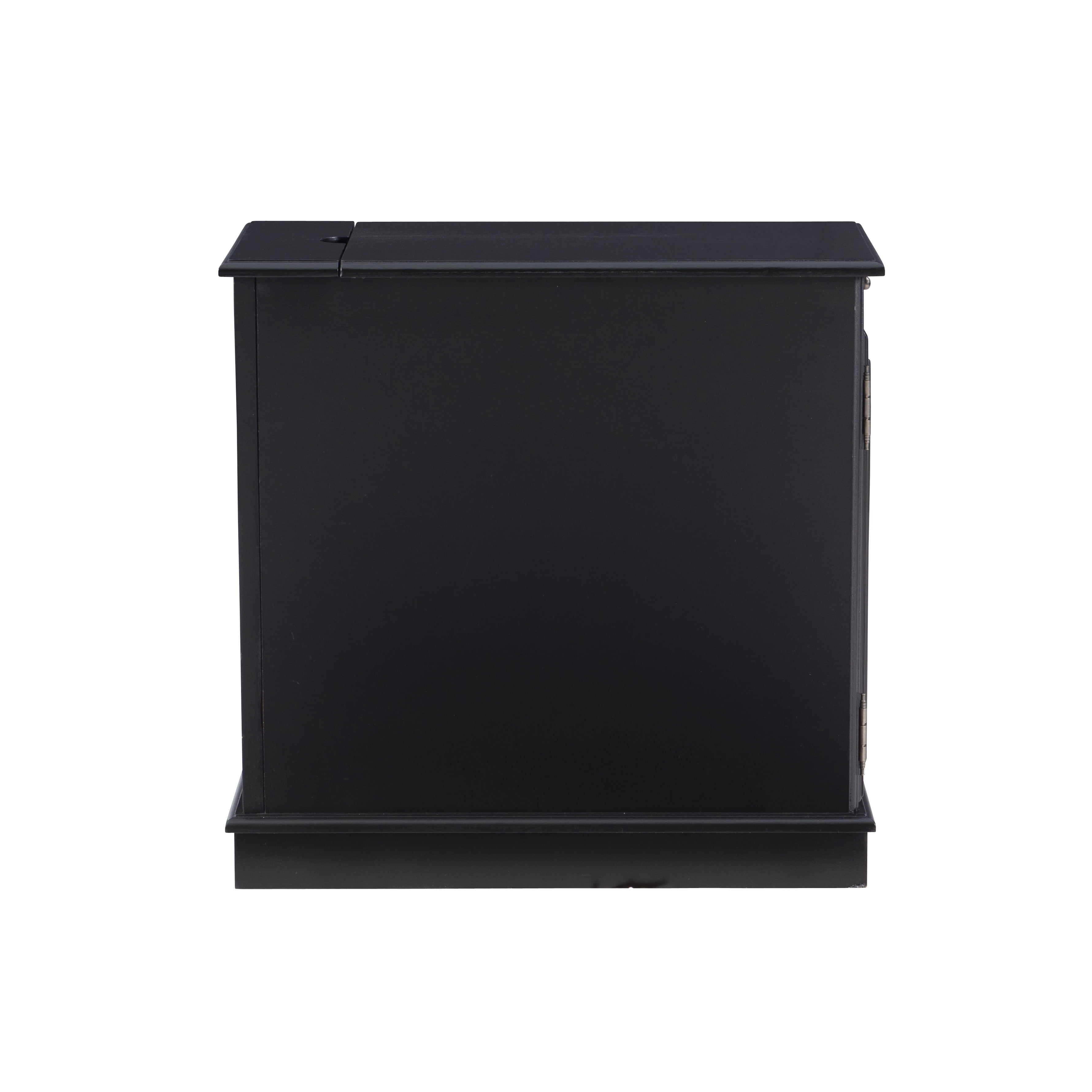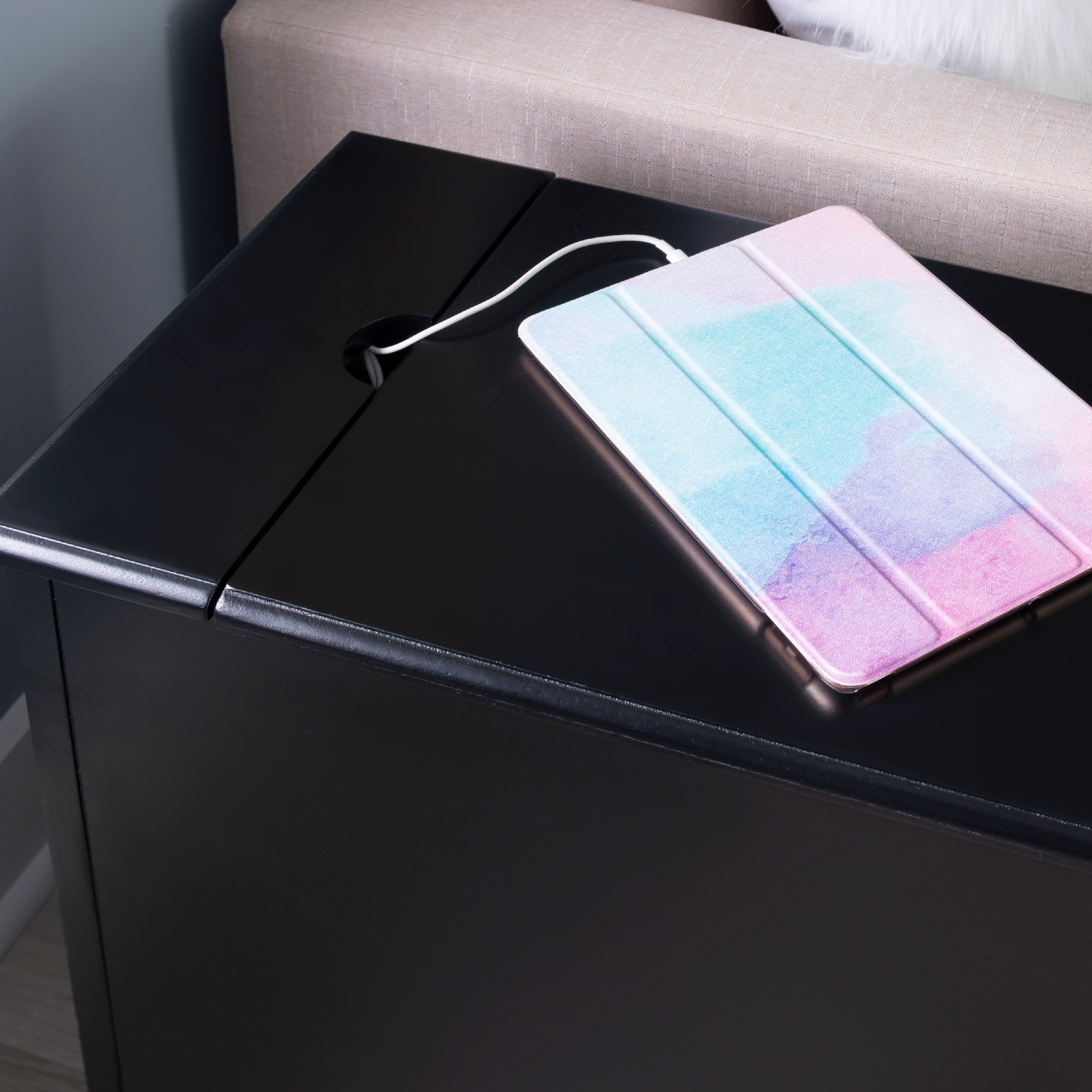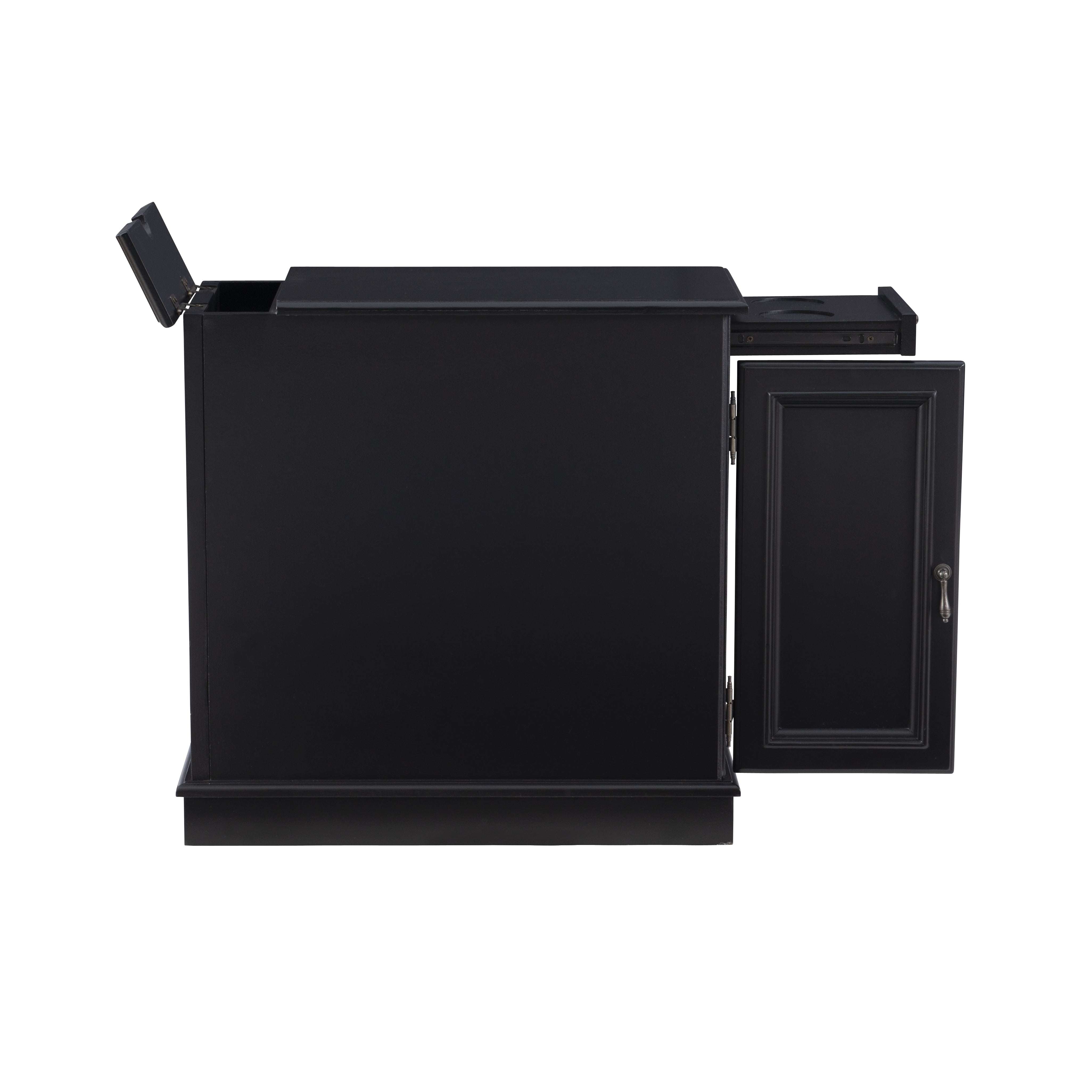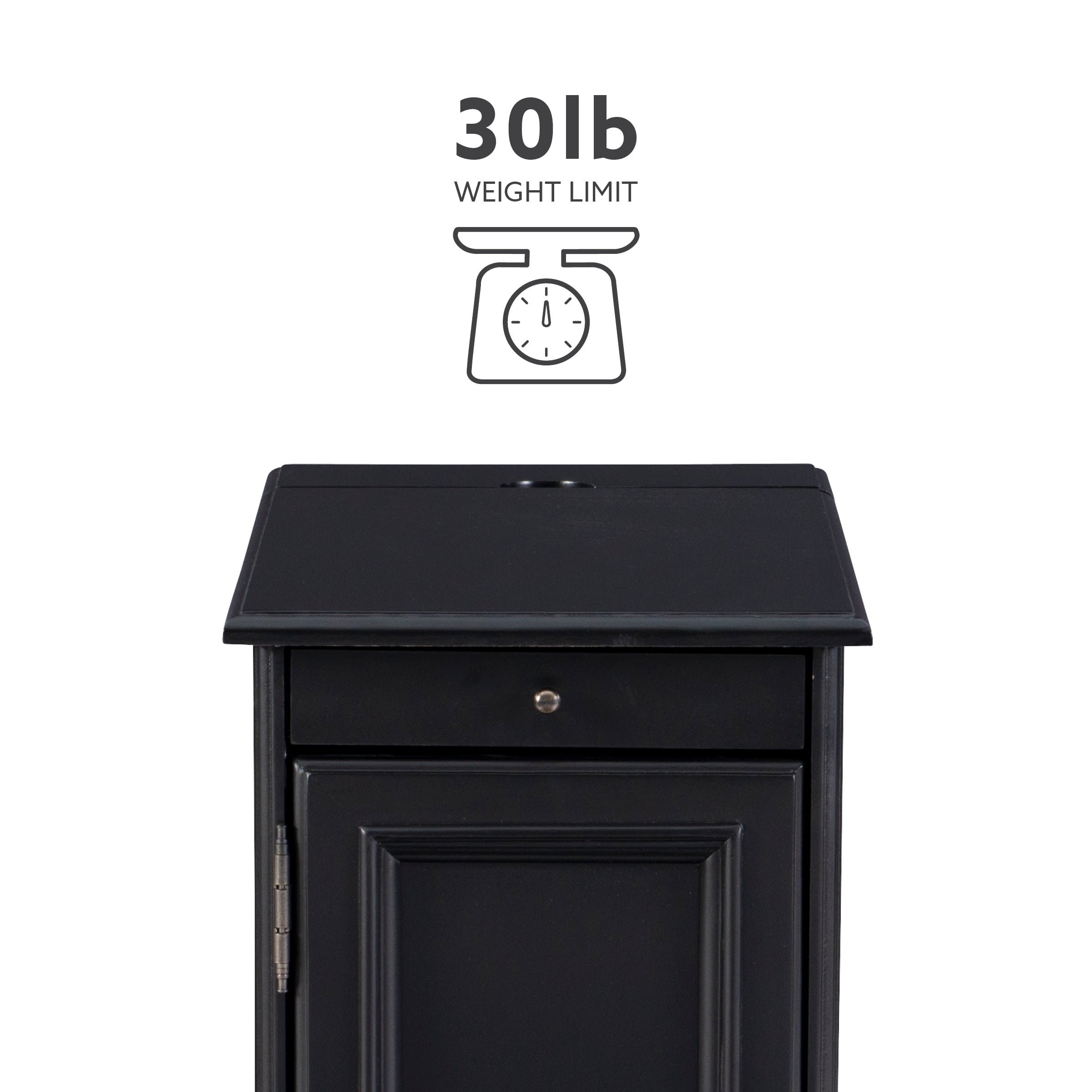 Multi function accent table that serves as a charging station beverage holder and provides storage So convenient flip top at the rear reveals usb and electrical charging Metal tray with built in coasters slides out from under the top Large storage area behind cabinet door and bonus hidden storage in the rear Deep black painted finish with black metal drawer pulls Narrow design adds style and function even in tight quarters Fully assembled easy maintenance Cord measures 9.84ft long 3 meters Ships in one box For Indoor Use Only