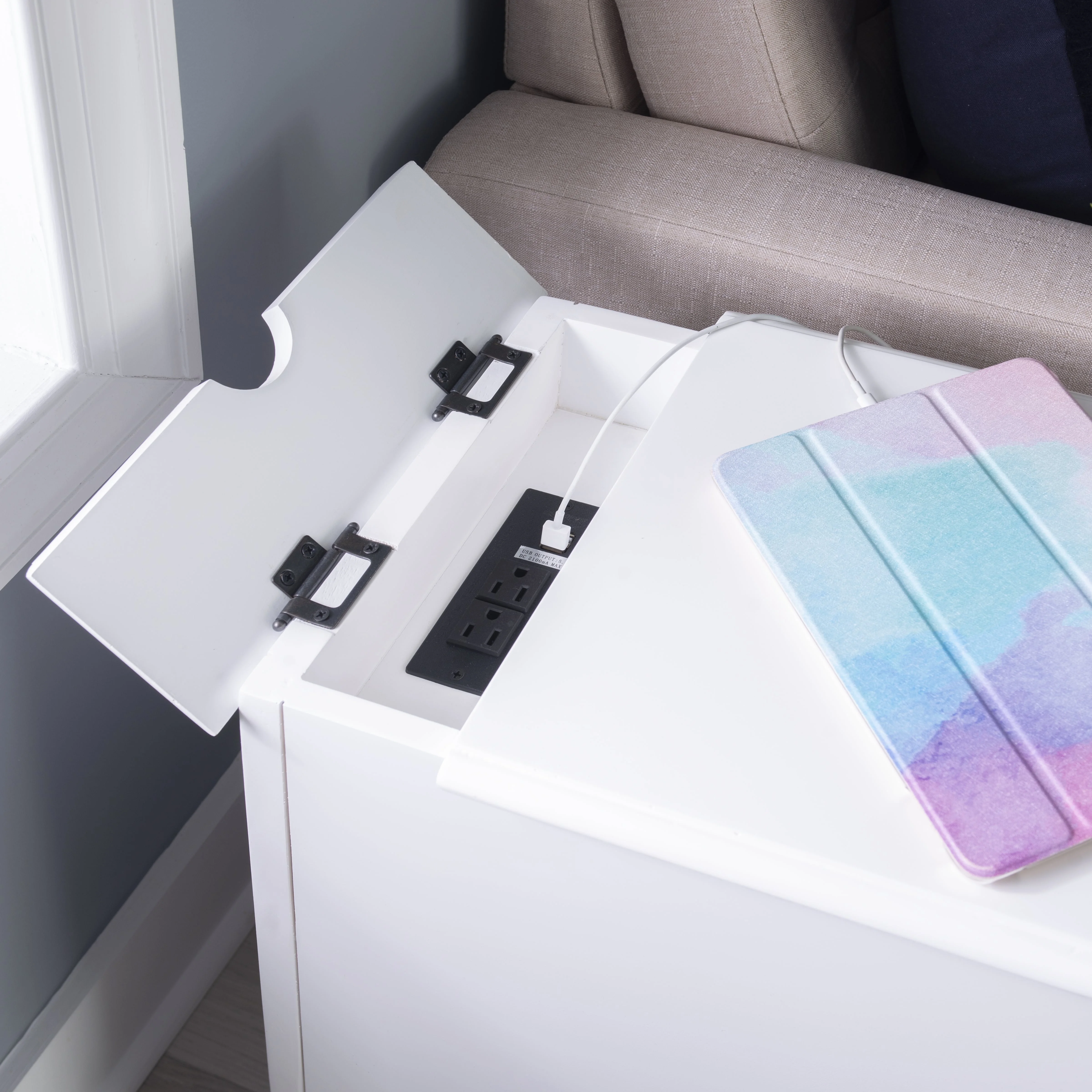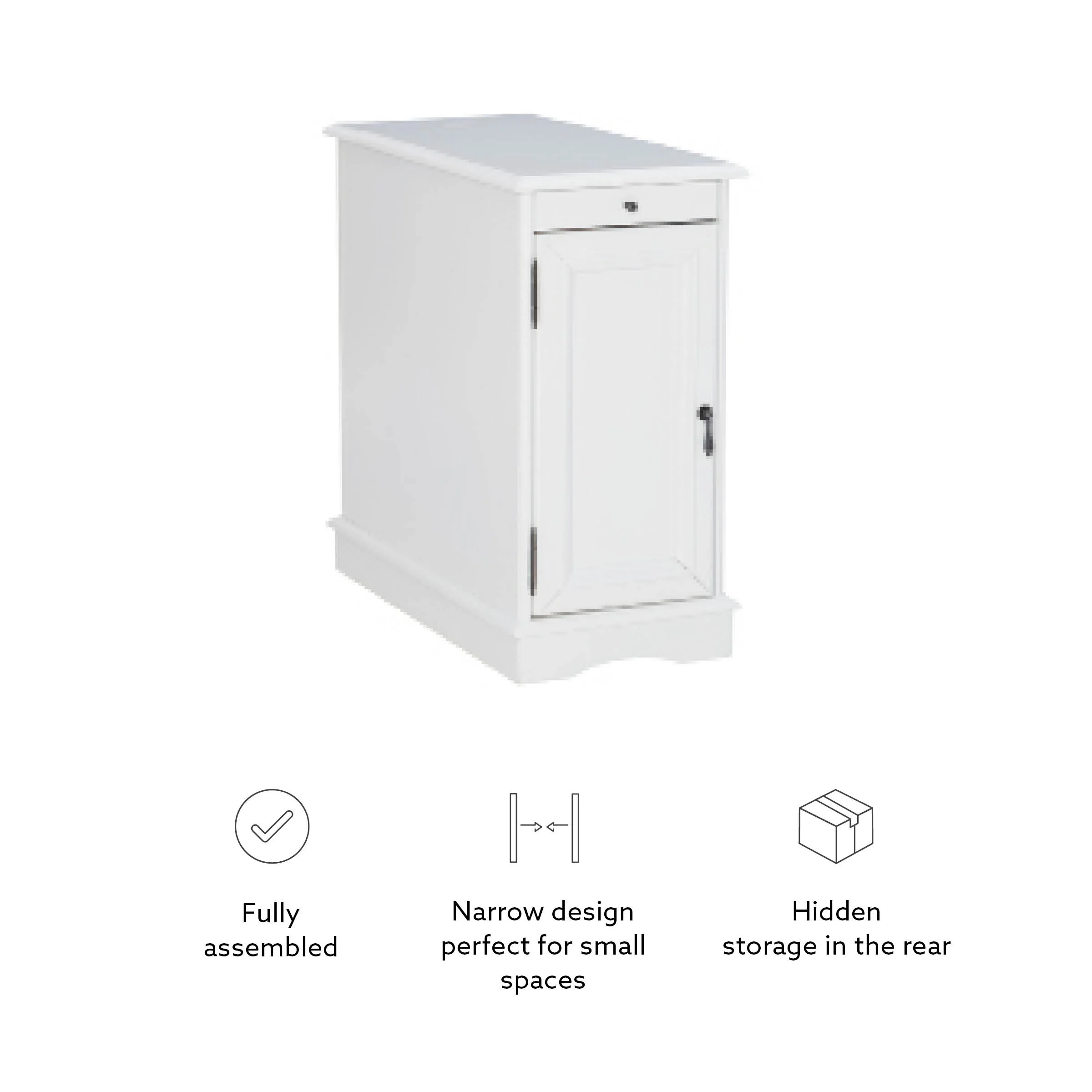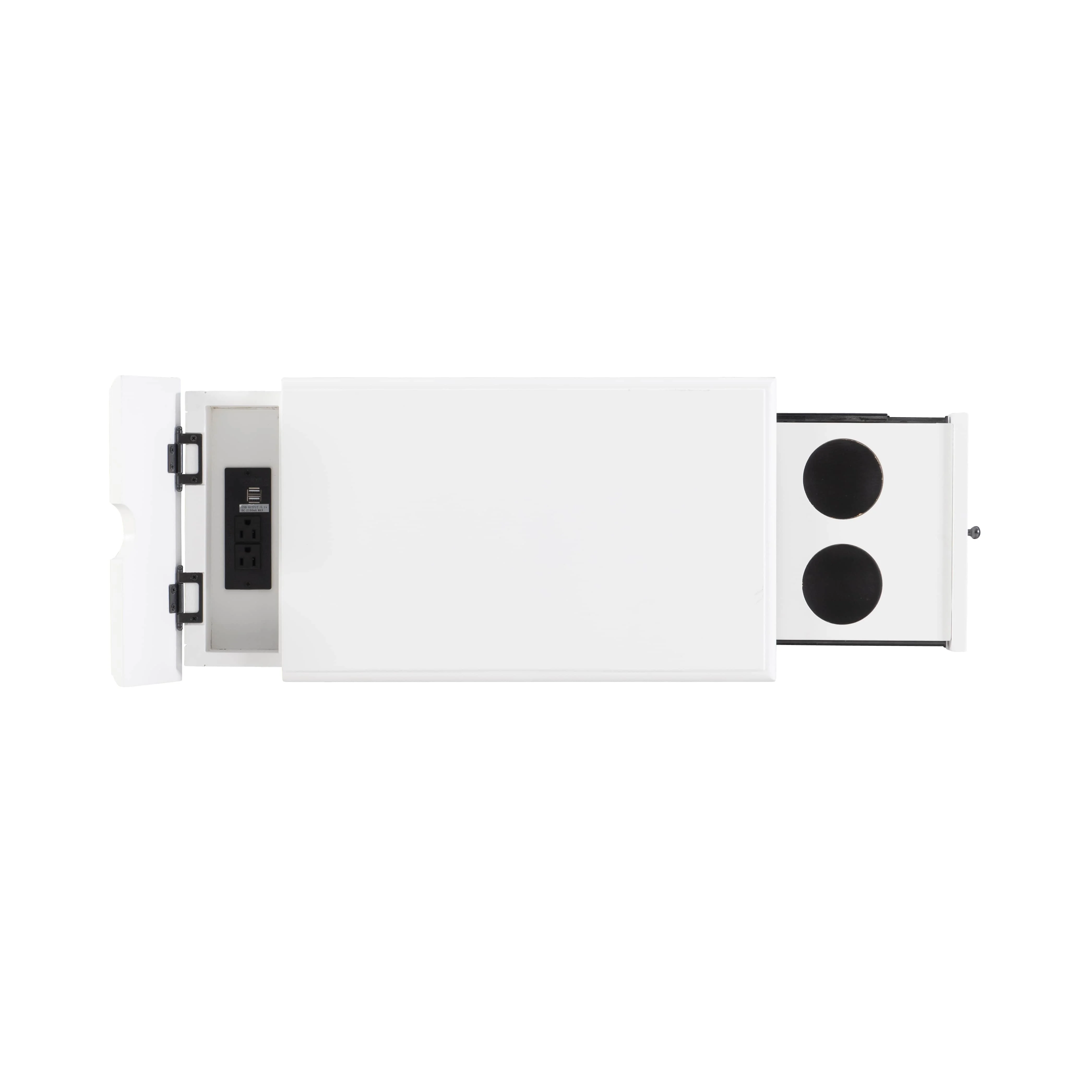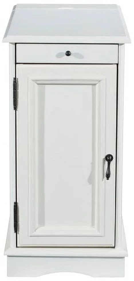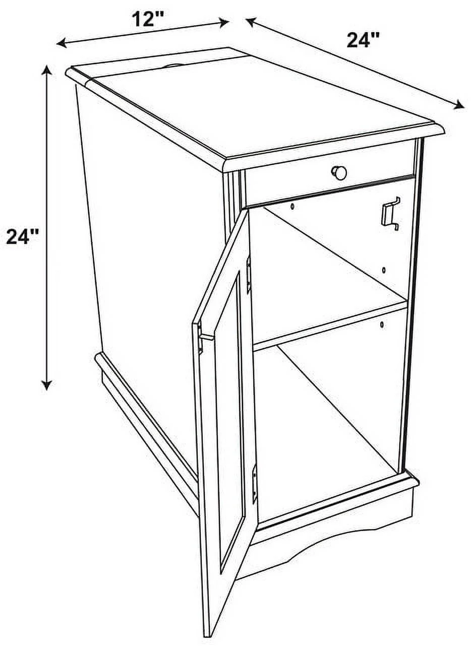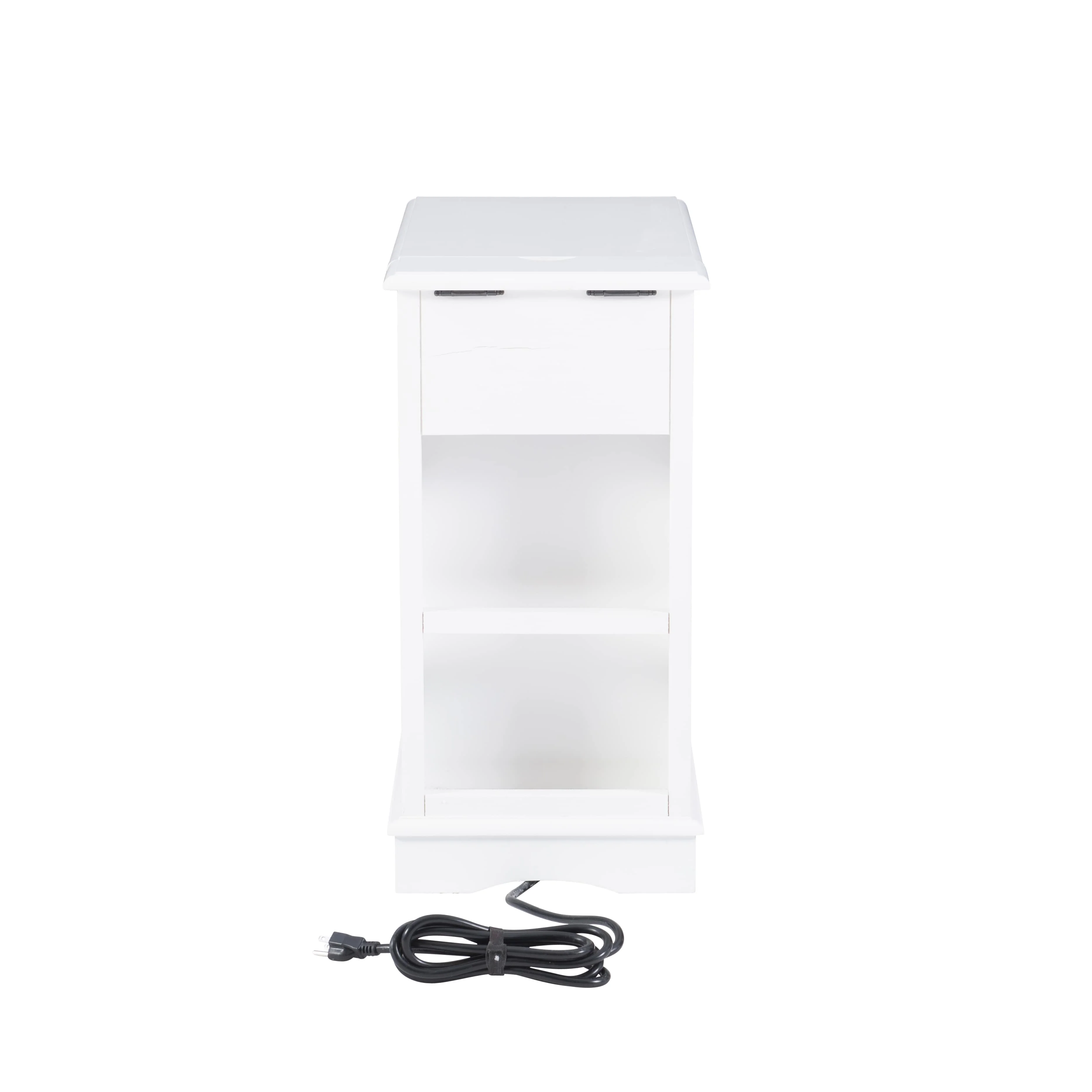 pull out tray with coasters Sized to fit next to your sofa or your favorite chair Features a hidden storage behind the cabinet door A flip-up top opens to reveal a USB and electrical charging station White finish