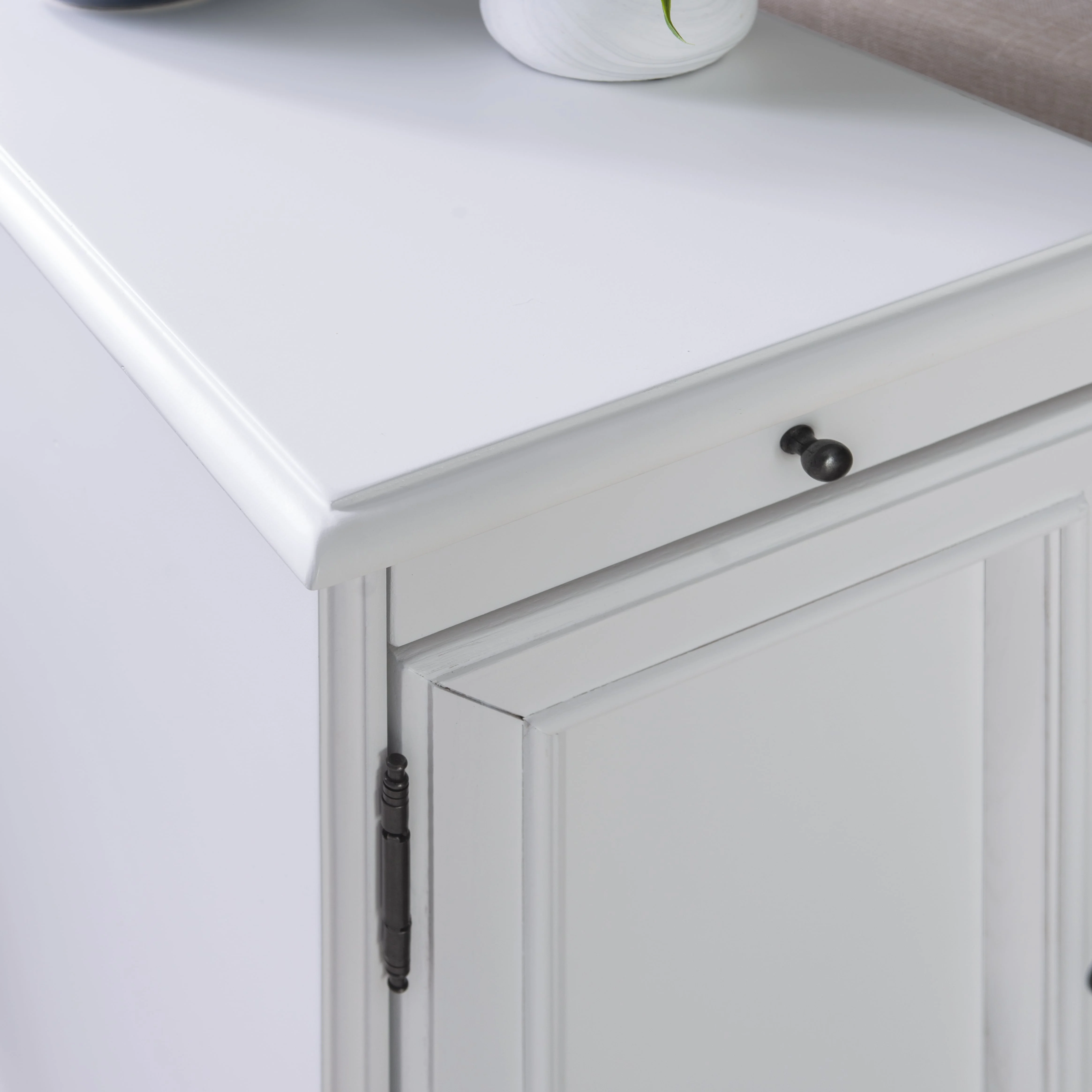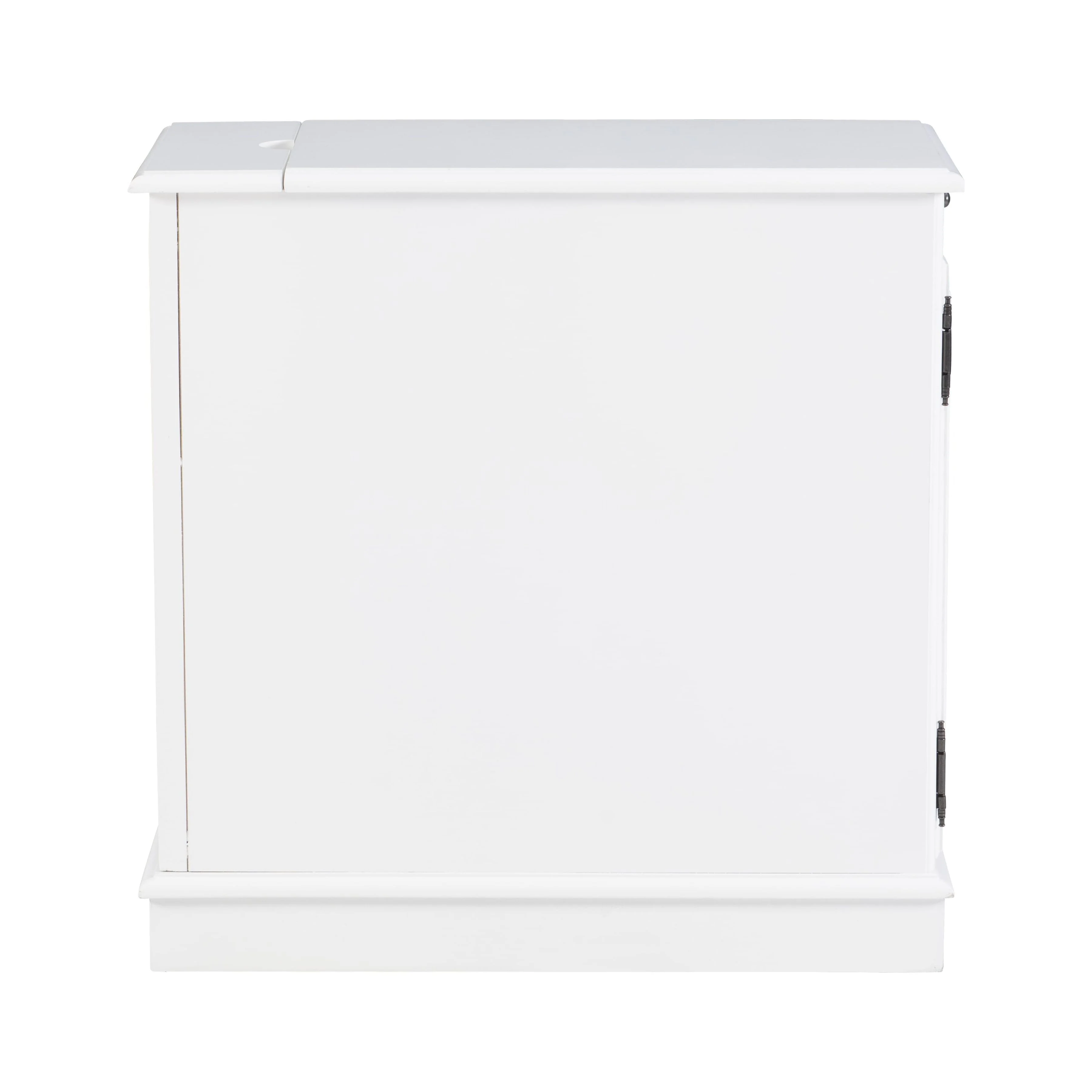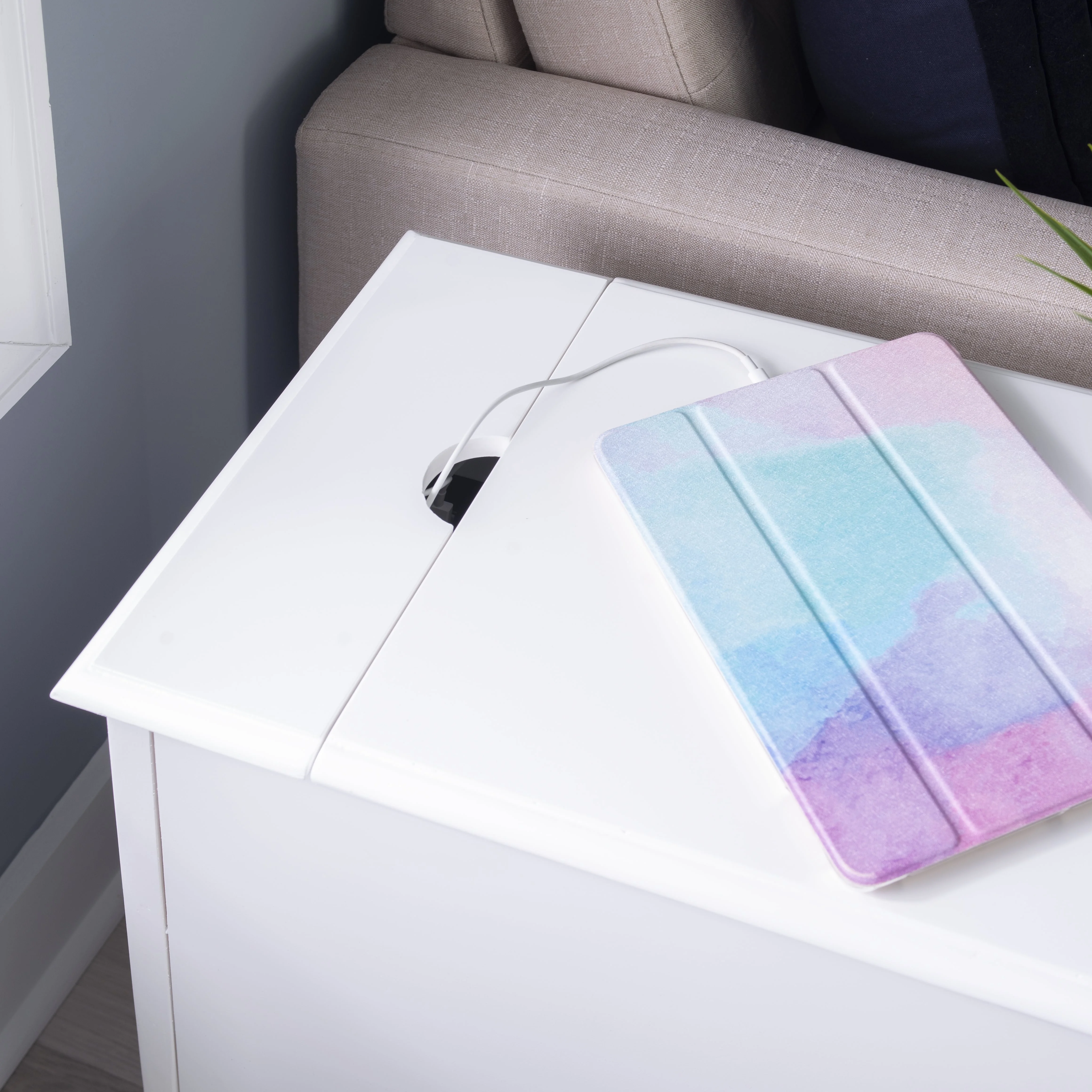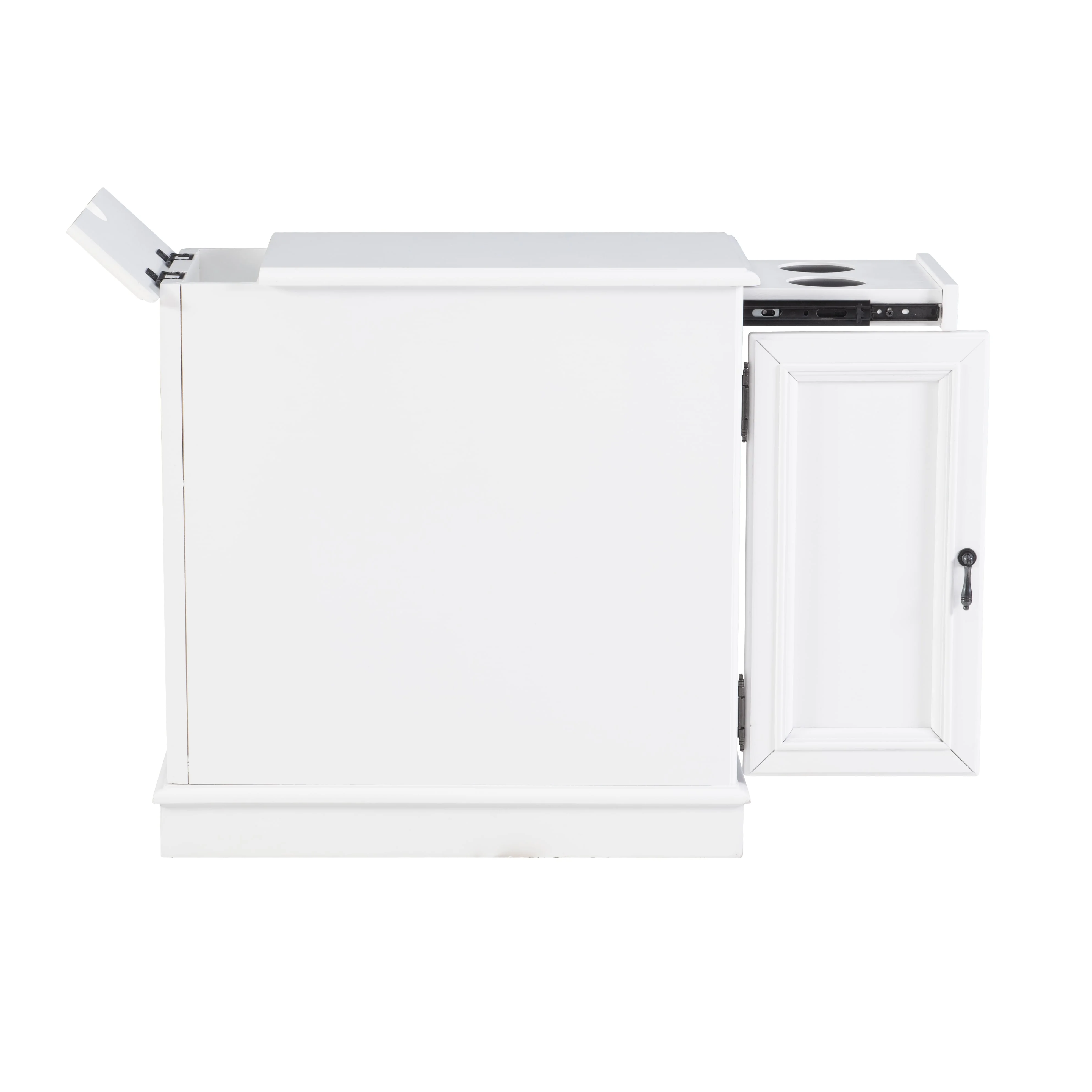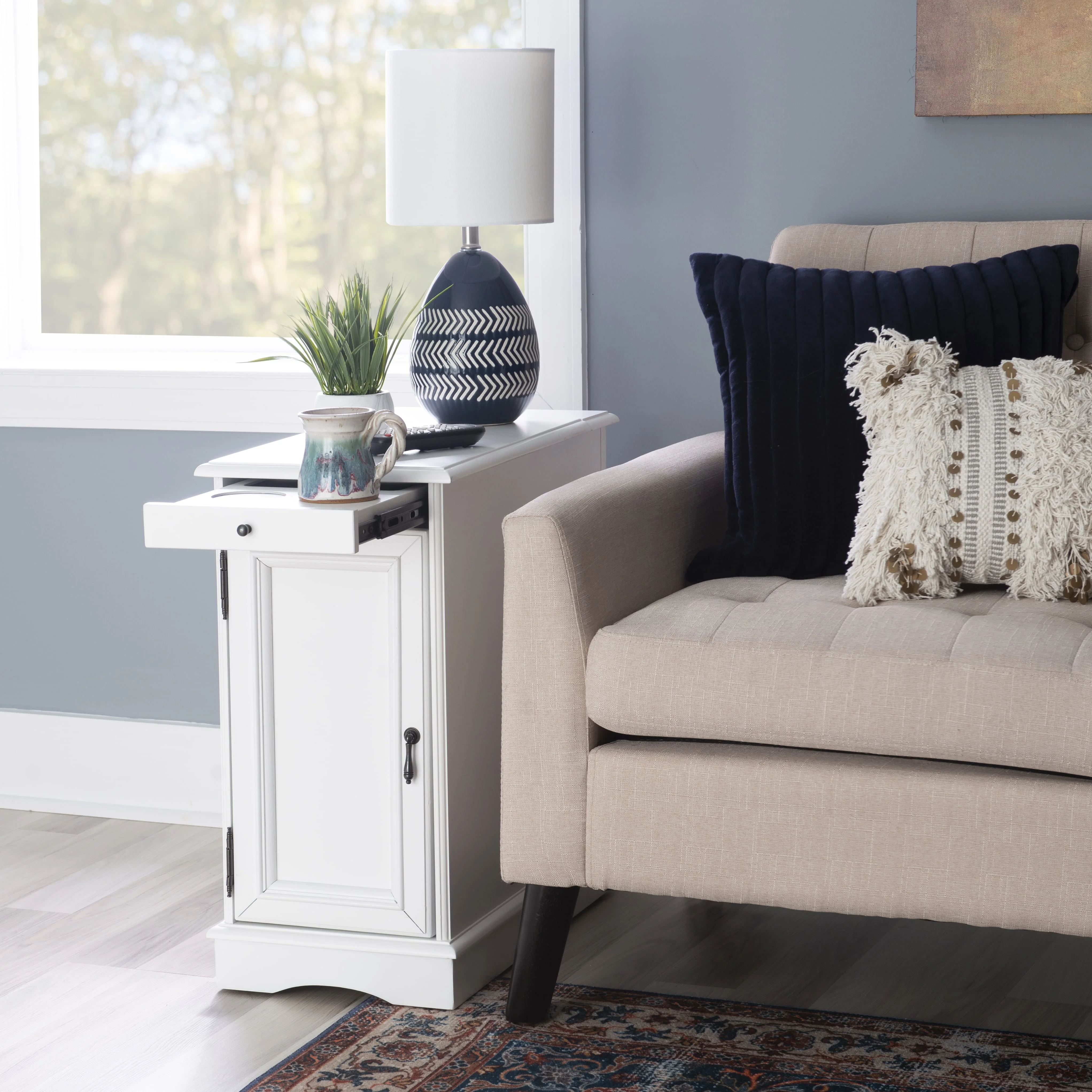 pull out tray with coasters Sized to fit next to your sofa or your favorite chair Features a hidden storage behind the cabinet door A flip-up top opens to reveal a USB and electrical charging station White finish