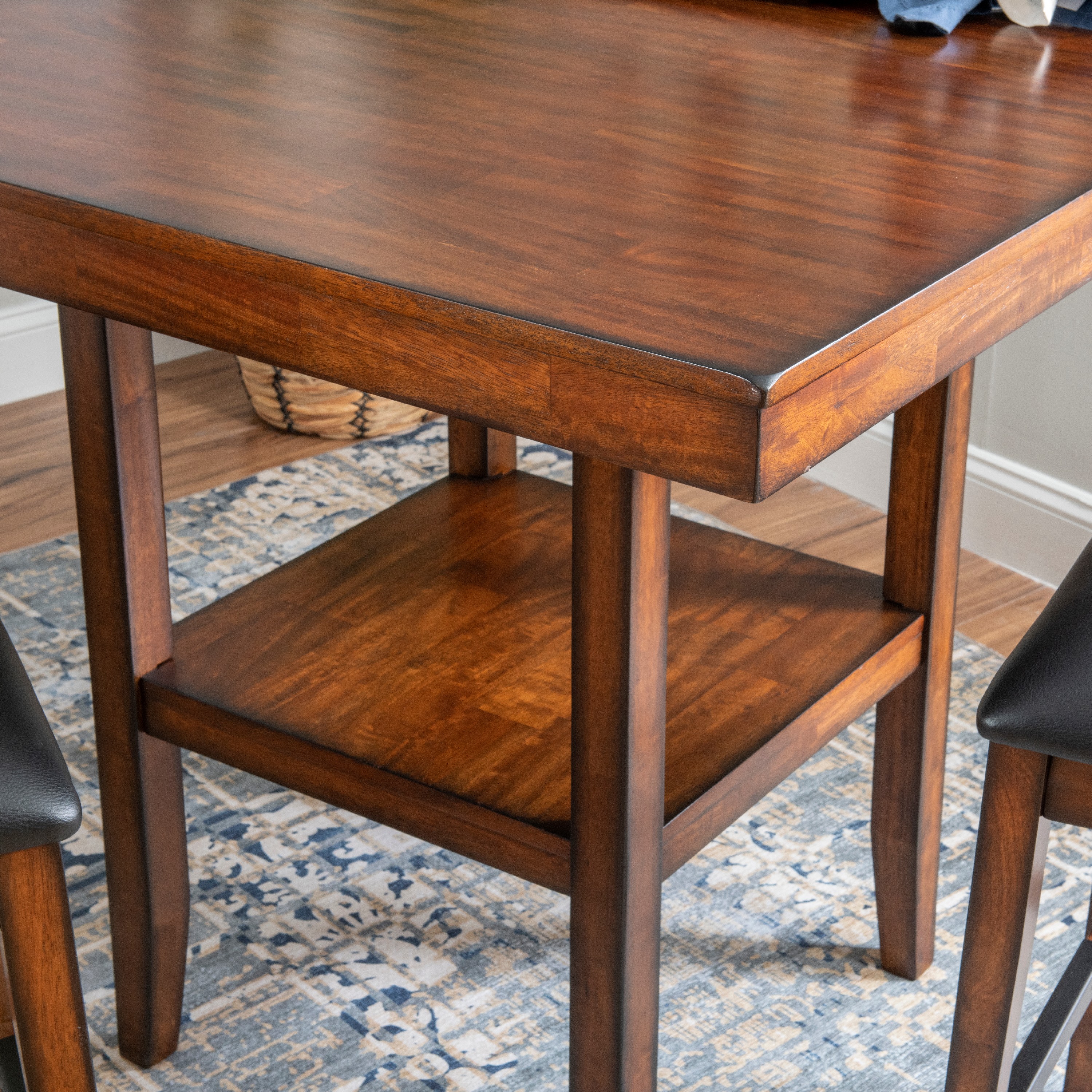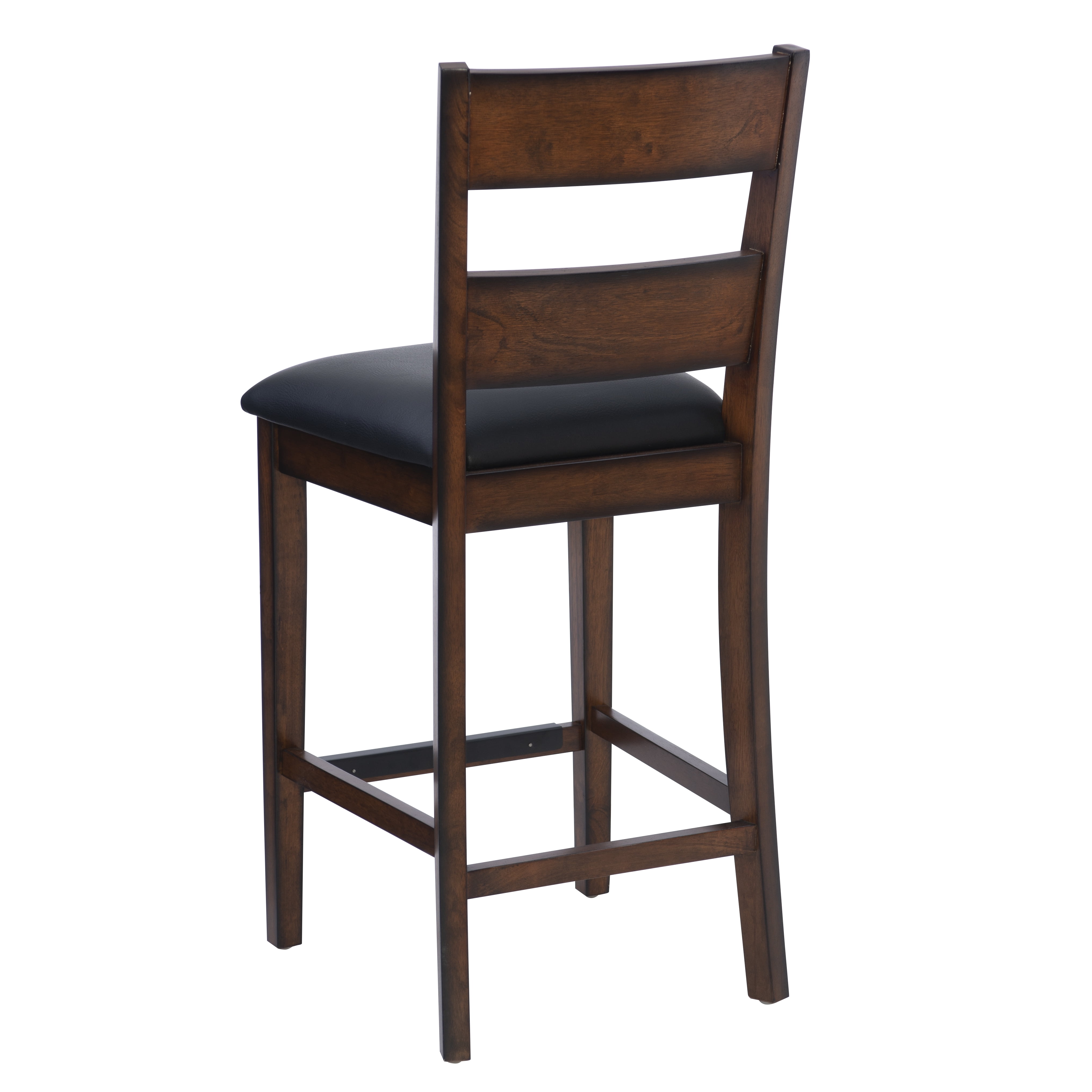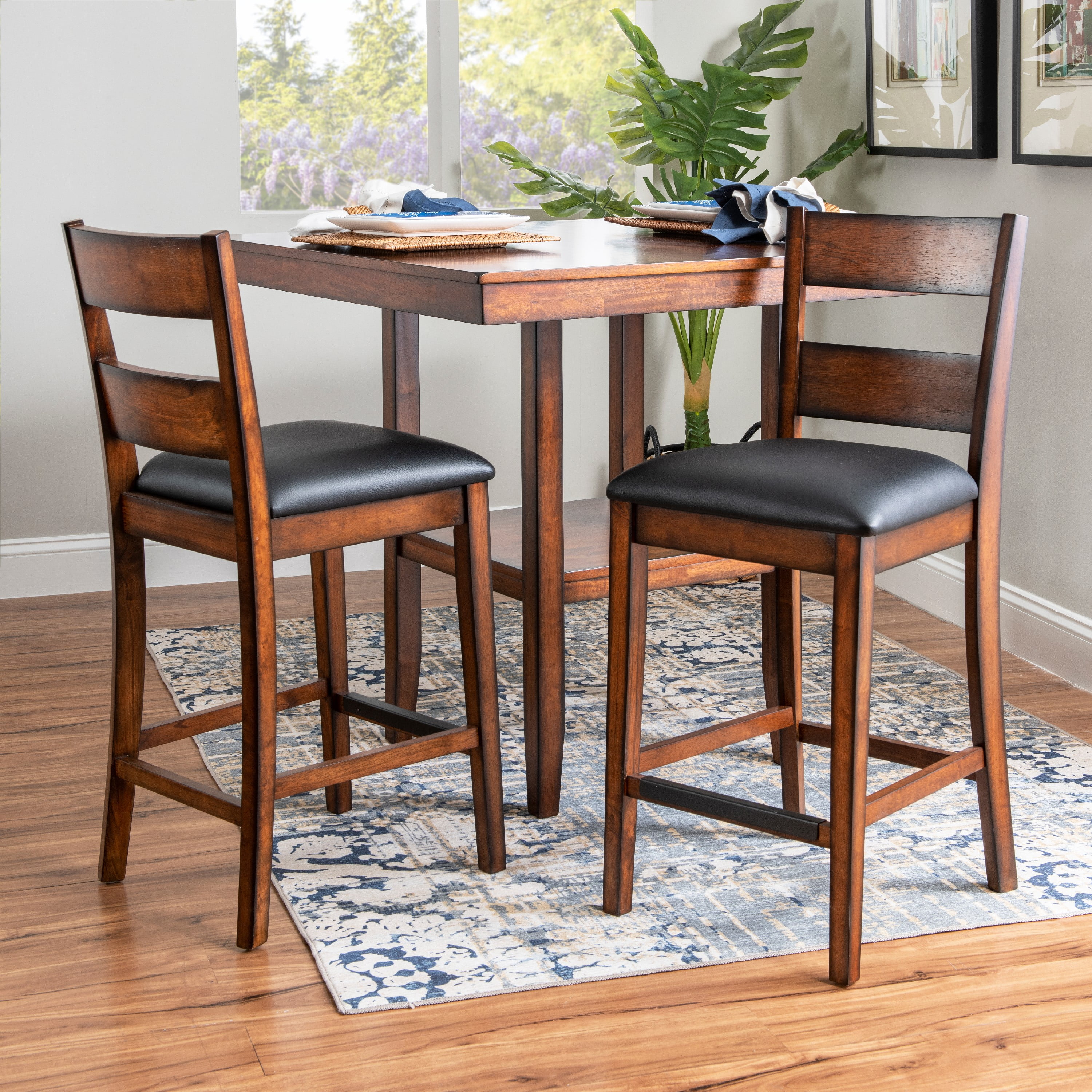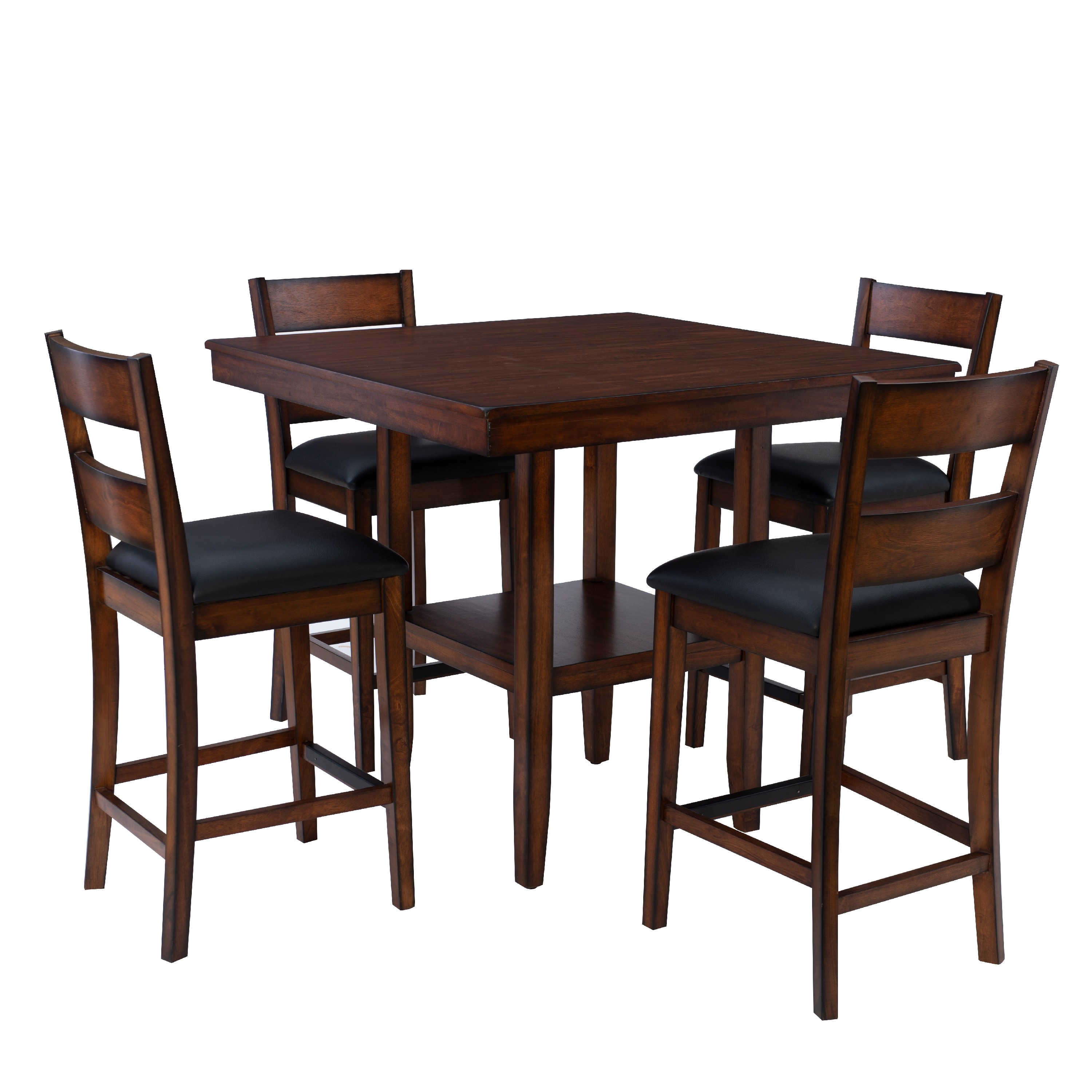 This five-piece counter set offers a stylish blend of modern and traditional design, making it a perfect addition to any home. The smooth, elegant veneer tabletop exudes sophistication, while the convenient lower shelf provides additional storage, making it both functional and aesthetically pleasing. Complementing the tabletop are four counter stools featuring a sleek ladderback design, which adds a touch of classic charm. The seats are upholstered in easy-to-clean black faux leather, ensuring that maintaining their pristine appearance is hassle-free in everyday life. All pieces conveniently ship together in one carton, streamlining the setup process. Some assembly is required, but with its thoughtful design and durable materials, this counter set is sure to enhance your dining or entertaining space for years to come.