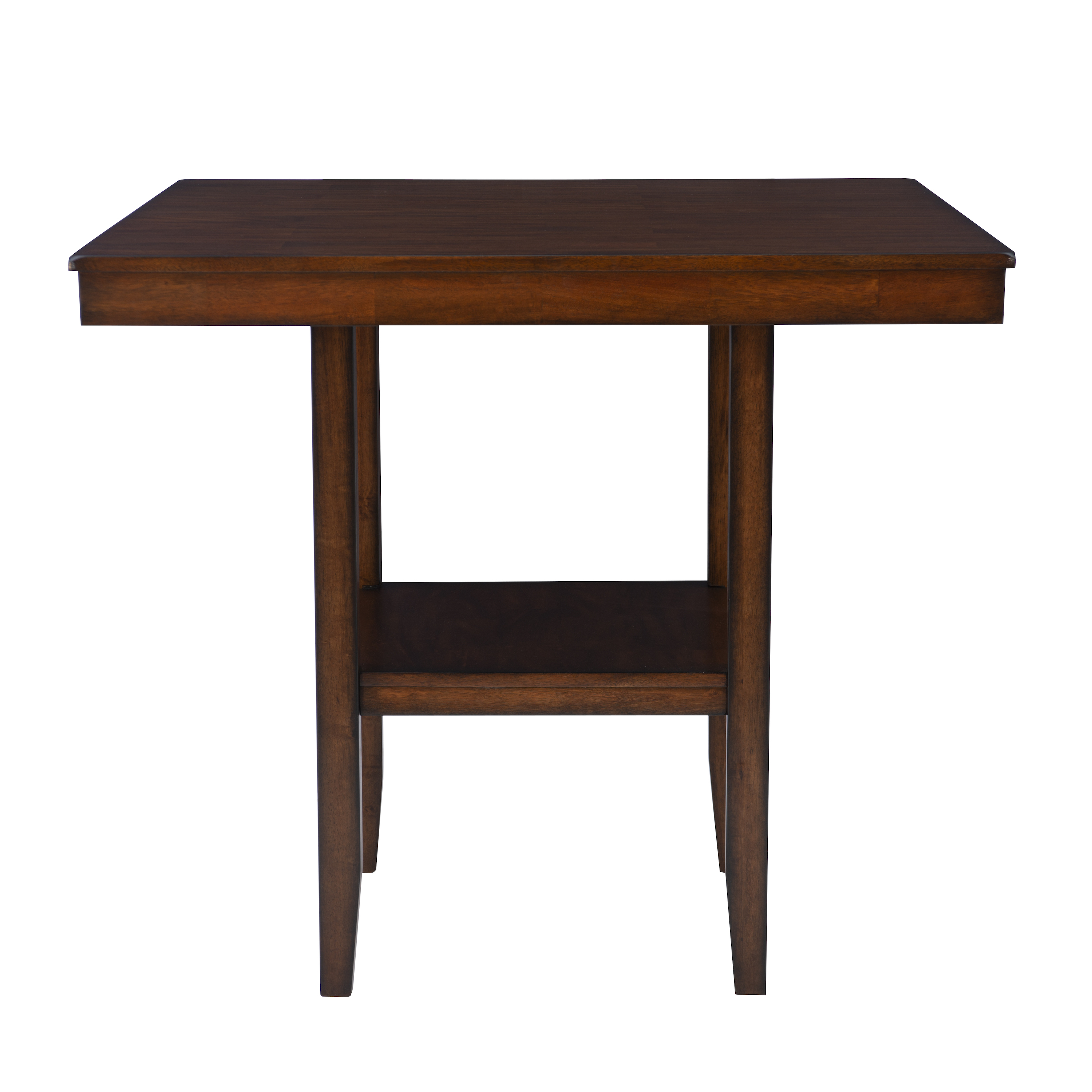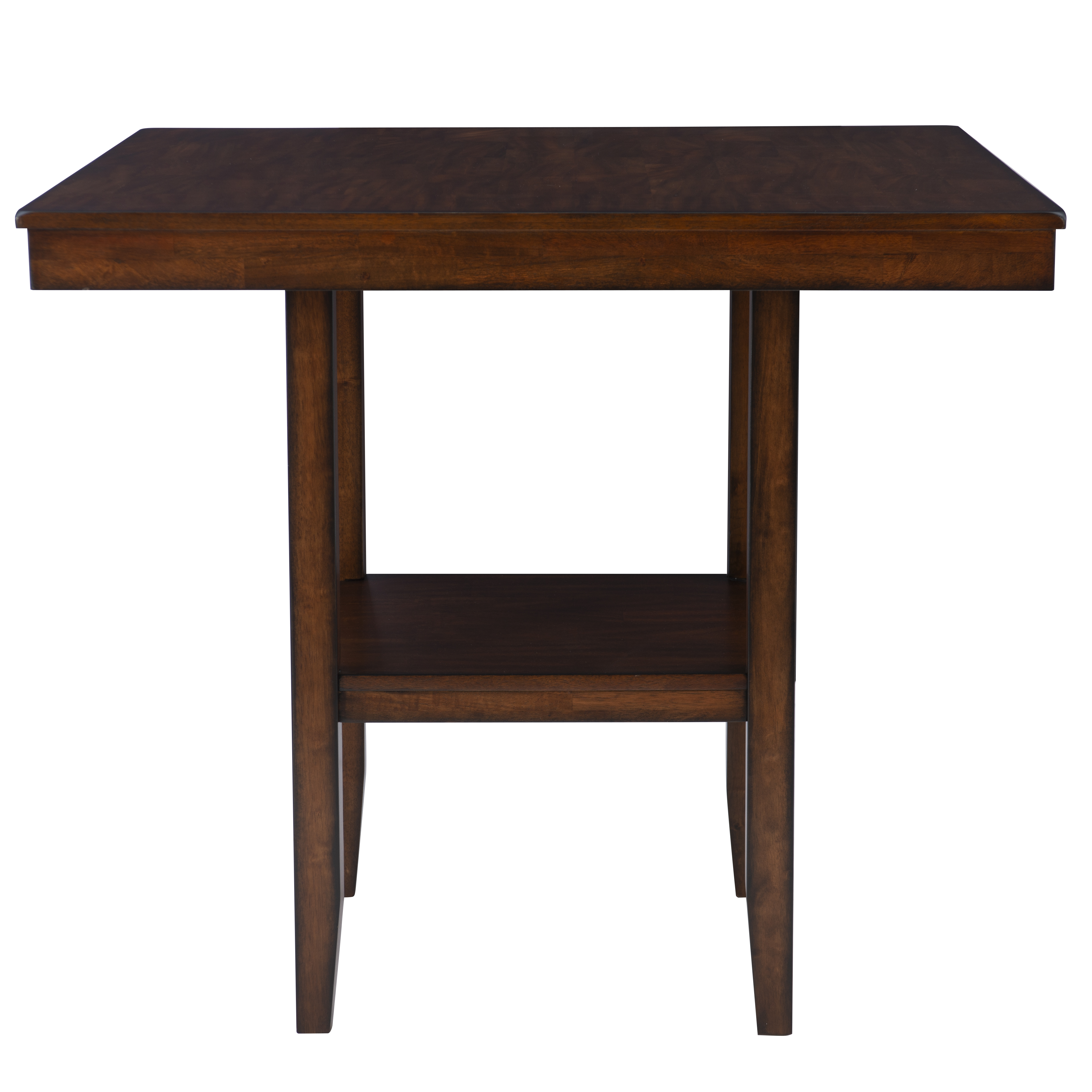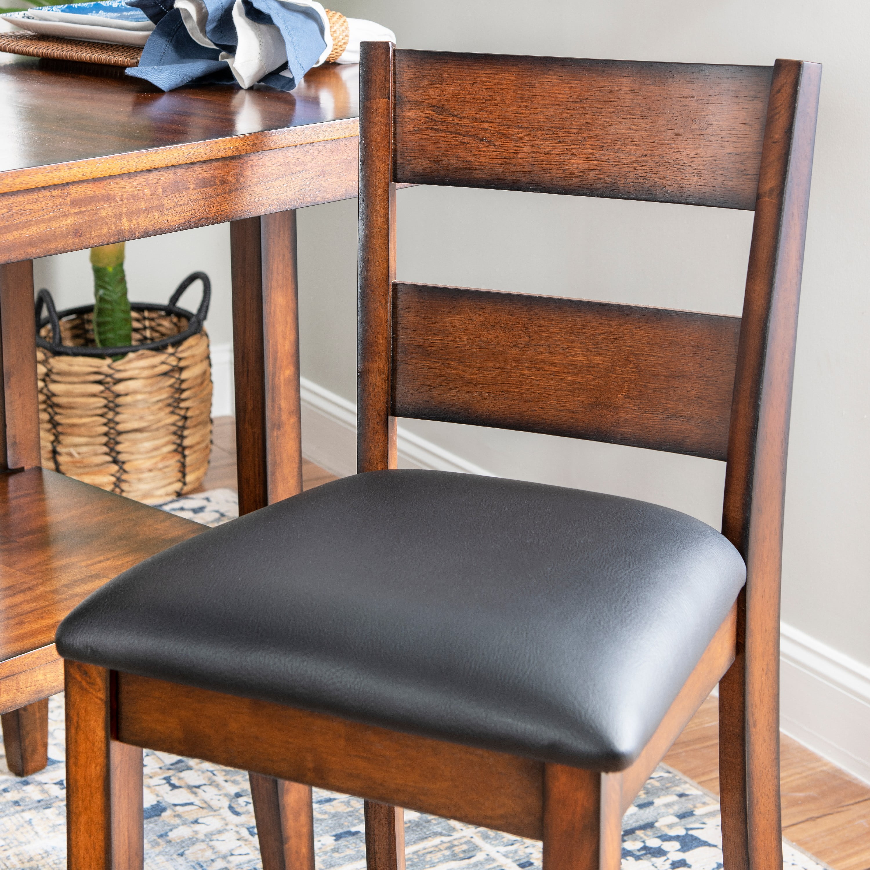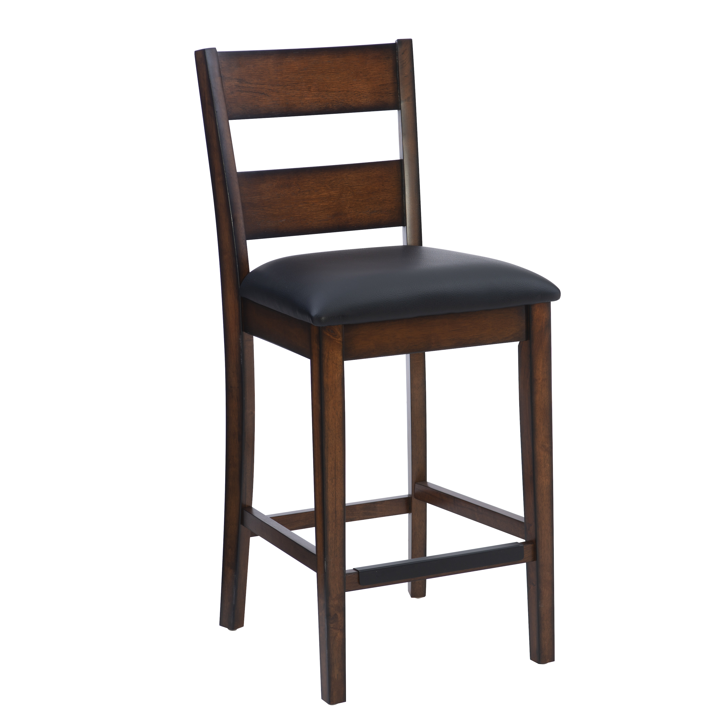 This five-piece counter set offers a stylish blend of modern and traditional design, making it a perfect addition to any home. The smooth, elegant veneer tabletop exudes sophistication, while the convenient lower shelf provides additional storage, making it both functional and aesthetically pleasing. Complementing the tabletop are four counter stools featuring a sleek ladderback design, which adds a touch of classic charm. The seats are upholstered in easy-to-clean black faux leather, ensuring that maintaining their pristine appearance is hassle-free in everyday life. All pieces conveniently ship together in one carton, streamlining the setup process. Some assembly is required, but with its thoughtful design and durable materials, this counter set is sure to enhance your dining or entertaining space for years to come.