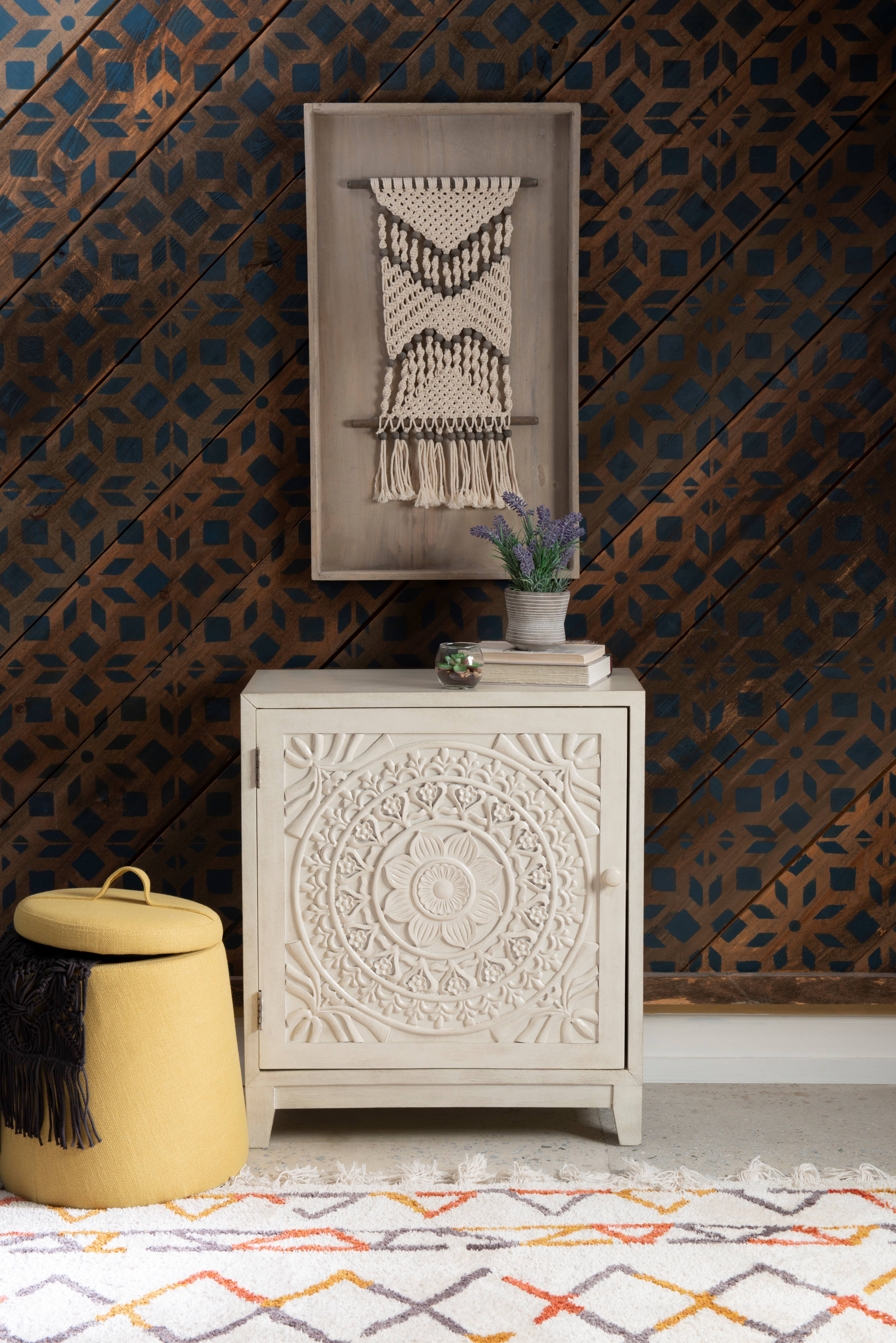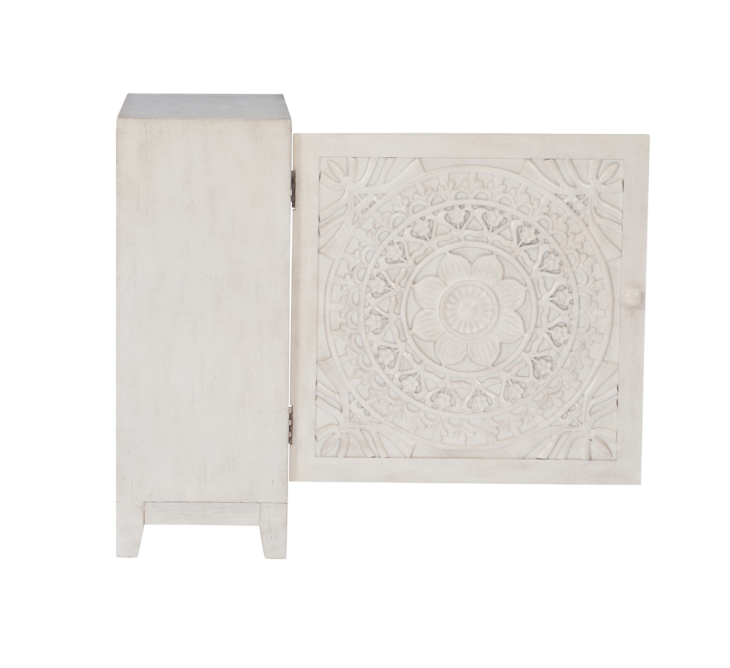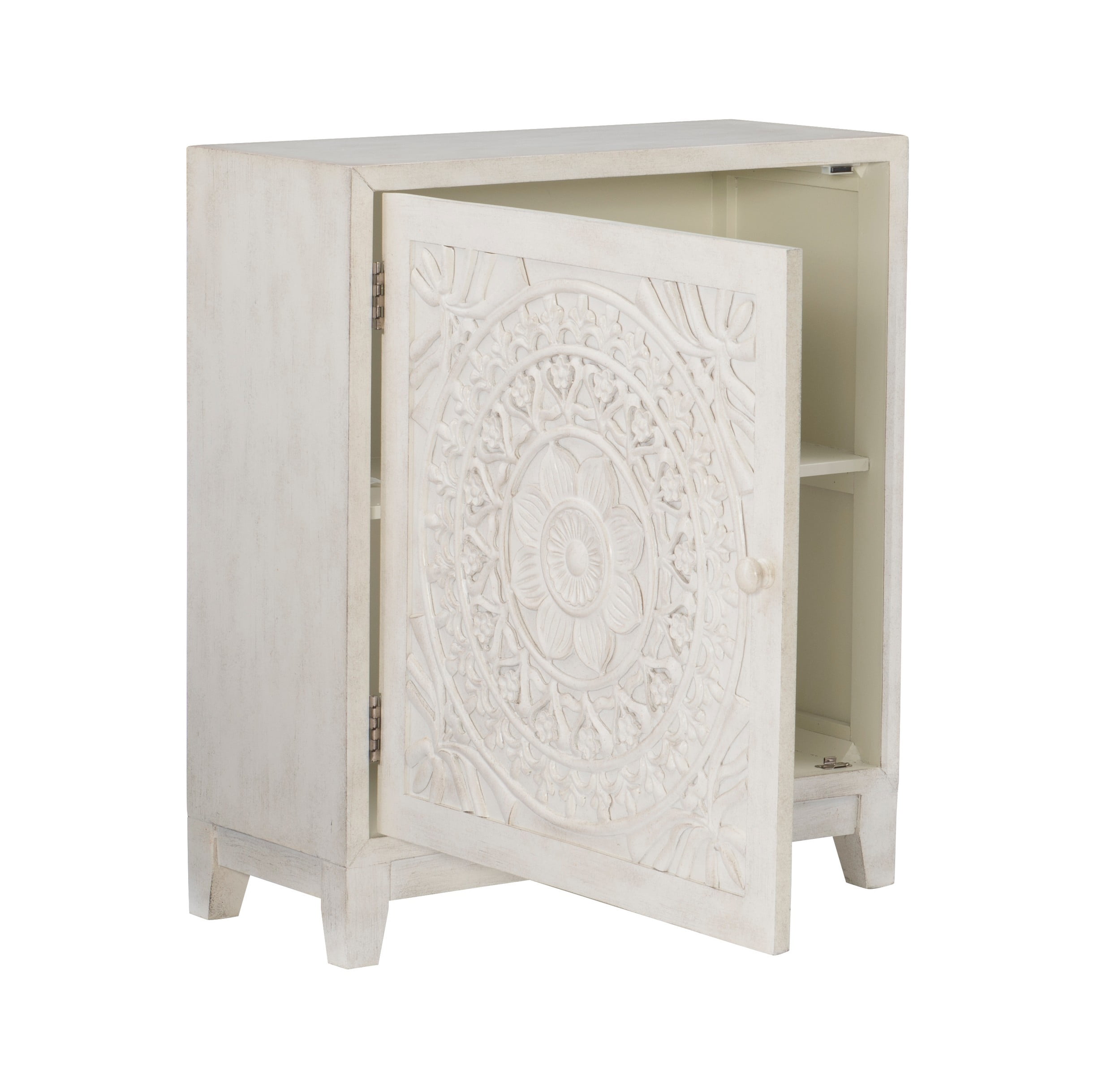 With a modern rustic look, this cabinet is the perfect décor choice for any room in your home. The smokey white antiqued finish highlights the resin medallion front of the cabinet door. The piece opens to one fixed interior shelf for storage and organization. The round wooden knob and short, straight legs bring finishing touches to this sophisticated piece. Features: Crafted from MDF and Resin Smokey White Multi-Step Antiqued Finish Features a resin medallion design on door front Has a fixed shelf inside Door features a magnetic touch latch to open and close Slimline design Shelf dimensions: 11.5″H x 23.5″W x 10.0″D Specifications: Assembly Required: Fully Assembled Product Dimensions: 25.5″w x 11.5″d x 29.25″h Product Weight: 37.26 lbs