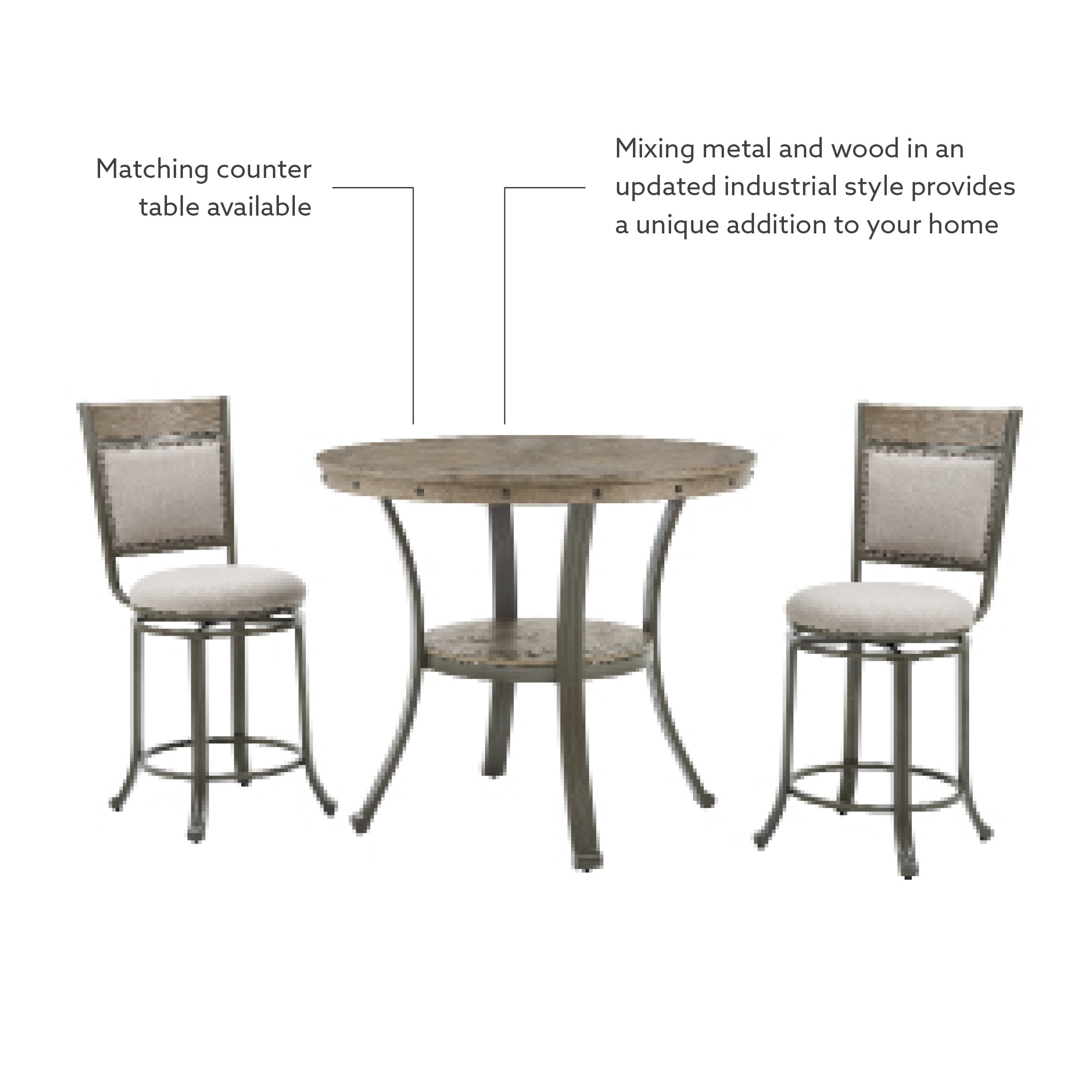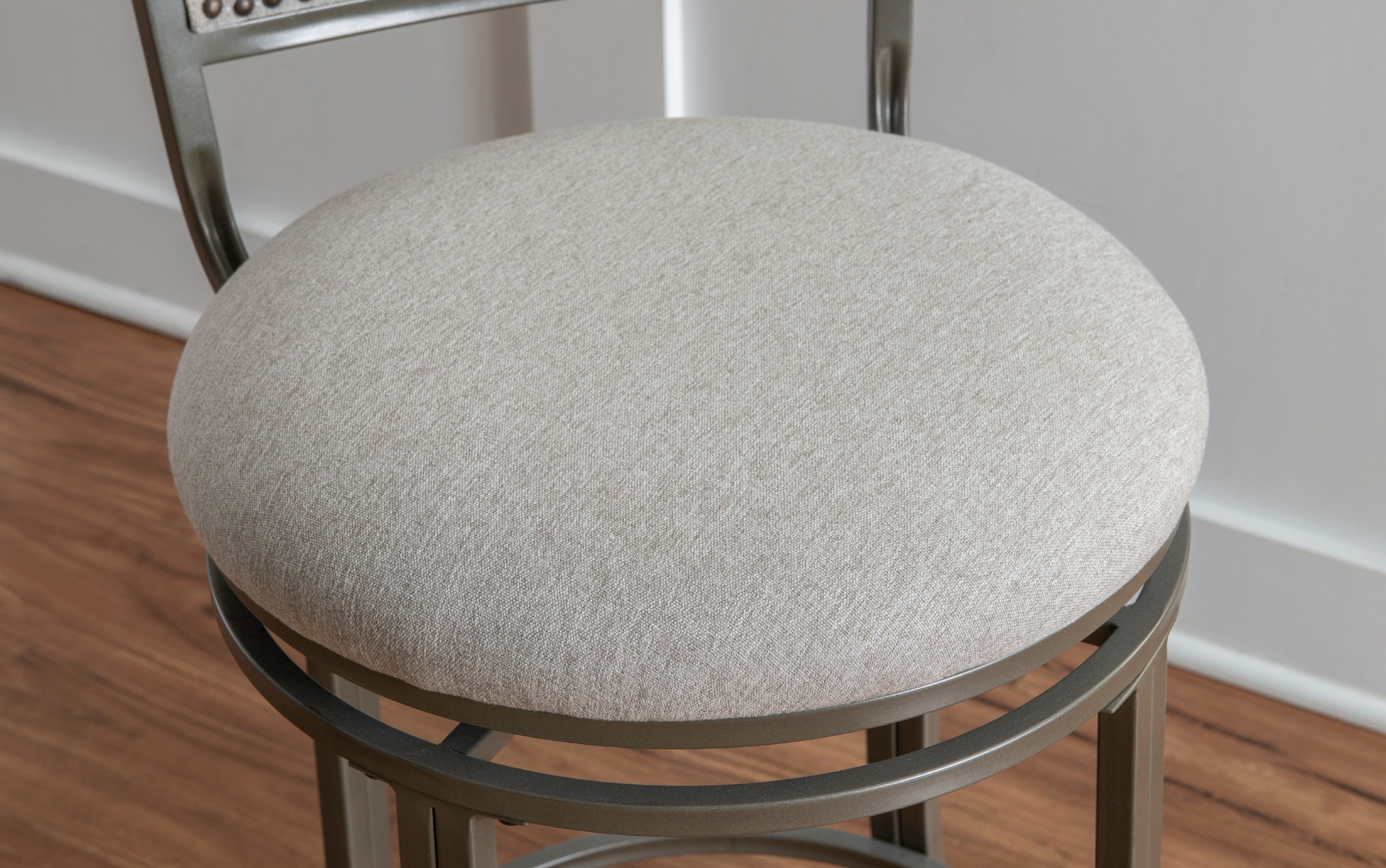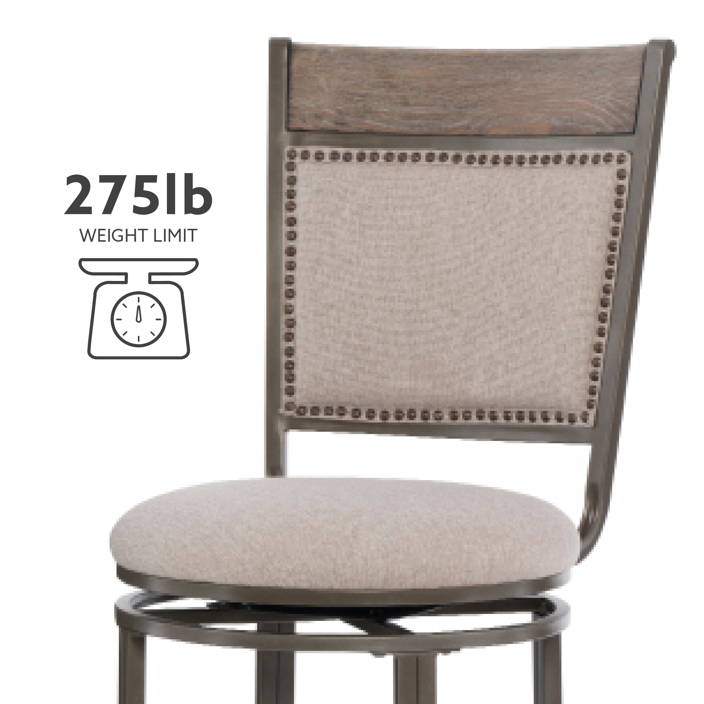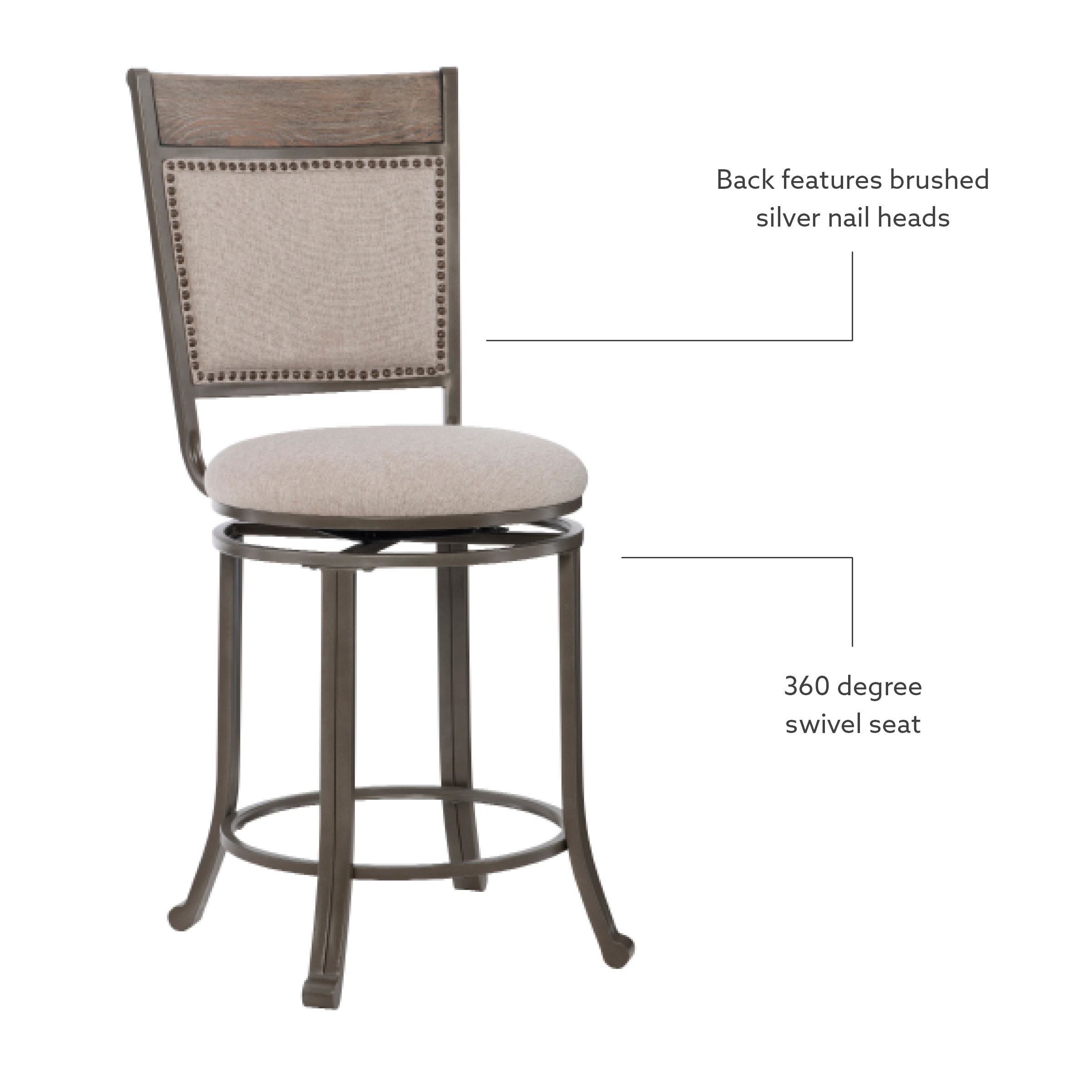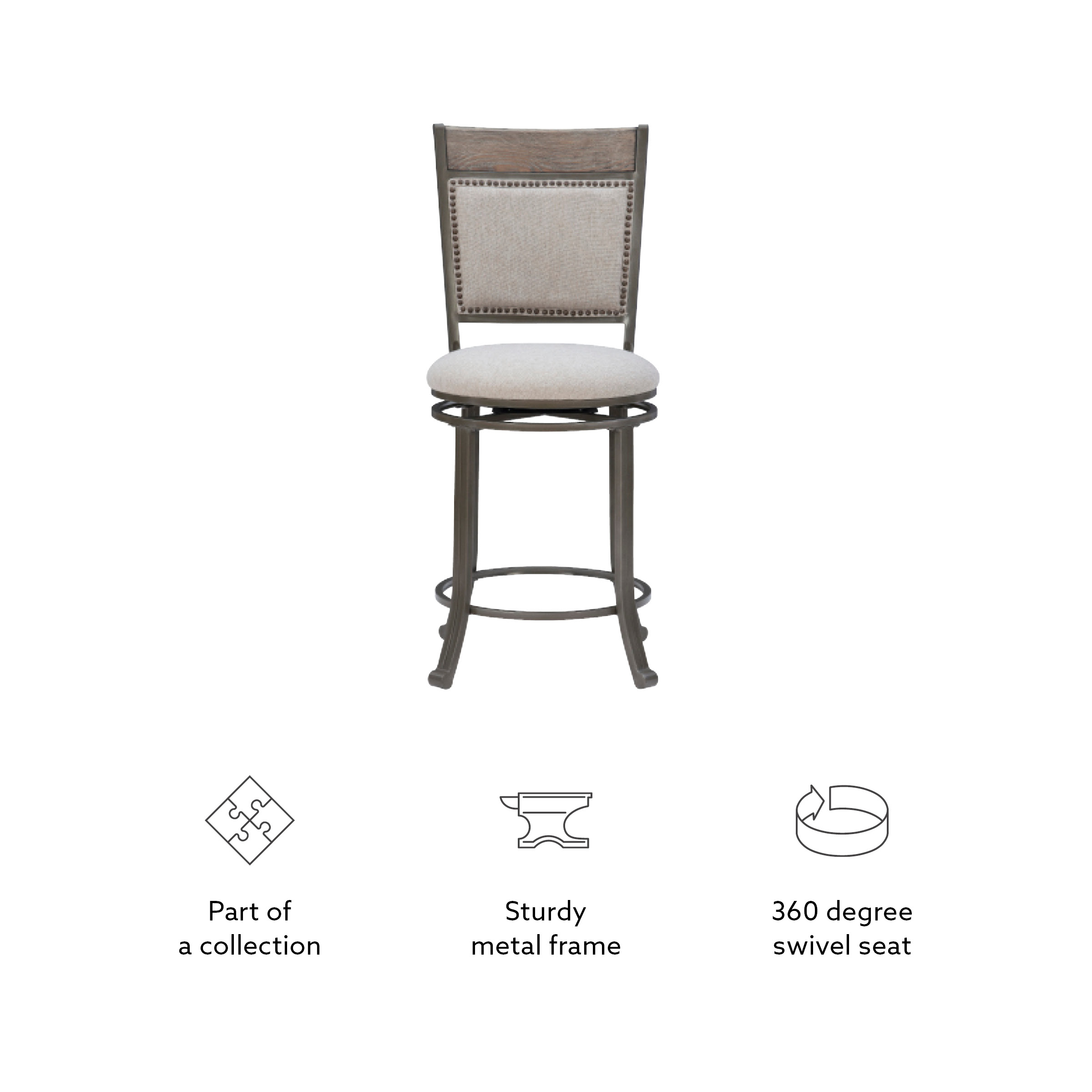 Add comfort and sophistication to your kitchen or dining space with the Powell Holloway 24″ Indoor Metal Counter Stool. Blending industrial charm with transitional style, this stool features a sturdy powder-coated metal frame in a sleek pewter finish, paired with a warm gray-washed wood veneer. The generously padded beige fabric seat and curved backrest offer supportive comfort, while stylish nailhead trim adds a refined touch. Perfect for everyday use or entertaining, the seat effortlessly swivels 360 degrees for convenience and ease. Designed with both function and form in mind, this stool is built to last and easy to maintain. The performance fabric resists stains and cleans up easily, making it ideal for busy households. A circular kick bar and leg levelers enhance stability and comfort, ensuring a secure and relaxed seating experience. Whether tucked under a kitchen island or around a counter-height table, the Holloway stool brings timeless appeal and smart functionality to any room.