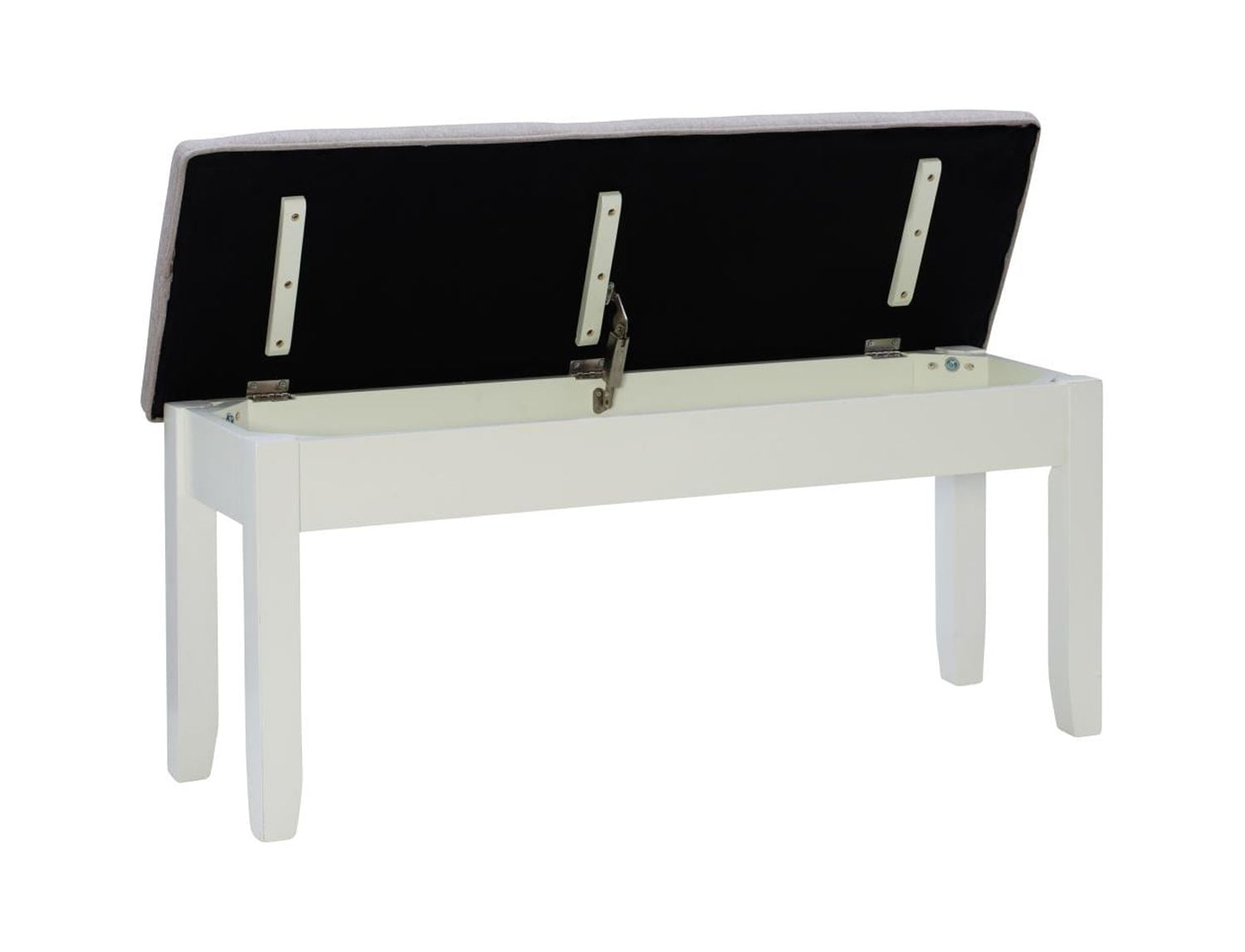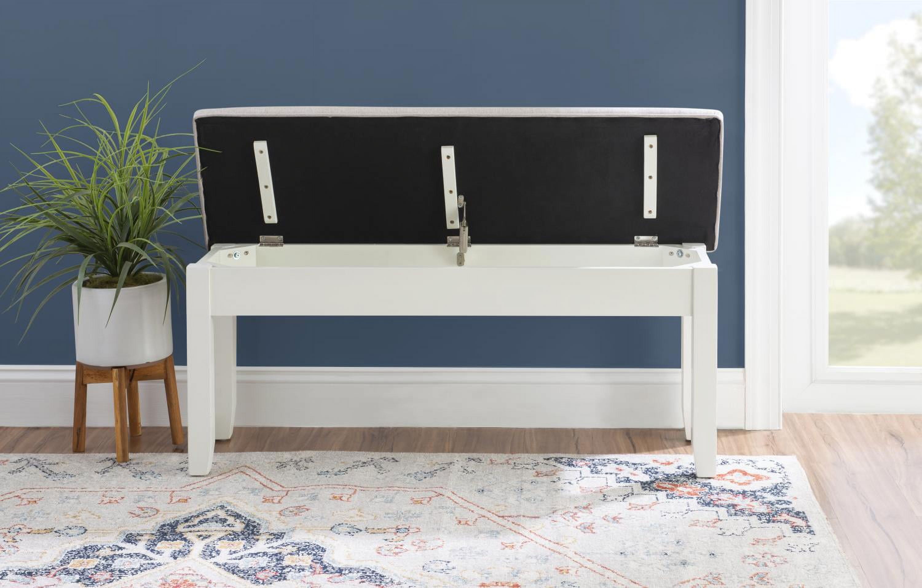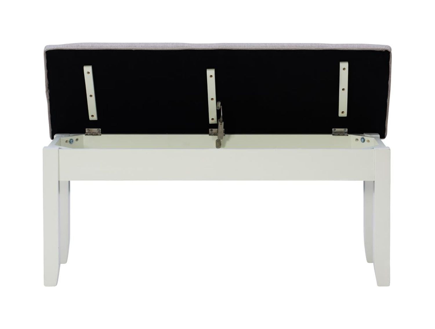 Light grey stain resistant padded fabric bench seat Bench opens for storage No-slam hinge Smokey white painted frame Solid wood legs 19.5″ seat height Some assembly required Nice N Clean® performance fabric
