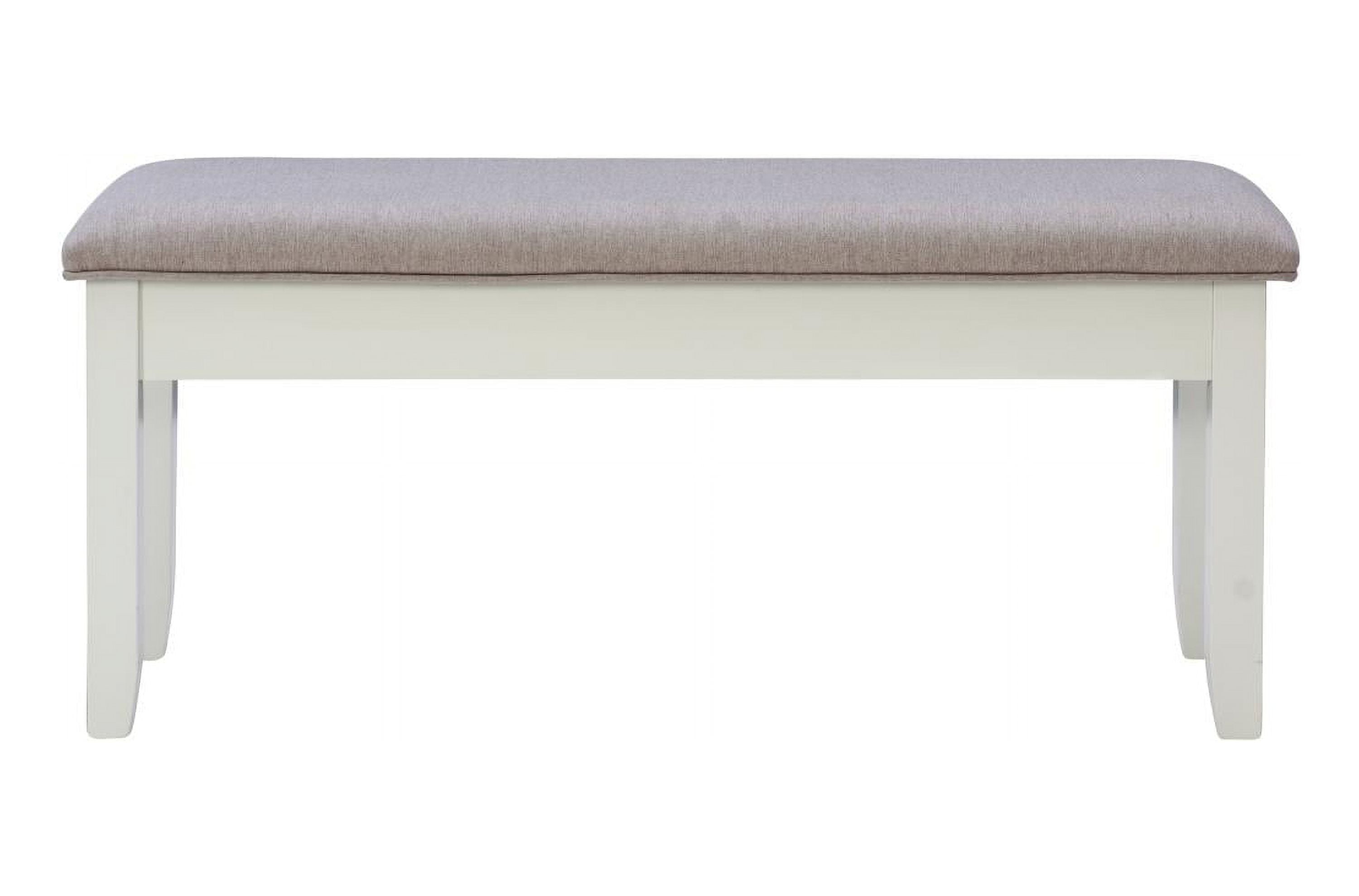 Jane Grey Bench You will want to use this handy bench in so many places in your home. Convenient storage space below the padded seat keeps items such as placemats and towels in easy reach. A heavy duty safety hinge holds the lid open and does not slam when closed. The seat is made with Nice N Clean® fabric, a performance material that withstands the everyday wear and tear that come with any busy kitchen. Everyday spills, including coffee, ketchup, salsa and wine, clean up quickly maintaining the beauty of your investment. Not just for dining, this bench can also be used in your entryway, mudroom, or even at the foot of your bed. Light grey stain resistant padded fabric bench seat Bench opens for storage No-slam hinge Smokey white painted frame Solid wood legs 19.5″ seat height Some assembly required Nice N Clean® performance fabric – Seat Height: 19.5″ – Seat Dimensions: 43.9″w x 13.98″w x 2.36″h – Item Weight: 25.3 – Fabric Content: 100% Polyester – item H: 18 – item L: 44 – Fabric Color or Design: Birch Silver-NC – Item D: 14