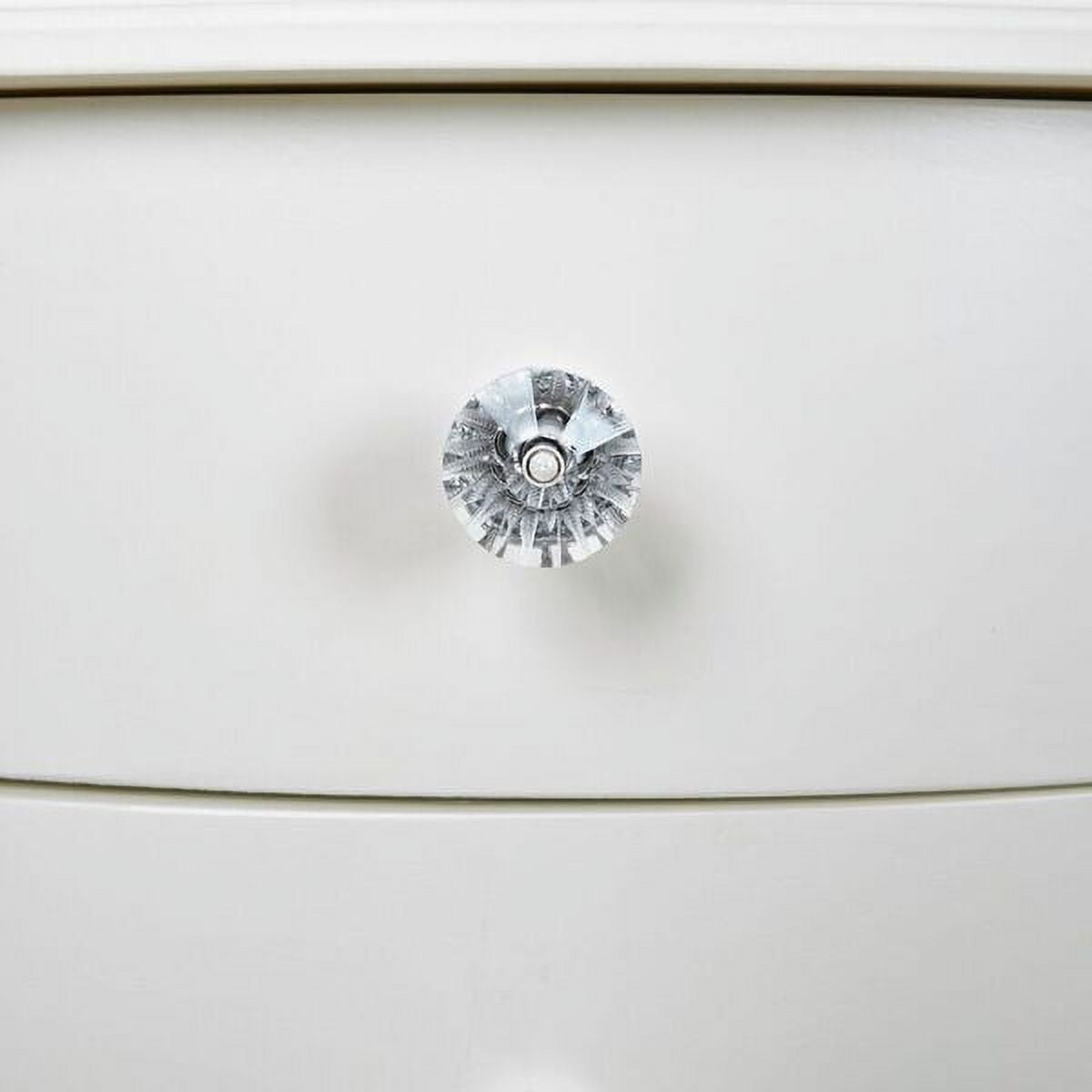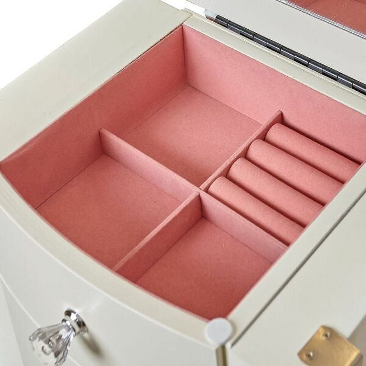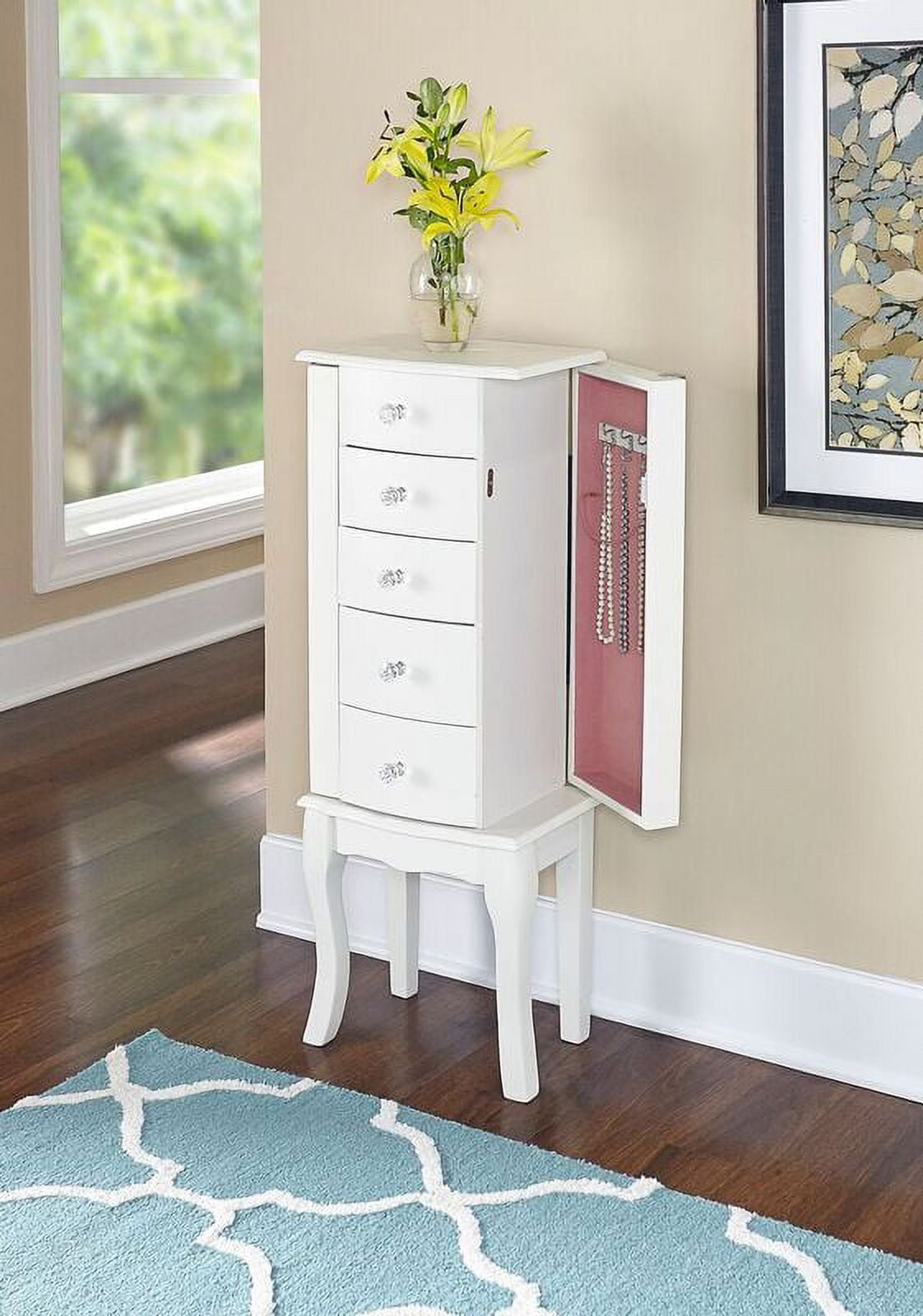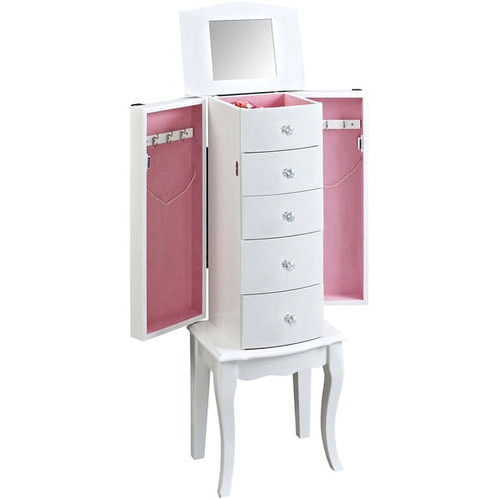 This Jewelry Armoire offers an elegant and practical place to store and organize your favorite accessories. The economical size makes it easy to fit in your living space. A top lid opens to reveal an upper compartment for rings and other small items along with a mirror for inspecting pieces from all sides. On the sides of this jewelry armoire are two doors that open to reveal hooks for hanging necklaces for a safe storage option that prevents tangles and knots. Four spacious drawers provide additional space for bracelets, rings and more. The interior of this white armoire is lined in a pink, plush material that prevents delicate pieces from being scratched. It features a scalloped top and front apron, as well as antique drawer pulls for a classic look. The curved drawers also offer a continental touch. This armoire’s white finish can easily coordinate with other furnishings and decor in a bedroom.