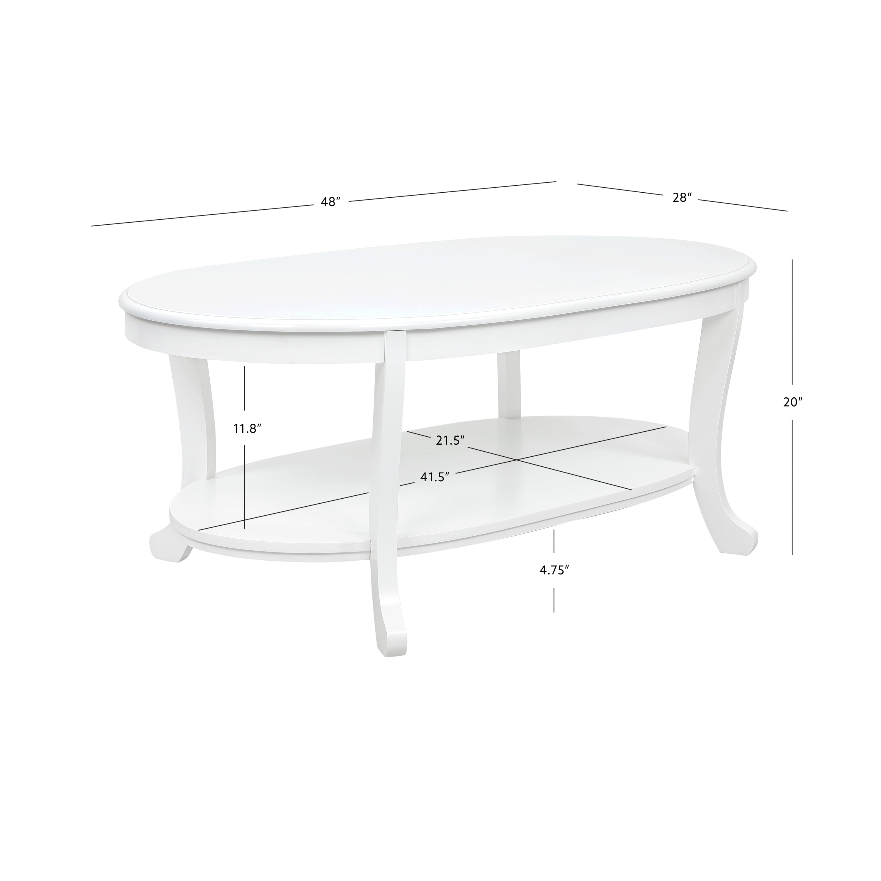 Classic understated coffee table design Rustic white finish with gently tapered legs Plenty of surface area to display books magazines framed photos flower arrangements and more Top shelf supports 50 lbs while lower shelf supports 20 lbs Bottom shelf provides additional storage space Dimensions: 48 L x 28 D x 20 H inches Ships in 1 box