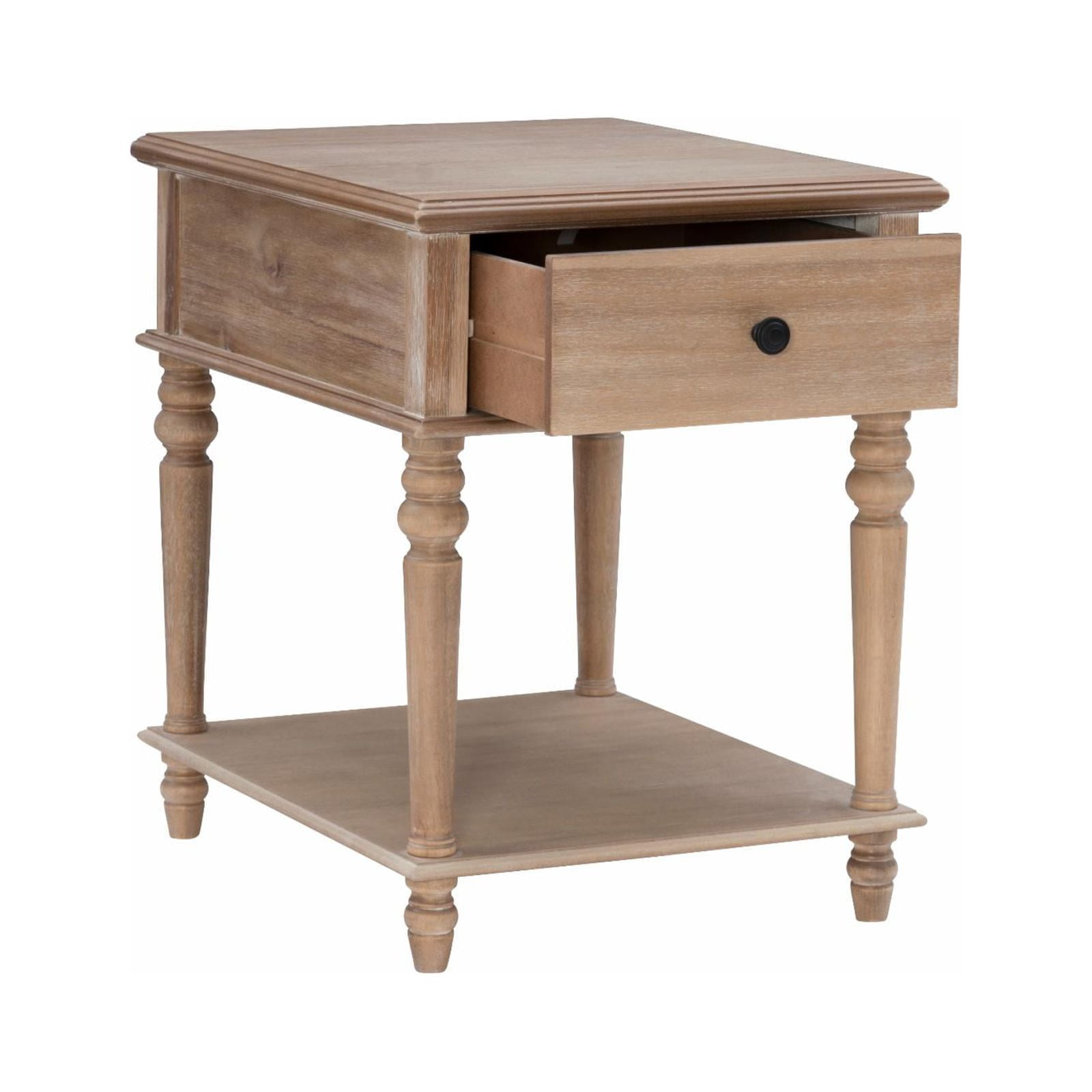 The Powell Miele Traditional Side Table in Natural combines timeless design with modern functionality, making it a versatile addition to any room. Featuring beautifully turned legs, this elegant piece offers both style and practicality. The generously sized tabletop provides ample space for your decor, while the large drawer keeps your essentials neatly tucked away. A lower shelf provides even more storage or display possibilities, enhancing its utility without compromising on aesthetics. The subtle yet striking dark bronze metal knob completes the look, adding a touch of sophistication. Whether placed in the living room, family room, bedroom, or entryway, this end table will effortlessly elevate your home’s decor for years to come. With easy assembly that takes less than 15 minutes, you can enjoy this stylish, functional piece almost immediately. The convenient wipe-clean surface makes maintenance a breeze, while the carefully designed dimensions ensure it fits seamlessly into your space. Enjoy the perfect blend of classic style and practicality with the Powell Miele Traditional Side Table.