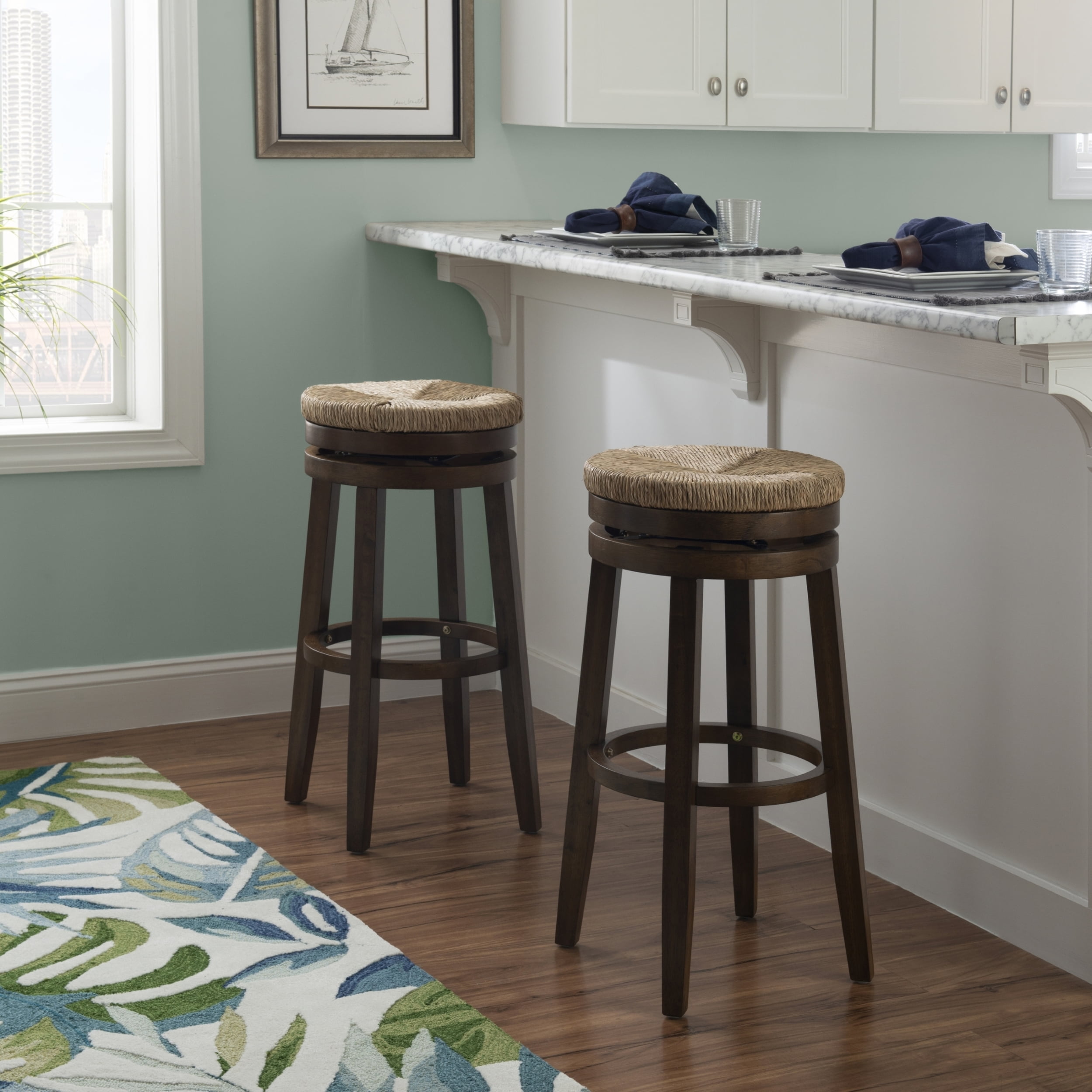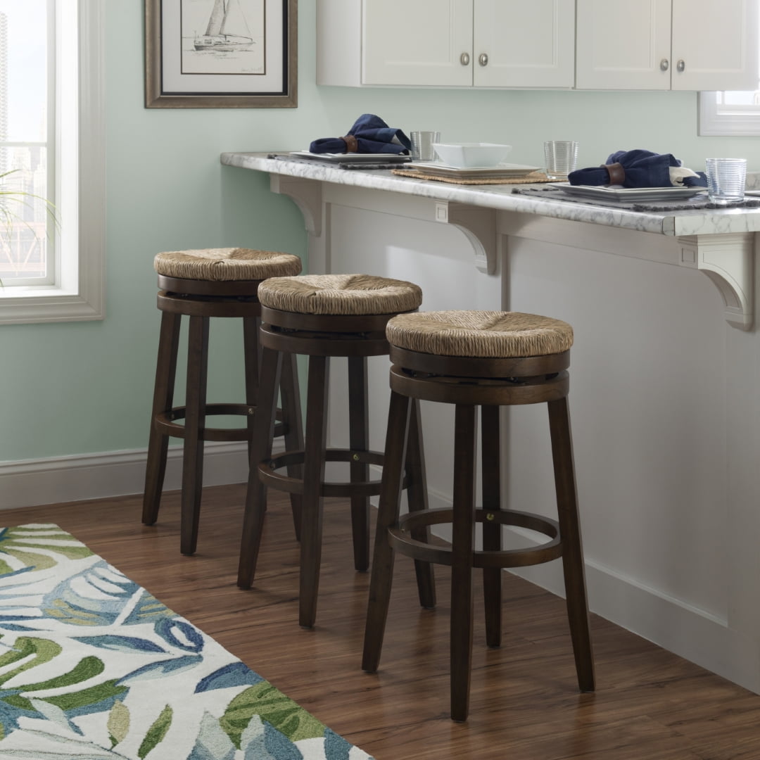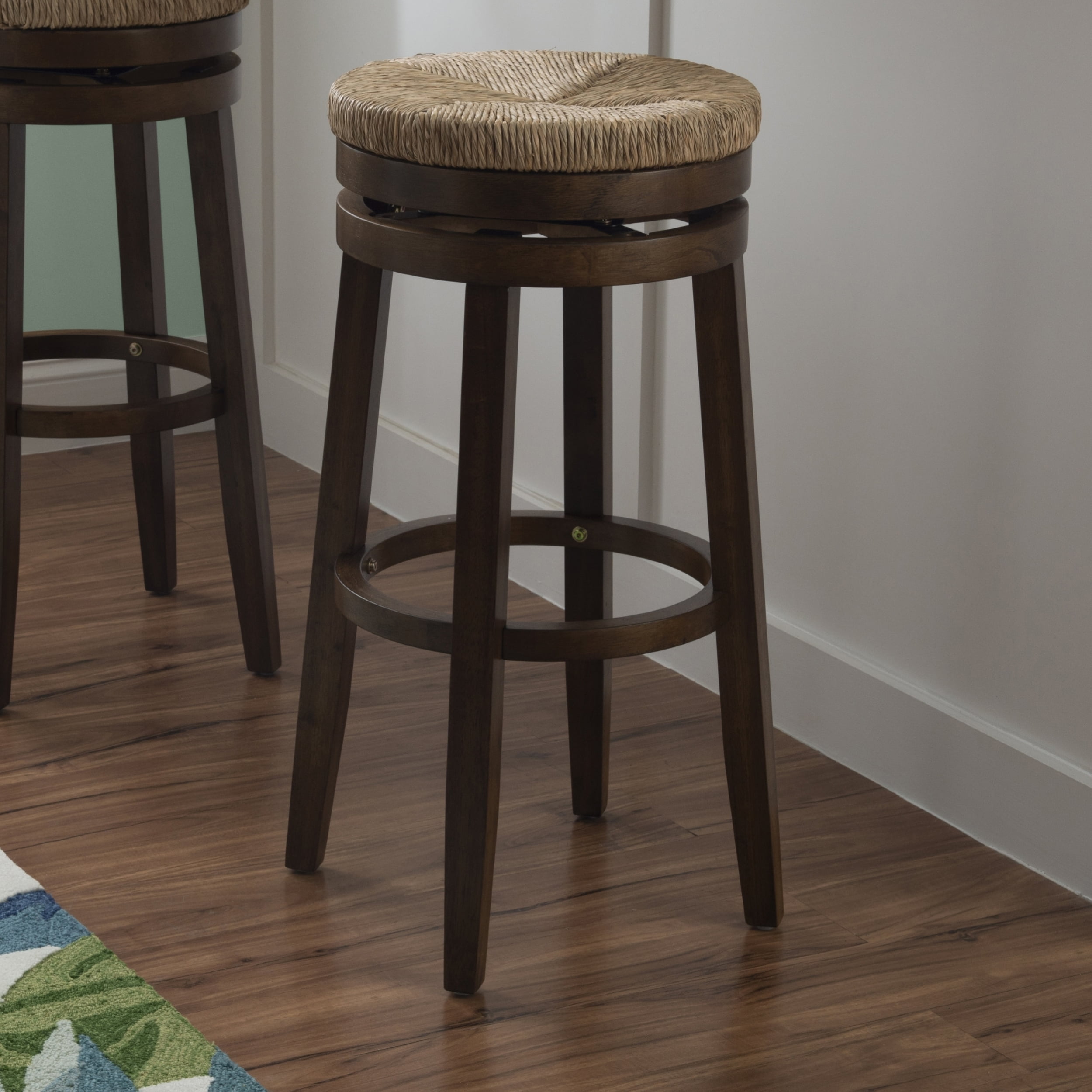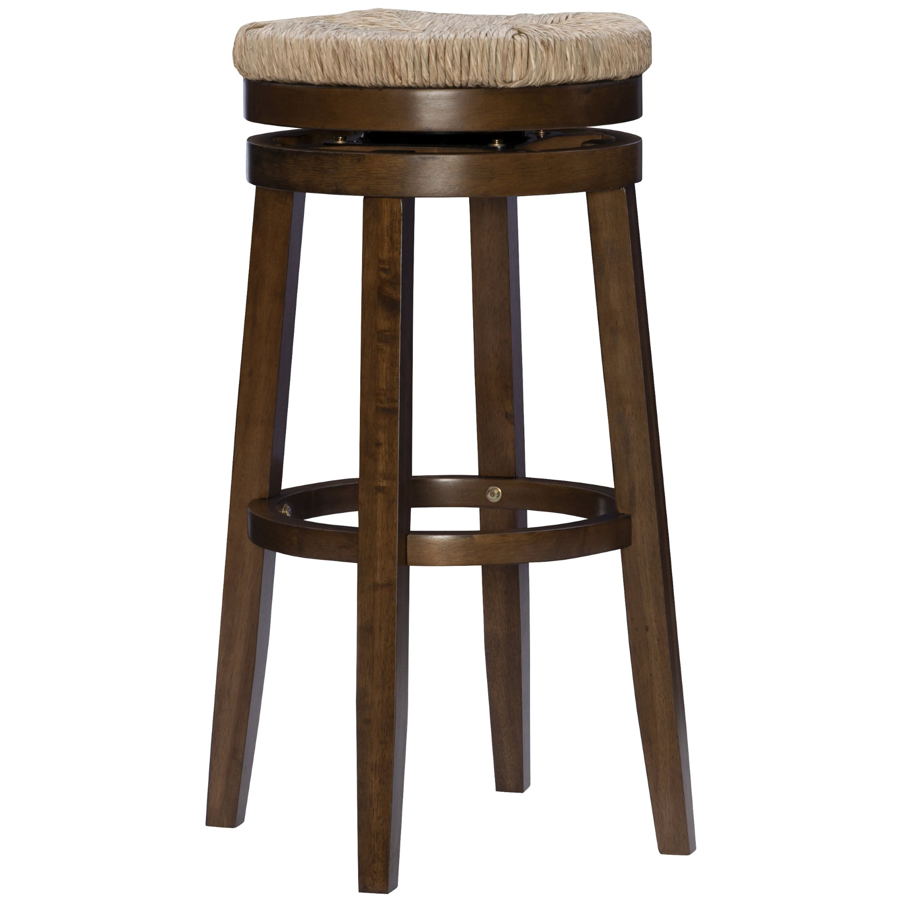 Morgan 31 in Barstool Walnut This seagrass seat bar stool in a walnut finish is the perfect the look for your dining or bar area. Supported by four sturdy legs, this durable stool sits 31″ high, and has a 275lb. weight limit to accommodate your guests. Its polished wood grain finish and timeless charm complements a variety of decor settings, bringing endless seating options to your living space. 360 degree swivel Foot rest is 1″d x 1.18″h Solid wood legs, 1.18″w x 1.18″d Assembly takes less than 15 minutes Wipe clean with dry or damp cloth Seat Height 31″ – Bar height – Seat Height: 31″ – Seat Dimensions: 15.38″w x 15.28″d x 2.13″h – Item Weight: 19.4 – Fabric Content: NA – item H: 31 – item L: 19.25 – Fabric Color or Design: NA – Item D: 19.25