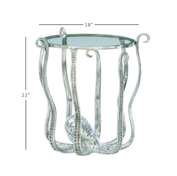 Round 8mm tempered glass top securely suspended by raised tentacle legs holds up to 35 pounds High quality aluminum material is safe for both indoor and outdoor use 20 inch diameter and 22 inch overall height makes it easy to fit almost anywhere Delivered fully assembled and ready to use Assembled Dimensions: 20″ W x 20″ D x 22″ H Weight Capacity: 35 lbs. Ships in 1 box
