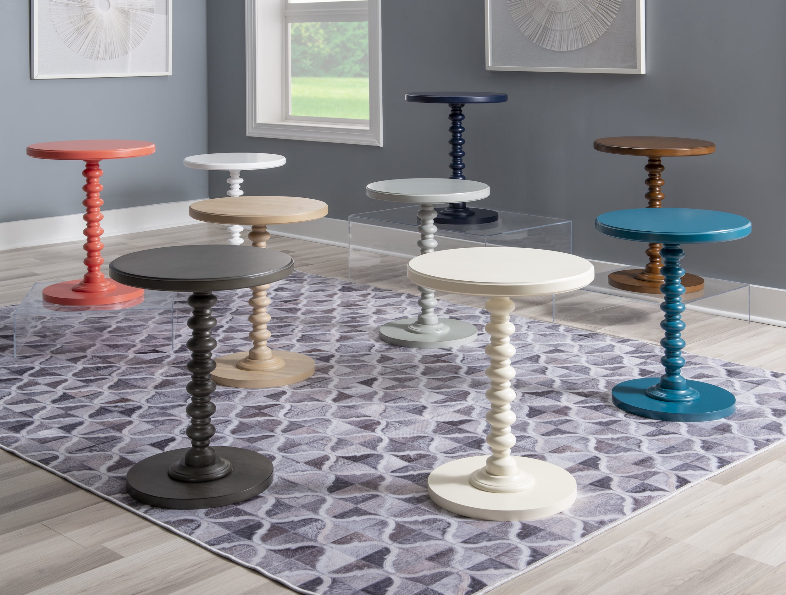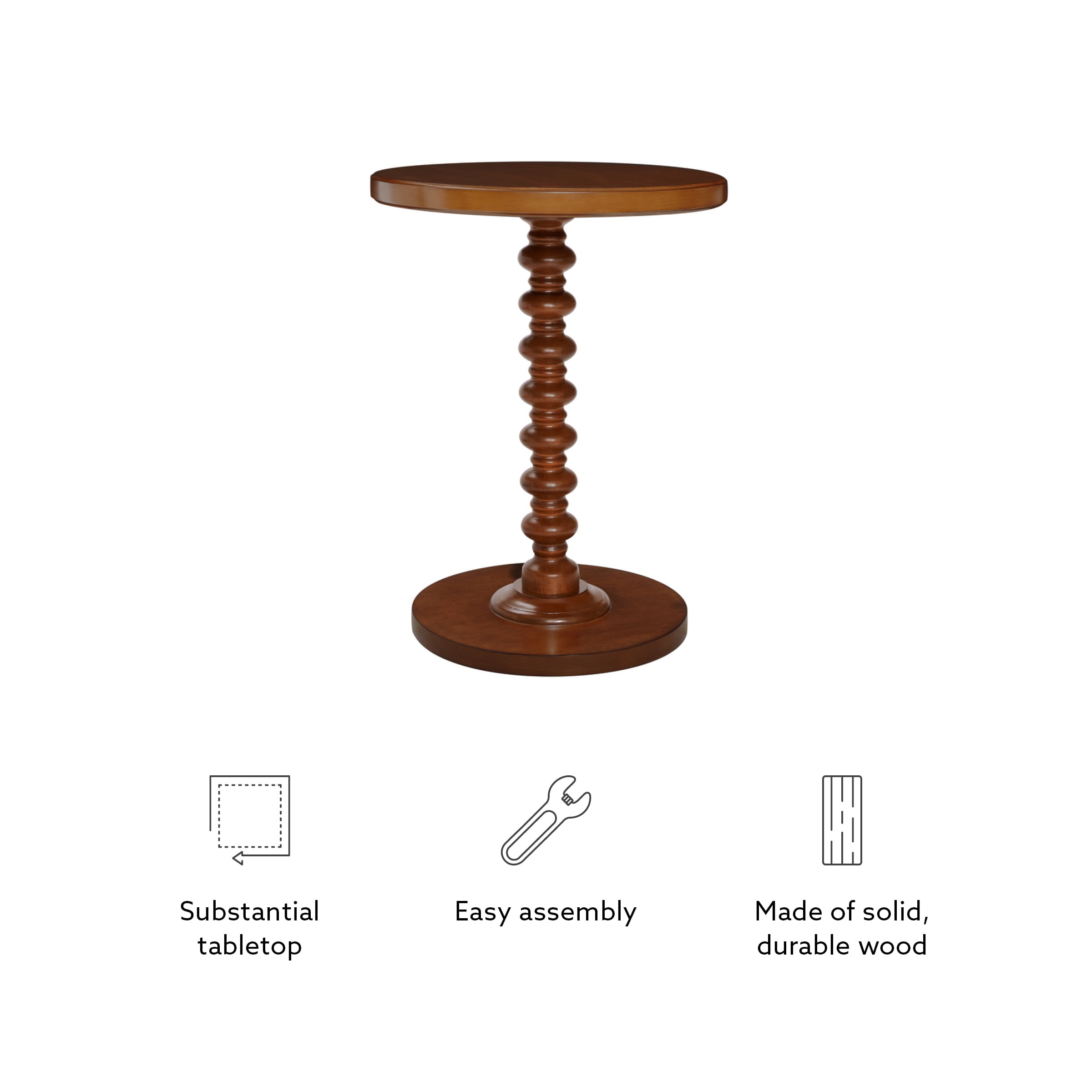 Warm hazelnut wood finish Beautifully turned spindle Sturdy pedestal base Made from solid durable rubberwood Use as an accent table end table or nightstand Dimensions: 17 L X 17 D X 22.25 H inches Weight Capacity: 20 lbs Ships in 1 box