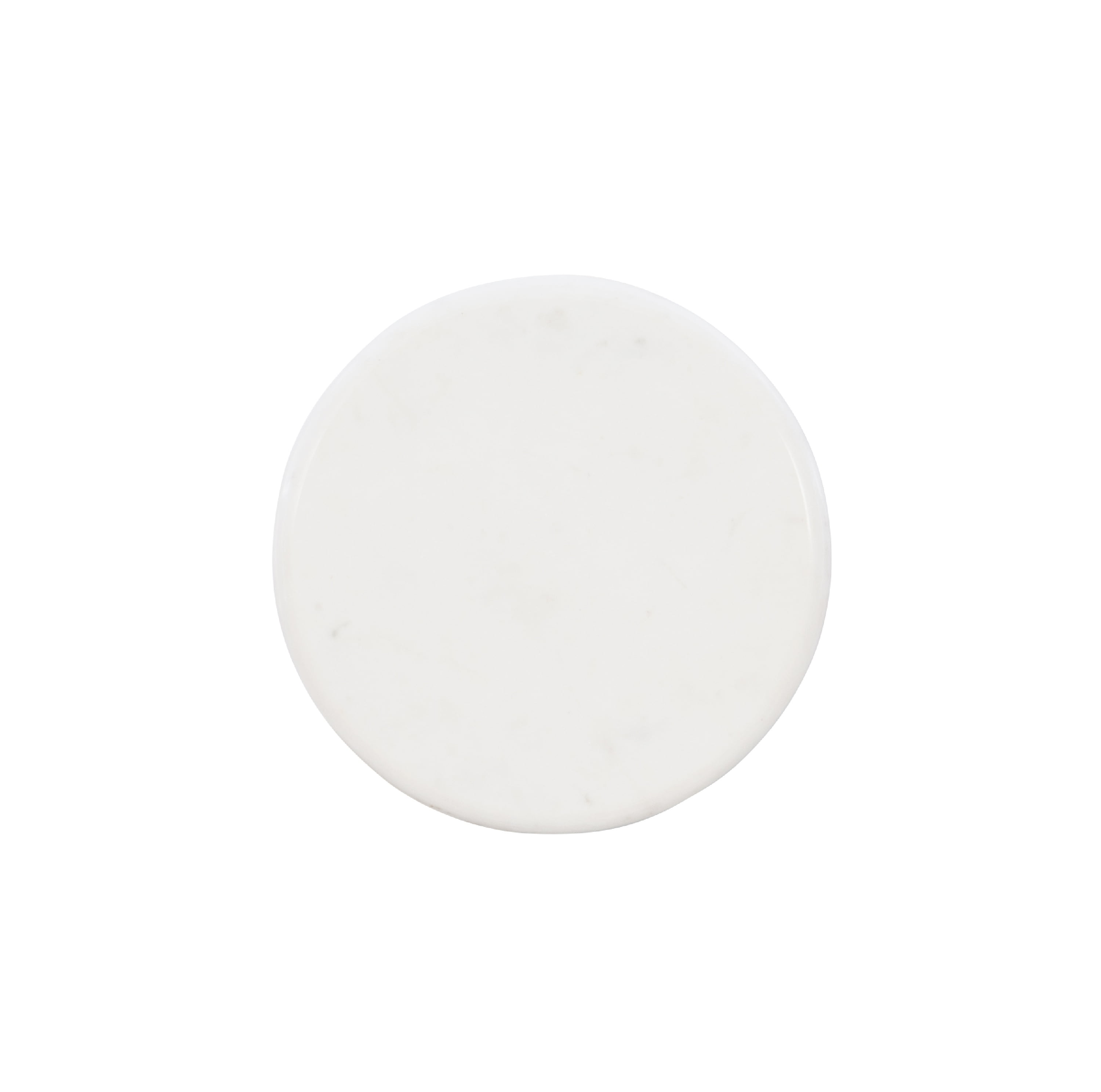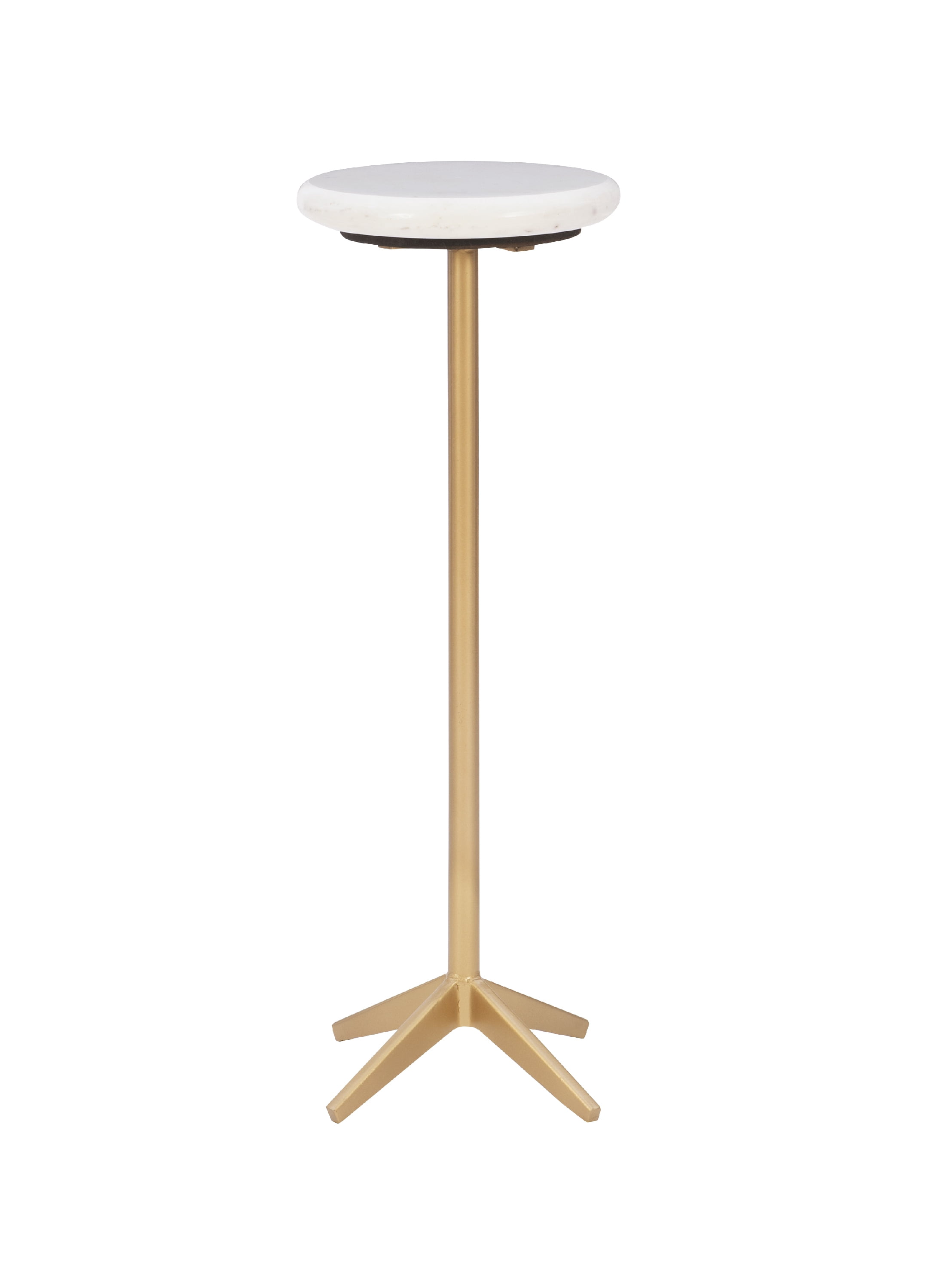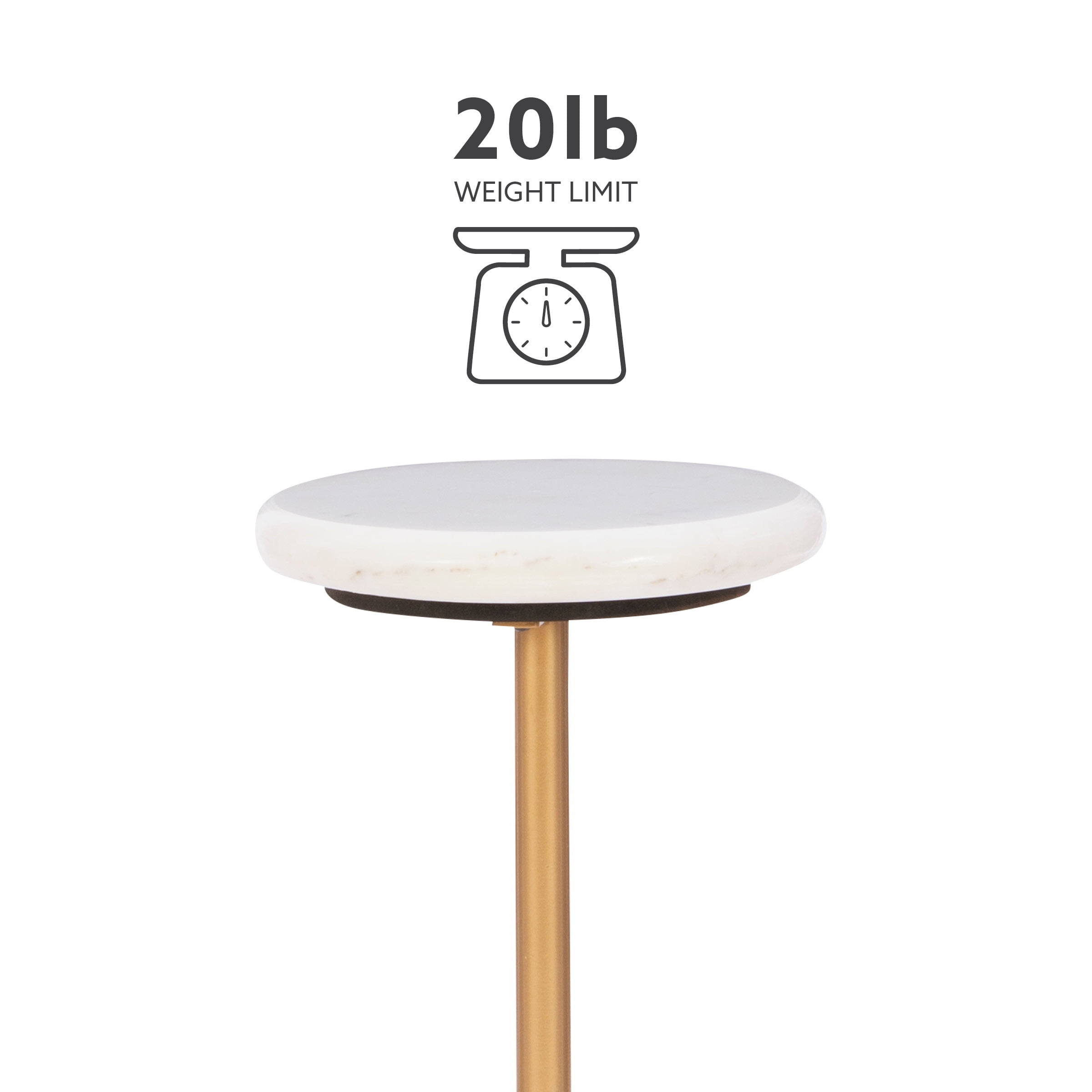 Glamorous and elegant accent table for any room Gold colored metal base 10 inch round white stone top Four iron feet stabilized by levelers Compact size great for tight spaces 28 inches tall No assembly required Assembled Dimensions: 10.5″ W x 10.5″ D x 28″ H Weight Capacity: 20 lbs Ships in one box