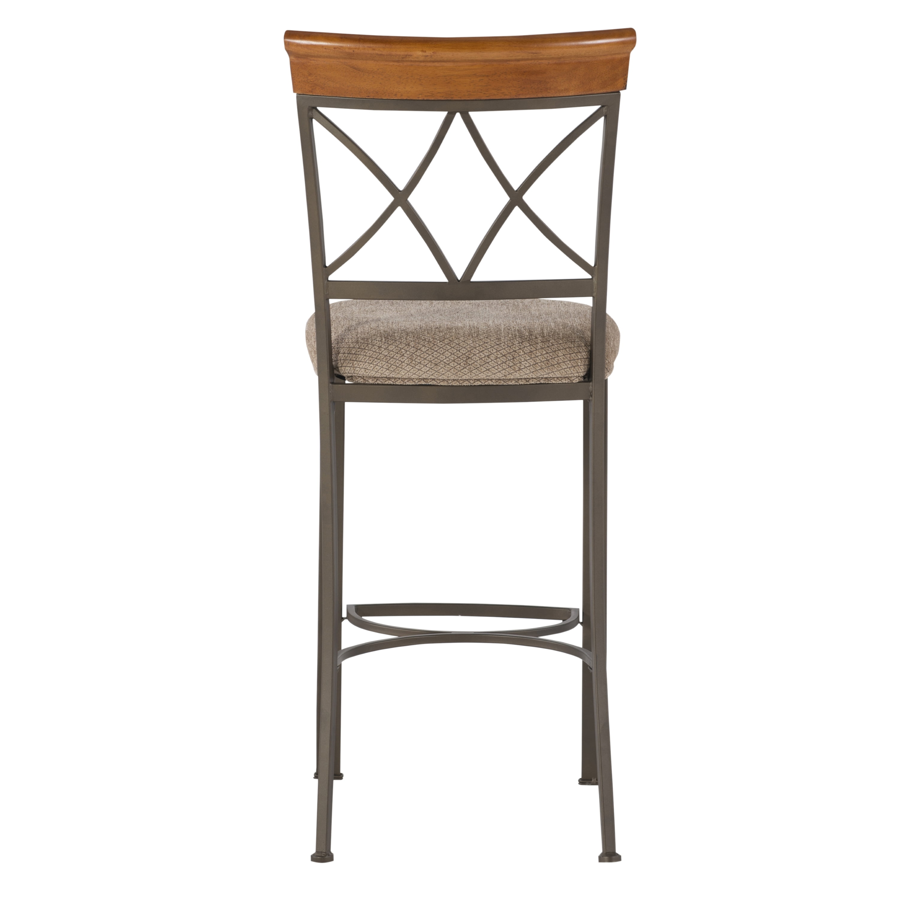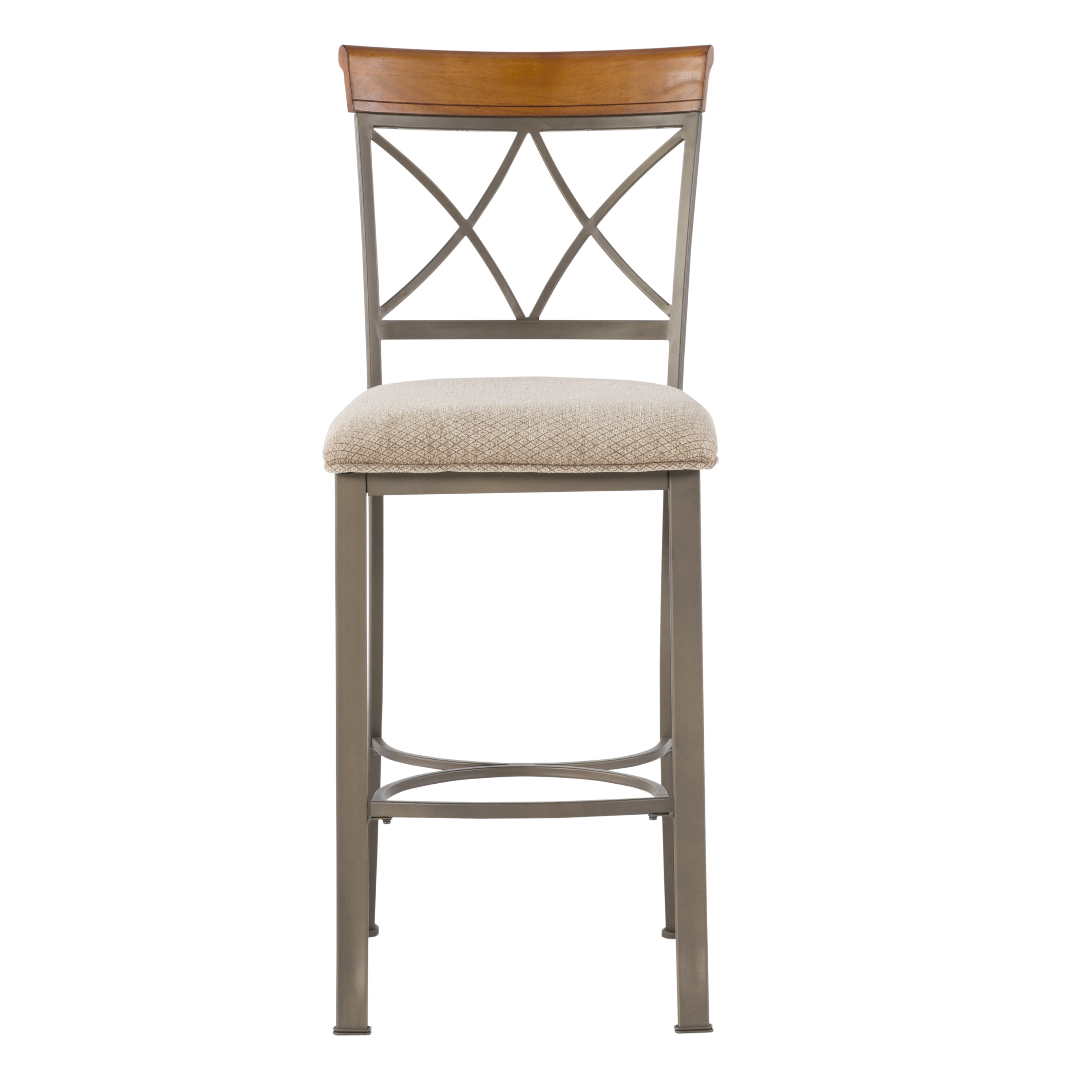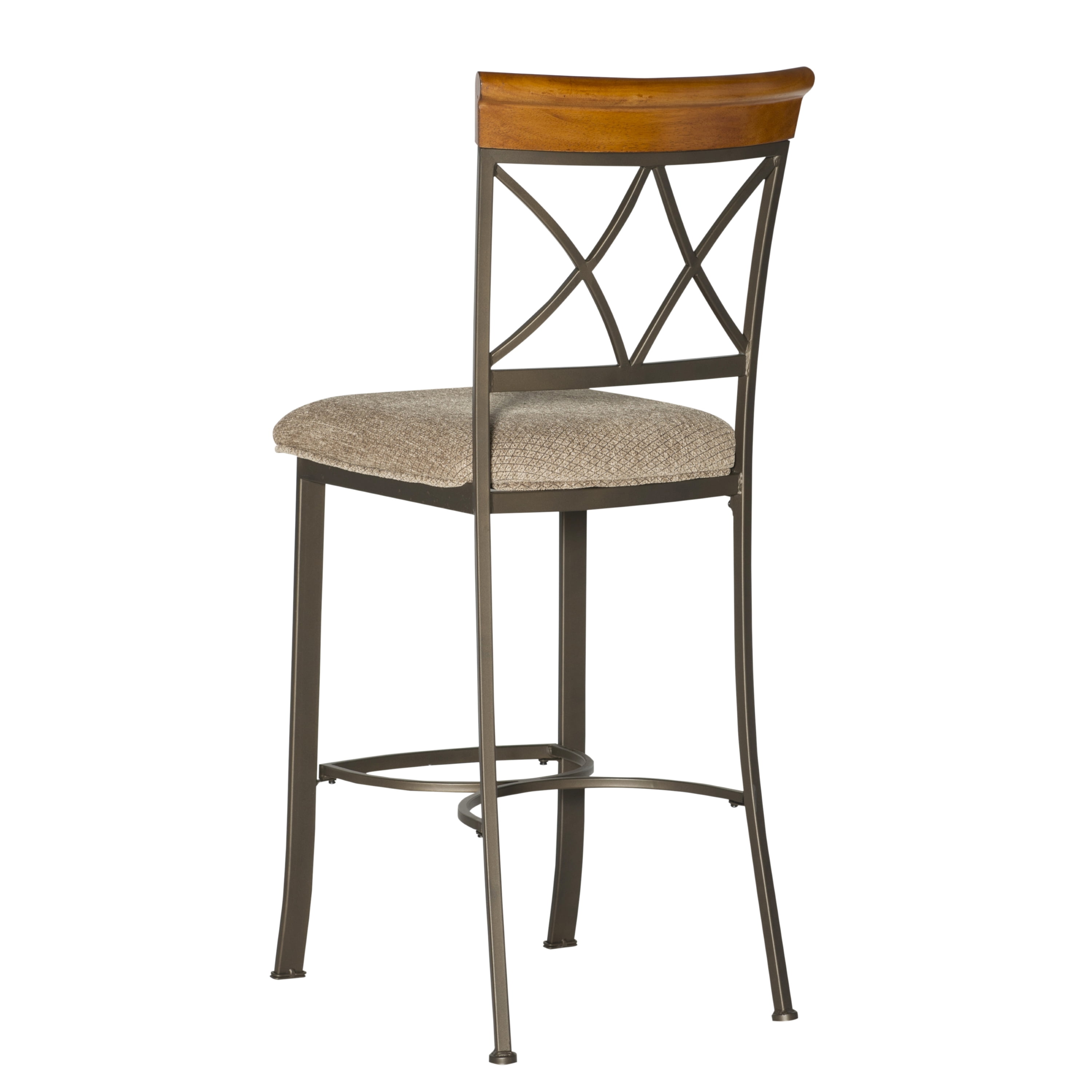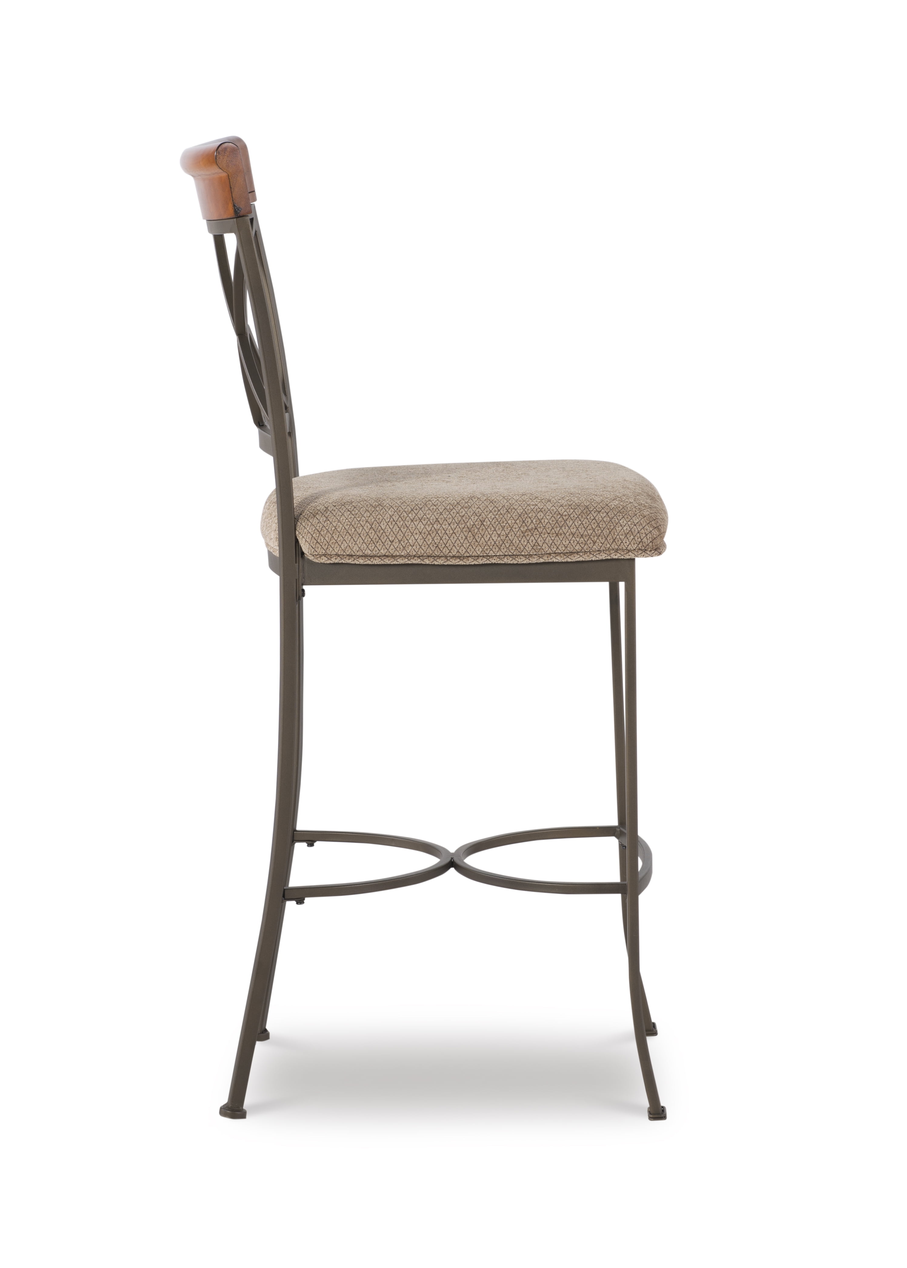 Seat Height 29″ Seat upholstered in a diamond pattern taupe/beige fabric – 100% polyester Brushed Faux Medium Cherry Wood Matte Pewter and Bronze Metal Some assembly required Assembled Dimensions: 19″ W x 22.565″ D x 44.45″ H Weight Capacity: 250 lbs Ships in one box For indoor use only