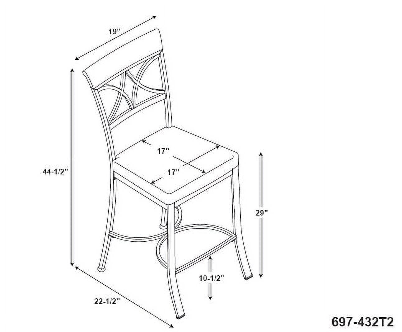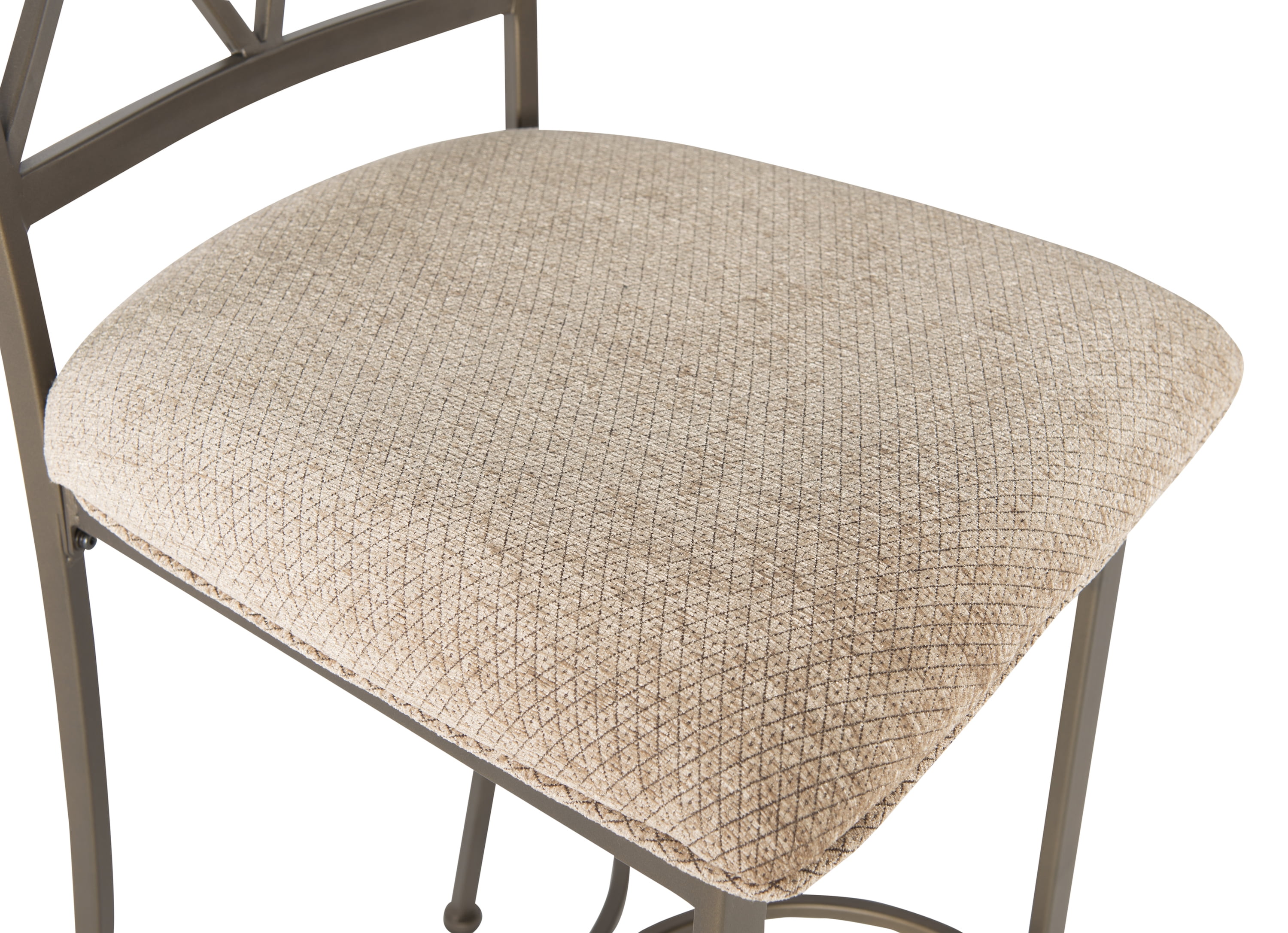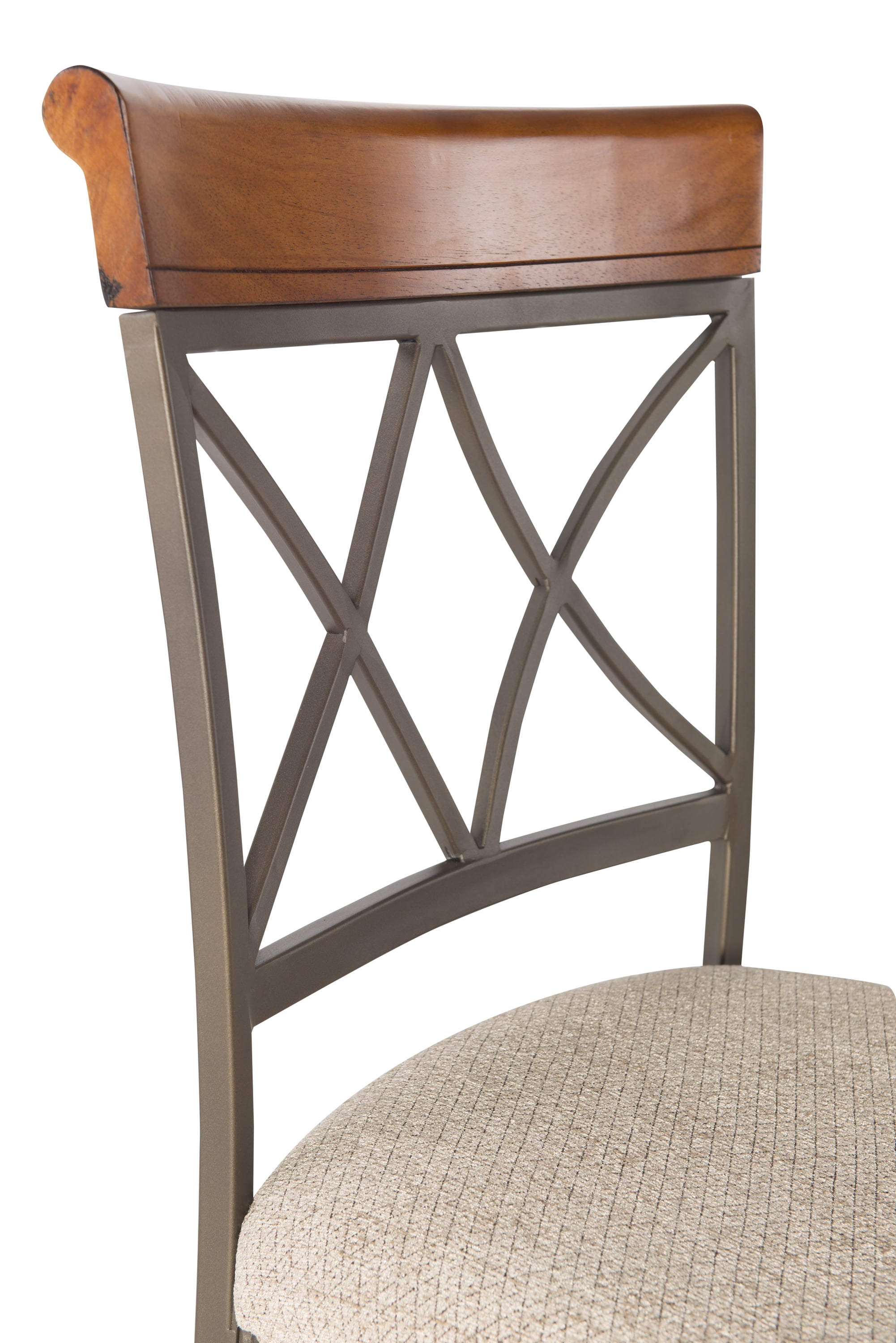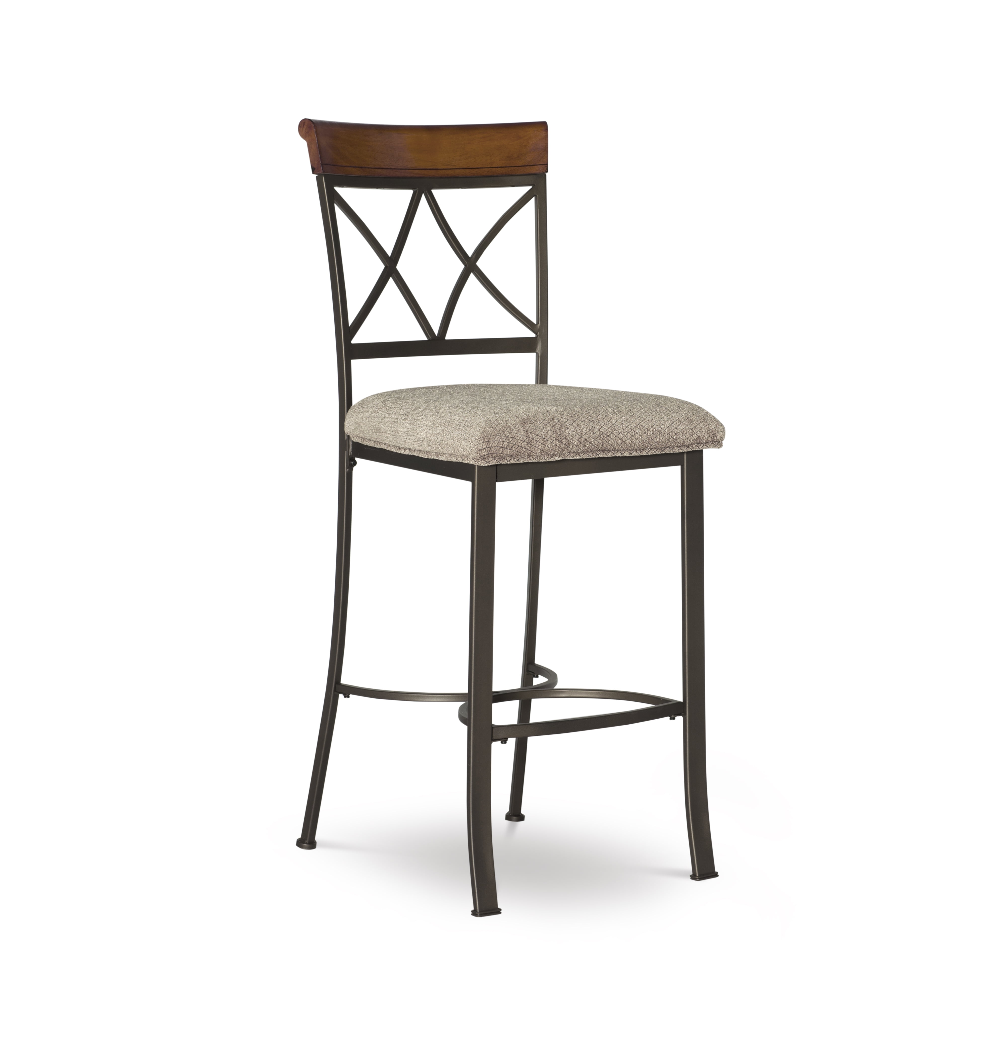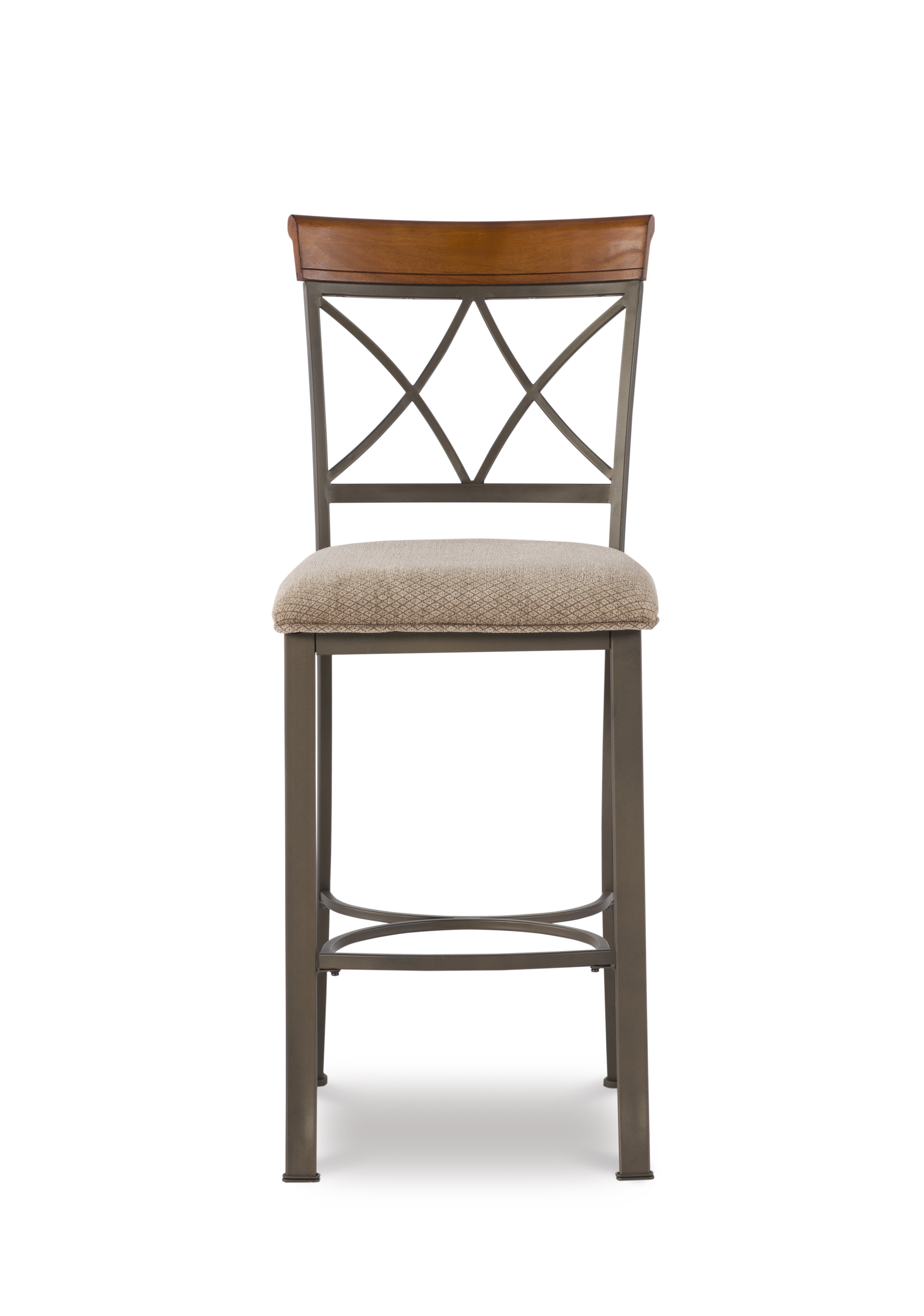 Seat Height 29″ Seat upholstered in a diamond pattern taupe/beige fabric – 100% polyester Brushed Faux Medium Cherry Wood Matte Pewter and Bronze Metal Some assembly required Assembled Dimensions: 19″ W x 22.565″ D x 44.45″ H Weight Capacity: 250 lbs Ships in one box For indoor use only