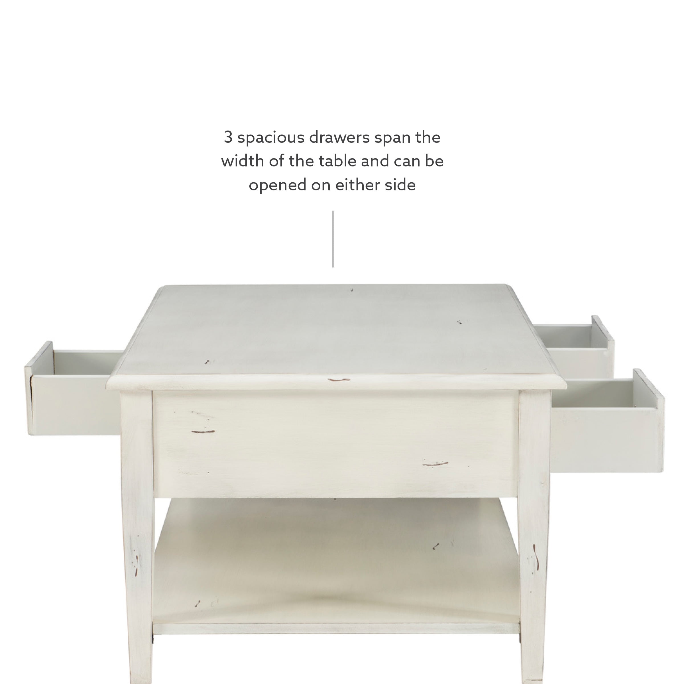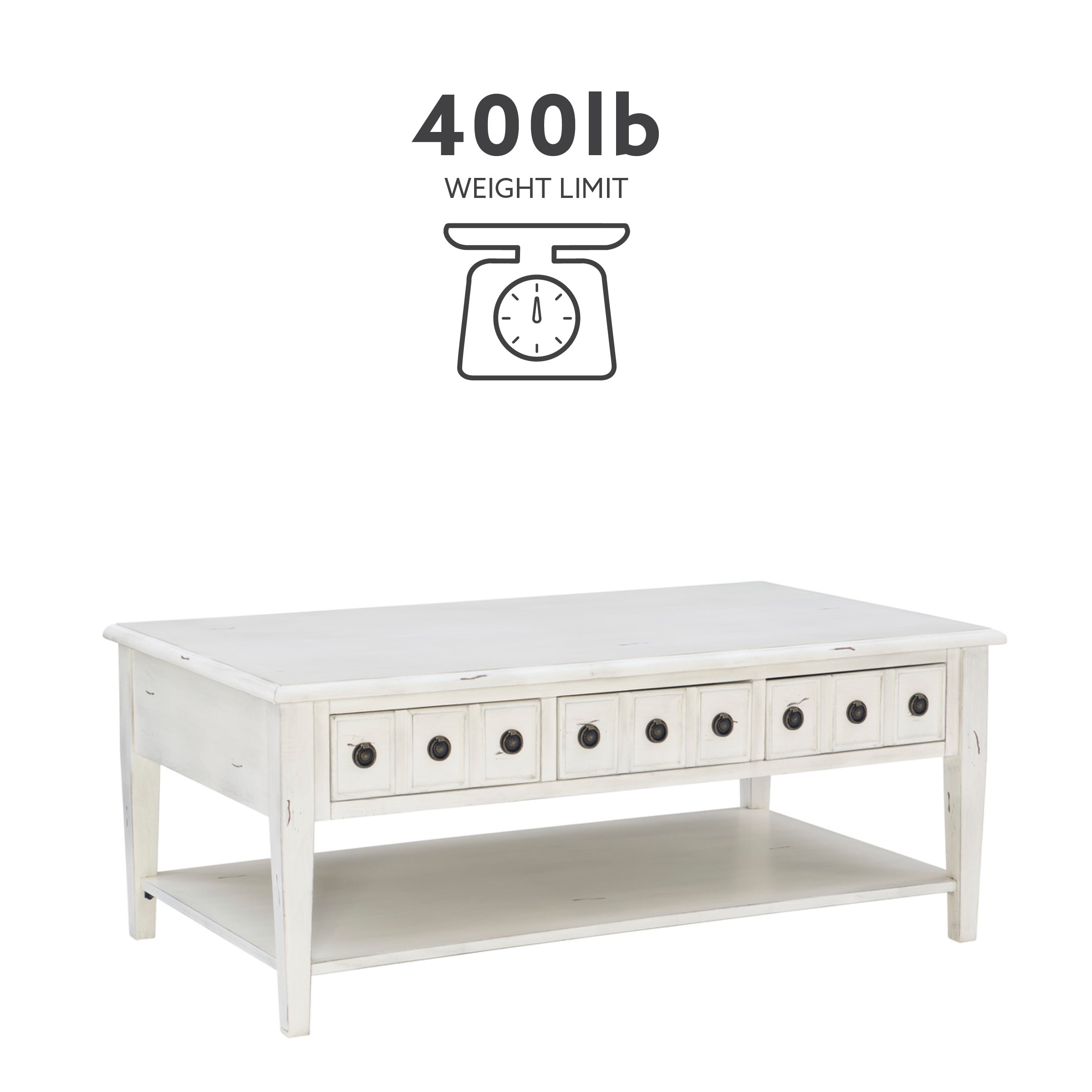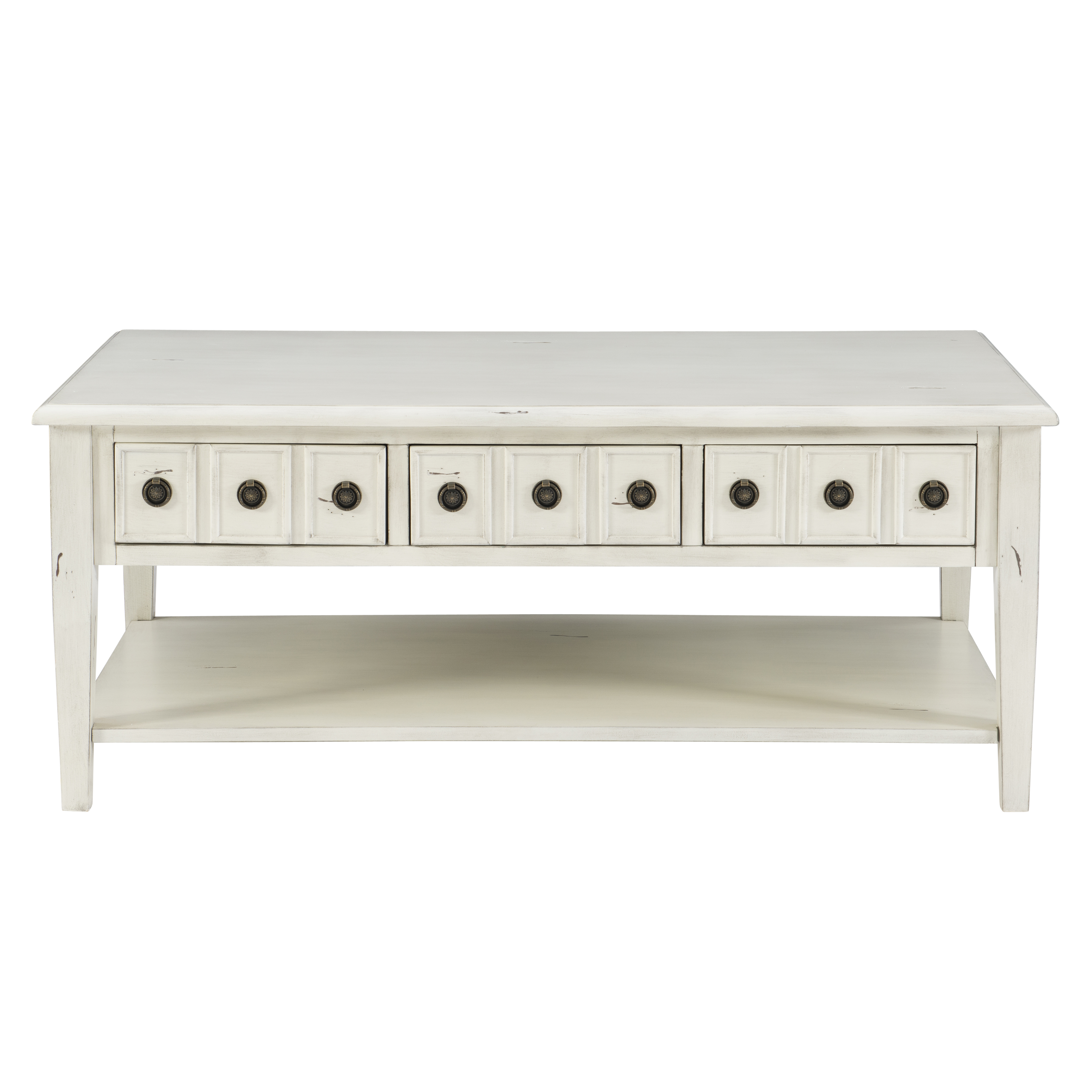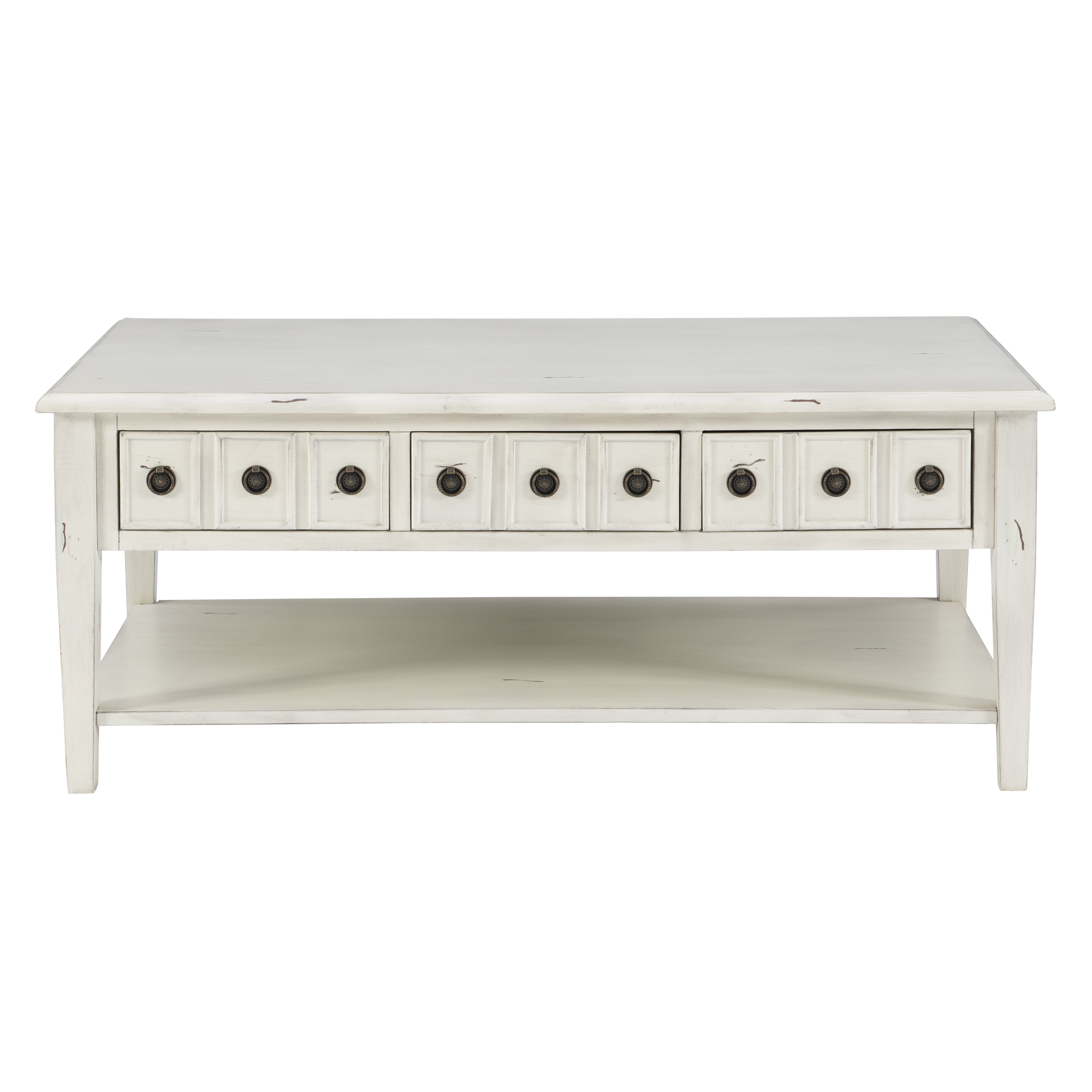 Powell Sadie 3-Drawer Coffee Table with Shelf, Cream Three spacious drawers span the width of the table and can be opened on either side Distressed cream finish provides vintage look that agrees with a wide variety of decor Large open bottom shel, great for storing items you’d like to keep readily accessible Round metal drawer pulls in antiqued bronze offer stylish accent and ease of use Top supports up to 400 lbs, bottom shelf supports 100 lbs each, drawer supports 10 lbs Arrives with some assembly required Drawer interior dimensions: 11.88 w x 25.13 D x 3.5 H inches Assembled dimensions: 47.75 L x 28 D x 20 H inches Ships in one box