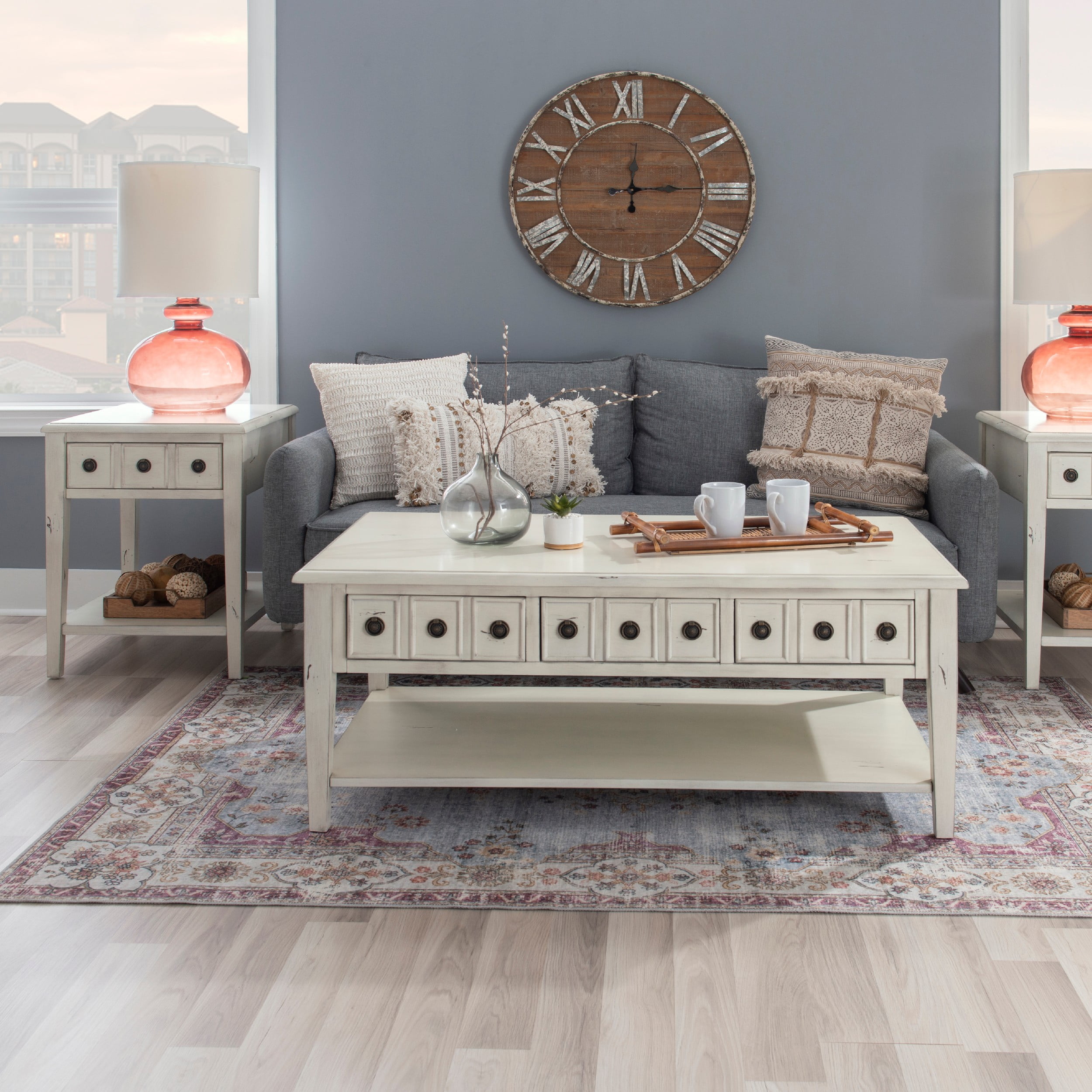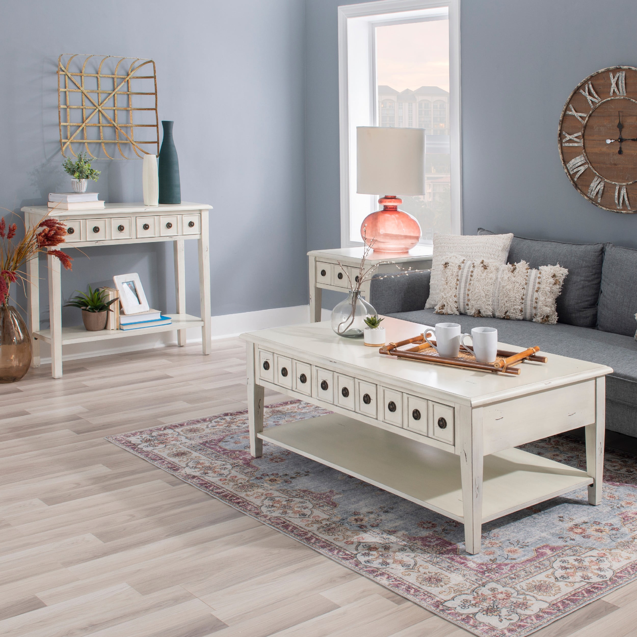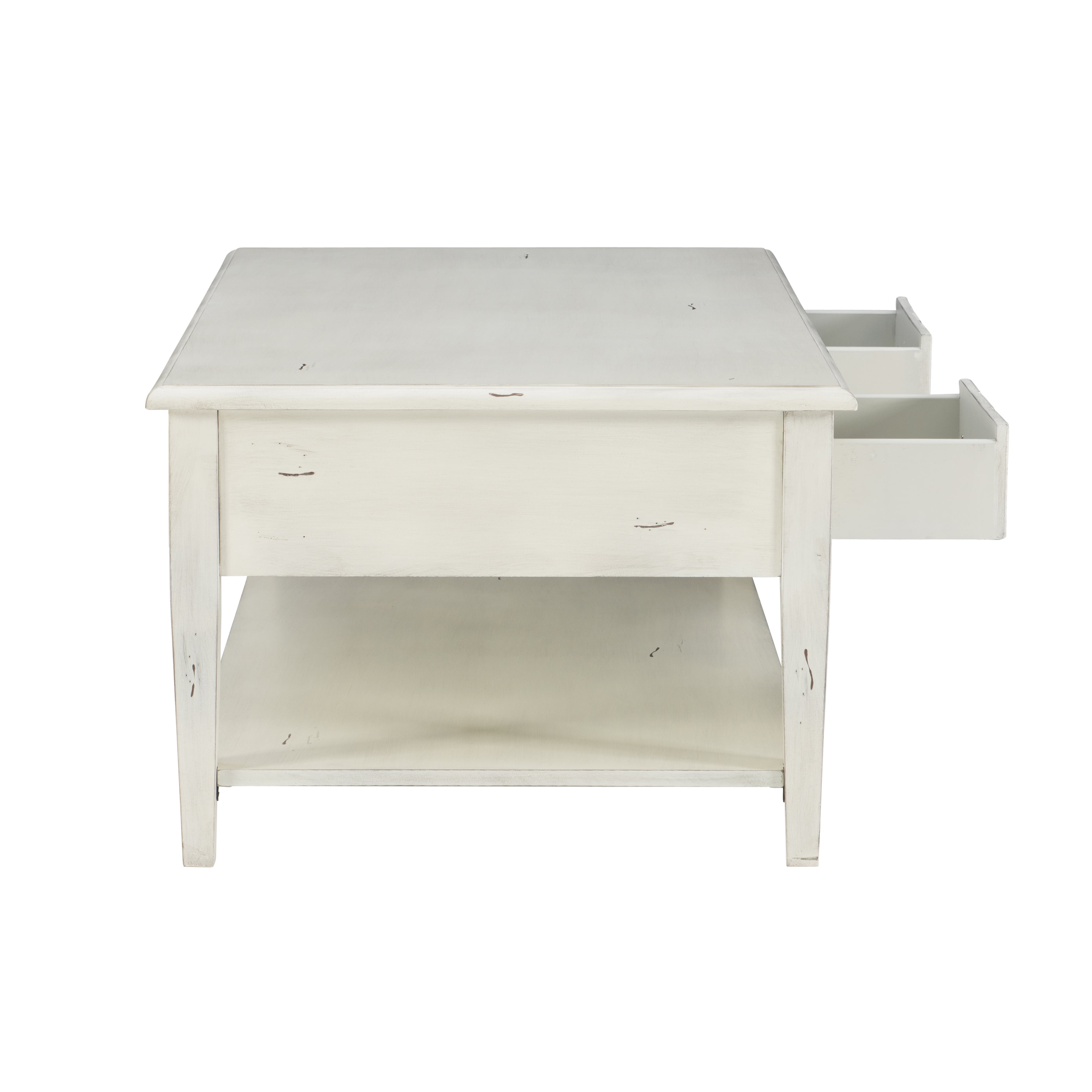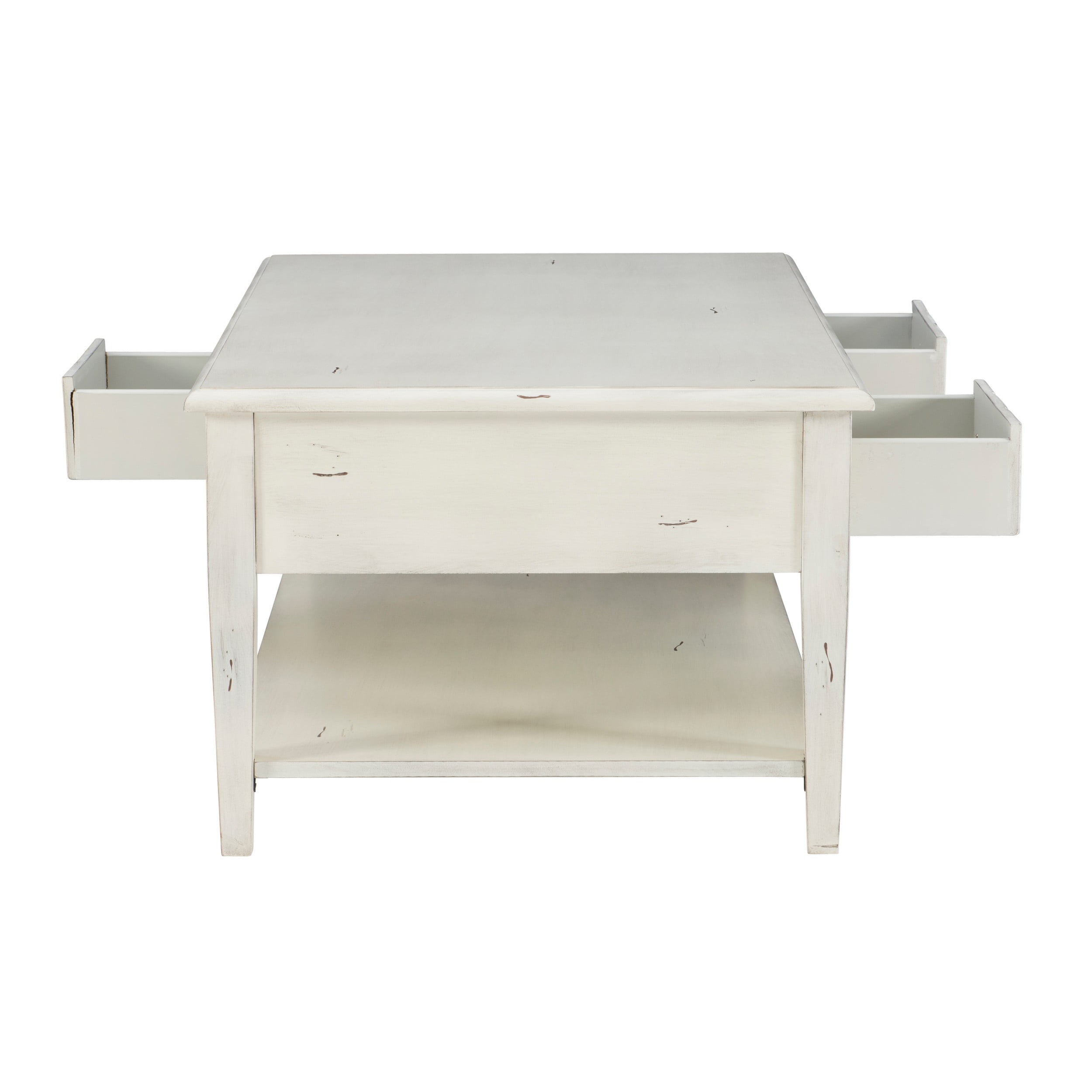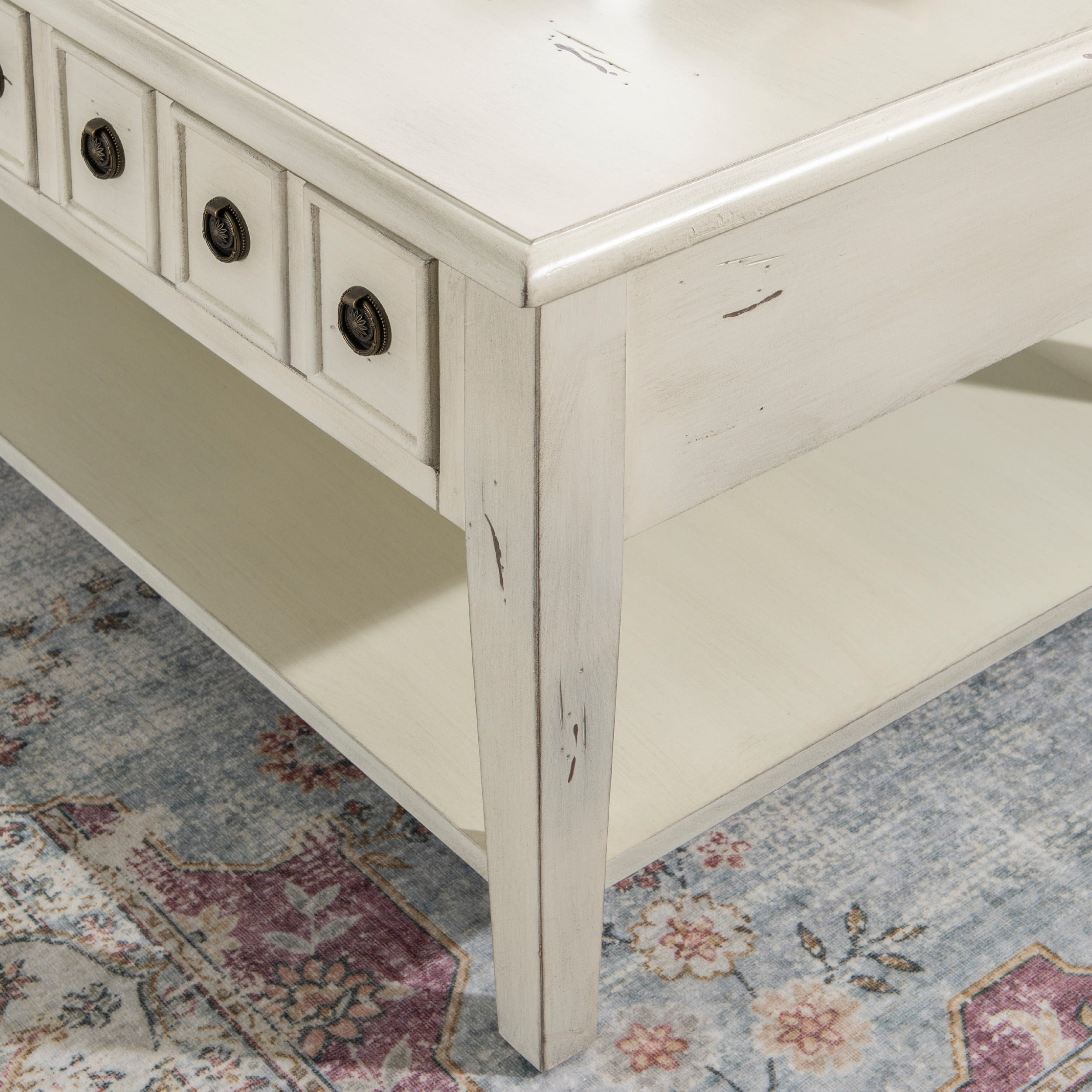 Powell Sadie 3-Drawer Coffee Table with Shelf, Cream Three spacious drawers span the width of the table and can be opened on either side Distressed cream finish provides vintage look that agrees with a wide variety of decor Large open bottom shel, great for storing items you’d like to keep readily accessible Round metal drawer pulls in antiqued bronze offer stylish accent and ease of use Top supports up to 400 lbs, bottom shelf supports 100 lbs each, drawer supports 10 lbs Arrives with some assembly required Drawer interior dimensions: 11.88 w x 25.13 D x 3.5 H inches Assembled dimensions: 47.75 L x 28 D x 20 H inches Ships in one box