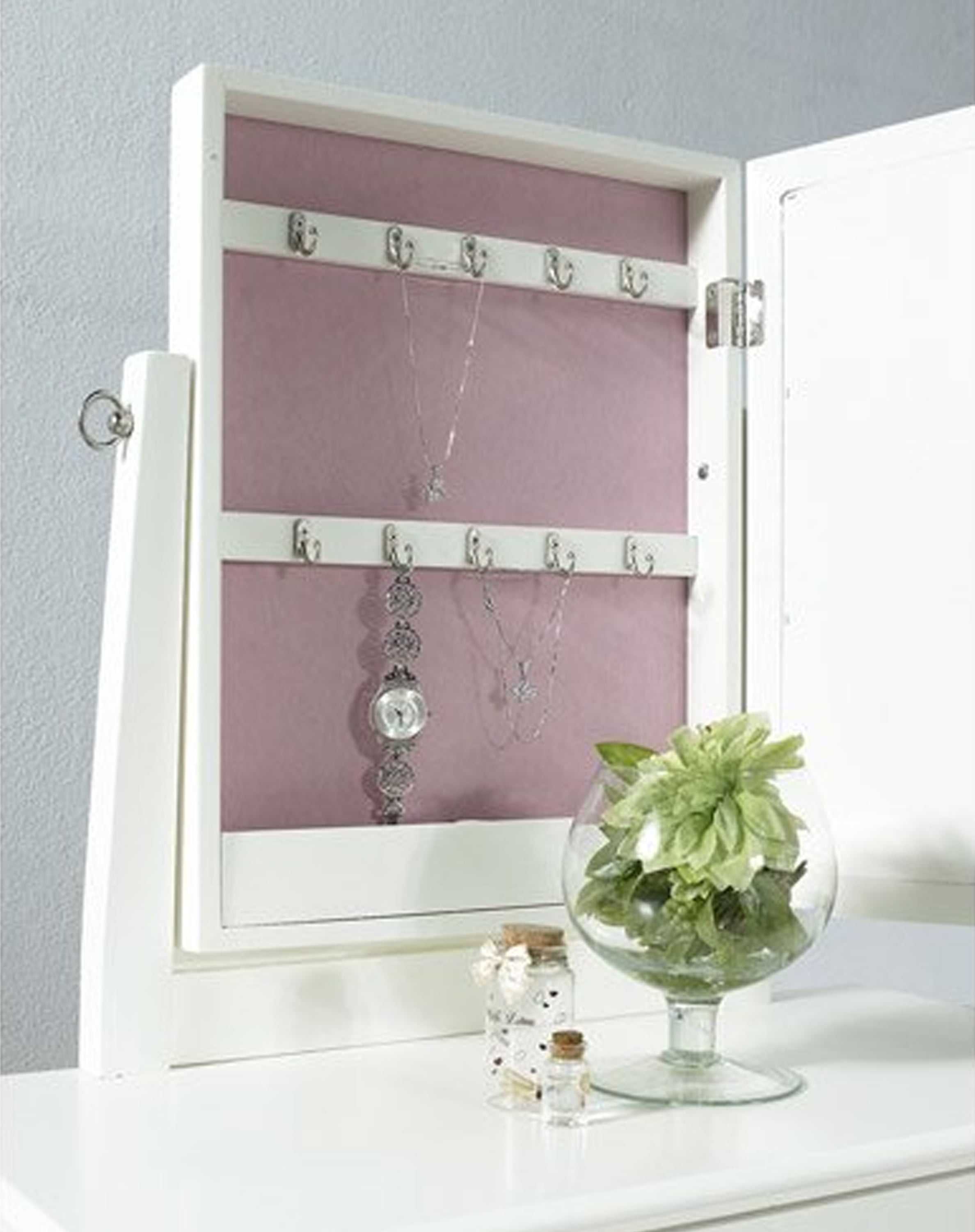 With a revolving mirror, jewelry storage and an upholstered bench, the Powell Vera Youth Vanity Set with Mirror and Bench is ideal for older girls and teens. Made of wood construction, this White Vanity Set with Jewelry Storage will provide durability, functionality and classic elegance fit for a princess. The bench features pink microfiber upholstery that’s comfortable and easy to clean. The mirror swivels to reveal a hidden jewelry compartment that can be used for storage and special treasures. The vanity drawer contains additional storage space for beauty supplies and jewelry; generously sized at 19.5 W x 9.375 D x 3 H inches.