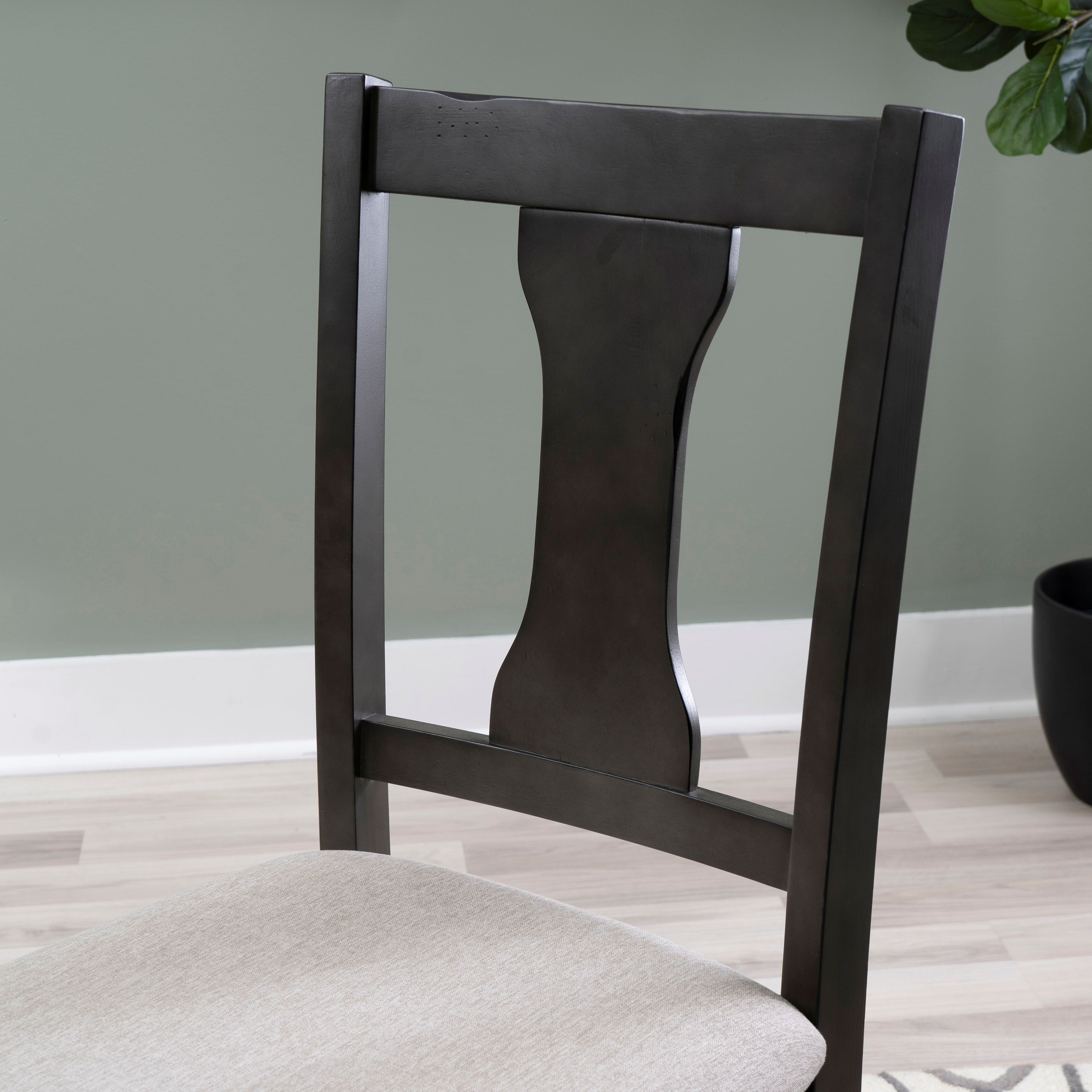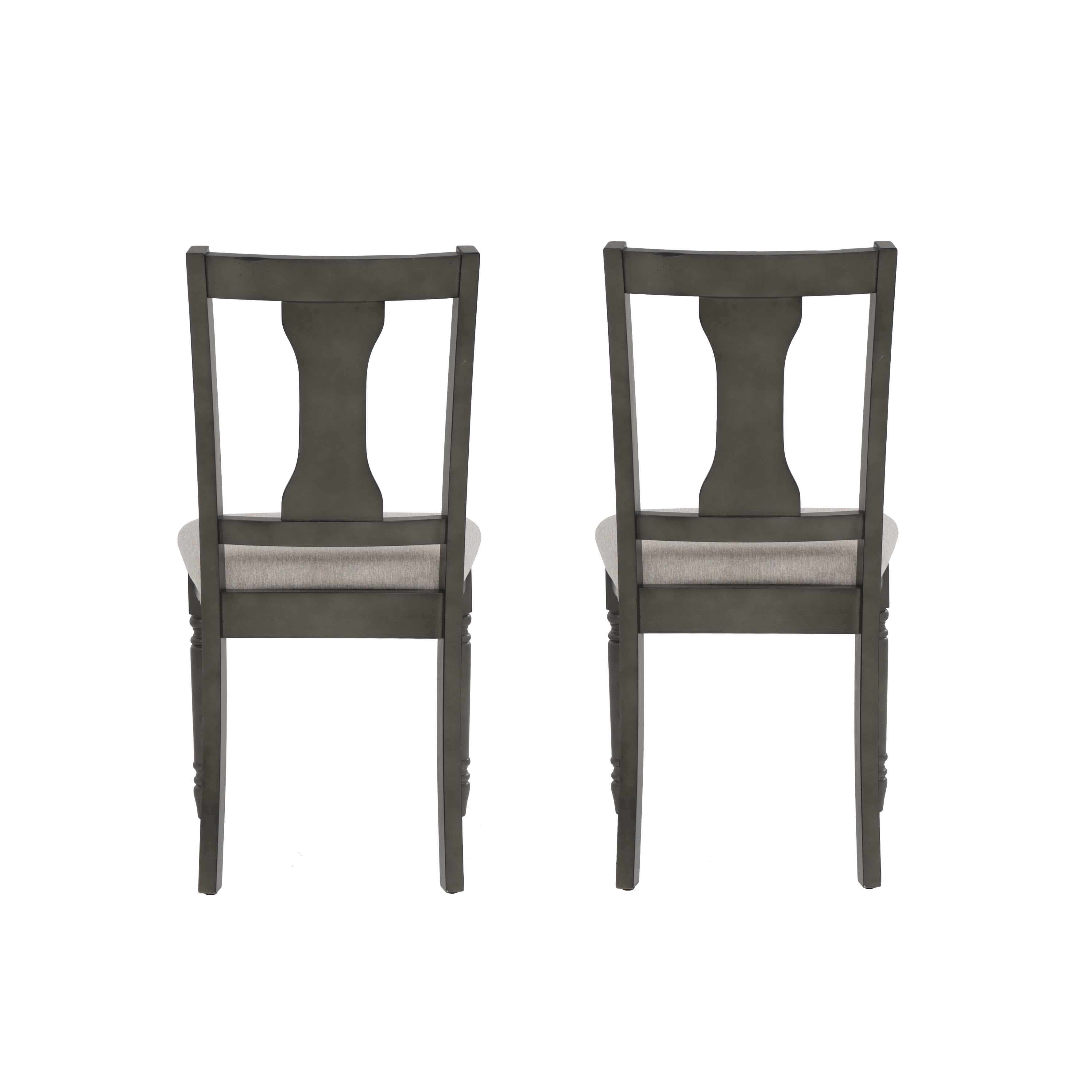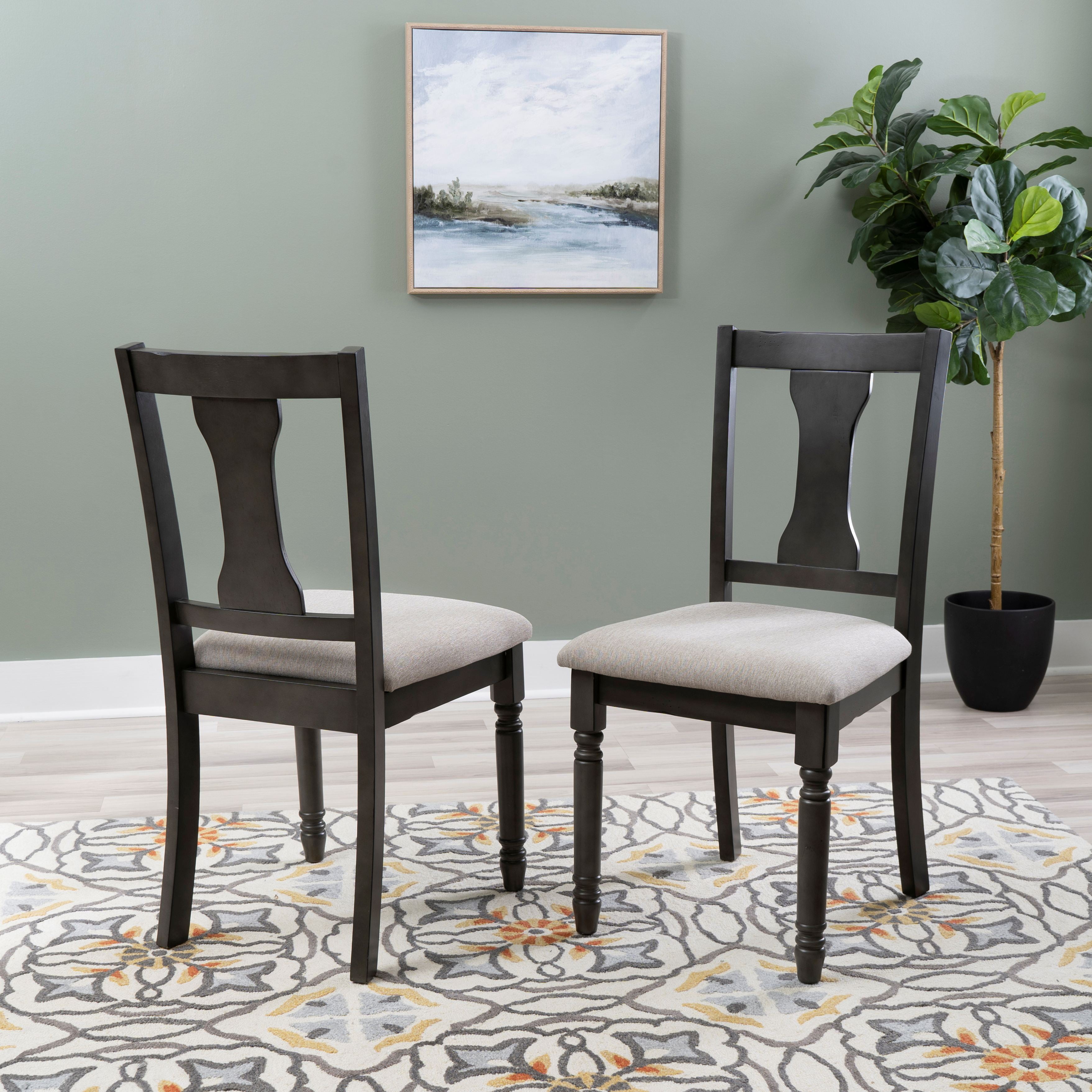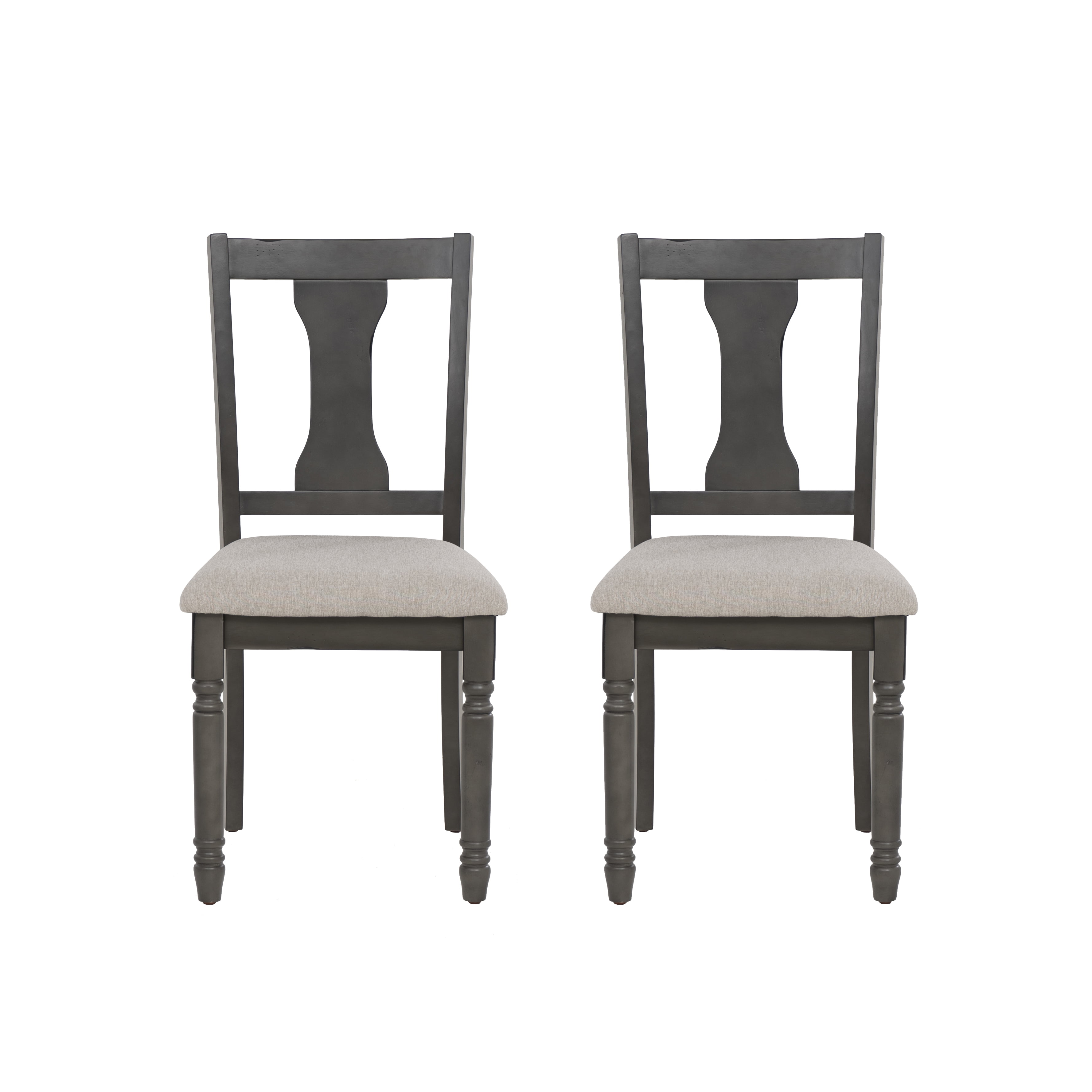 Light grey stain resistant padded fabric seat Elegant hour glass back design Dark grey frame with glaze finish Solid wood construction Seat height: 19.5″ Seat dimensions: 18.5″w x 16″d; Weight capacity: 275 lbs Nice N Clean® performance fabric Two chairs included with purchase