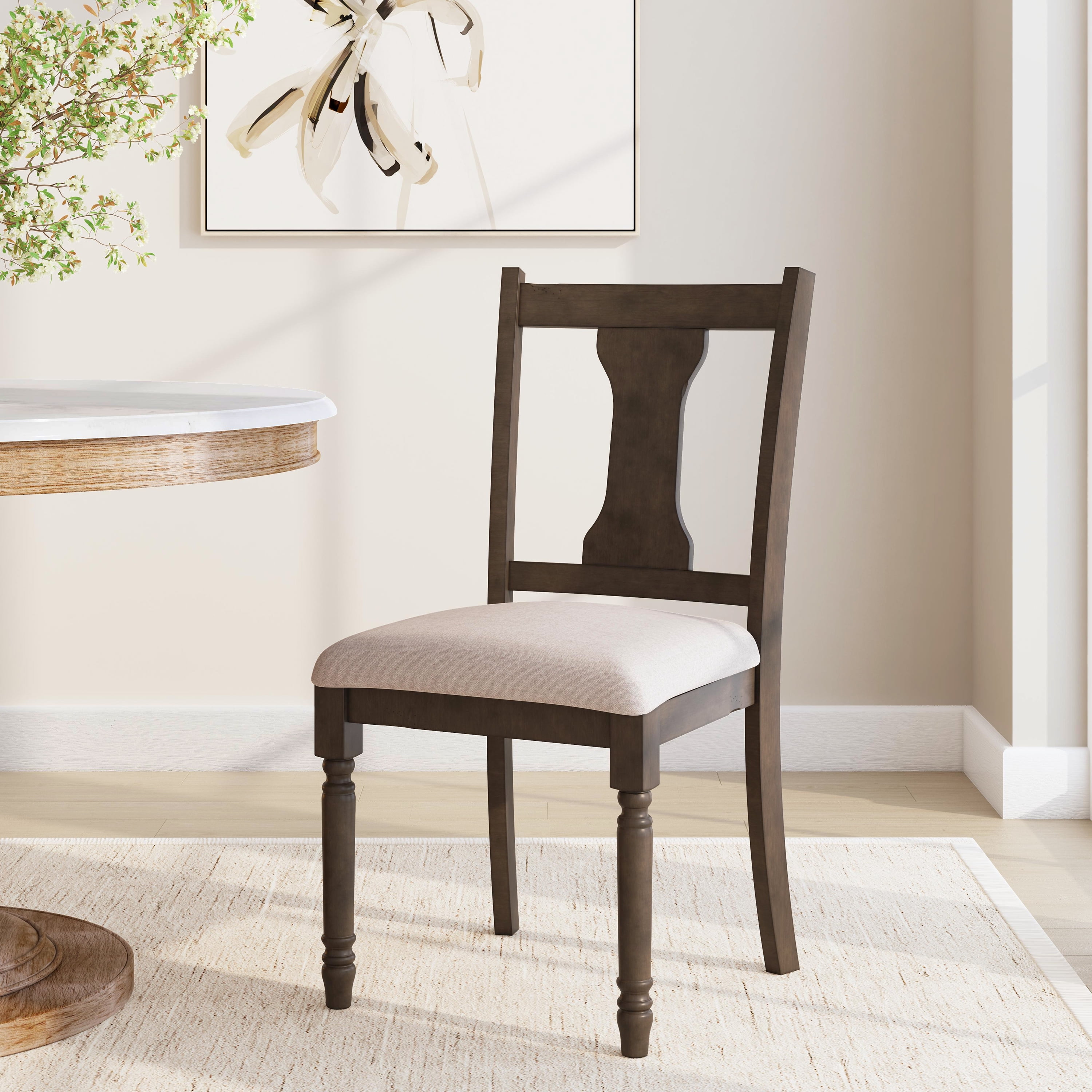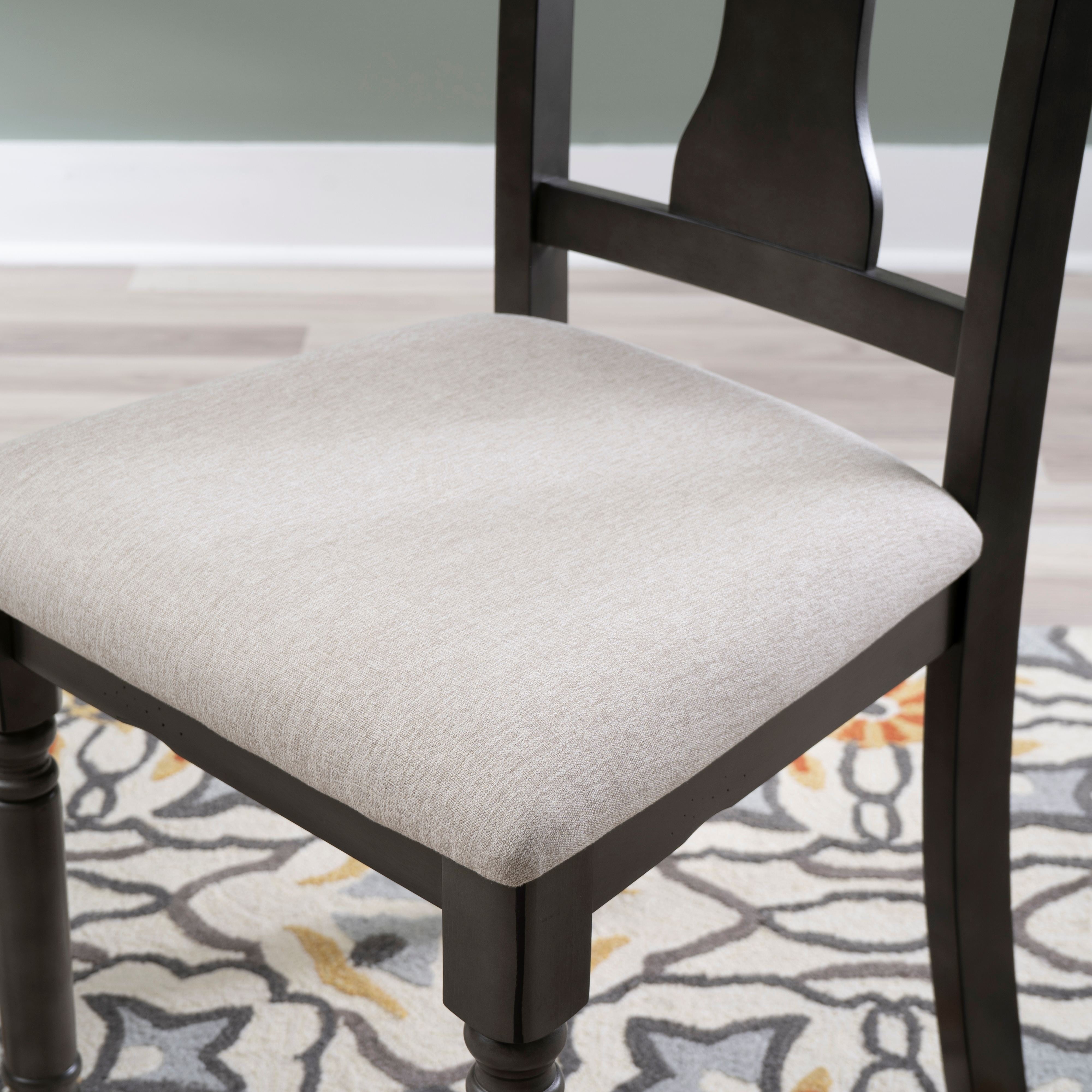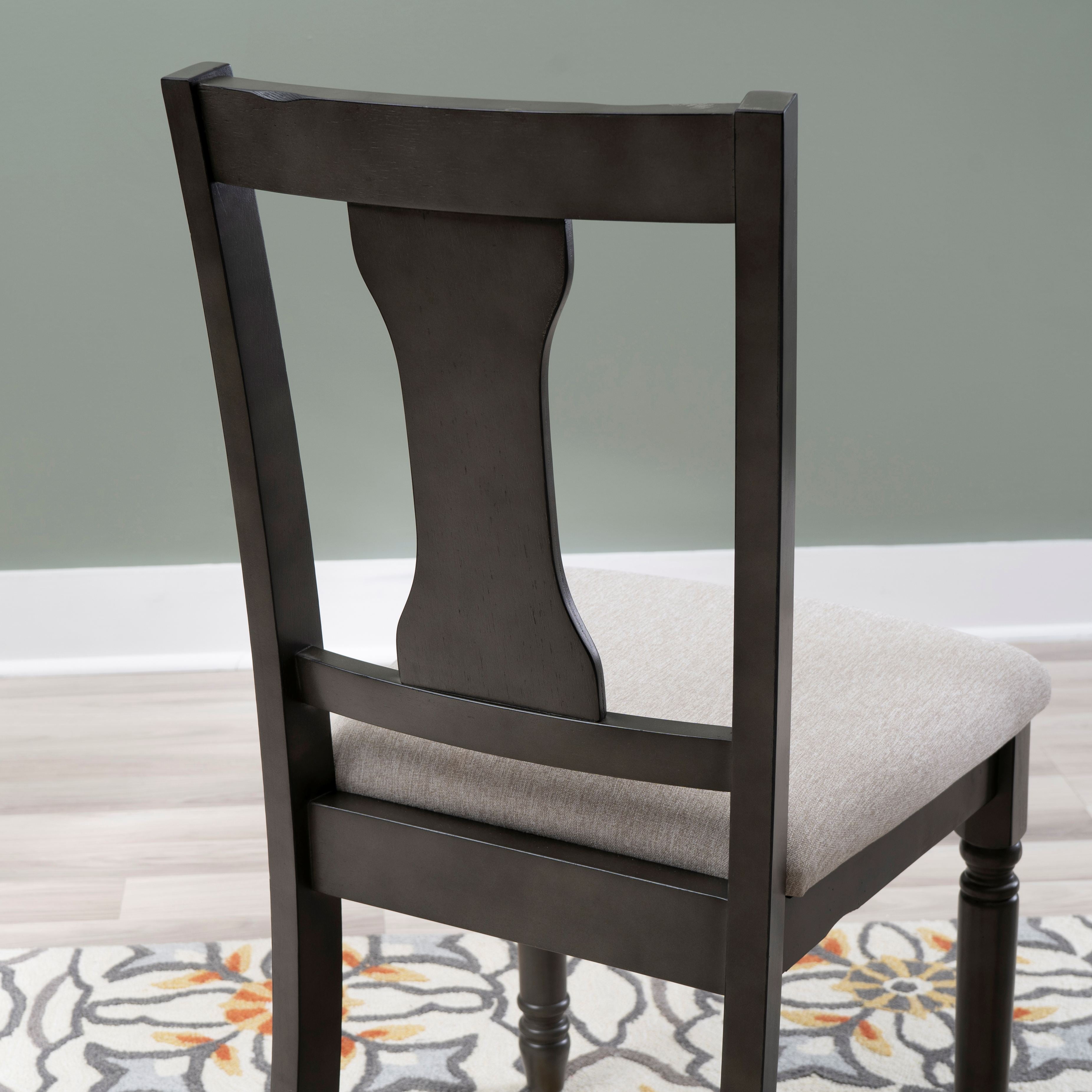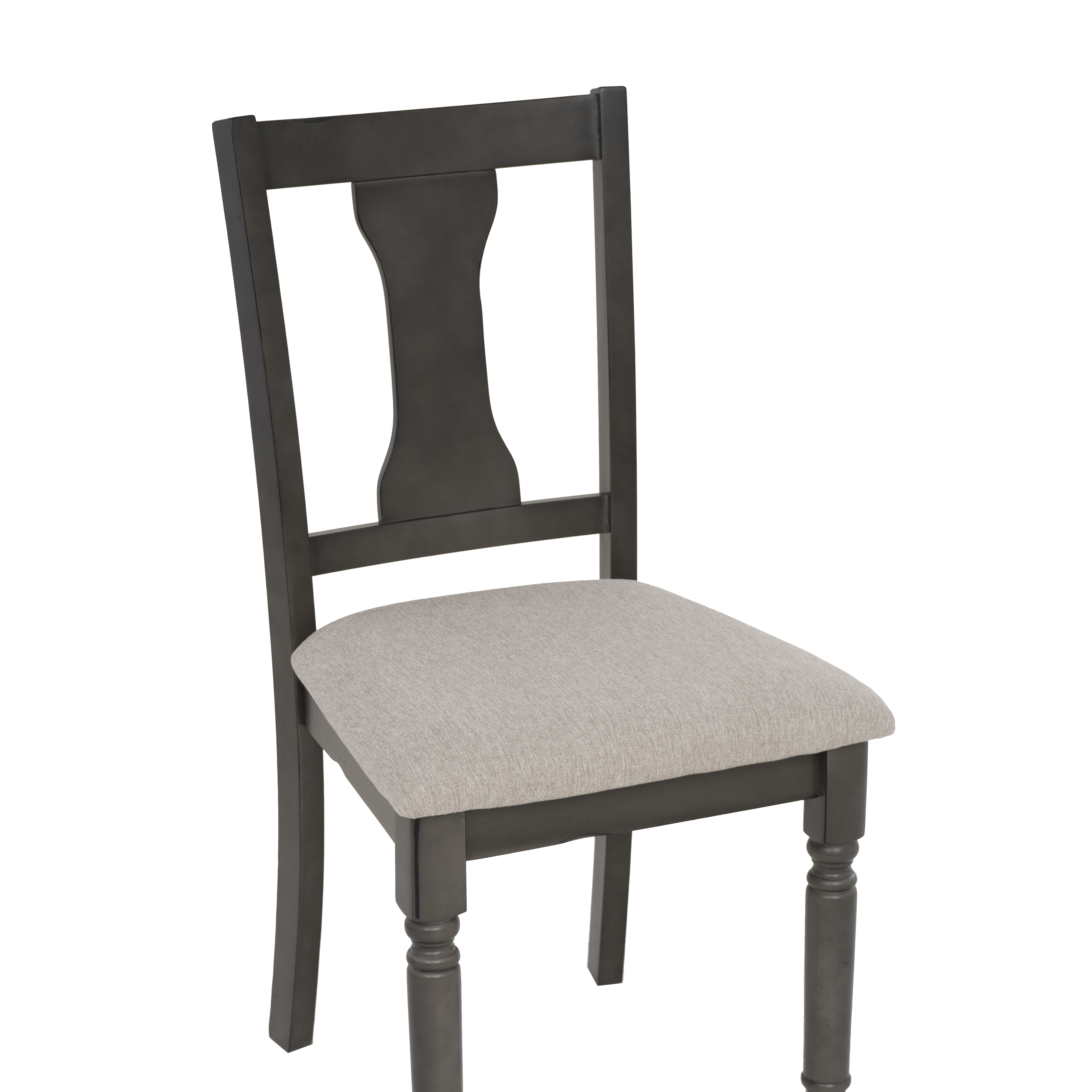 Willow Grey Side Chair Pull up to the table with this hour glass back chair with comfortable, padded seat with a foundation of solid rubberwood. The light grey seat is upholstered with Nice N Clean® fabric, a performance material that withstands the everyday wear and tear that come with any busy kitchen. Everyday spills, including coffee, ketchup, salsa and wine, clean up quickly maintaining the beauty of your investment. Sculpted, turned legs with a glaze finish add a farmhouse touch. Light grey stain resistant padded fabric seat Elegant hour glass back design Dark grey frame with glaze finish Solid wood construction Seat height: 19.5″ Seat dimensions: 18.5″w x 16″d; Weight capacity: 275 lbs Nice N Clean® performance fabric Two chairs included with purchase – Seat Height: 19.5″ – Seat Dimensions: 18.5″w x 16″d – Item Weight: 15.84 – Fabric Content: 100% Polyester – item H: 37.75 – item L: 19 – Fabric Color or Design: Light grey – Item D: 20.38