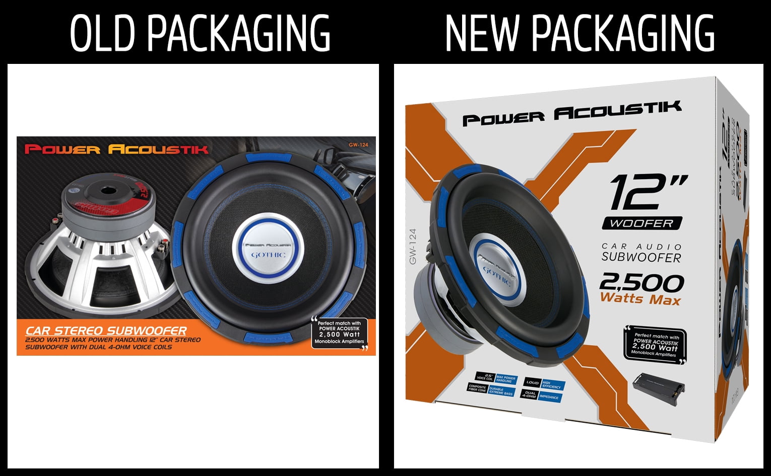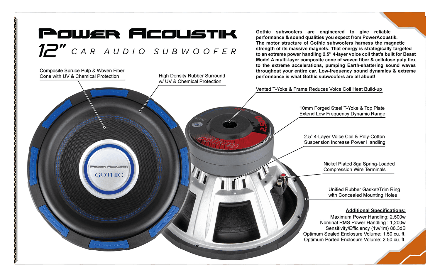 The New Power Acoustik GW-124: Premium Gothic Series 12″ Subwoofer takes your car audio to the next level! Rigid Cone: The rigid cone is constructed of composite fiber material with a polypropylene surface and surrounded by high-density foam Features a 2.5″ dual 4-ohm coil to provide an enjoyable listening experience Low-Tolerance Joint Adhesives: Comes equipped with low-tolerance joint adhesives to prevent thermal breakdown Maximum strength magnets provide dynamic performance High-excursion rubber surround for flexible movement 254-ounce motor volume and 1200 watts of RMS power to handle intense amounts of volume power and give you great bass! dB efficiency of 83.6 and compatibility with many car stereo systems Pair with multiple speaker units (sold separately)