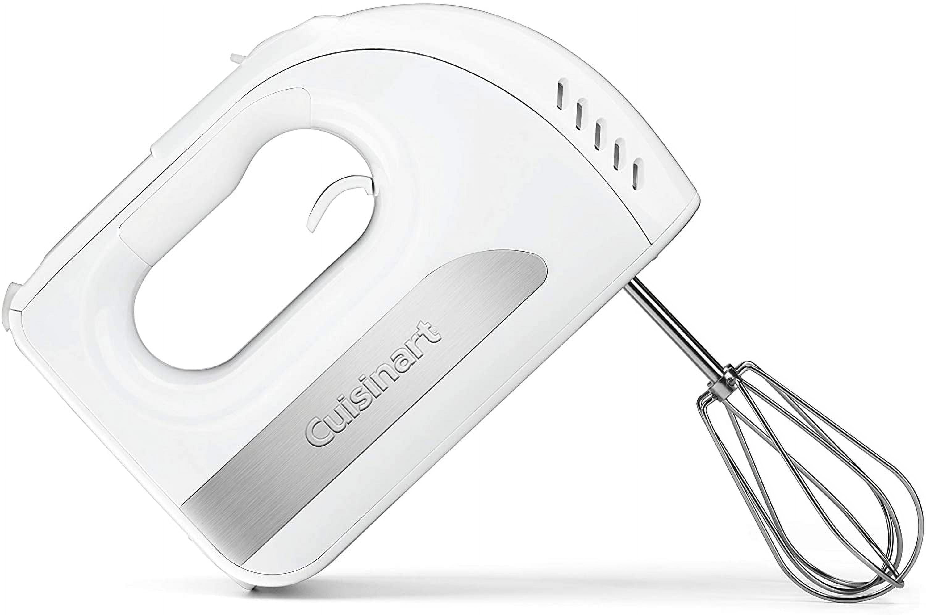 Cuisinart picks up the power with this 6-speed hand mixer. 250 watts easily powers through batters and dough, and six speeds win it high marks for versatility. Users can slowly fold dry ingredients into wet without splatters, then turn up the speed to whip up meringues and cream. When the job is done, the extra-long beaters get ejected with the push of a lever and go right into the dishwasher for easy cleanup. With its soft handle and unique center cord, this mixer is a pleasure to work with, start to finish!