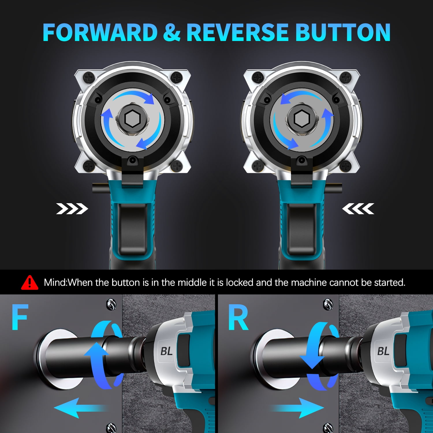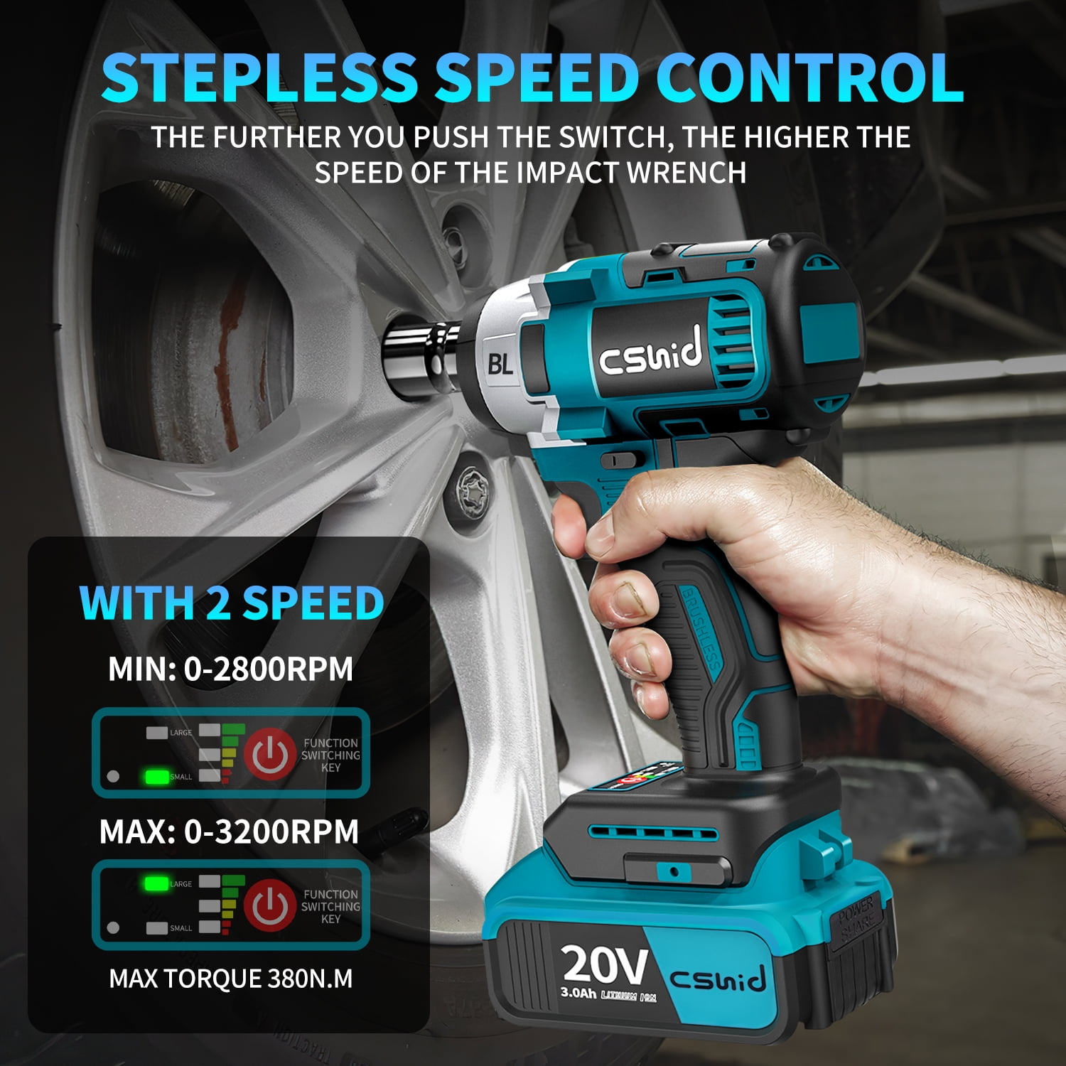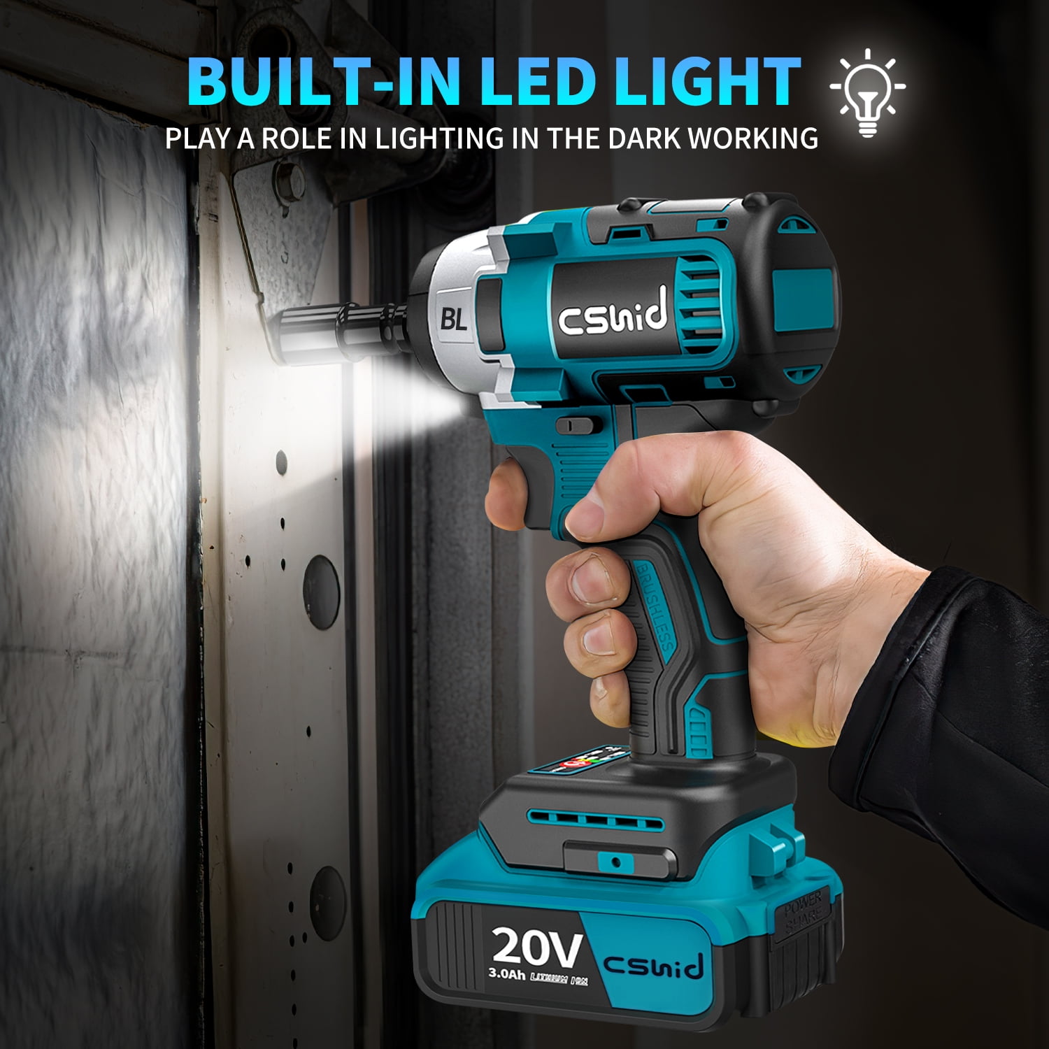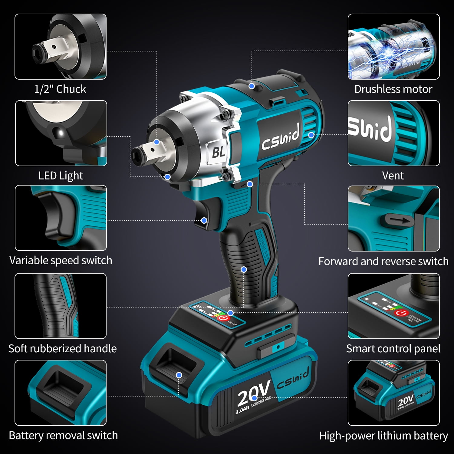 【Upgrade Brushless Motor】Cshidworld brushless battery impact wrench, compared to traditional brushed motors, the brushless motor wears less, which means the internal parts are healthier and more durable, reducing maintenance costs. The powerful brushless motor of the 1/2 impact gun will reduce energy loss, and provide more stable power output. Impact wrench 1/2 cordless provides maximum productivity when tightening or removing nuts, no smoking or spark! 【The Premium Brake-stop】Cordless impact wrench is equipped with an advanced braking system, providing more precise speed control and faster stopping response. In particular, the brake is activated in reverse mode, slowing down the speed of the impact wrench and reducing the risk of accidental injury during use. The design of the brake-stop system makes the impact gun easier to use and ensures a more efficient and safer experience for users of different skill levels. 【2 Adjustable Speeds & Self-stop】The bottom switch of this electric impact wrench can set two speeds of 0-2600/3200RPM. Clockwise or counterclockwise rotation can be achieved by adjusting the side keys to meet your different needs. Just press the button lightly, and the impact wrench will control the precise impact speed range for you, allowing you to achieve safe, fast, and precise control. I believe this function will make you more comfortable in various usage scenarios! 【3000 in-lbs High Torque】20Volts Cordless impact wrench 1/2 inch delivers a maximum torque of 3000 in-lbs and an impact force of up to 3000 RPM. High torque means faster tightening and easier removal. Whether for tire replacement, bolt removal, or assembly work, a high-torque electric impact wrench completes the tightening or removal task with outstanding speed, saving you valuable energy. The impact gun is an absolute beast! 【Lightweight & Ergonomic】1/2 impact gun not only offers excellent functionality but also prioritizes the user’s comfort experience. The handle contour design of this impact driver allows for a better grip on the Kimo tool. Combined with its lightweight of just 3.9 lbs, it reduces discomfort and pressure on your hands. There is no doubt that a Kimo impact wrench can alleviate the tiredness you may feel after using it for a long time. 【LED Light For Any Scene】The LED light is built into the impact drill and is carefully designed to project light to the area where you need to operate, eliminating the need for additional handheld lighting devices. This makes the impact wrench 1/2 cordless perfect for a variety of dim spaces. Besides, it has a broad range of applications, whether, in automotive maintenance, industrial assembly, construction, or home repairs, the impact wrench 1/2 makes the job more reliable and precise.