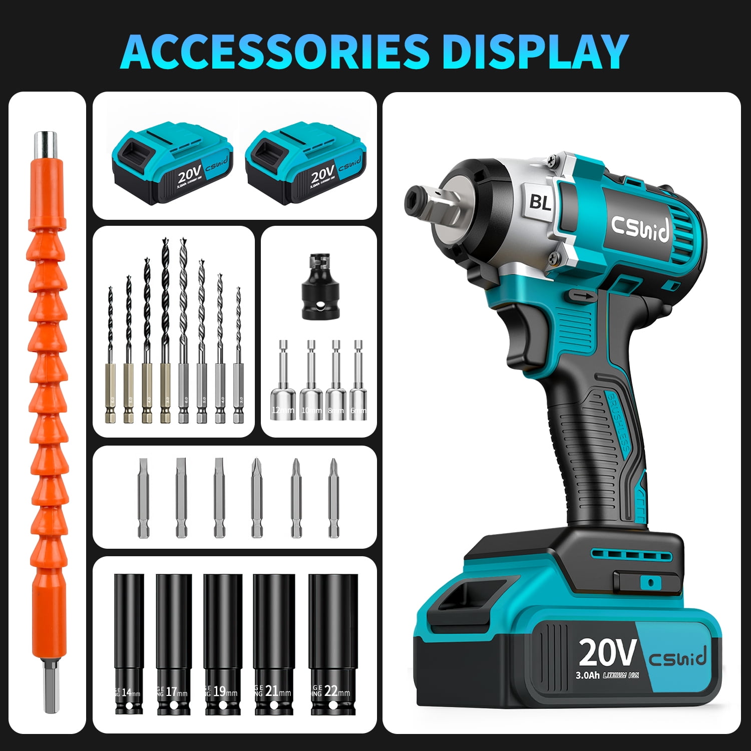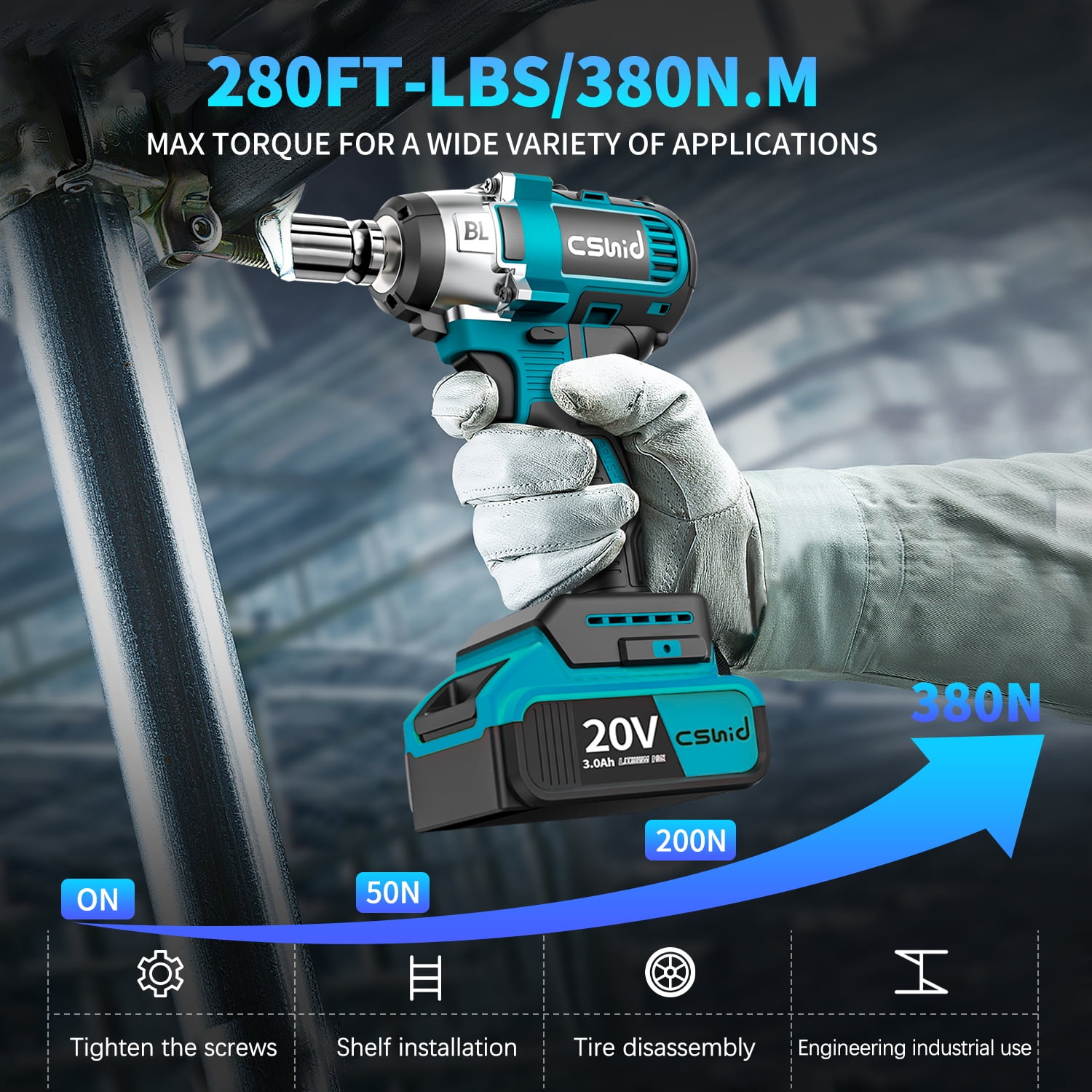 Powerful Motor By removing rusted-on or excessively tightened nuts and bolts, this 1/2 impact wrench, which has a high-end, strong motor, offers maximum productivity. Maximum torque for tightening is 330 ft-lb (380N.m). Two Directions & Brake-stop This impact wrench can cooperate with locking protection, forward and reverse Mode. In reverse mode, once the nut or bolt is loosened, the brake stop device will activate and reduce speed and torque to protect the nut from flying into nowhere to catch. 380N.m High Torque & Variable Speed Cshidworld 20V impact wrench delivers 280ft-lbs (380Nm) max torque. You don’t have to worry about not being able to control the speed accurately. There are 2 speed selection(0-2600RPM/0-3200RPM) at the bottom of the wrench, which can help you work at the right occasion at the right speed. Tool speed can increase by increasing the pressure on the switch trigger. Elaborate Design&Easy Maintenance The strap on the side of the brushless wrench and the toolbox are easy to carry when working outdoors. The soft all-rubber handle can reduce fatigue during work. In addition, this wrench is equipped with LED lights, work can also be done in low-light environments. The brushless wrench does not generate heat or sparks during use, which is convenient for maintenance and does not need to replace the carbon brushes. Wide Application In addition to being effective for changing tires of various vehicles, this impact gun may also be used for heavy equipment maintenance, significant building projects, product assembly, and automotive repairs, etc. Product Specification: -Brushless Motor: Torque 280 ft-lbs and 3200 RPM.? -2 Variable Speed Trigger: Speed Control is in your hands. -Premium Brake-stop: Helps prevent over-loosening and fastener run-off.? -On-tool LED work light: illuminates dark workspaces. Package Include: 1 x 1/2″ Cordless Impact Wrench 2 x 3.0A Batteries 1 x Charger 5 x Impact Sockets 8 x Drill 6 x Screws 1 x 1/4-inch hex adapter 1 x Carry Box