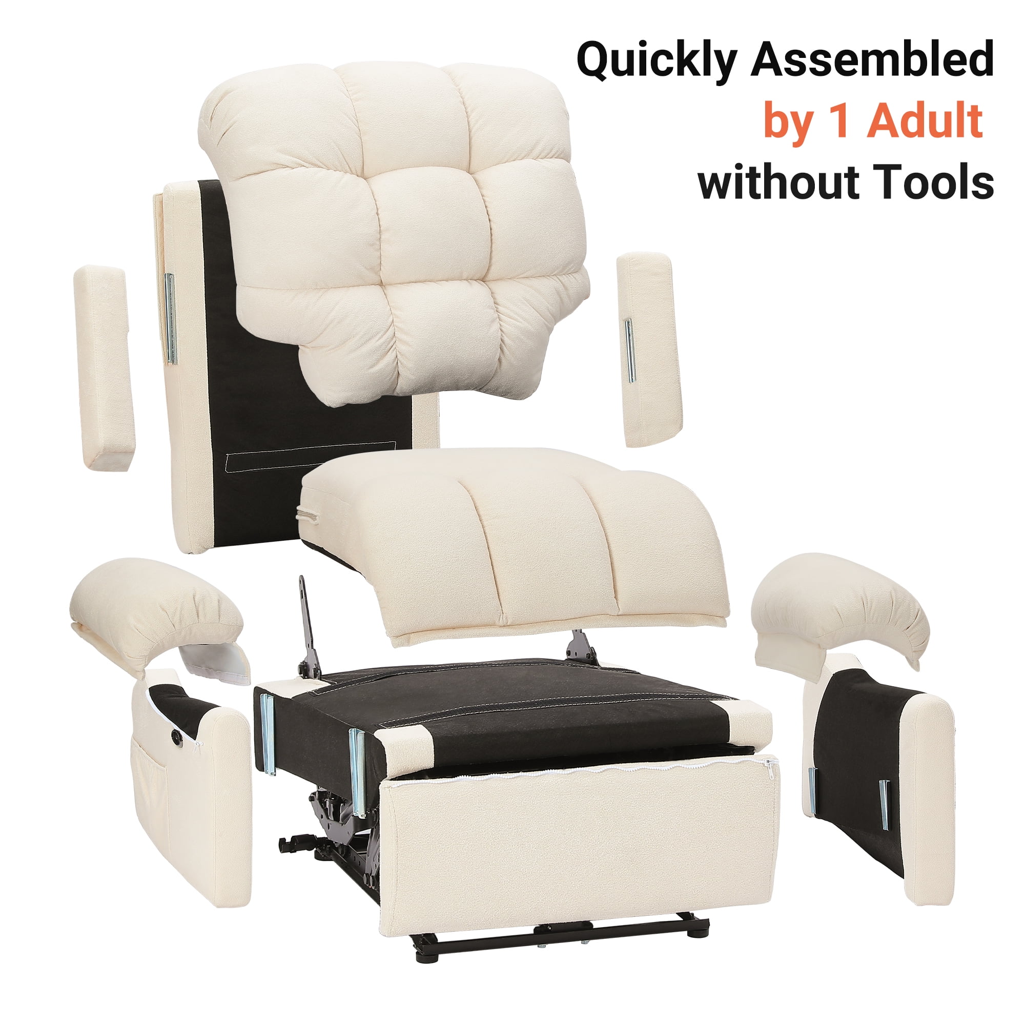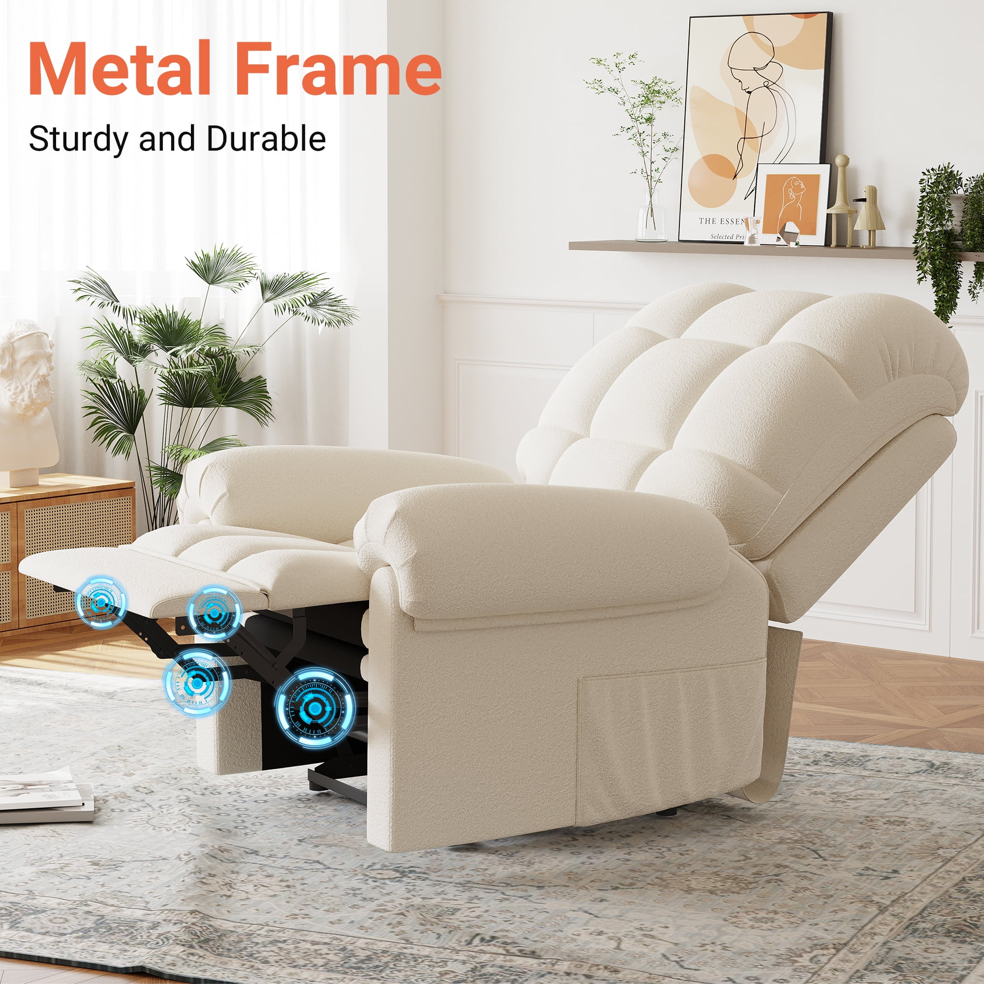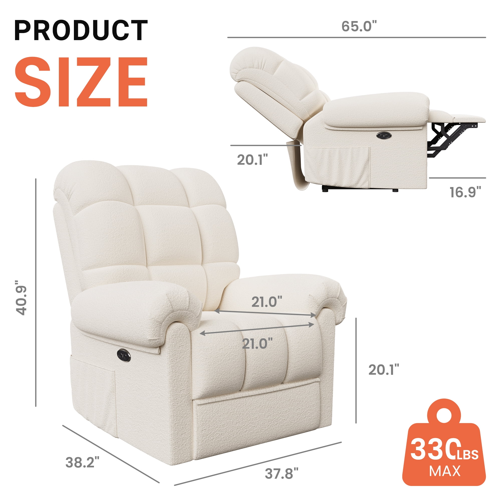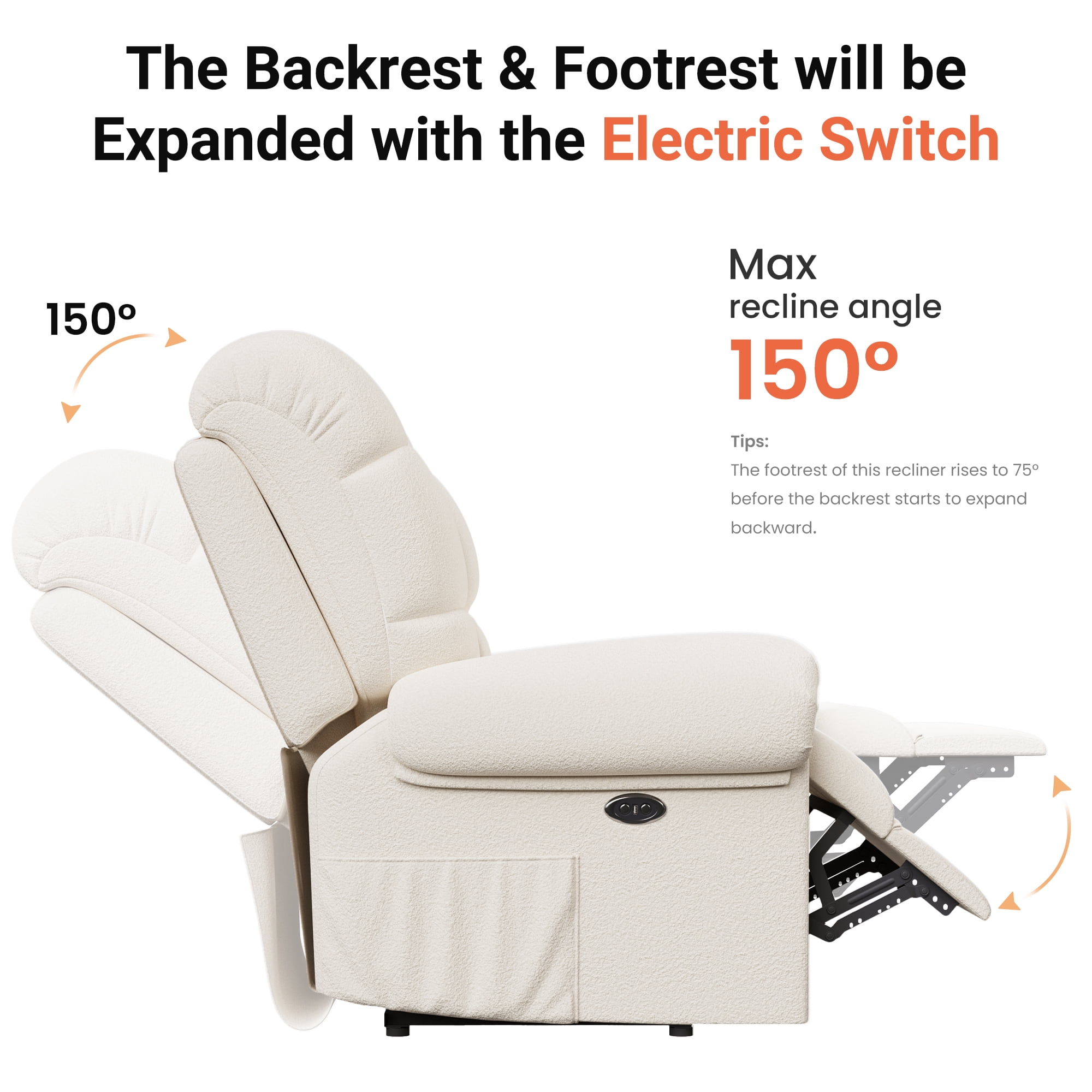 ????[Sitting On a Cloud] Elevate your comfort to cloud nine with our Electric Recliner! Designed for modern relaxation, this Recliner Chair boasts a plush Teddy Fleece material that envelops you in luxury. Experience ultimate relaxation with adjustable 75-150° reclining, ergonomic armrests, and a footrest that make lounging a breeze. Feeling as soft as a cloud with every sit. ????[Tool-Free Setup Enjoy] The tool-free setup ensures hassle-free assembly, while the low noise operation creates a serene ambiance. Enjoy the convenience of our USB Charging Port feature, allowing you to stay connected while unwinding. ????[Experience personalized comfort] The adjustable backrest and cloud back design of our Recliner. The maximum weight capacity of 330 pounds ensures sturdy support for adults. With storage pockets and a modern design, this chair is the perfect blend of functionality and style for your office, bedroom, living room, or nursery. ????[Complement Your Space’s Aesthetic] The Recliner’s cloud style Back and pillow top arms design provide excellent back and arm support, making it ideal for extended lounging sessions. The hard floor surface recommendation ensures seamless placement in any room. Choose from Off-white, Coffee, or Blue Grey color options to complement your space’s aesthetic. ????[Ultimate enjoyment] Invest in quality relaxation with our Recliner’s special features, including armrests and power reclining functionality. Treat yourself to a cozy retreat with this Adjustable Recliner that caters to your relaxation needs. Unwind in style and comfort with the epitome of modern luxury and functionality.