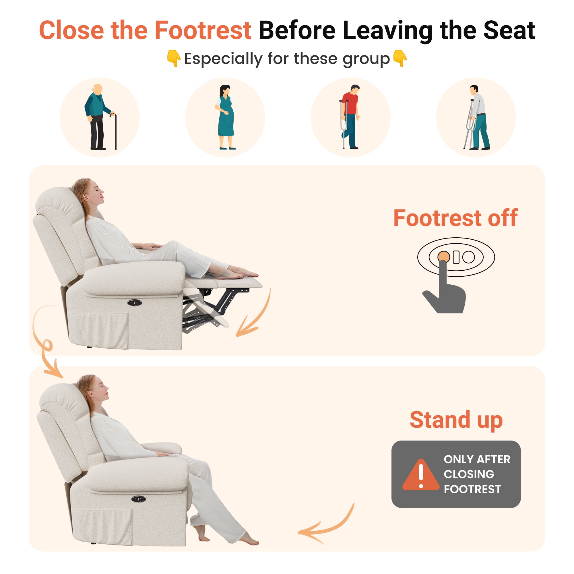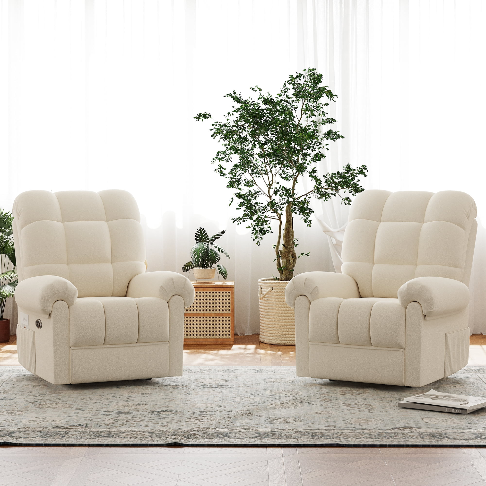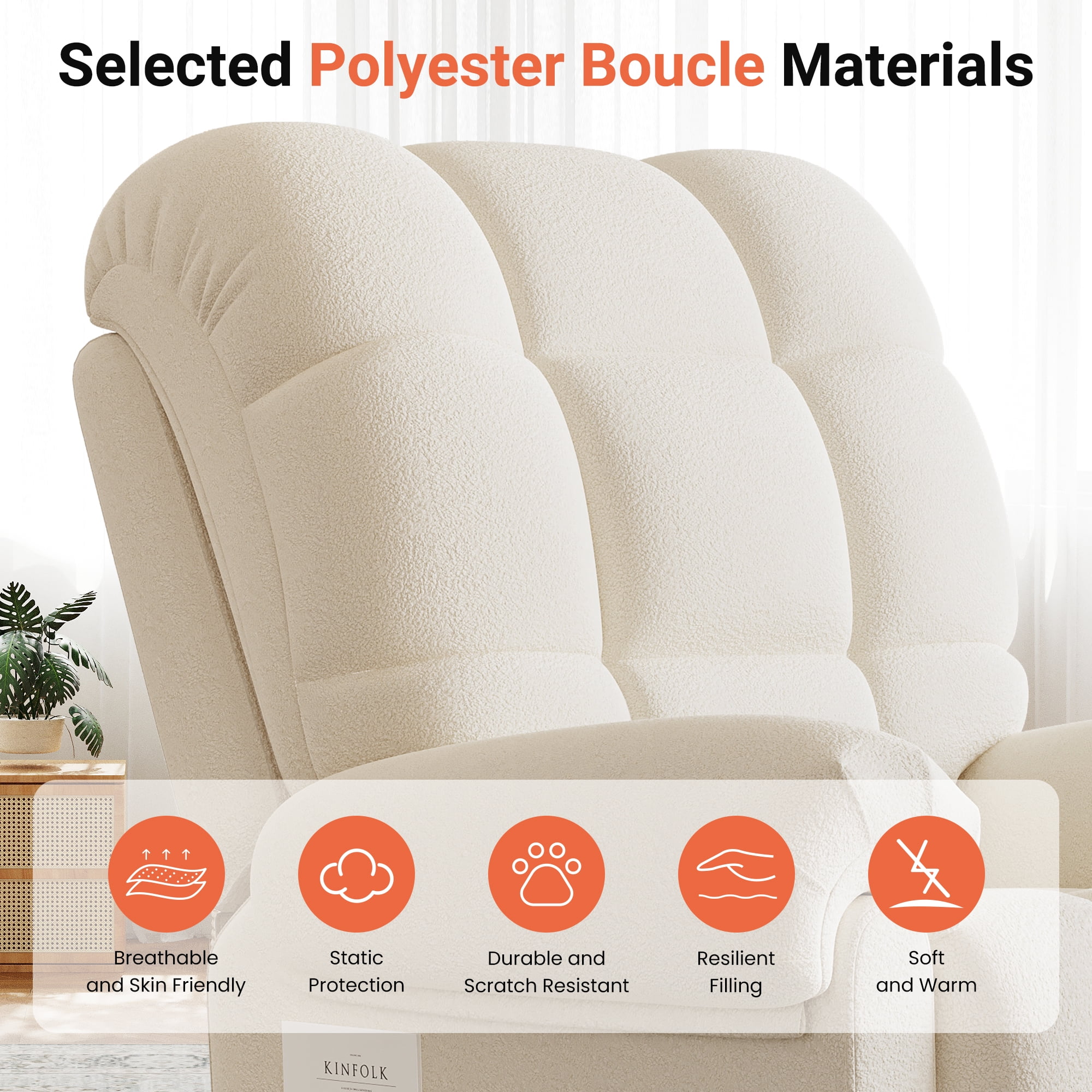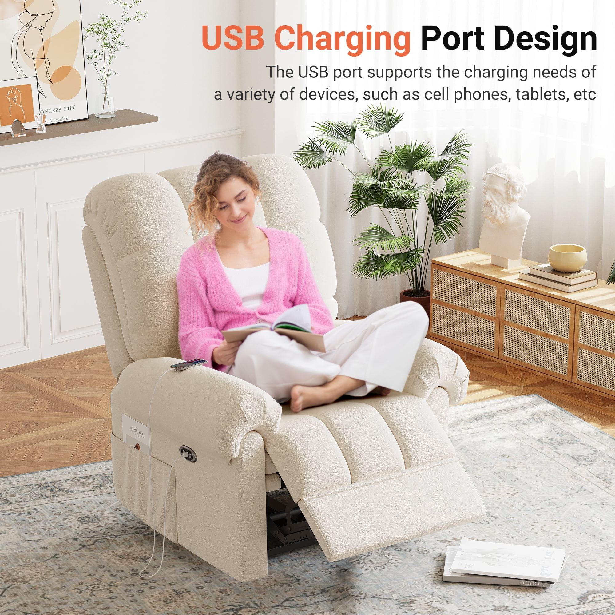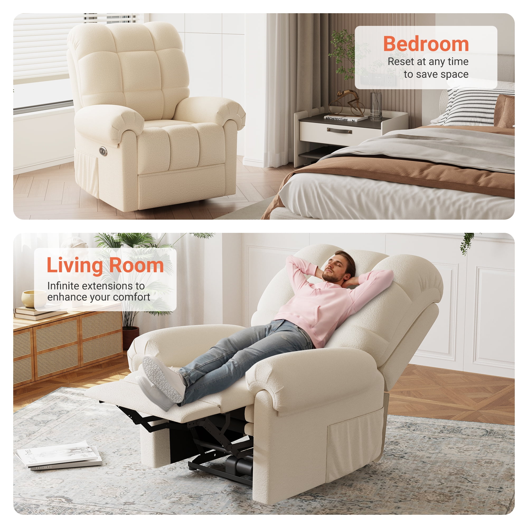 ????[Sitting On a Cloud] Elevate your comfort to cloud nine with our Electric Recliner! Designed for modern relaxation, this Recliner Chair boasts a plush Teddy Fleece material that envelops you in luxury. Experience ultimate relaxation with adjustable 75-150° reclining, ergonomic armrests, and a footrest that make lounging a breeze. Feeling as soft as a cloud with every sit. ????[Tool-Free Setup Enjoy] The tool-free setup ensures hassle-free assembly, while the low noise operation creates a serene ambiance. Enjoy the convenience of our USB Charging Port feature, allowing you to stay connected while unwinding. ????[Experience personalized comfort] The adjustable backrest and cloud back design of our Recliner. The maximum weight capacity of 330 pounds ensures sturdy support for adults. With storage pockets and a modern design, this chair is the perfect blend of functionality and style for your office, bedroom, living room, or nursery. ????[Complement Your Space’s Aesthetic] The Recliner’s cloud style Back and pillow top arms design provide excellent back and arm support, making it ideal for extended lounging sessions. The hard floor surface recommendation ensures seamless placement in any room. Choose from Off-white, Coffee, or Blue Grey color options to complement your space’s aesthetic. ????[Ultimate enjoyment] Invest in quality relaxation with our Recliner’s special features, including armrests and power reclining functionality. Treat yourself to a cozy retreat with this Adjustable Recliner that caters to your relaxation needs. Unwind in style and comfort with the epitome of modern luxury and functionality.