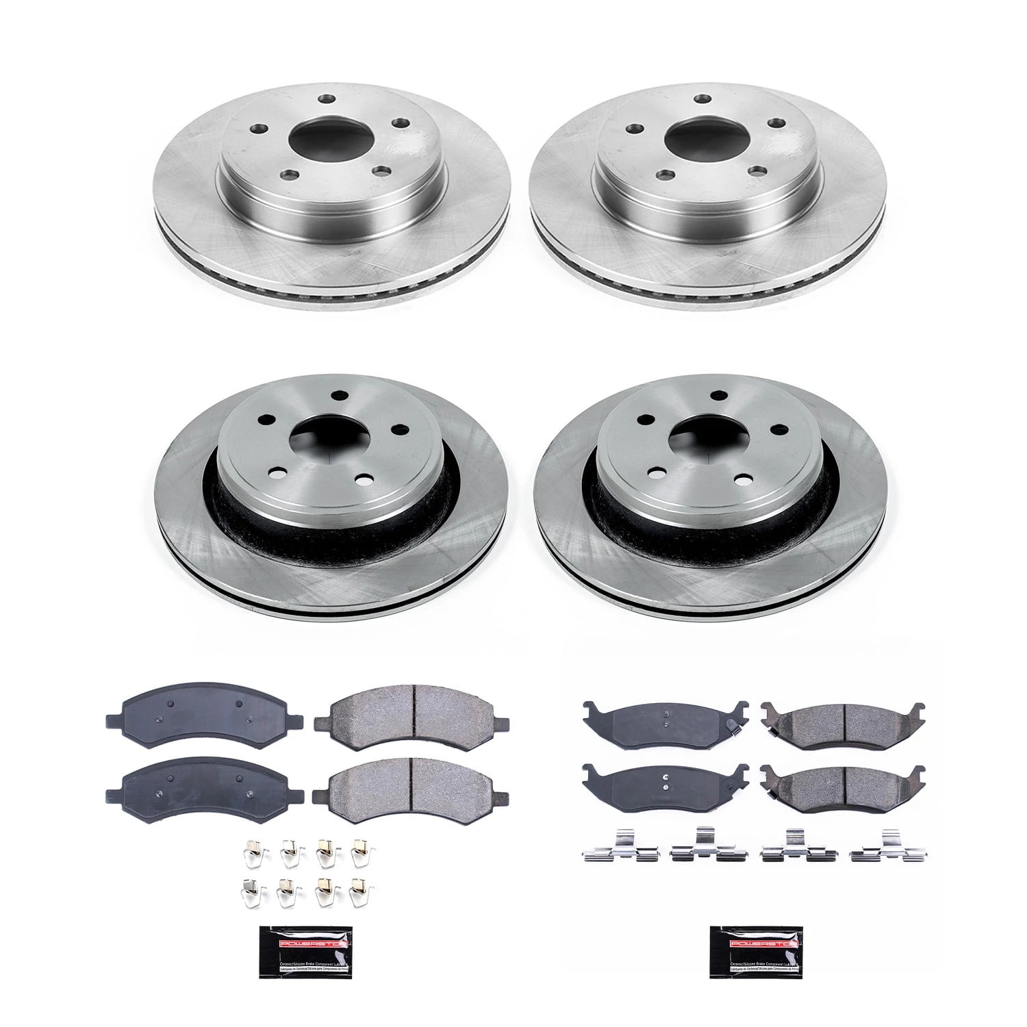 Power Stop Front and Rear Stock Replacement Brake Pad and Rotor Kit KOE2164 Components are designed to match the OE performance of your brakes Multi-layer rubberized shims provide virtually noise free braking Rotors use G3000 castings and are 100 percent mill balanced for stock performance and safety Includes brake pads, rotors, installation hardware, and ceramic brake lubricant 2009 CHRYSLER ASPEN ; 2008 CHRYSLER ASPEN ; 2007 CHRYSLER ASPEN ; 2009 DODGE DURANGO ; 2008 DODGE DURANGO ; 2007 DODGE DURANGO ; 2010 DODGE RAM 1500 PICKUP ; 2009 DODGE RAM 1500 PICKUP ; 2008 DODGE RAM 1500 PICKUP Regular & Quad Cab; 2007 DODGE RAM 1500 PICKUP Regular & Quad Cab; 2006 DODGE RAM 1500 PICKUP Regular & Quad Cab (5 Lug V6/V8 Models); 2018 RAM 1500 ; 2017 RAM 1500 ; 2016 RAM 1500 ; 2015 RAM 1500 ; 2014 RAM 1500 ; 2013 RAM 1500 ; 2012 RAM 1500 5 Lug Models; 2011 RAM 1500 ; 2022 RAM 1500 CLASSIC ; 2021 RAM 1500 CLASSIC ; 2020 RAM 1500 CLASSIC ; 2019 RAM 1500 CLASSIC