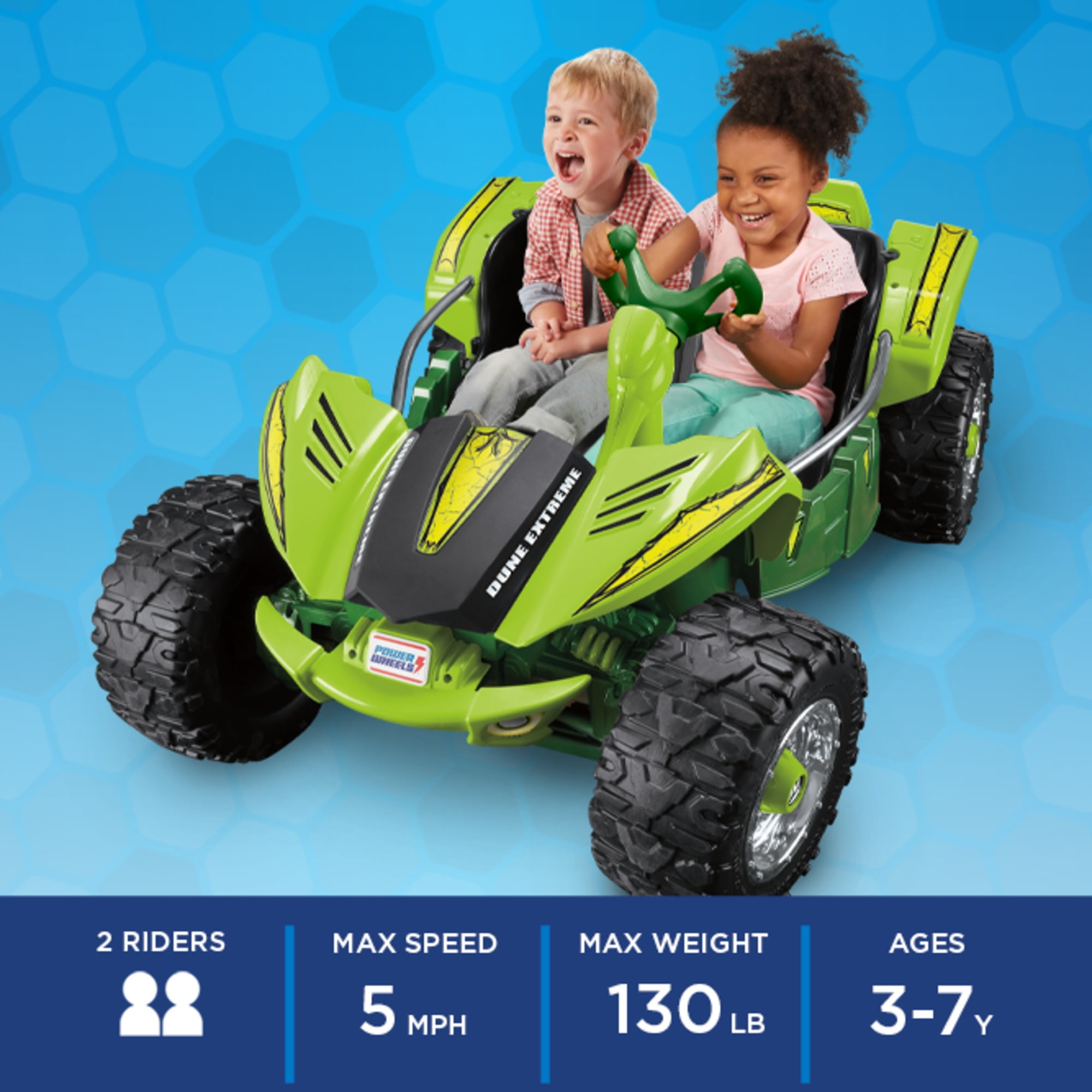 Battery-powered ride-on toy looks just like a dune buggy with a hot green frame and cool “chrome” accents Dune Racer has metal sidebars for hand support and a secret storage compartment under the hood (toys not included) Multi-terrain traction: Ride-on toy drives on hard surfaces, wet grass and rough terrain for “off road” adventures Features 2 forward speeds (5 mph and 2.5 mph) plus reverse driving with parent-controlled, high-speed lock out; includes Power-Lock brake system Racing play for ages 3-7 years; Seats 2, max. weight 130 lb (58 kg). Includes rechargeable 12-volt battery and charger
